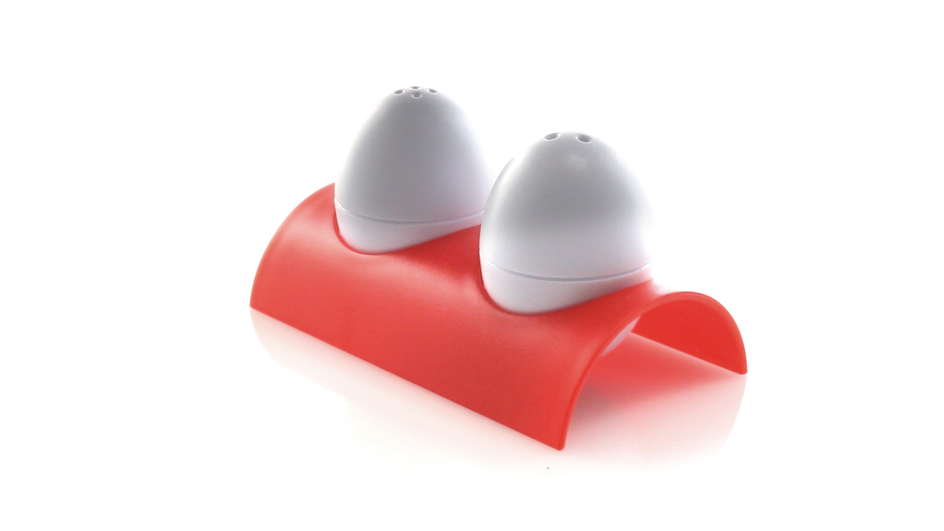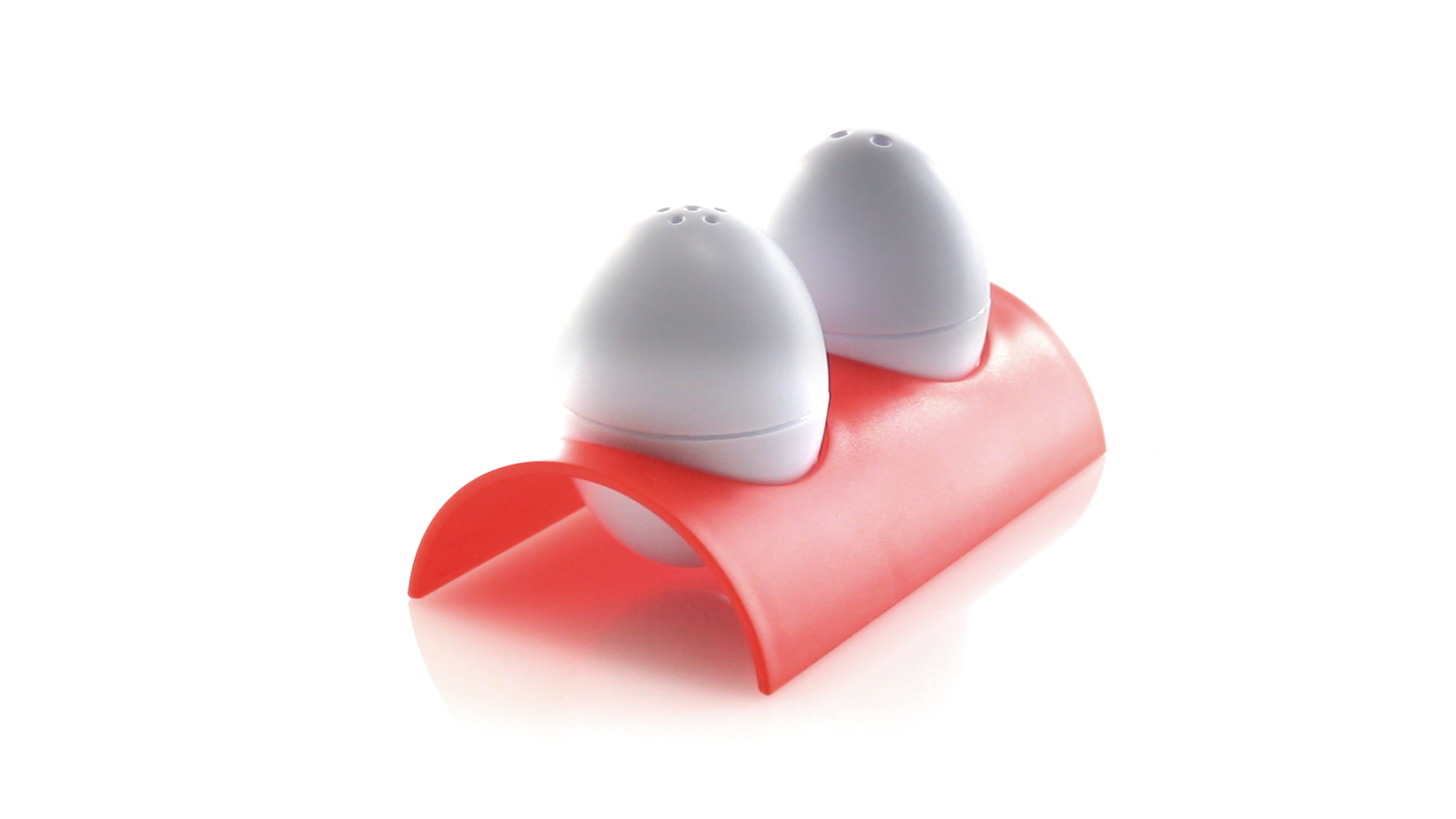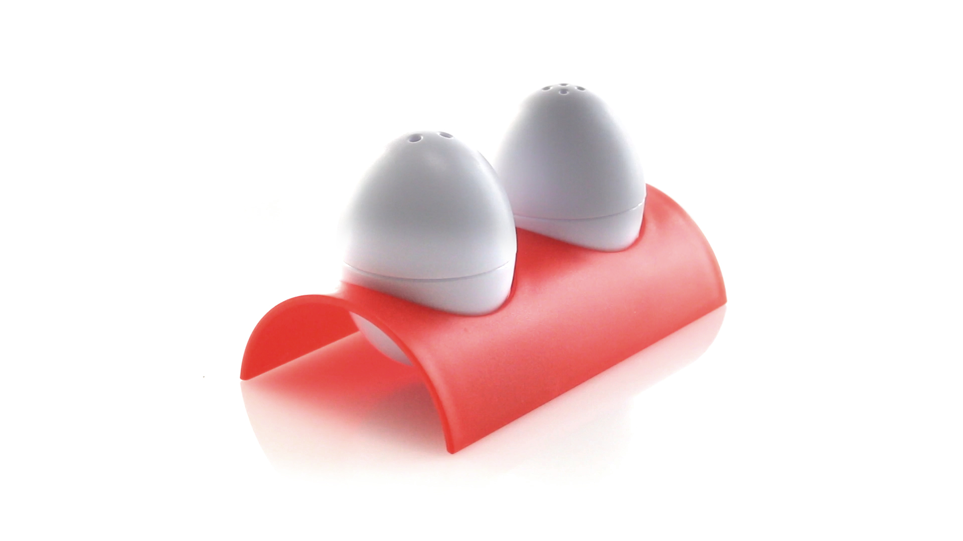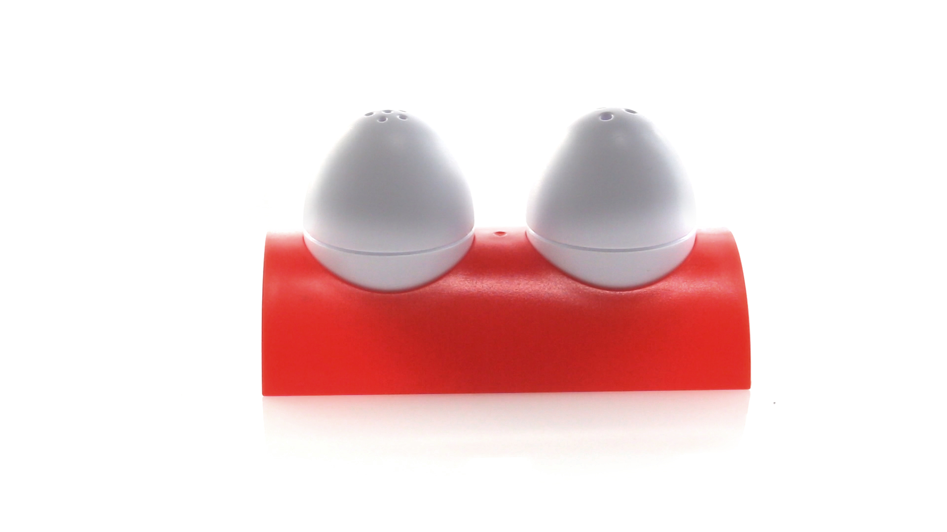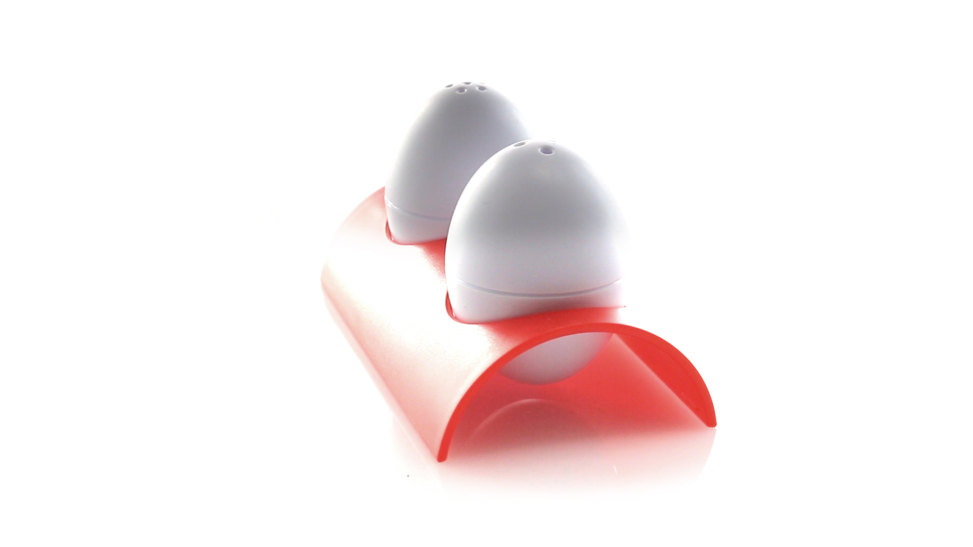 Originelles Set aus Salz- und Pfefferstreuer mit Ständer in verschiedenen Farbkombinationen.