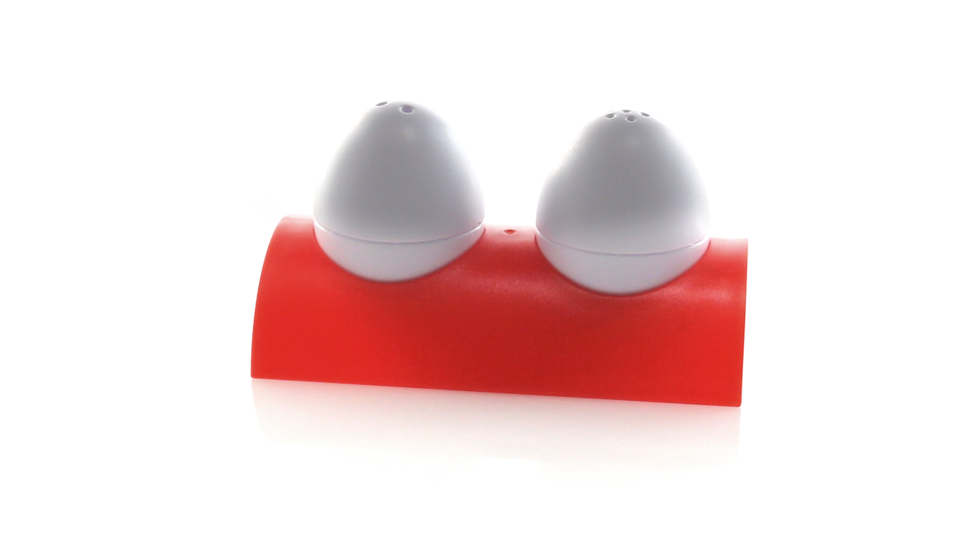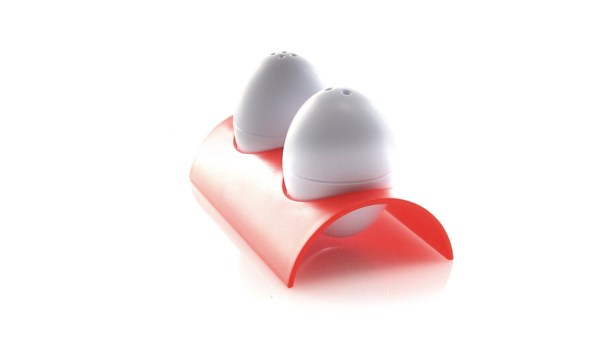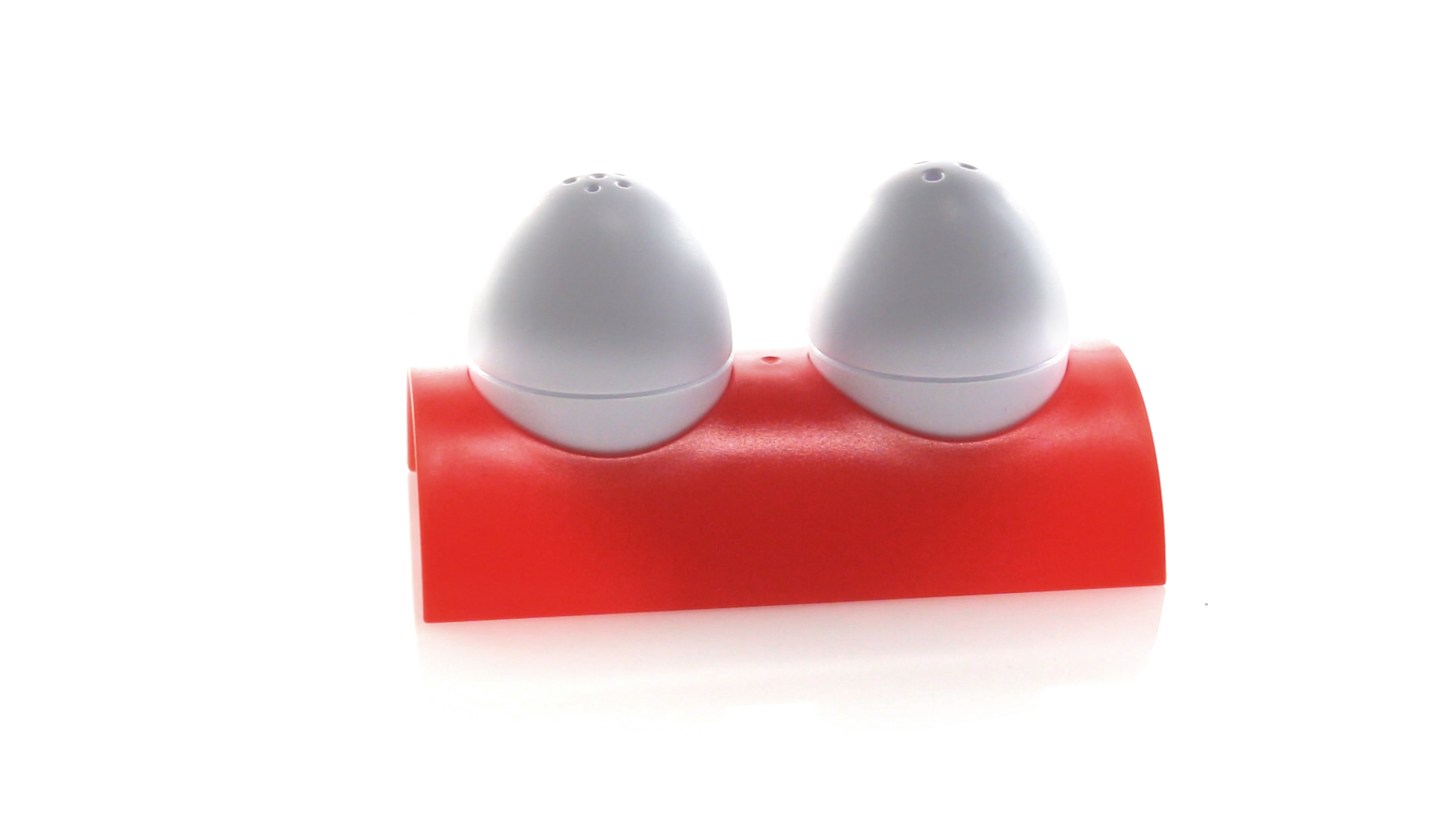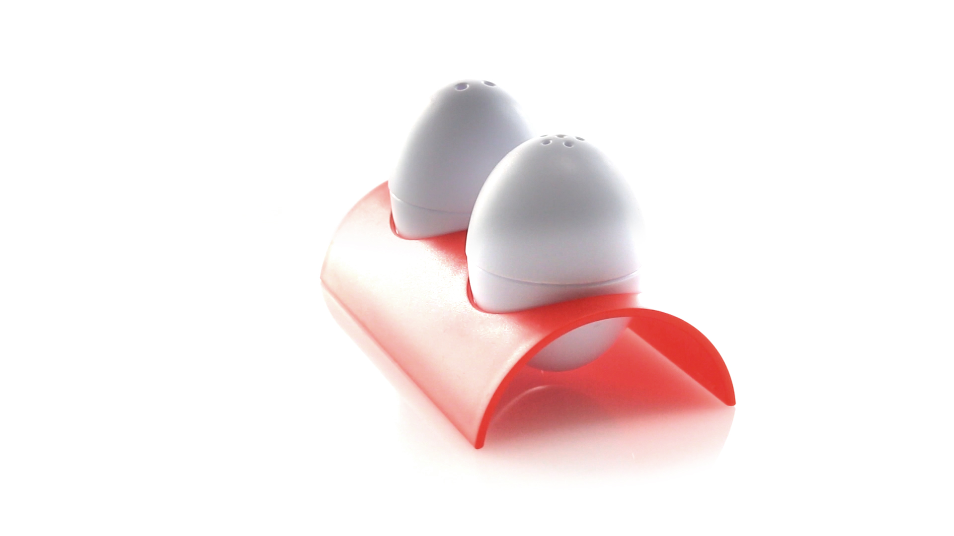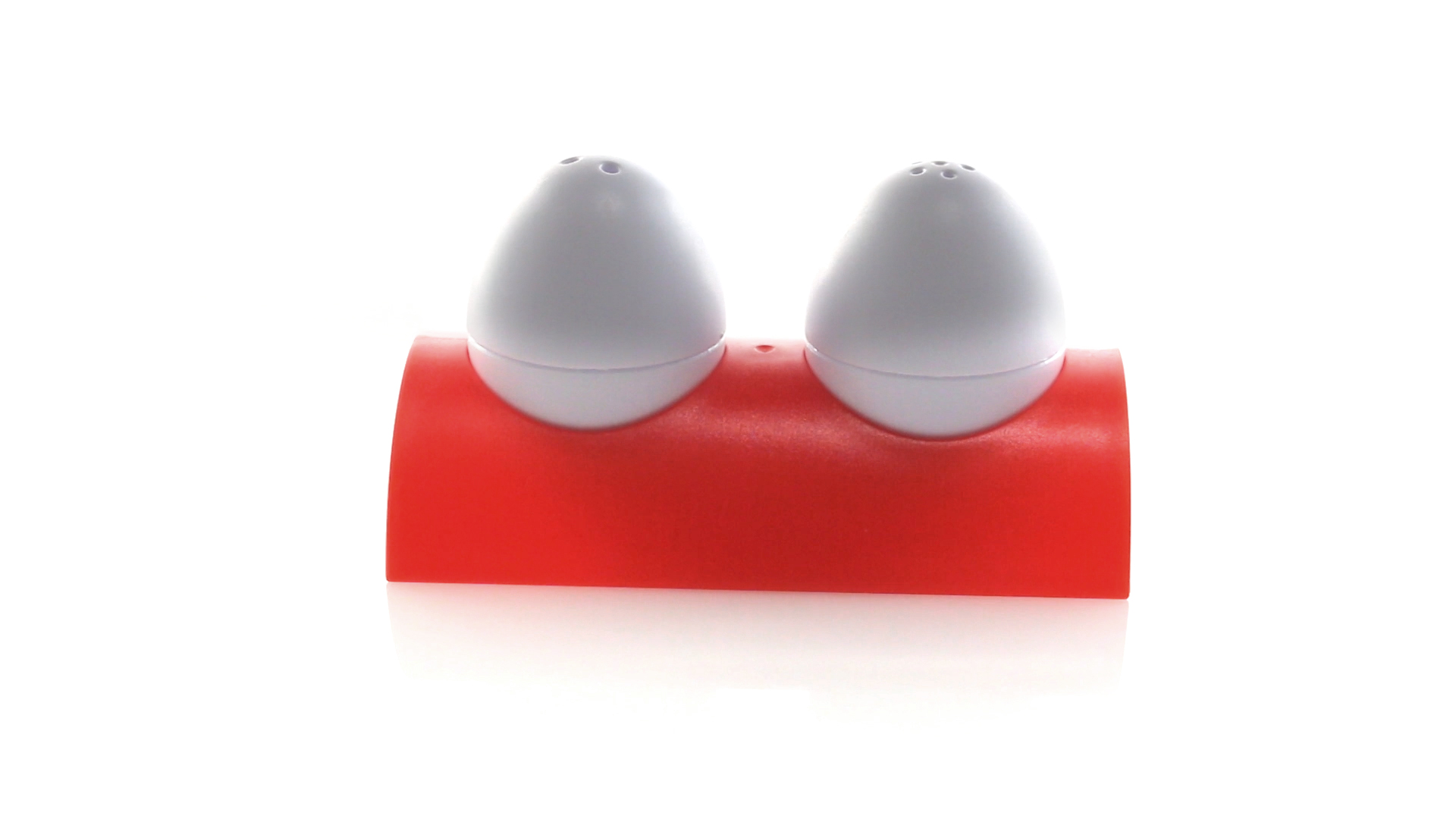Originelles Set aus Salz- und Pfefferstreuer mit Ständer in verschiedenen Farbkombinationen.