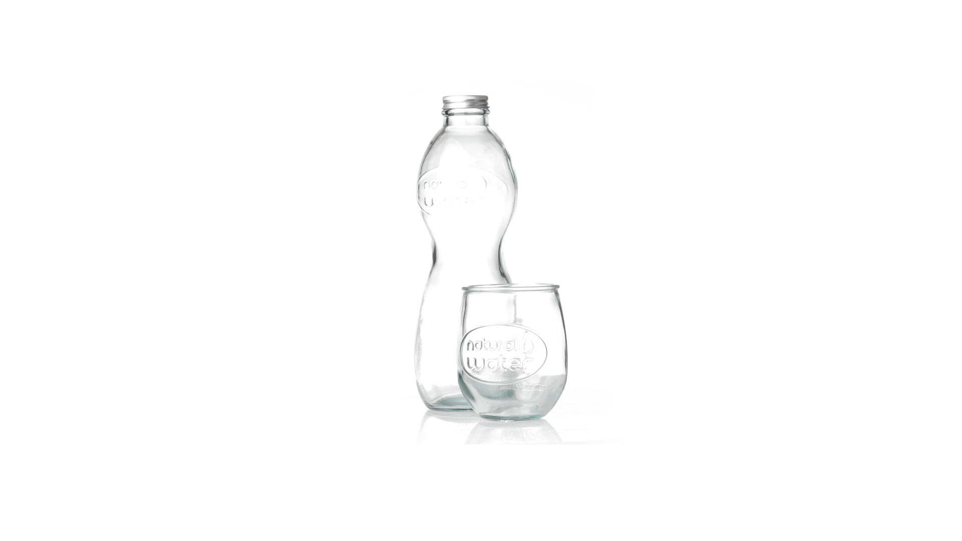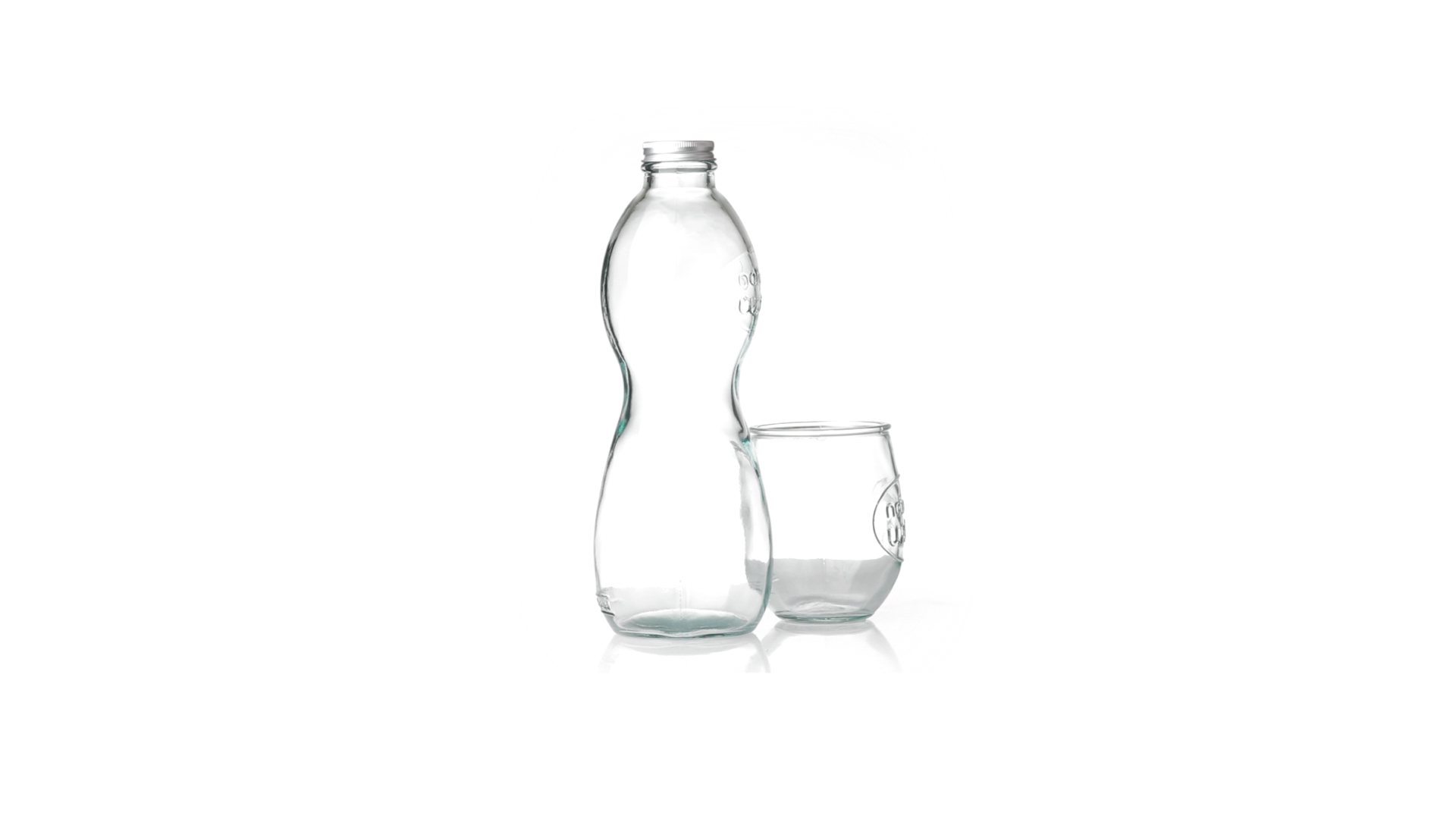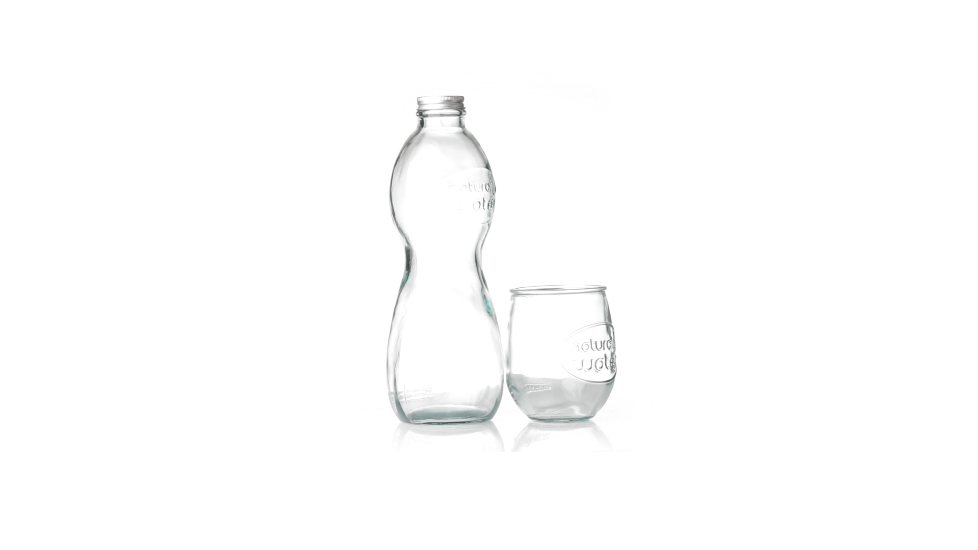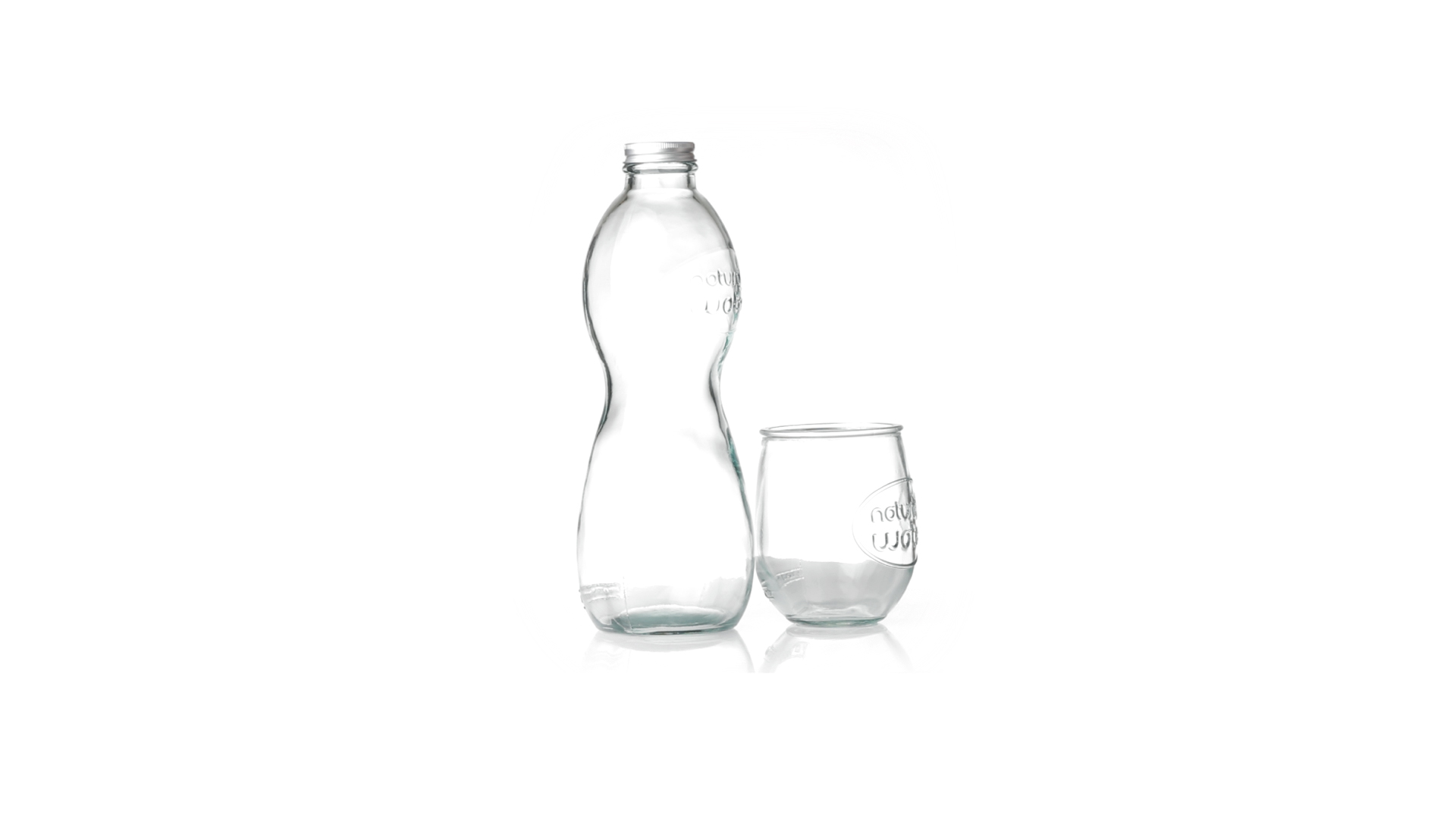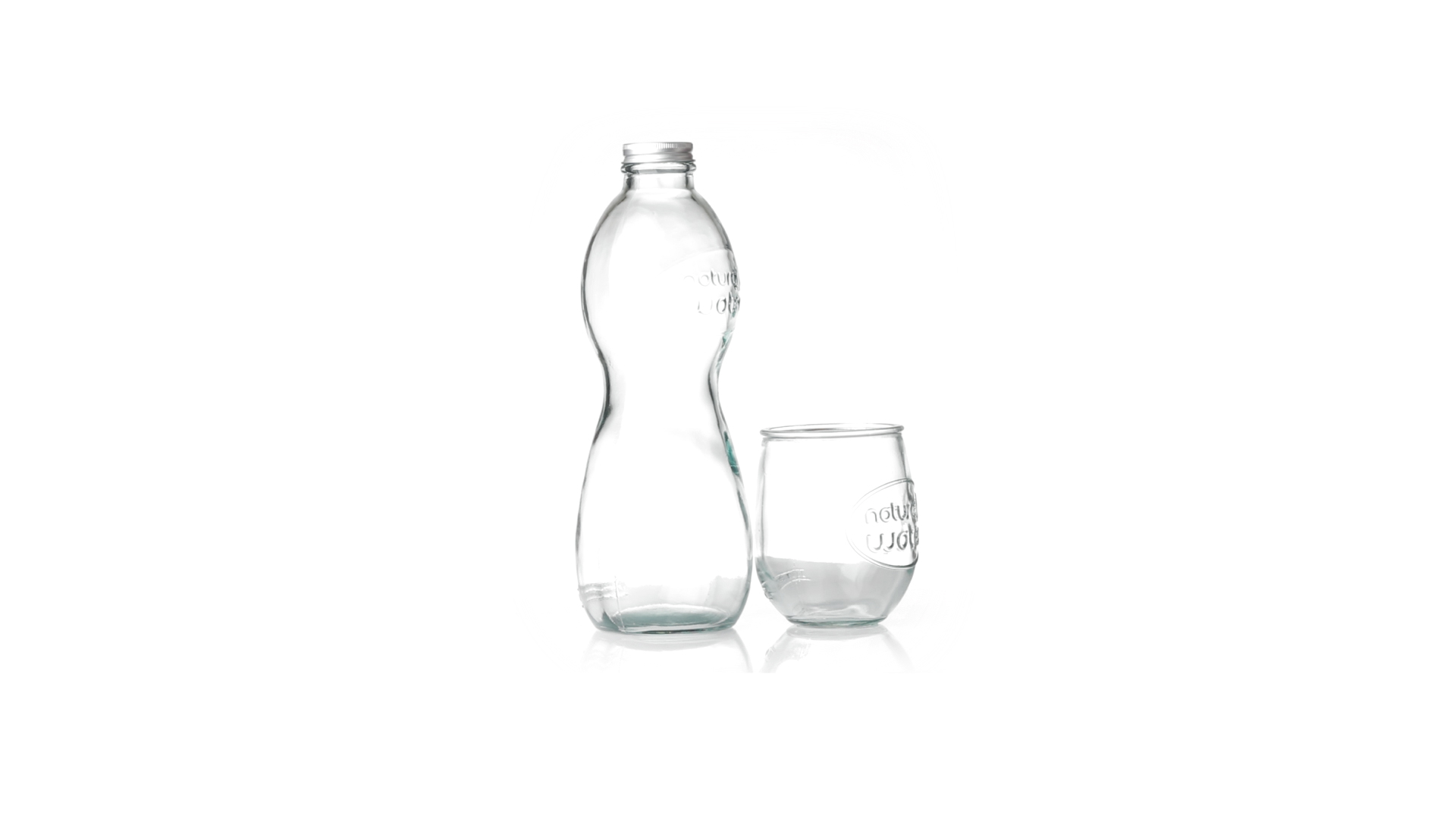 Linie "Natur" Set aus 2 Gläsern mit 400 ml und einer Flasche mit 1l Fassungsvermögen. Hergestellt in Europa aus recyceltem Glas mit GRS-Zertifizierung (Global Recycled Standard) bestätigt die recycelte Herkunft des Materials bei der Herstellung des Produkts verwendet. Flasche mit Schraubdeckel aus Metall. Das Set wird in einer Schachtel aus recyceltem Karton mit Sichtfenster präsentiert.