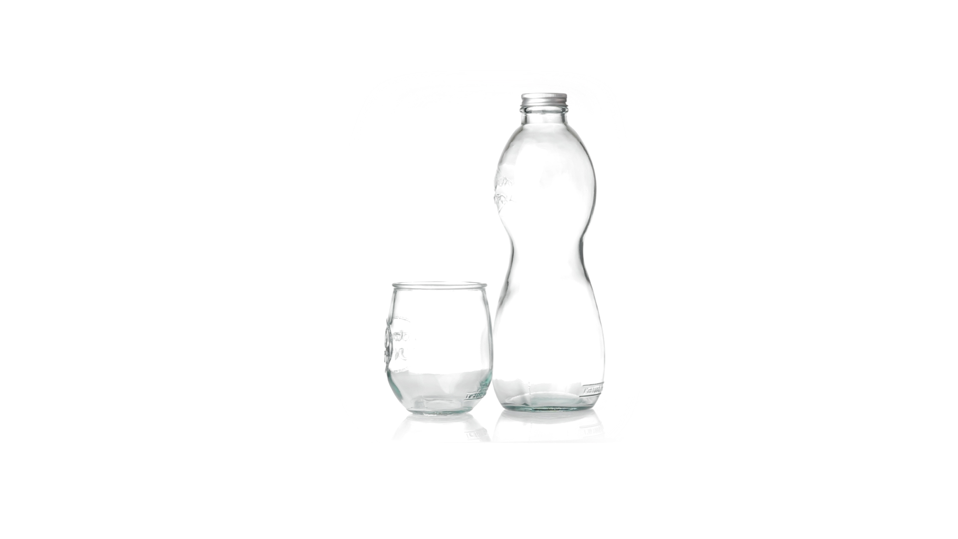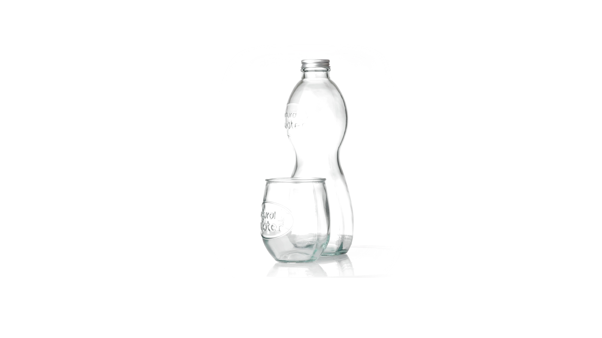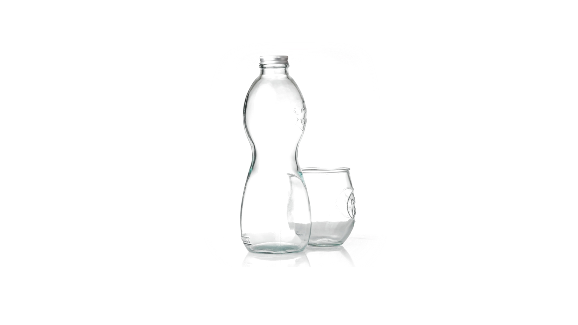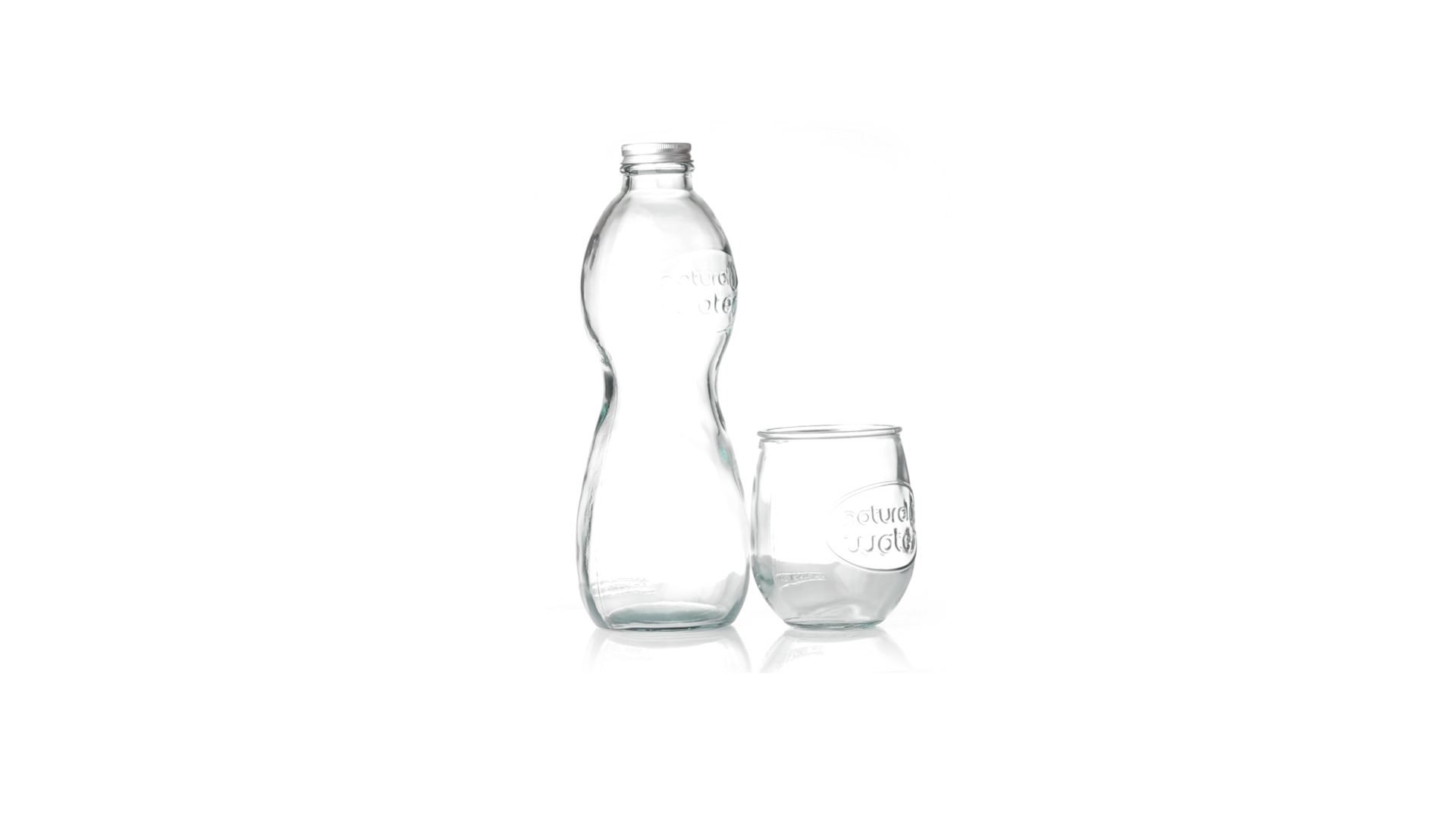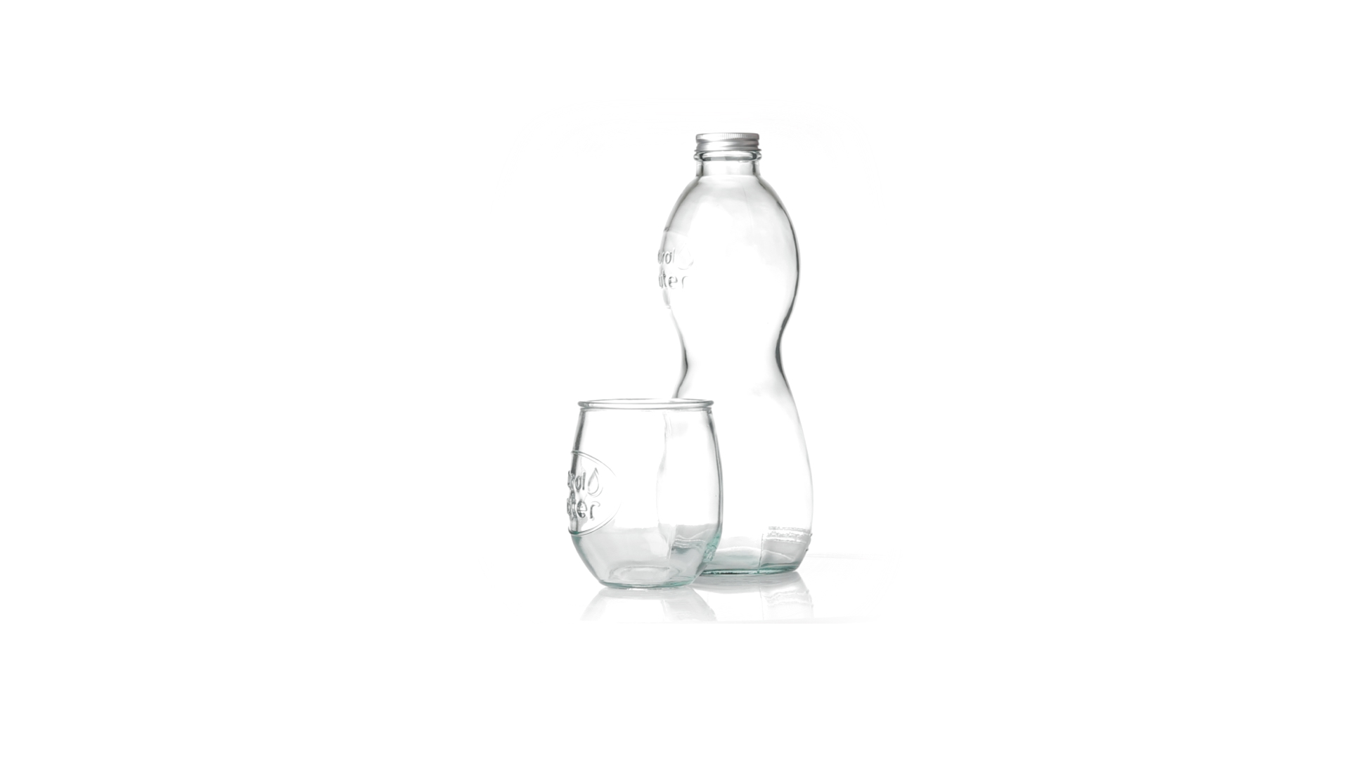 Linie "Natur" Set aus 2 Gläsern mit 400 ml und einer Flasche mit 1l Fassungsvermögen. Hergestellt in Europa aus recyceltem Glas mit GRS-Zertifizierung (Global Recycled Standard) bestätigt die recycelte Herkunft des Materials bei der Herstellung des Produkts verwendet. Flasche mit Schraubdeckel aus Metall. Das Set wird in einer Schachtel aus recyceltem Karton mit Sichtfenster präsentiert.
