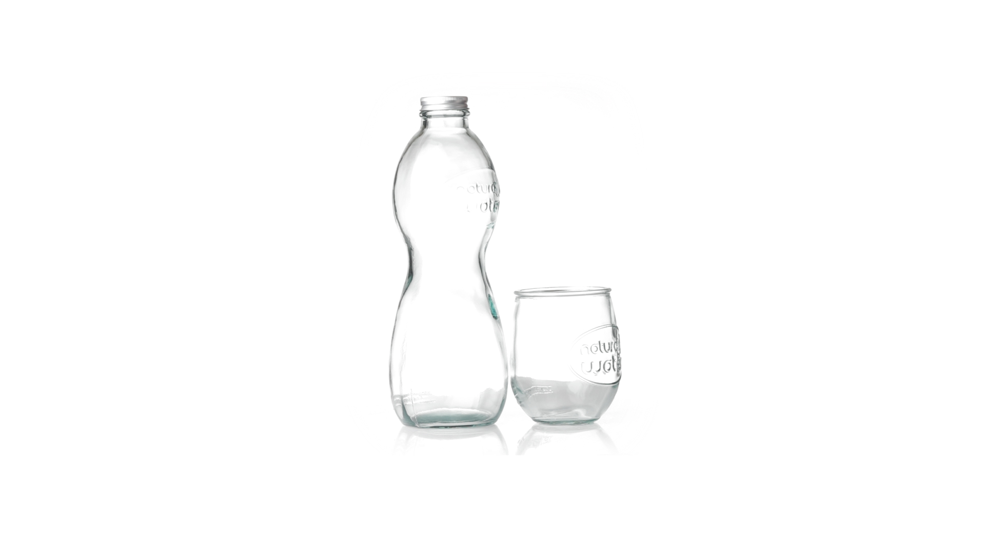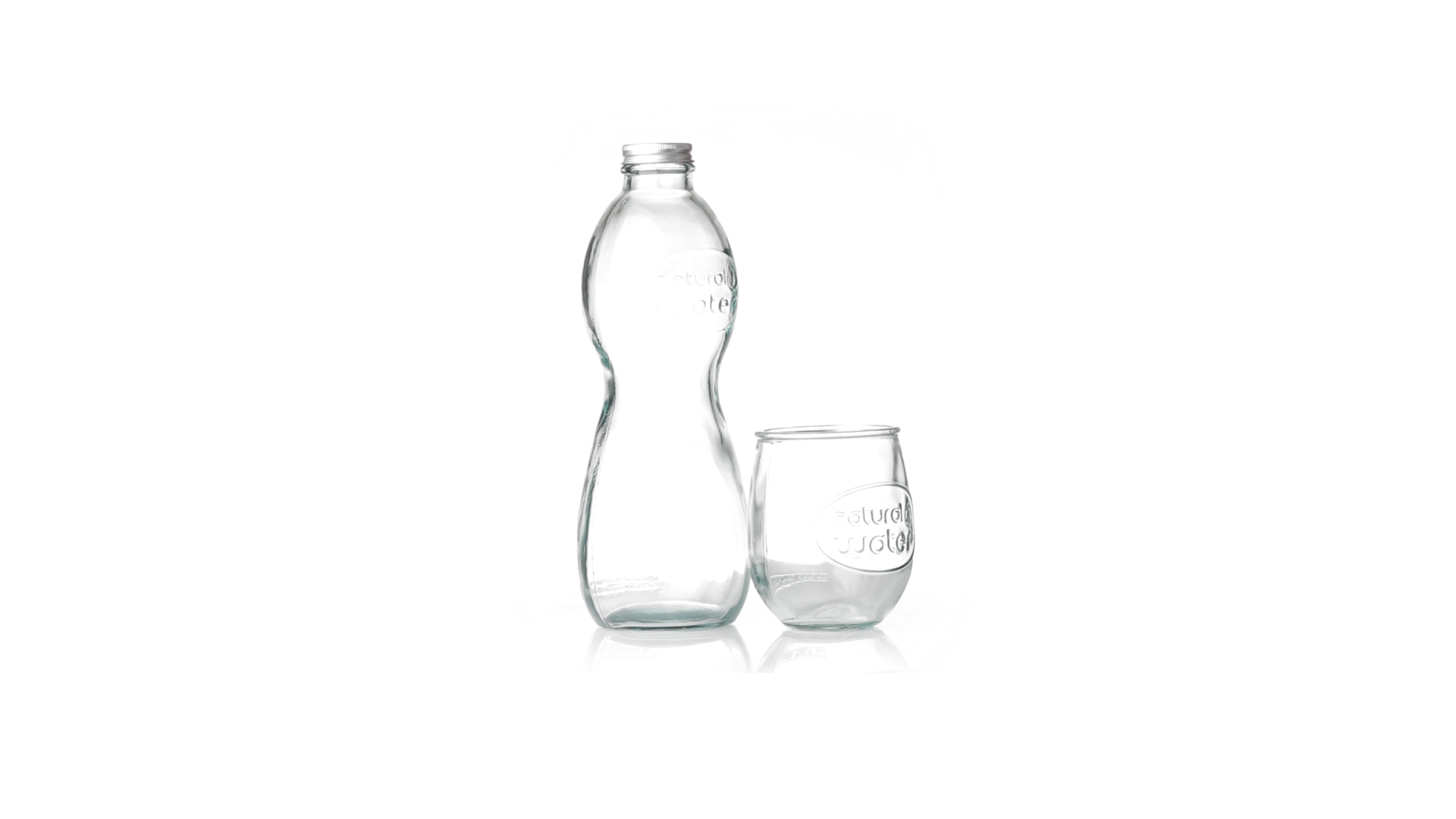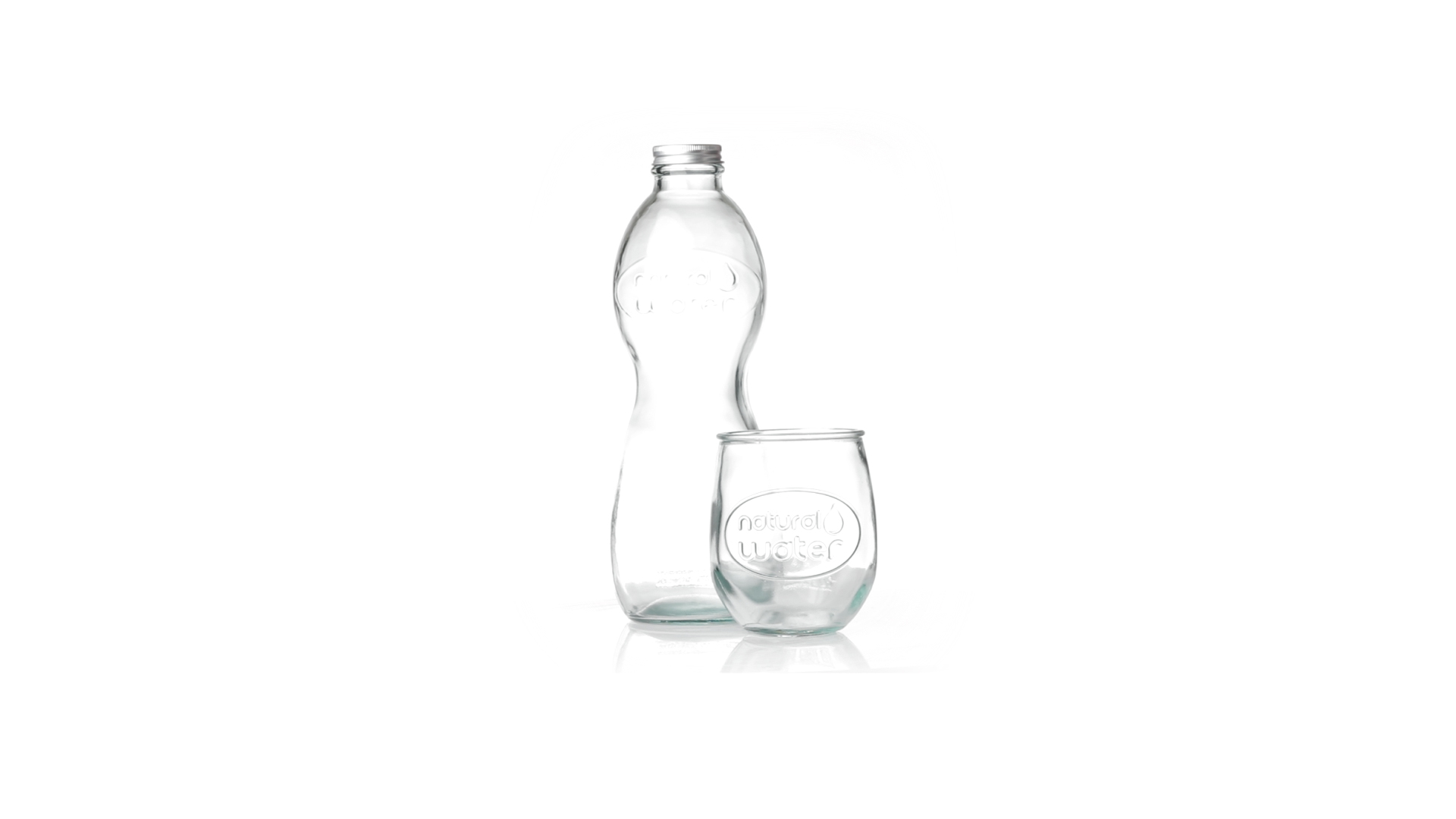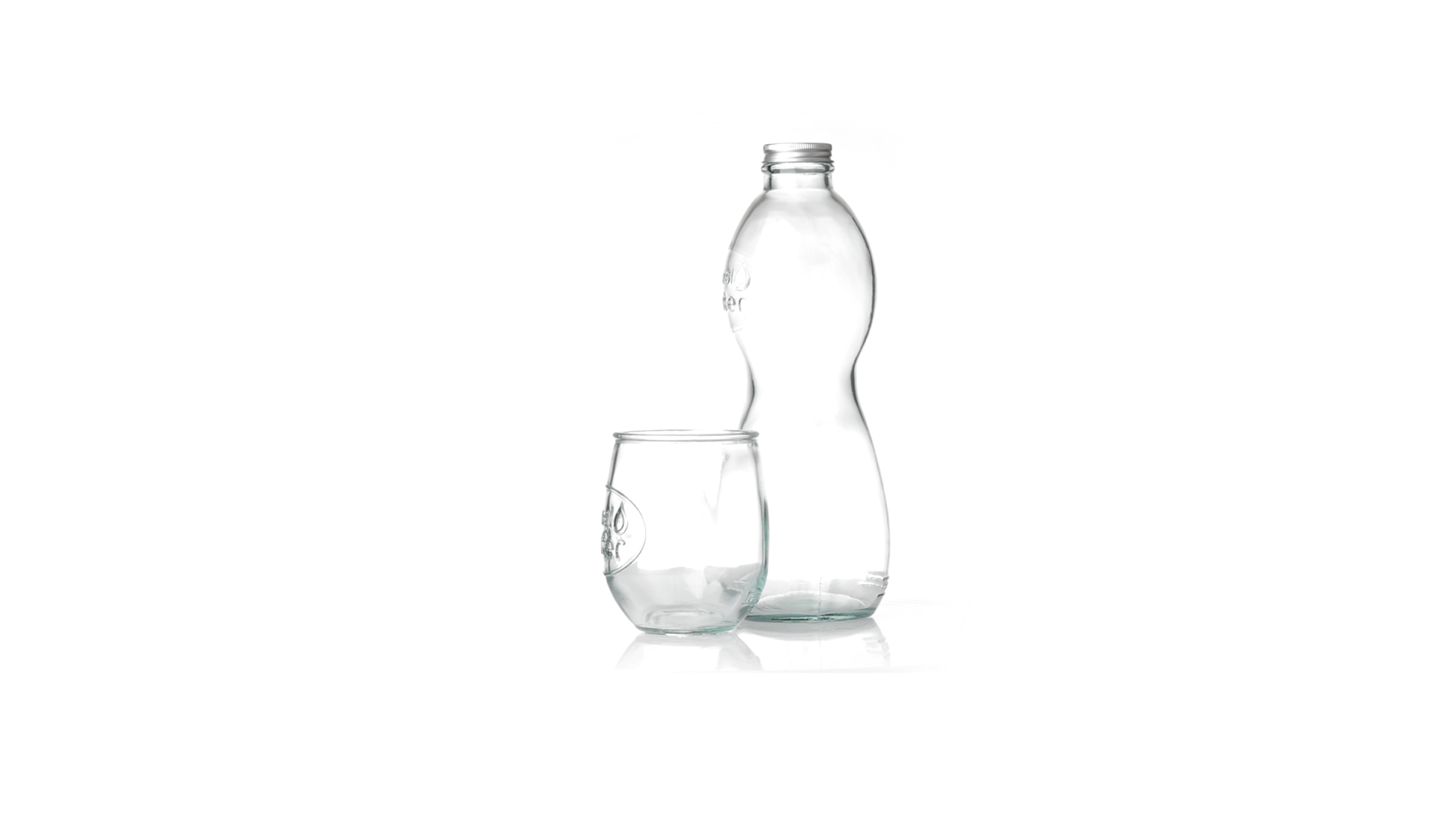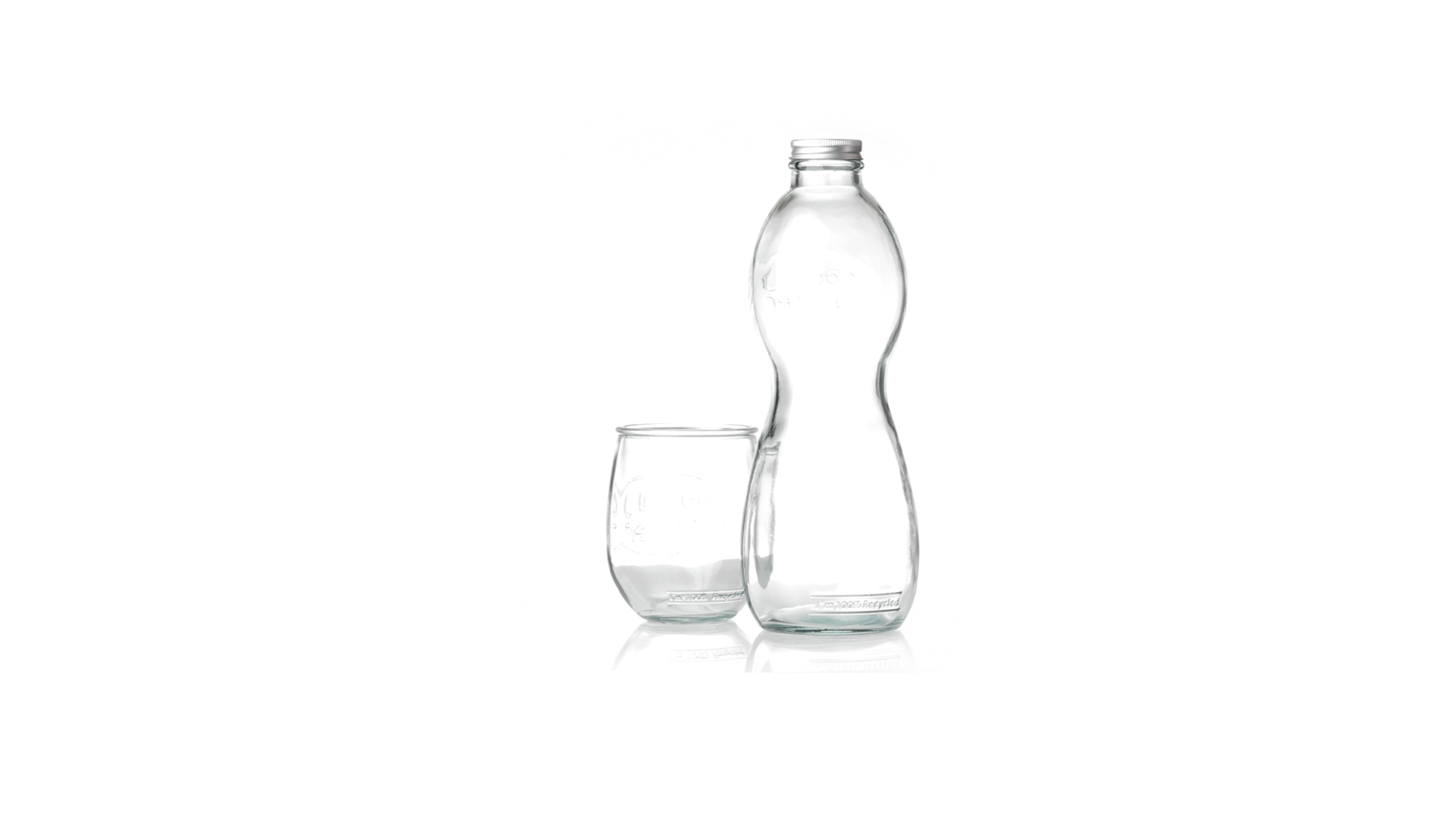 Linie "Natur" Set aus 2 Gläsern mit 400 ml und einer Flasche mit 1l Fassungsvermögen. Hergestellt in Europa aus recyceltem Glas mit GRS-Zertifizierung (Global Recycled Standard) bestätigt die recycelte Herkunft des Materials bei der Herstellung des Produkts verwendet. Flasche mit Schraubdeckel aus Metall. Das Set wird in einer Schachtel aus recyceltem Karton mit Sichtfenster präsentiert.