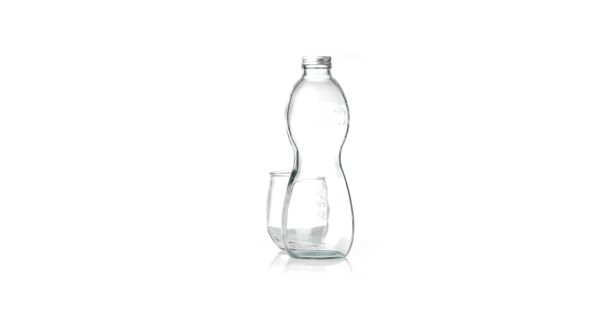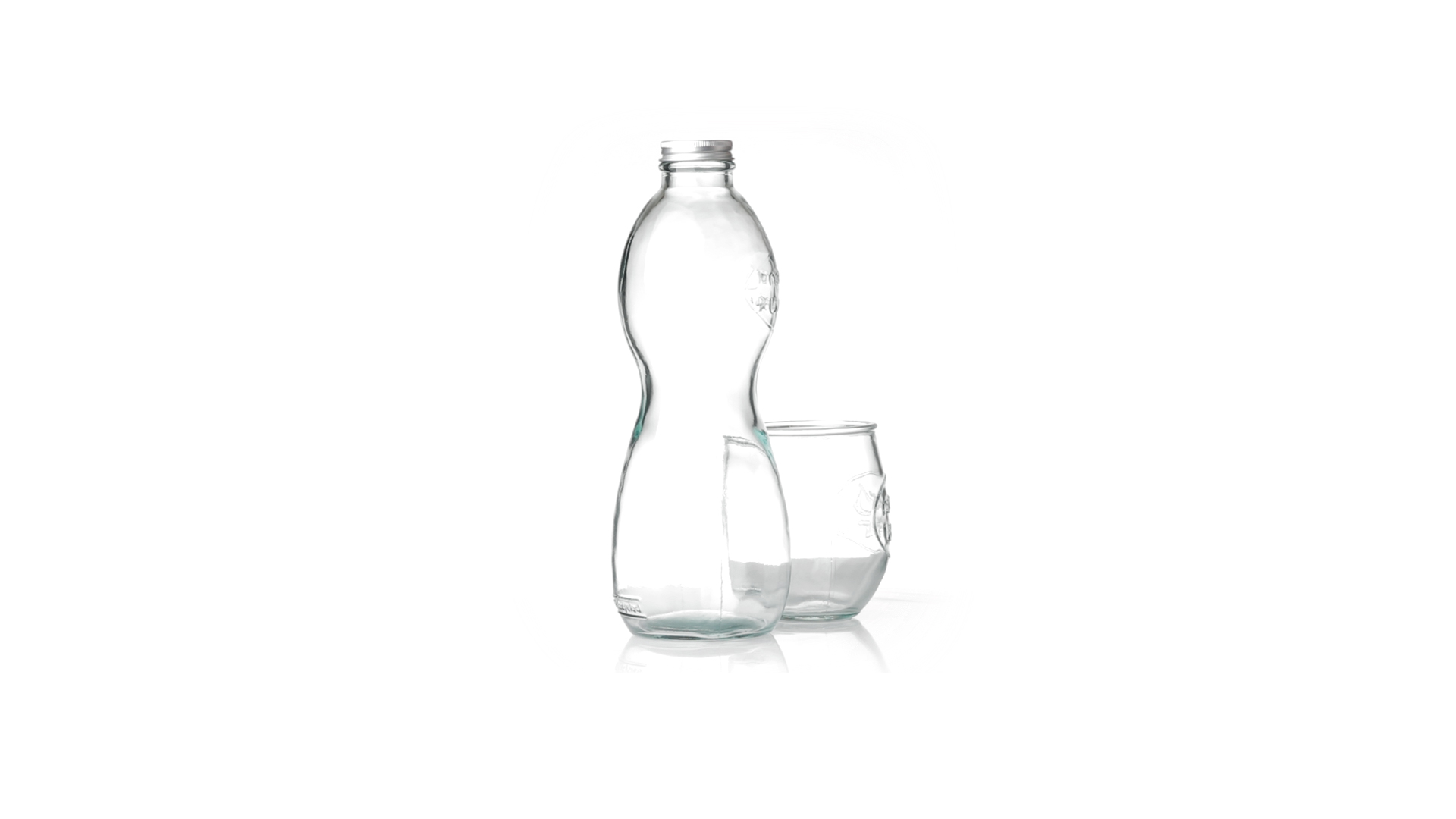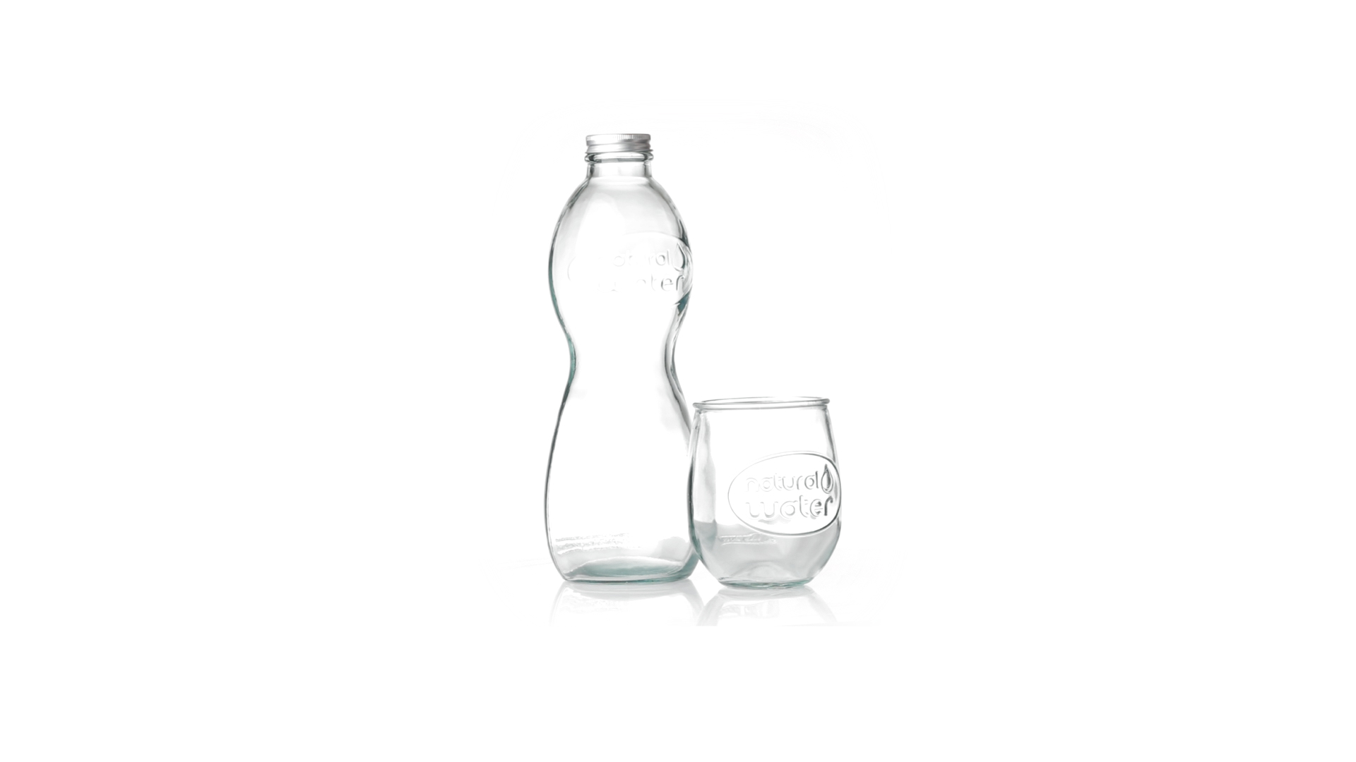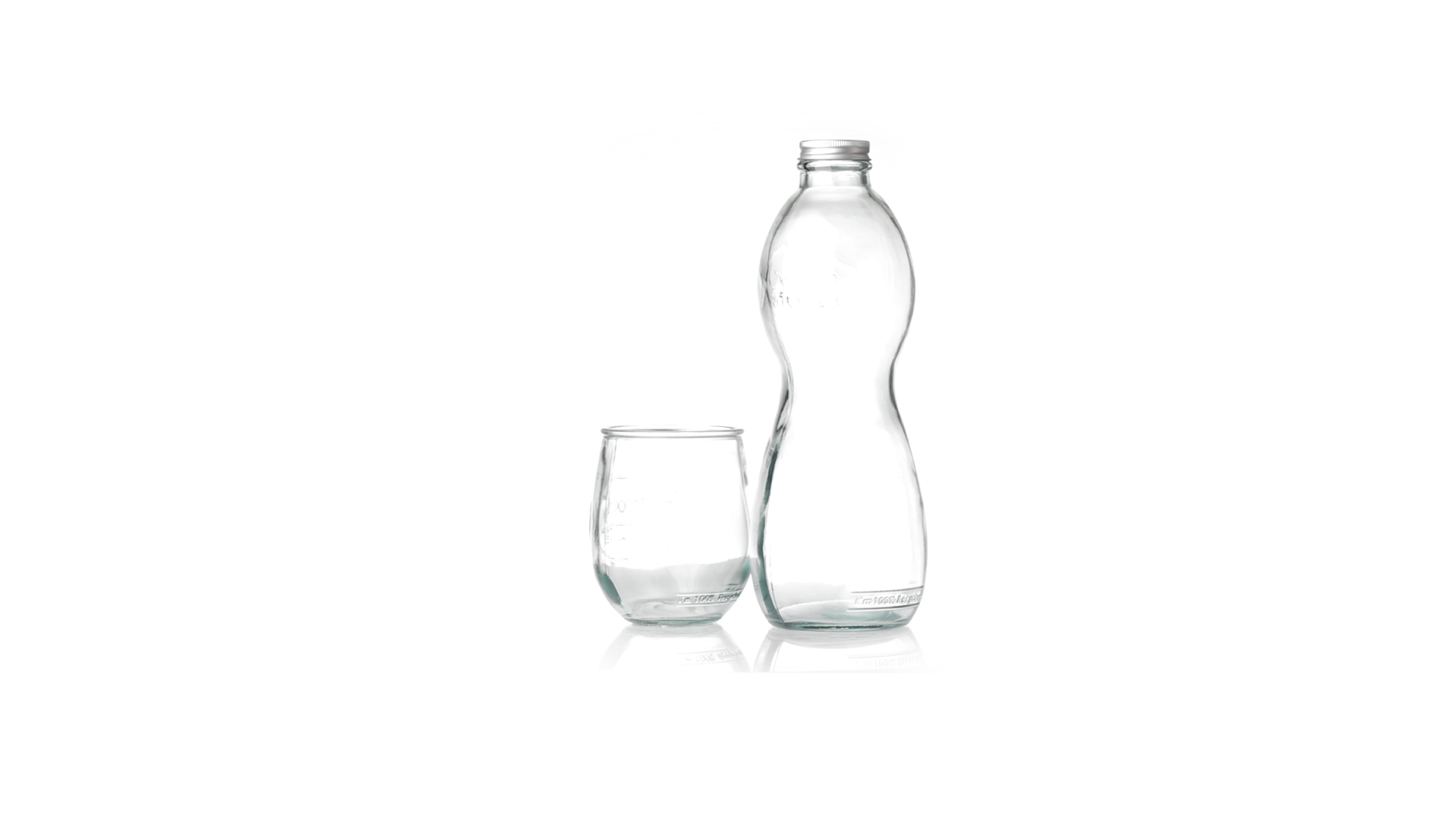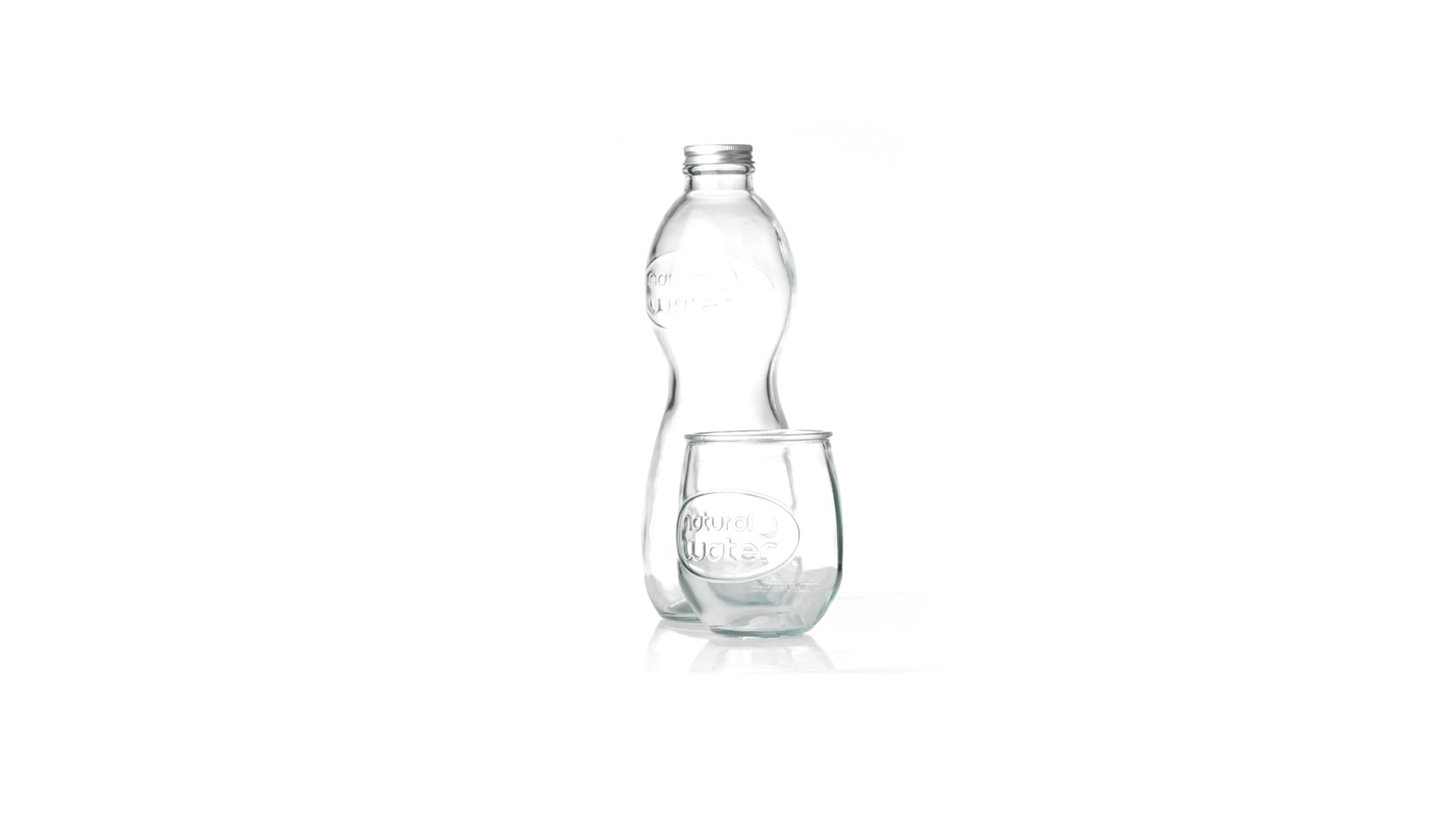 Linie "Natur" Set aus 2 Gläsern mit 400 ml und einer Flasche mit 1l Fassungsvermögen. Hergestellt in Europa aus recyceltem Glas mit GRS-Zertifizierung (Global Recycled Standard) bestätigt die recycelte Herkunft des Materials bei der Herstellung des Produkts verwendet. Flasche mit Schraubdeckel aus Metall. Das Set wird in einer Schachtel aus recyceltem Karton mit Sichtfenster präsentiert.