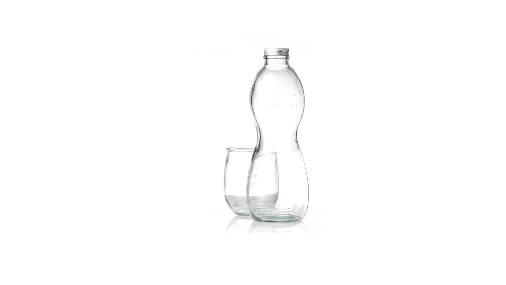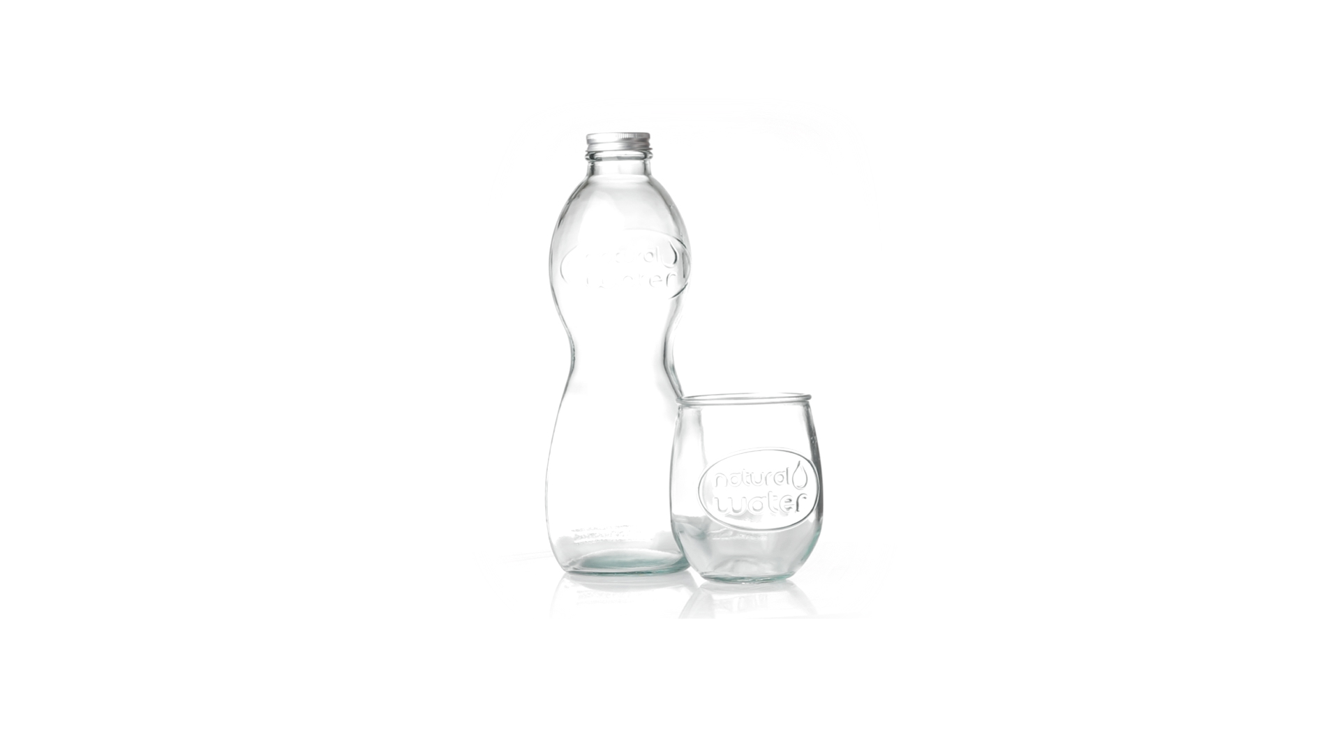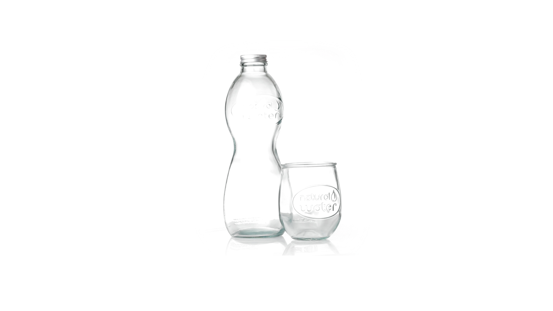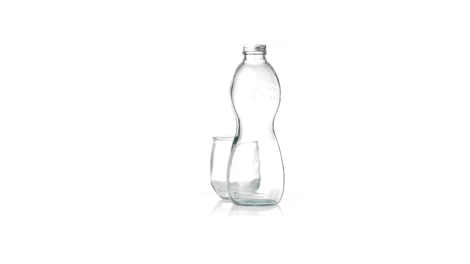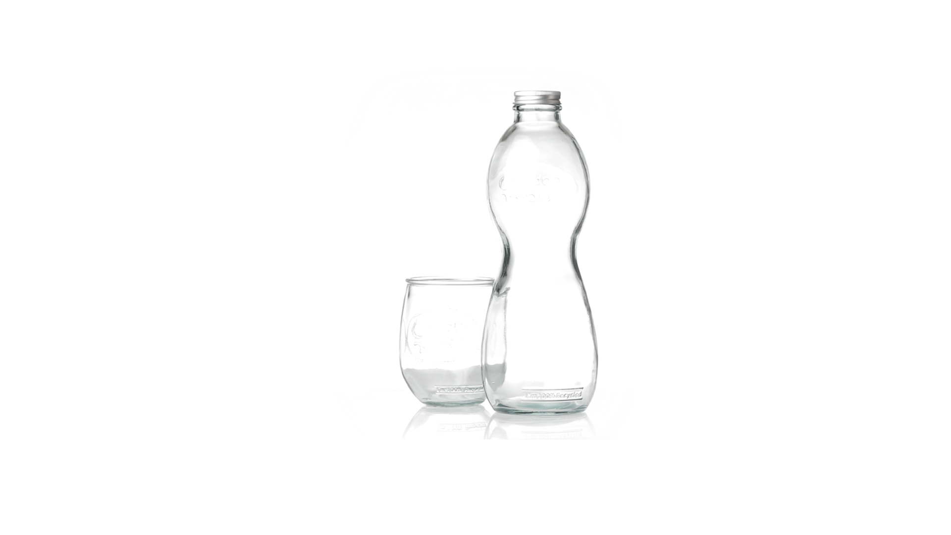 Linie "Natur" Set aus 2 Gläsern mit 400 ml und einer Flasche mit 1l Fassungsvermögen. Hergestellt in Europa aus recyceltem Glas mit GRS-Zertifizierung (Global Recycled Standard) bestätigt die recycelte Herkunft des Materials bei der Herstellung des Produkts verwendet. Flasche mit Schraubdeckel aus Metall. Das Set wird in einer Schachtel aus recyceltem Karton mit Sichtfenster präsentiert.