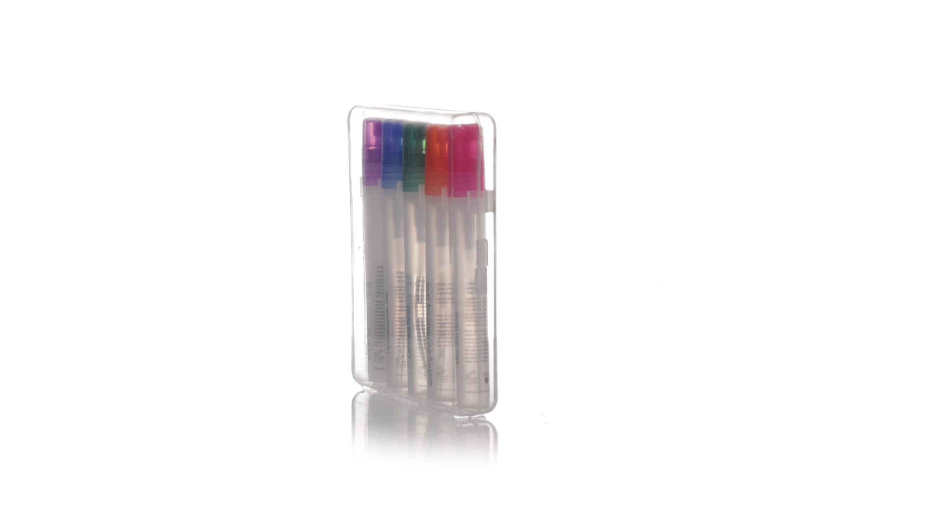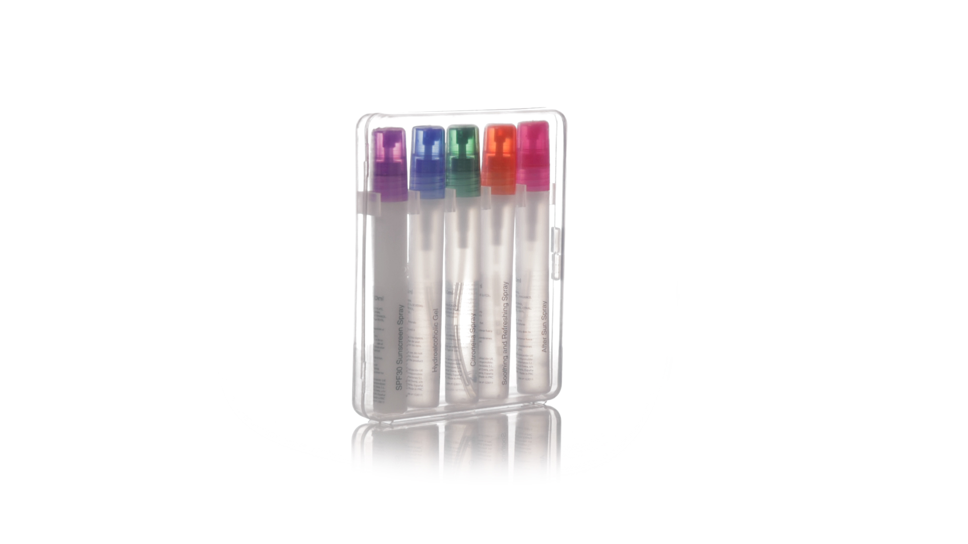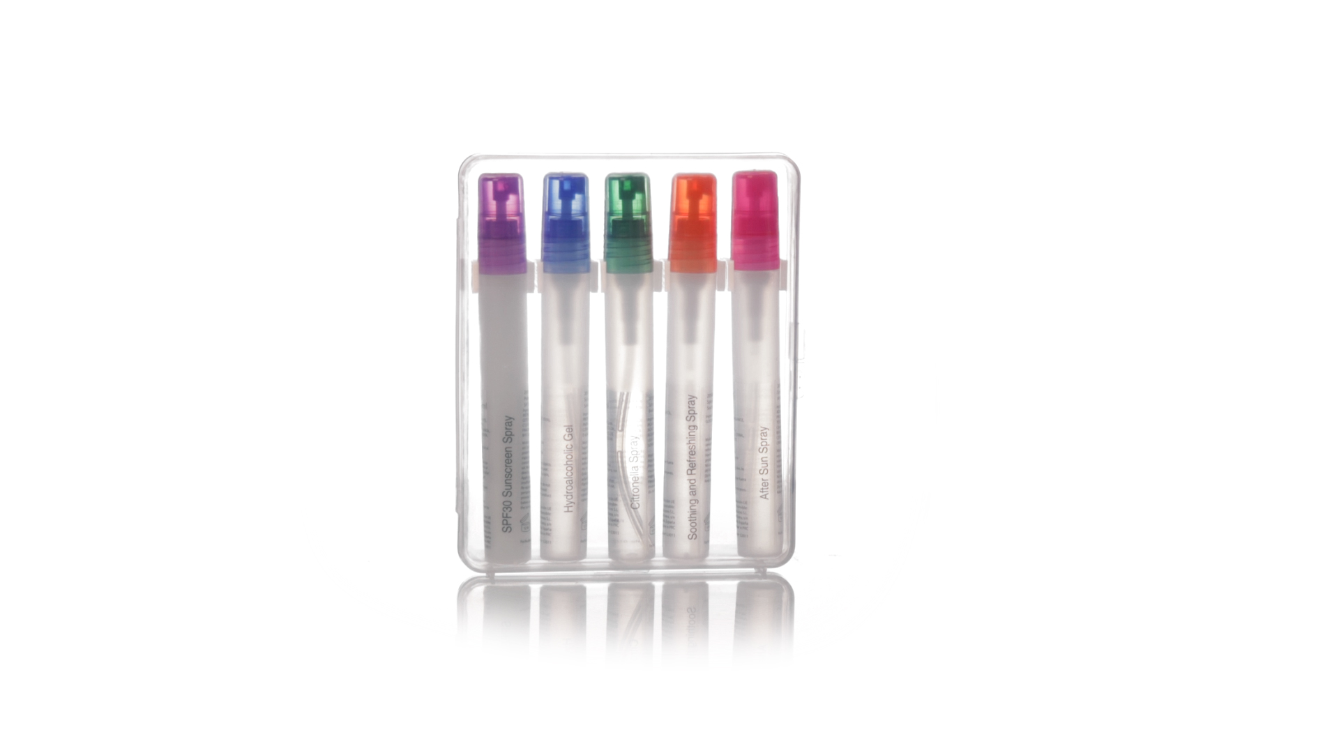 Sonnenschutz- und Abwehrmittel-Set, komplett und leicht zu transportieren. Das Set enthält Sonnenschutzspray mit Lichtschutzfaktor 30, Feuchtigkeitscreme nach dem Sonnenbad, hydroalkoholisches Gel, Insektenschutzmittel und eine Lösung zur Linderung des durch Stiche verursachten Juckreizes. Dermatologisch getestet und in einer transparenten Kunststoffbox präsentiert.
