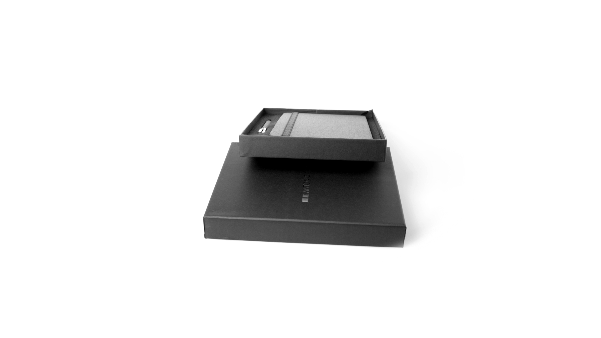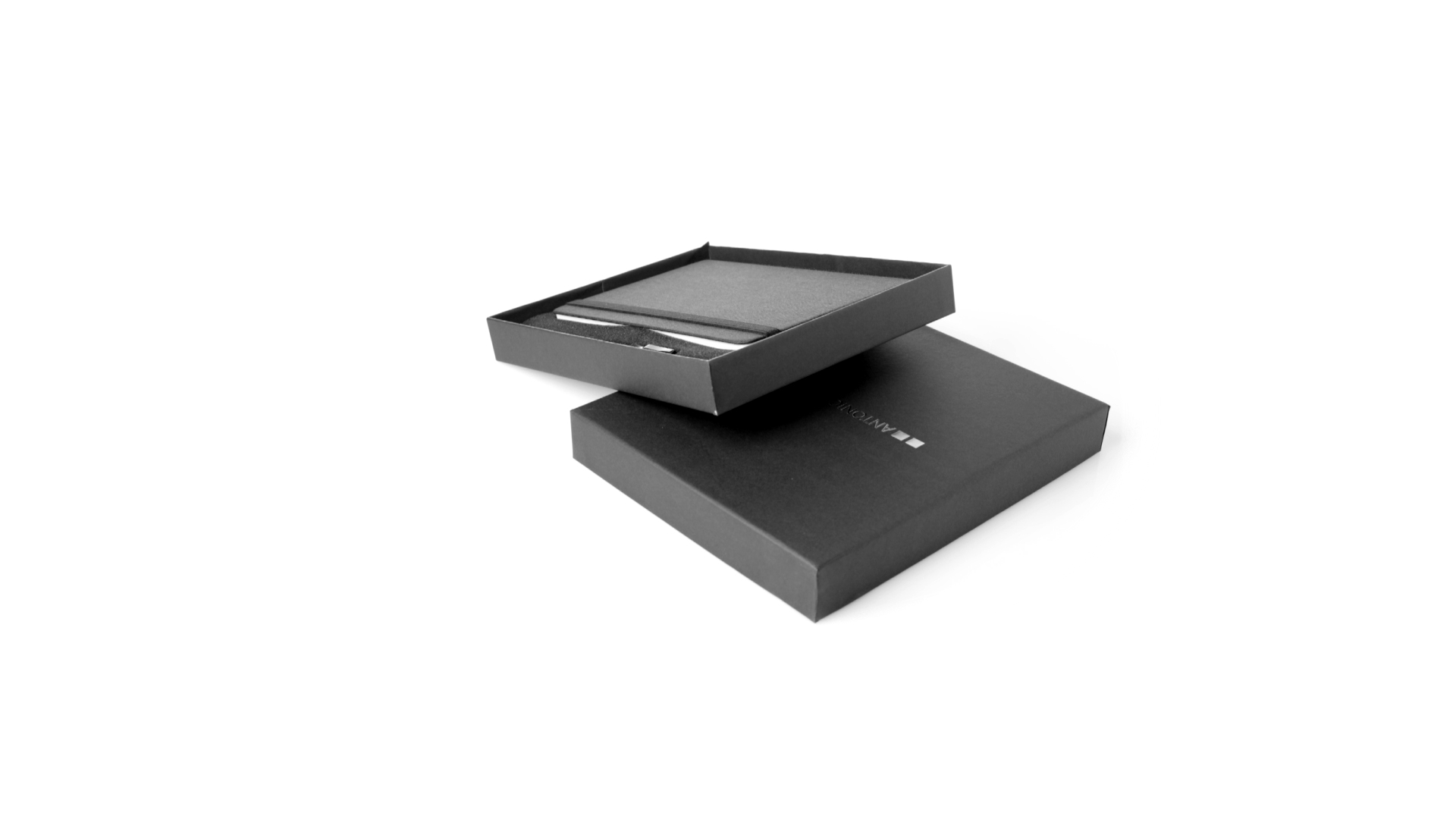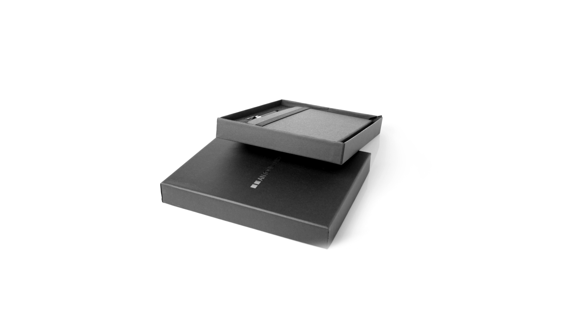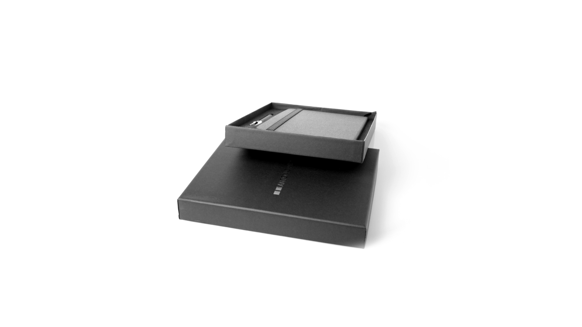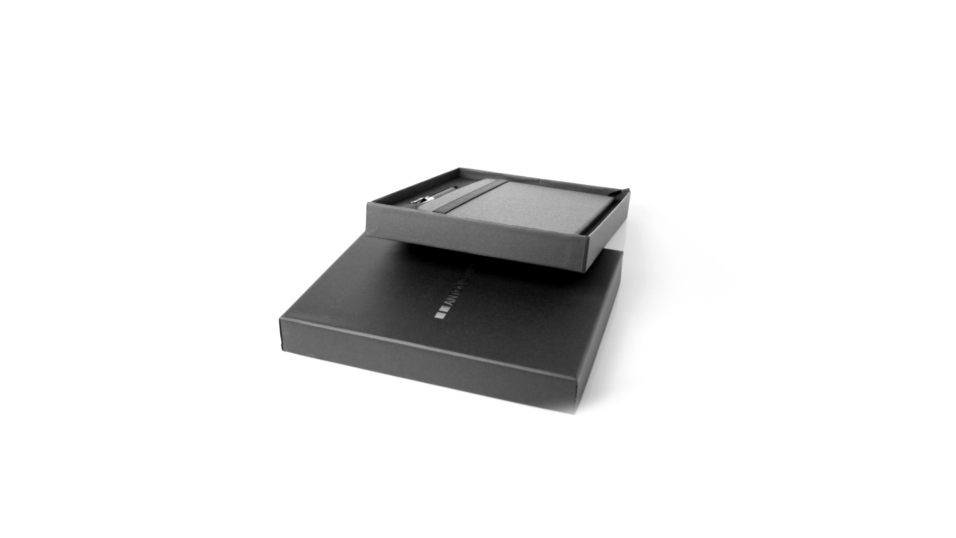 Set aus Notizblock und Stift von Antonio Miró. Enthält:Notizblock in elegantem Schwarz, aus strapazierfähigem 300D-Polyester, mit festem Umschlag und passendem Gummizug. Innenseite mit 100 linierten Blättern.Kugelschreiber aus Metall mit Drehmechanik und blauschreibender Tinte. Mit schwarzem Schaft und Zierleiste, Metallclip und Markenlogo.Das Set wird in einer eleganten und stabilen schwarzen Einzelschachtel mit Antonio Miró-Logo und passender Schutzhülle präsentiert.