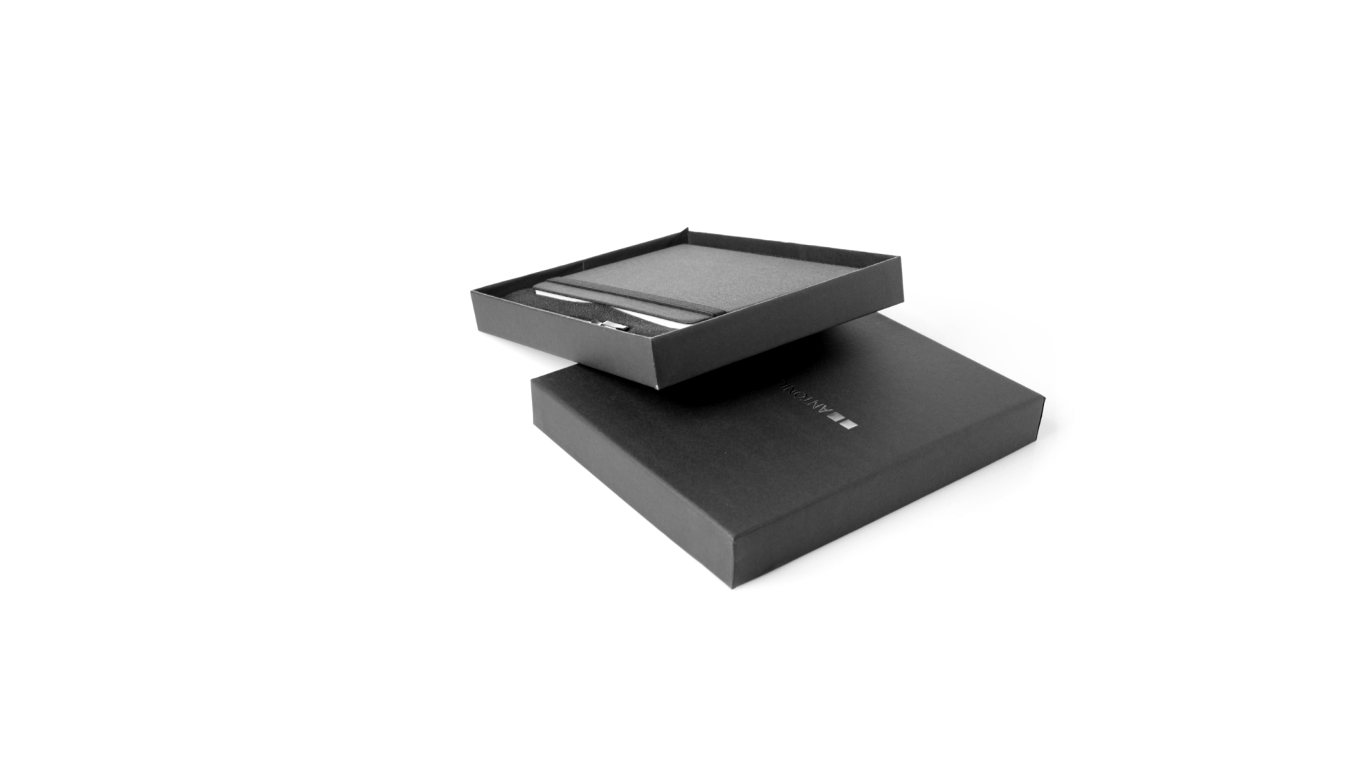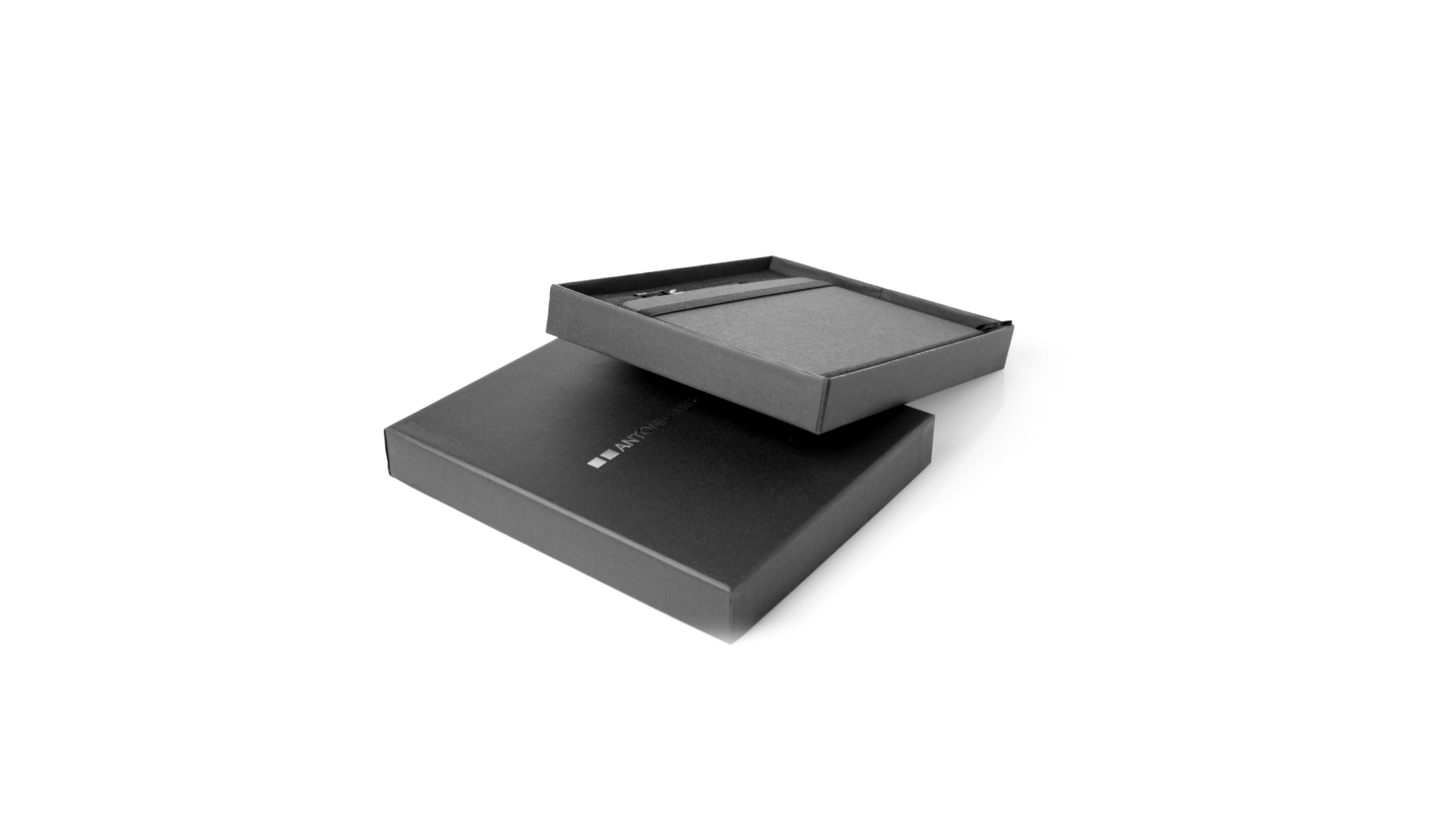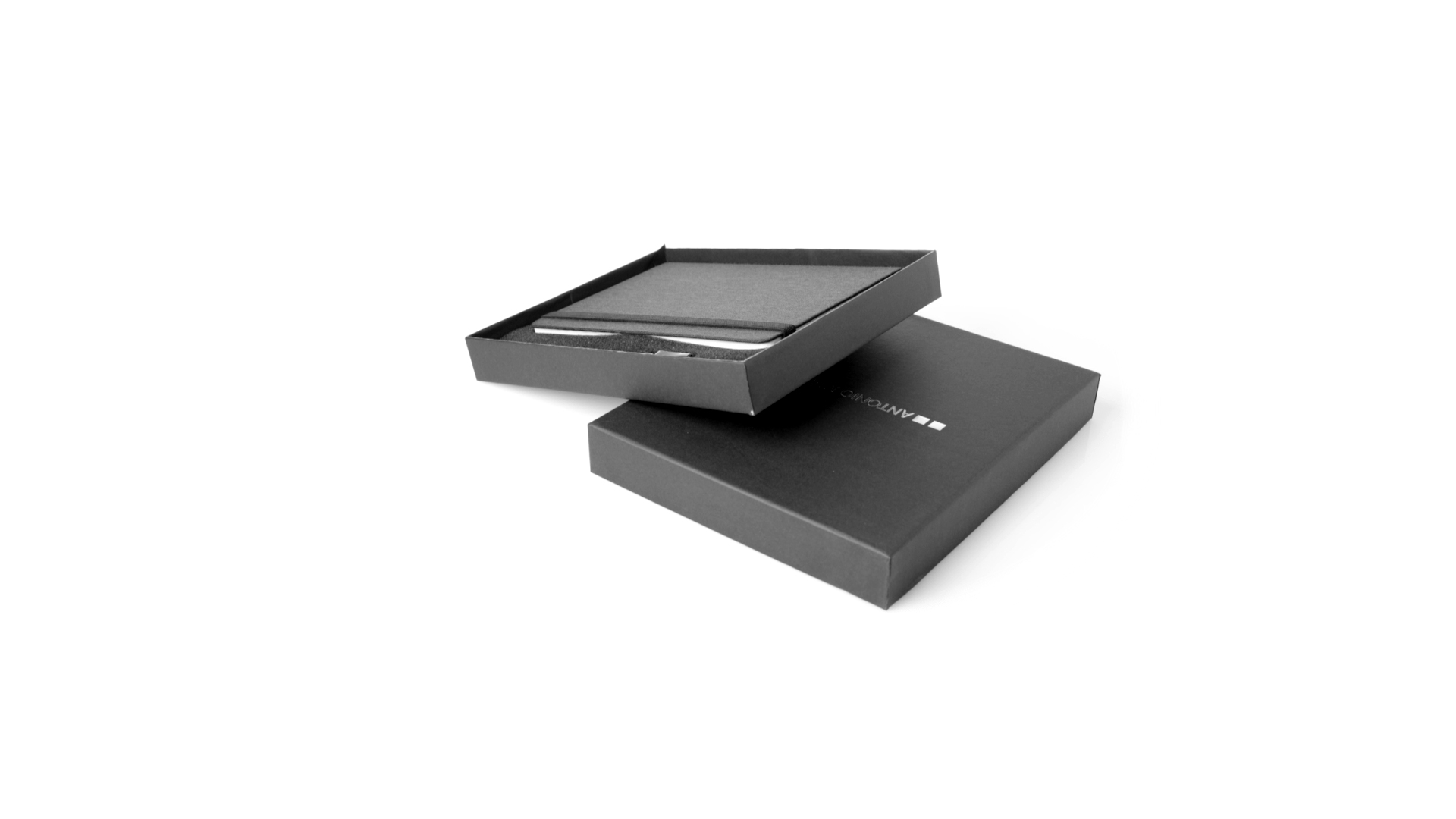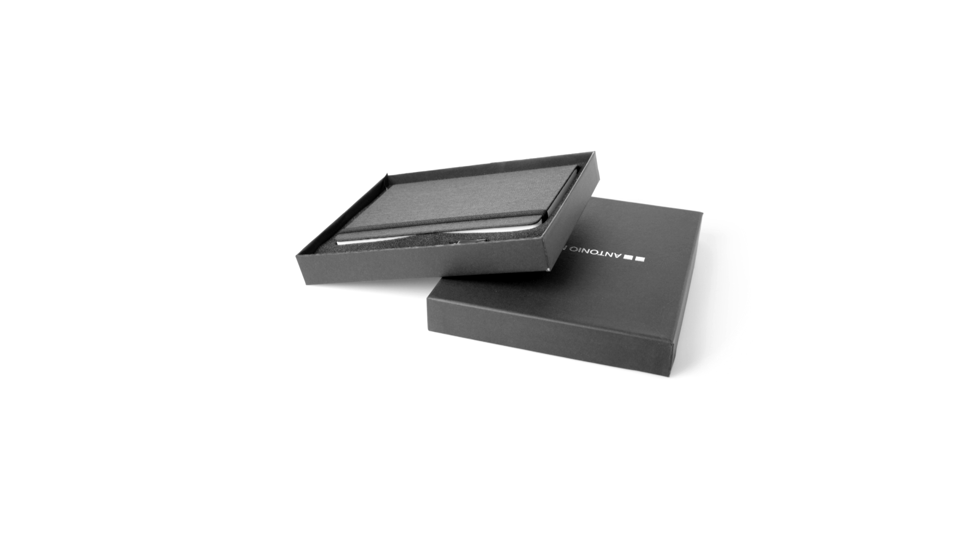 Set aus Notizblock und Stift von Antonio Miró. Enthält:Notizblock in elegantem Schwarz, aus strapazierfähigem 300D-Polyester, mit festem Umschlag und passendem Gummizug. Innenseite mit 100 linierten Blättern.Kugelschreiber aus Metall mit Drehmechanik und blauschreibender Tinte. Mit schwarzem Schaft und Zierleiste, Metallclip und Markenlogo.Das Set wird in einer eleganten und stabilen schwarzen Einzelschachtel mit Antonio Miró-Logo und passender Schutzhülle präsentiert.