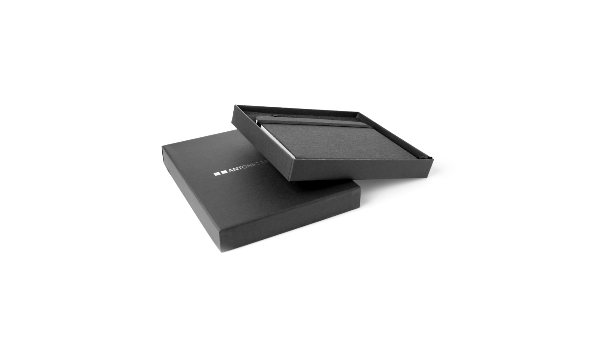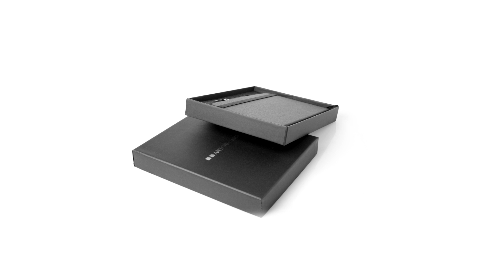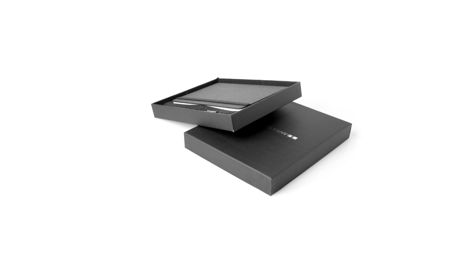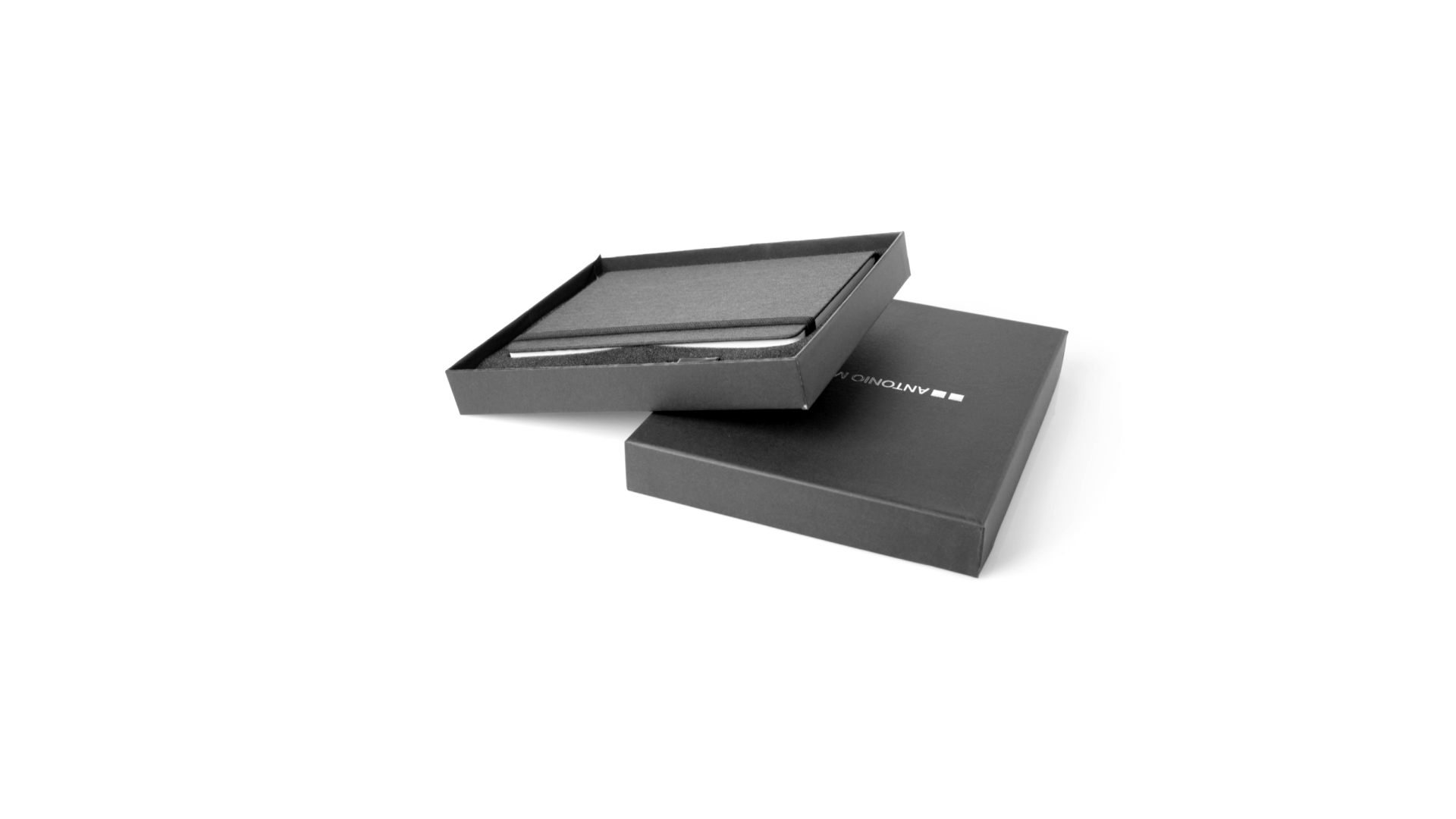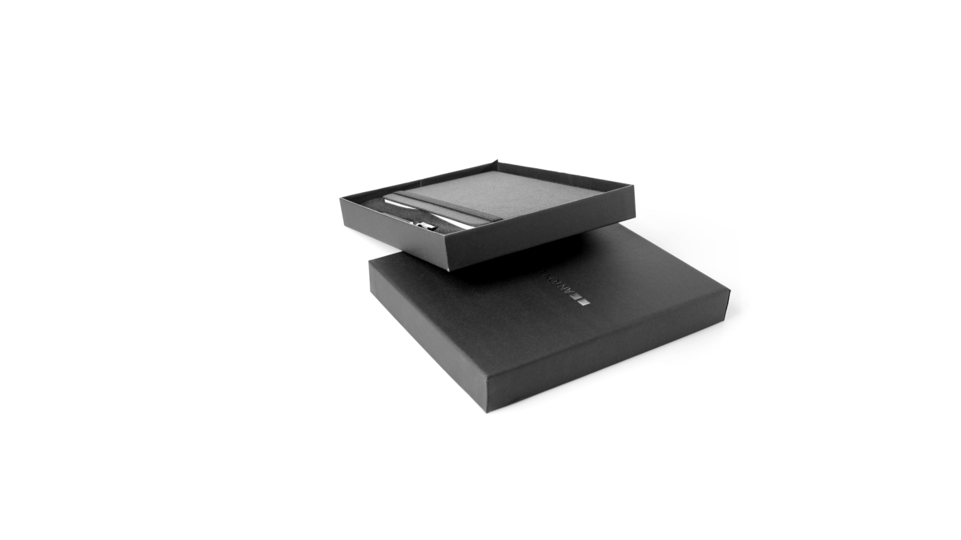 Set aus Notizblock und Stift von Antonio Miró. Enthält:Notizblock in elegantem Schwarz, aus strapazierfähigem 300D-Polyester, mit festem Umschlag und passendem Gummizug. Innenseite mit 100 linierten Blättern.Kugelschreiber aus Metall mit Drehmechanik und blauschreibender Tinte. Mit schwarzem Schaft und Zierleiste, Metallclip und Markenlogo.Das Set wird in einer eleganten und stabilen schwarzen Einzelschachtel mit Antonio Miró-Logo und passender Schutzhülle präsentiert.