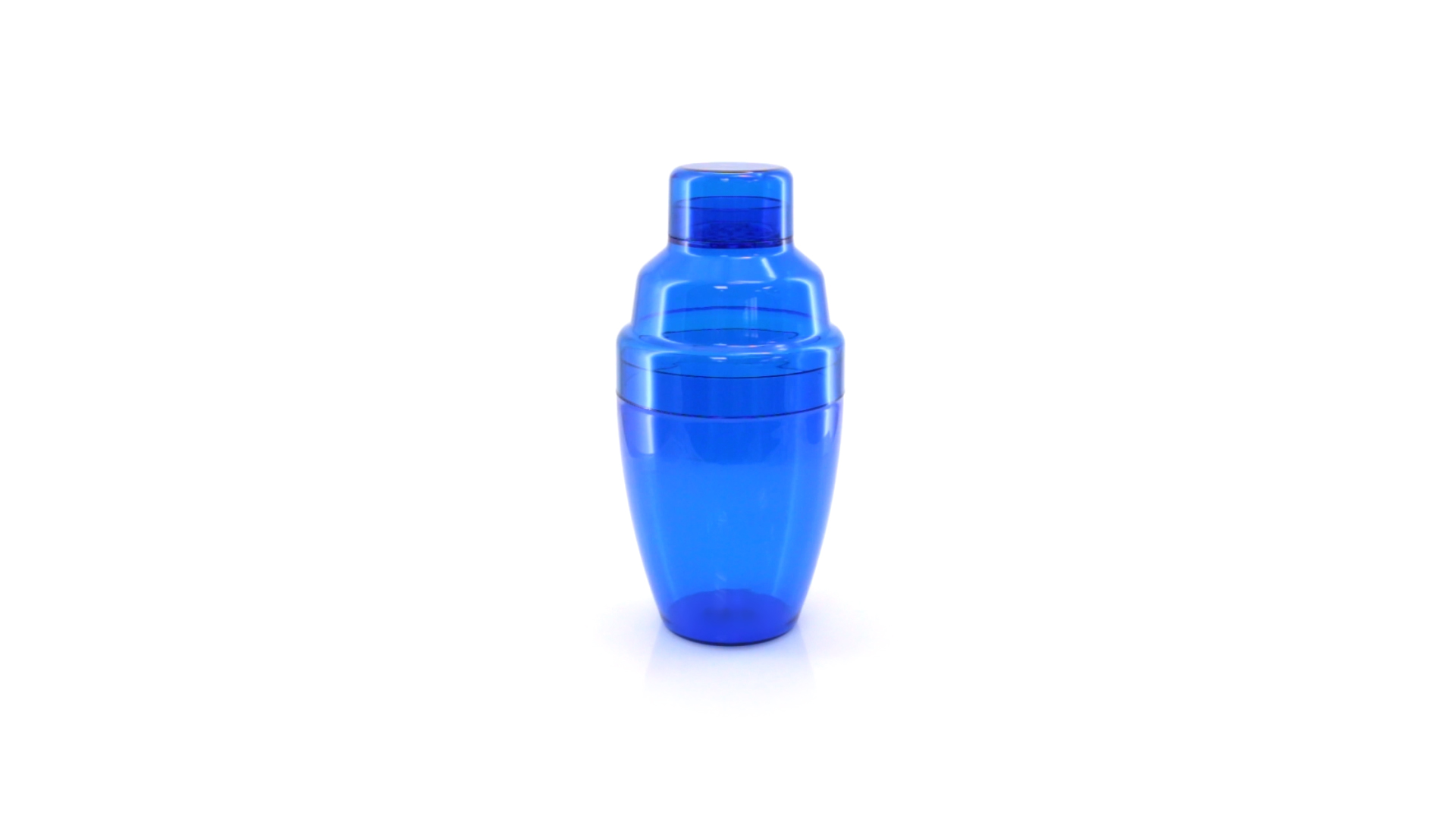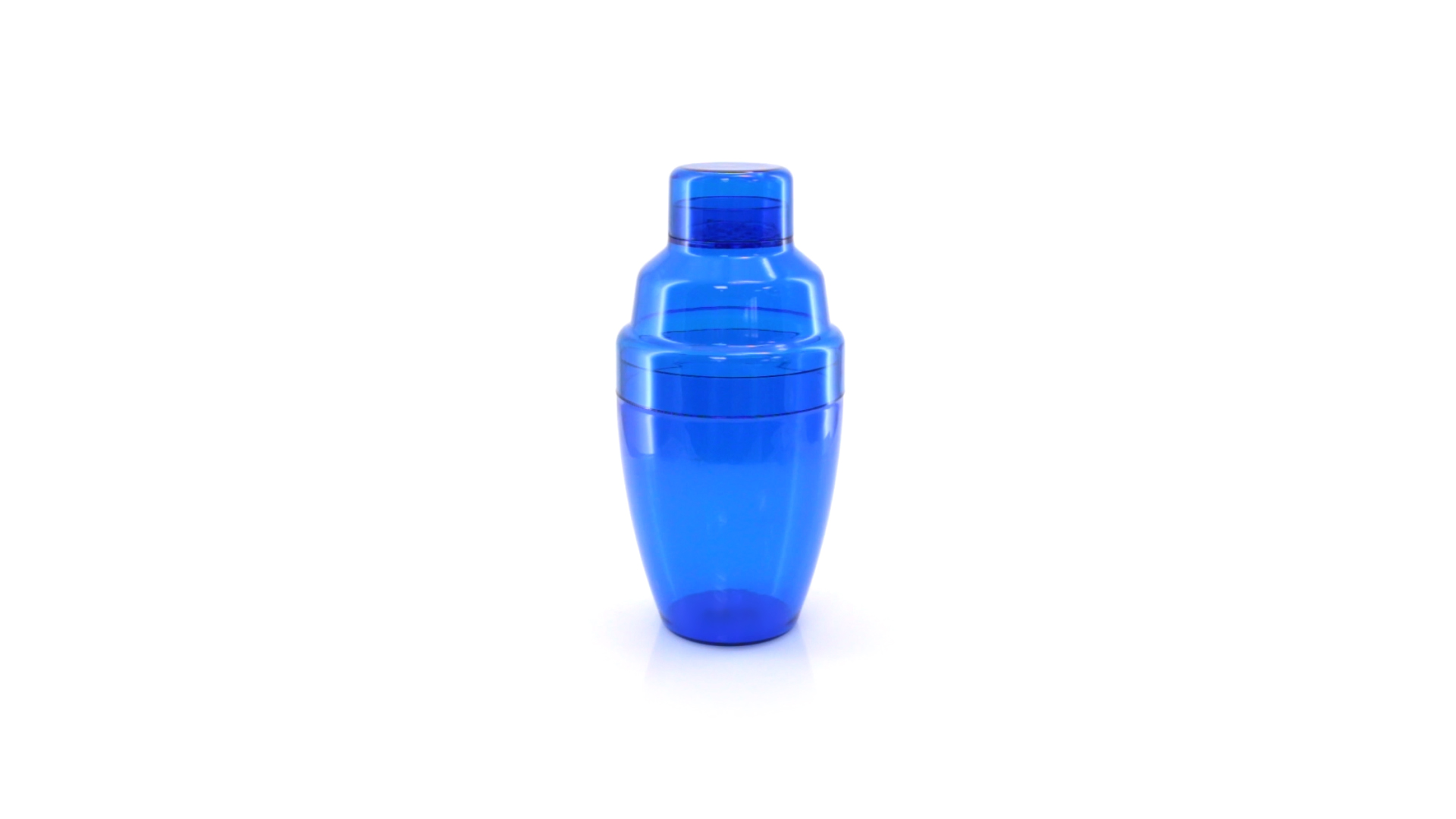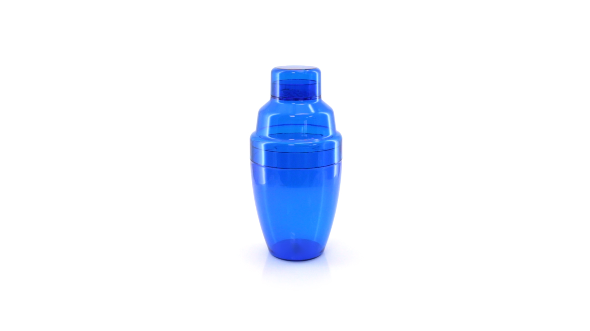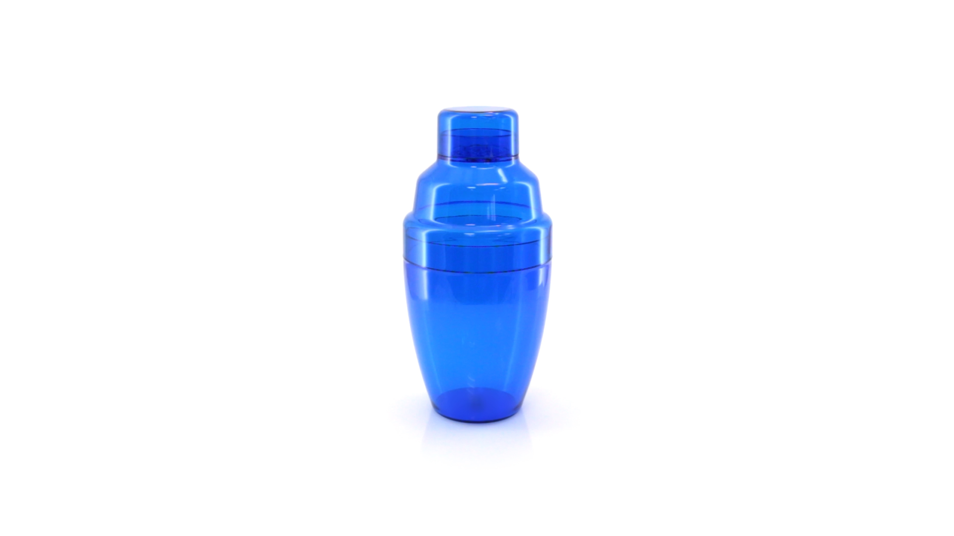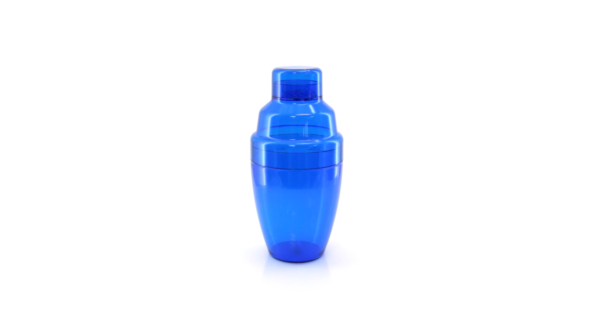 Cocktail Shaker mit 300 ml Fassungsvermögen aus transparentem PS-Kunststoff in kräftigen Farben. Mit Sicherheitsverschluss und Dosierkappe.