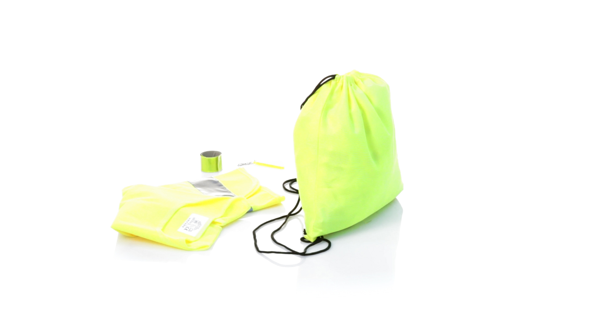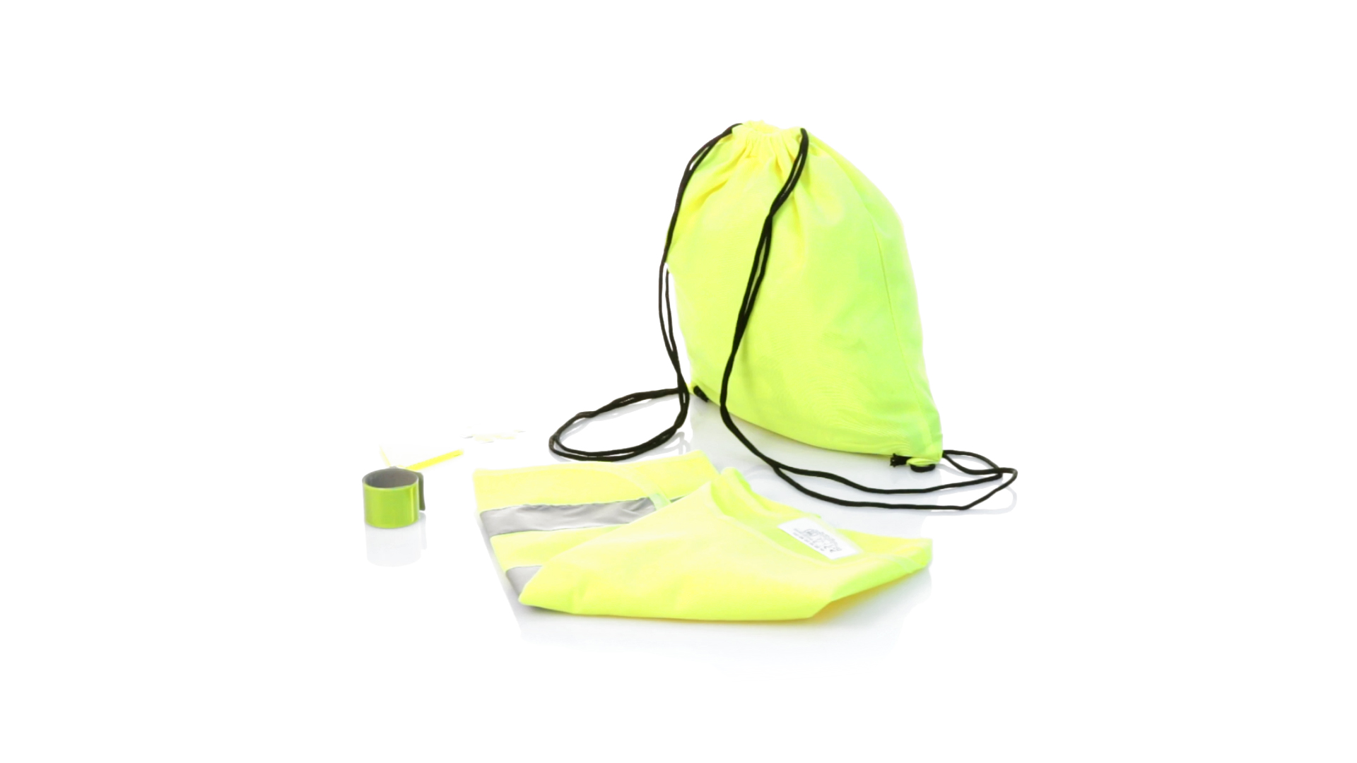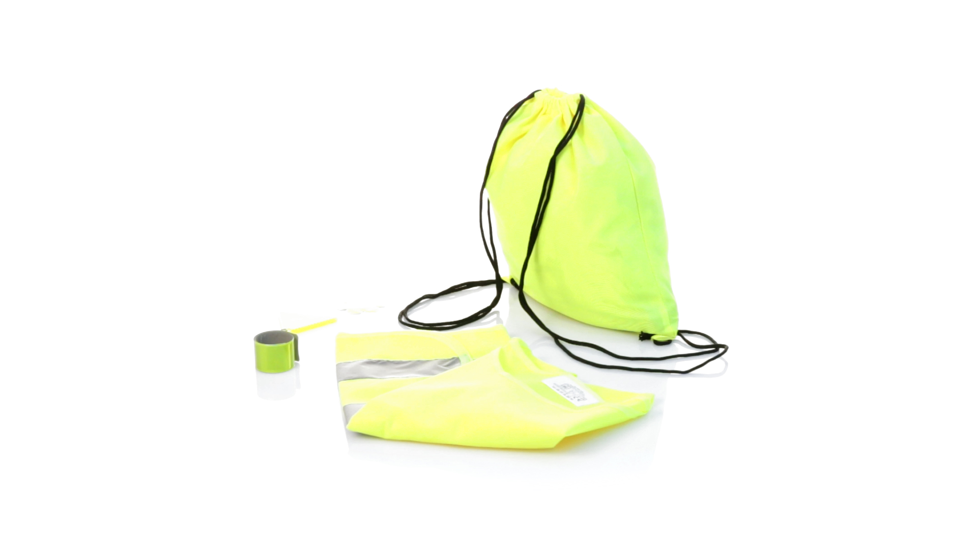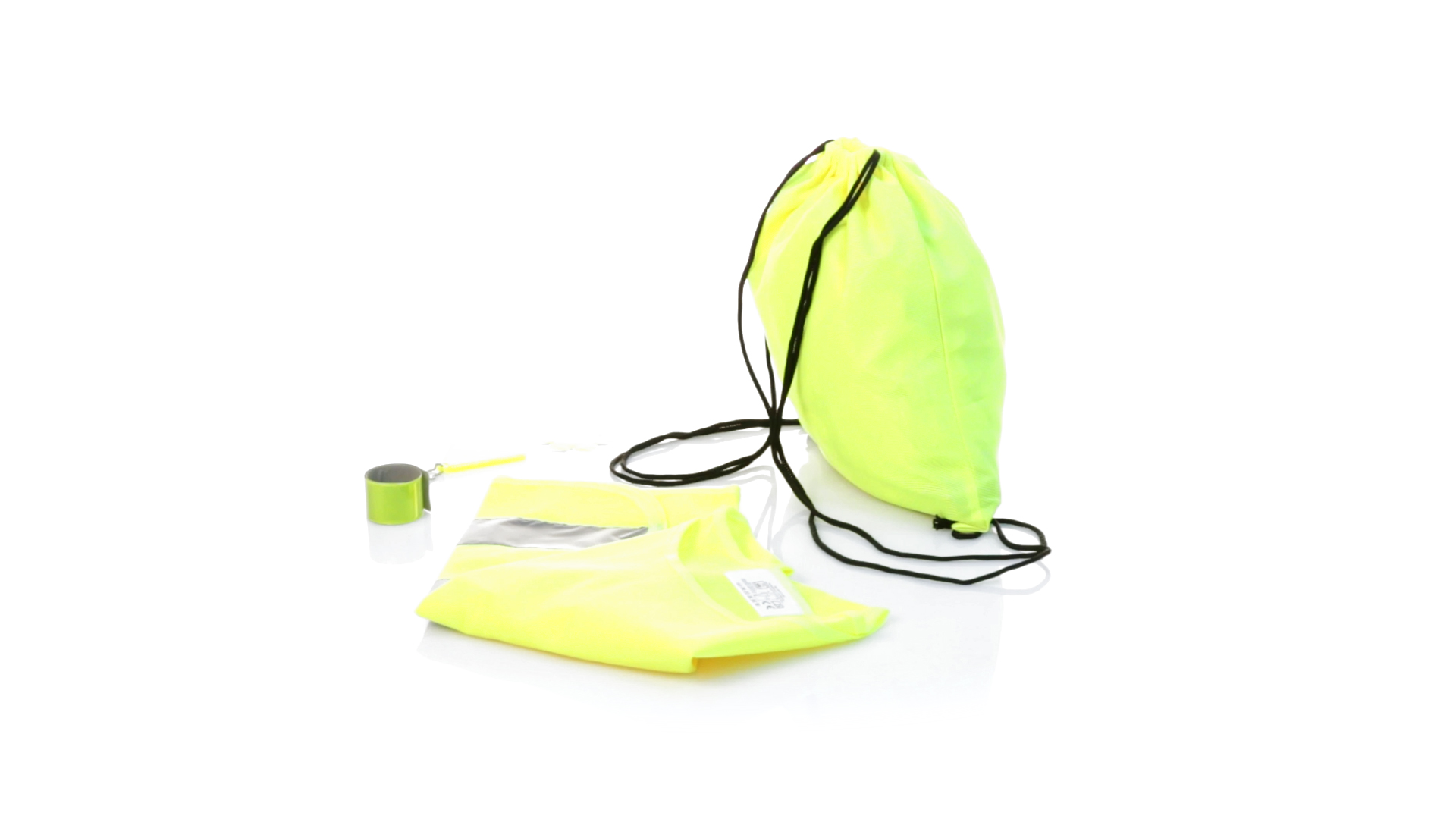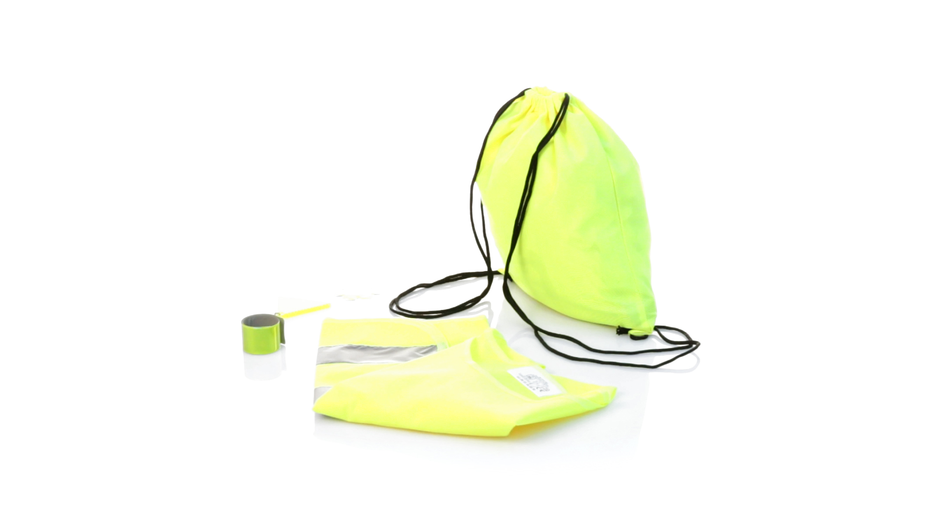 Kinder-Sicherheitsset mit hoher Sichtbarkeit in hellem Gelb. Enthält reflektierende Weste, Rucksack mit Kordelzug mit den Massen 28 x 33 cm, reflektierenden PVC-Schlüsselanhänger, reflektierendes Schnapparmband und reflektierenden Aufkleber.
