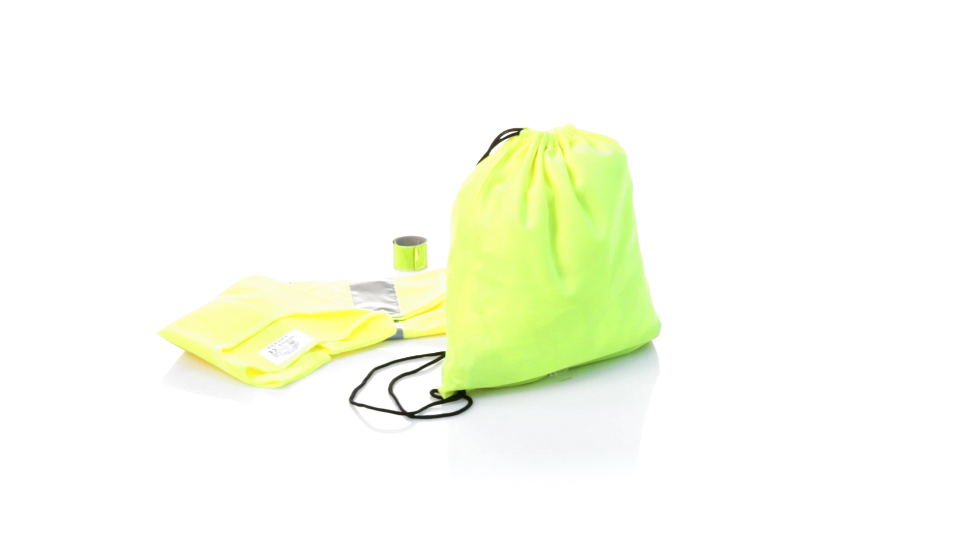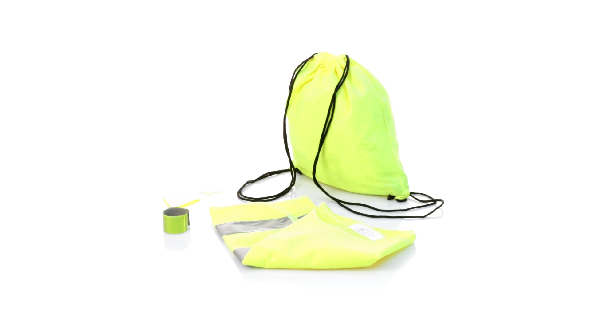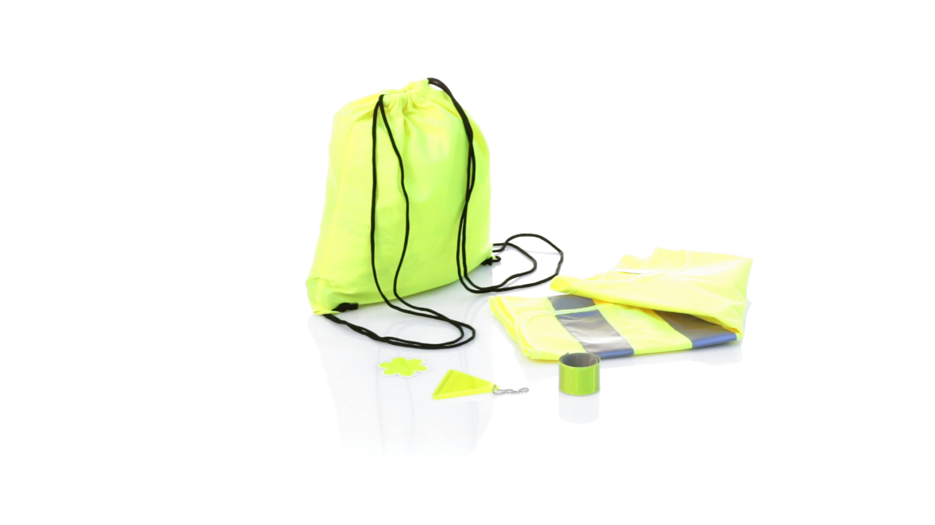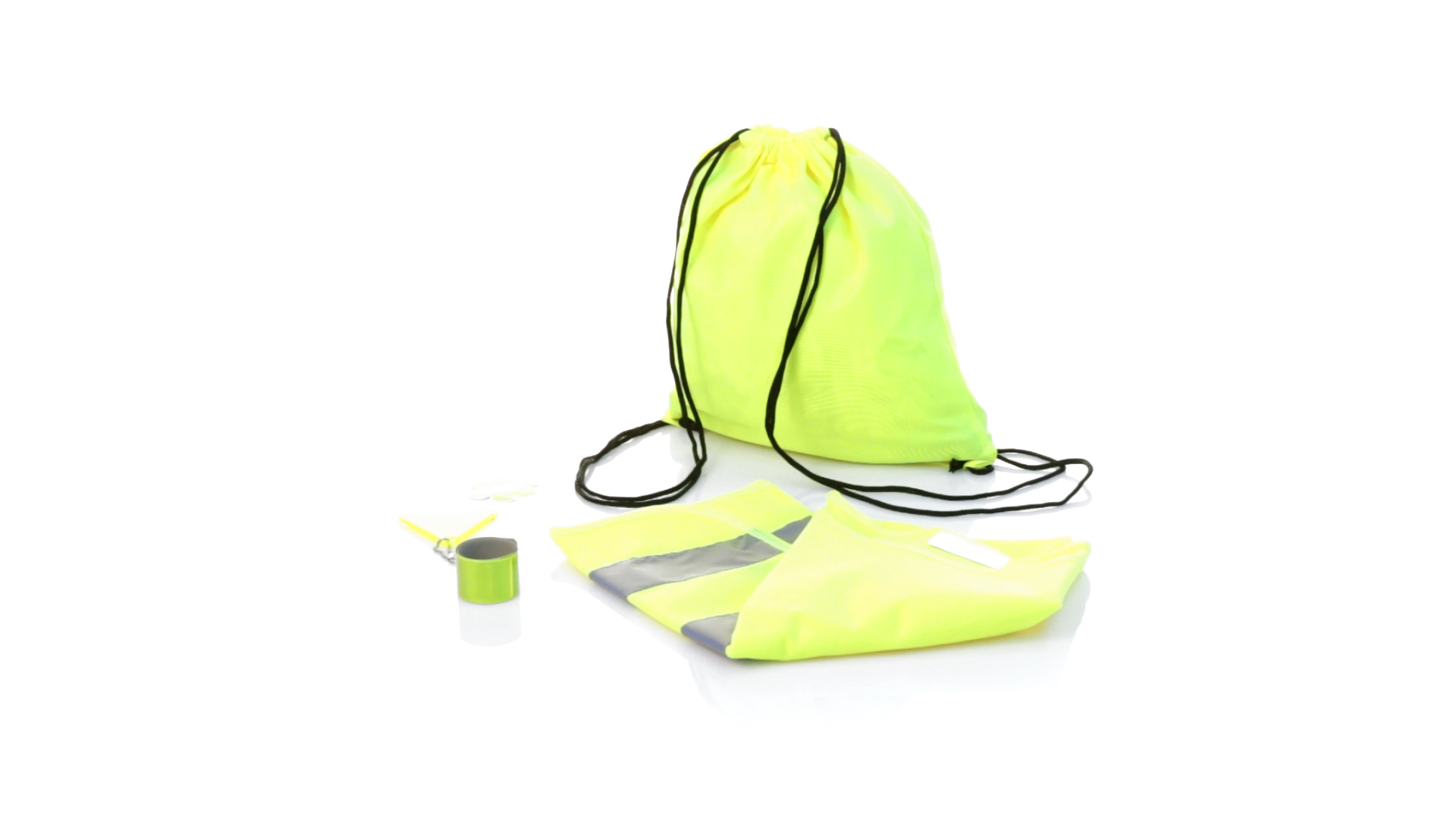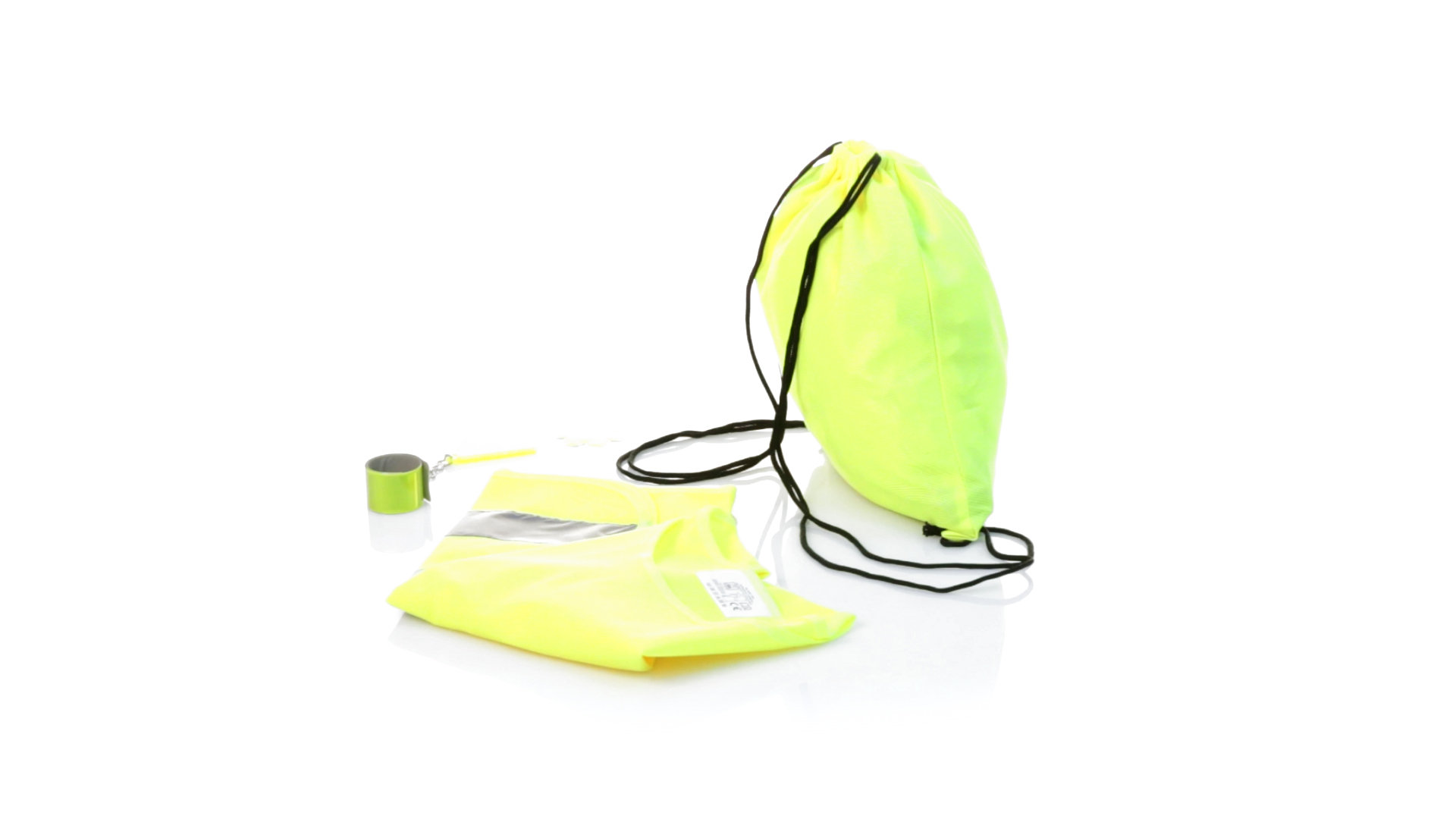Kinder-Sicherheitsset mit hoher Sichtbarkeit in hellem Gelb. Enthält reflektierende Weste, Rucksack mit Kordelzug mit den Massen 28 x 33 cm, reflektierenden PVC-Schlüsselanhänger, reflektierendes Schnapparmband und reflektierenden Aufkleber.