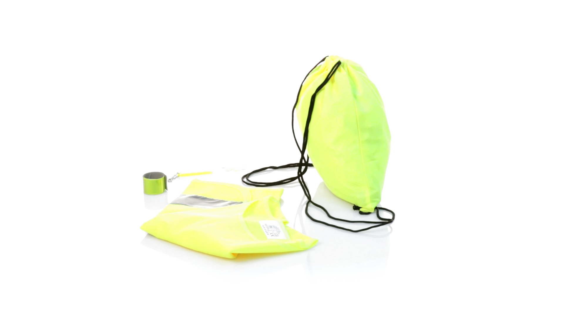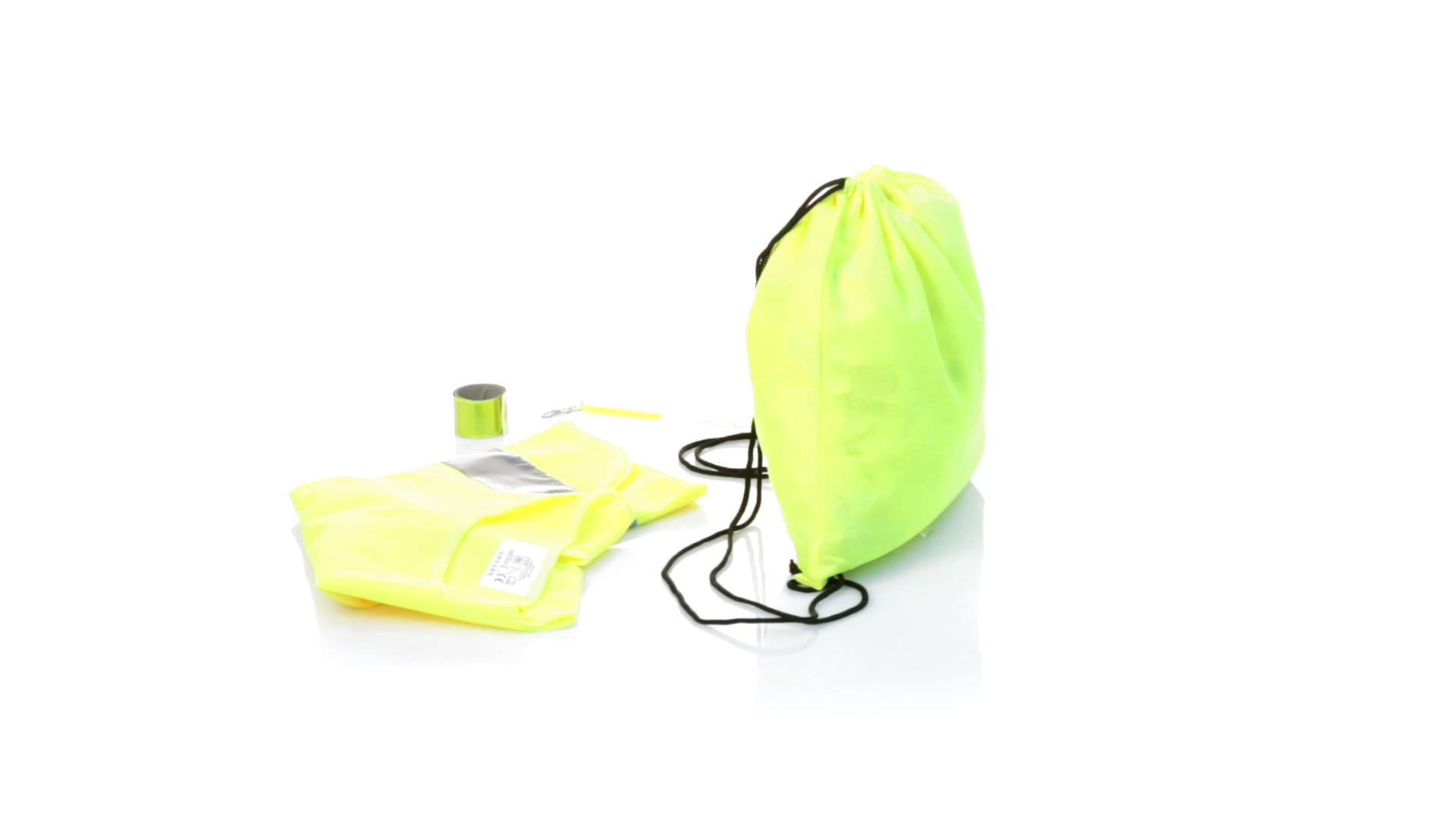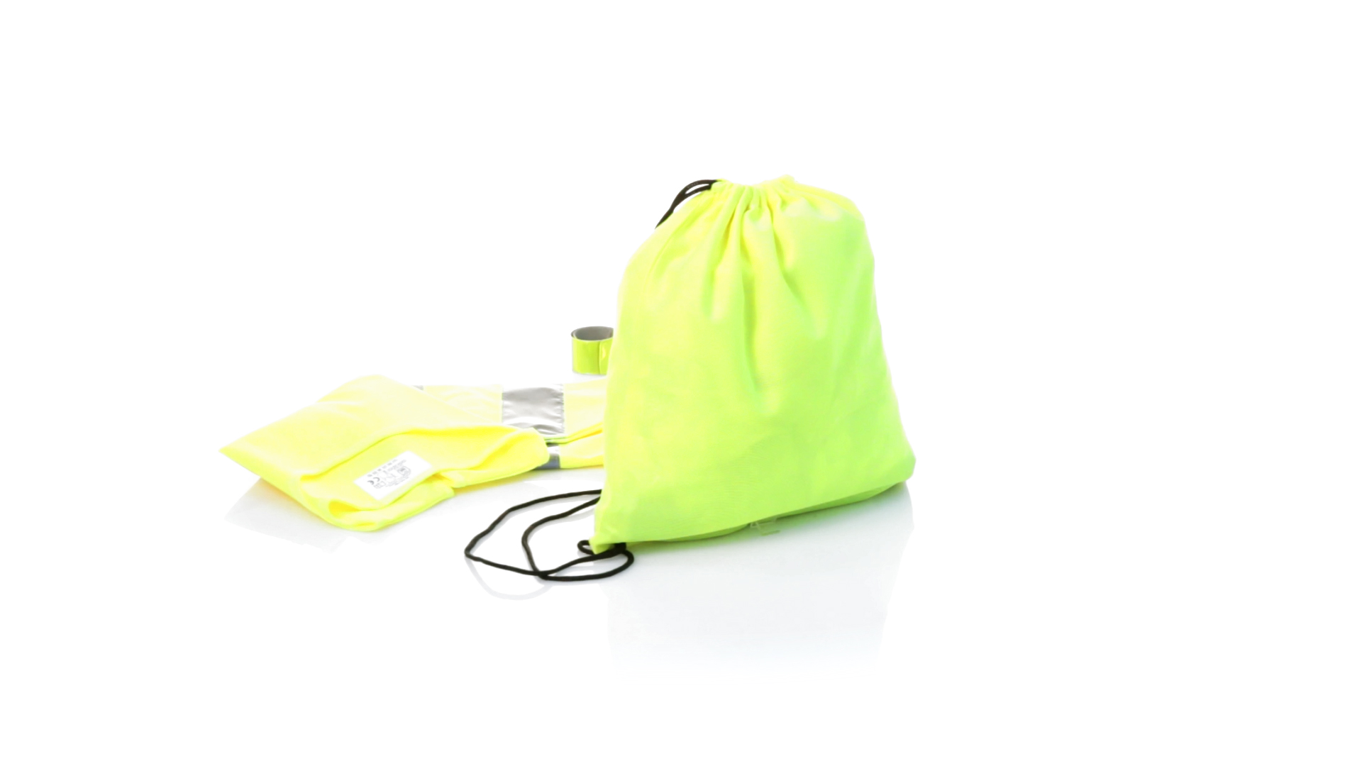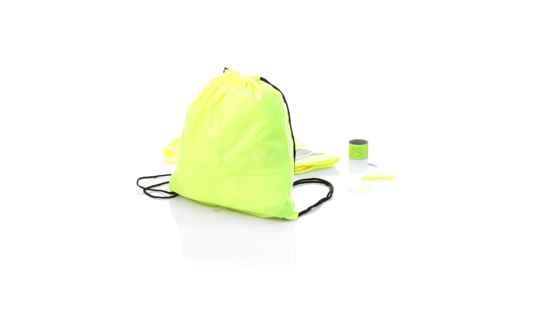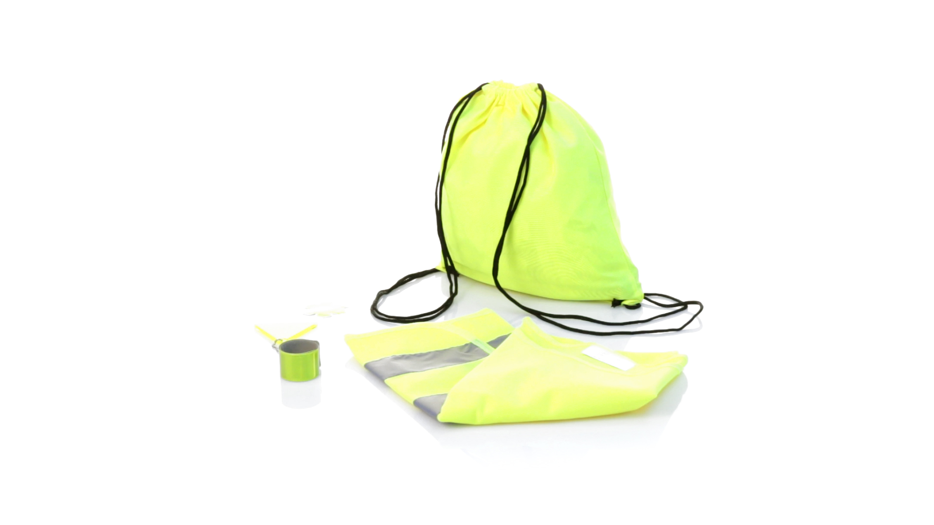 Kinder-Sicherheitsset mit hoher Sichtbarkeit in hellem Gelb. Enthält reflektierende Weste, Rucksack mit Kordelzug mit den Massen 28 x 33 cm, reflektierenden PVC-Schlüsselanhänger, reflektierendes Schnapparmband und reflektierenden Aufkleber.