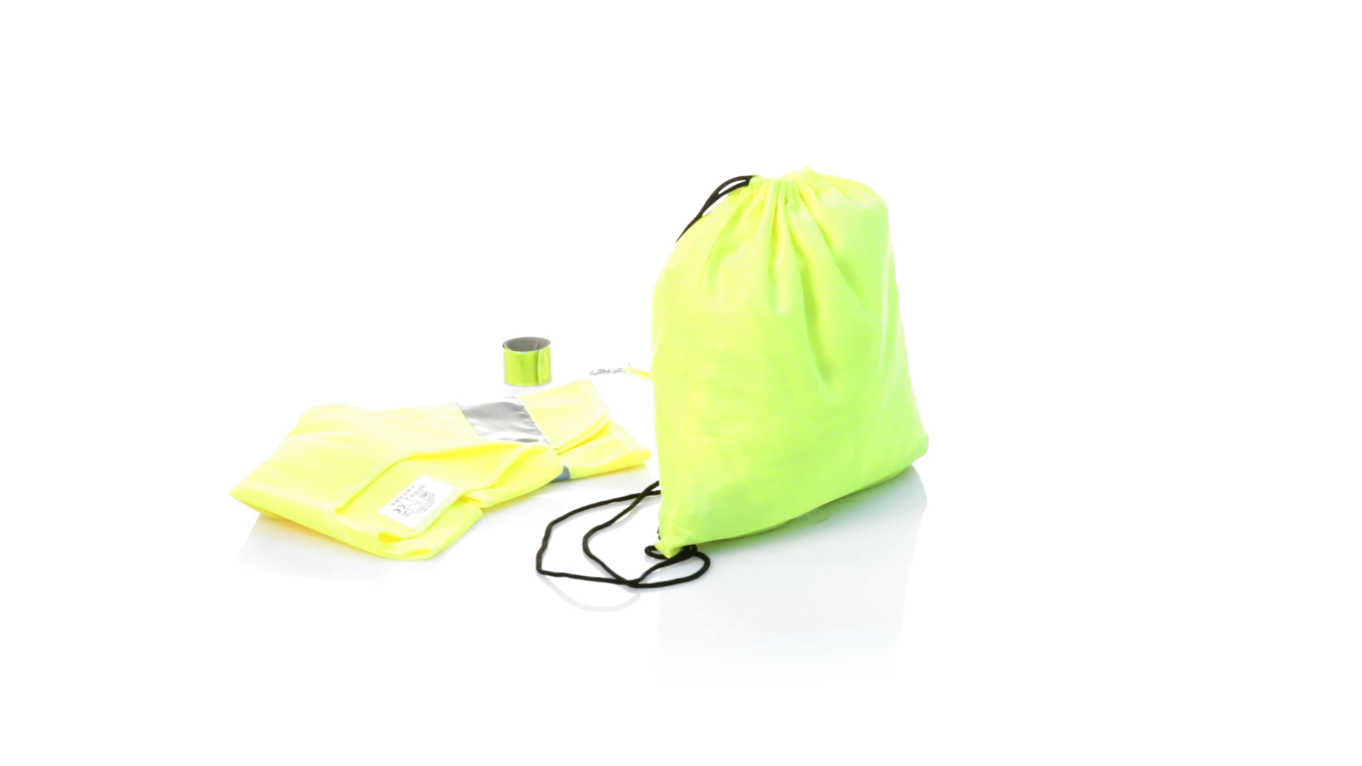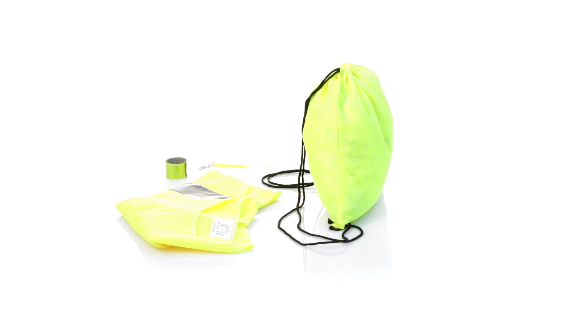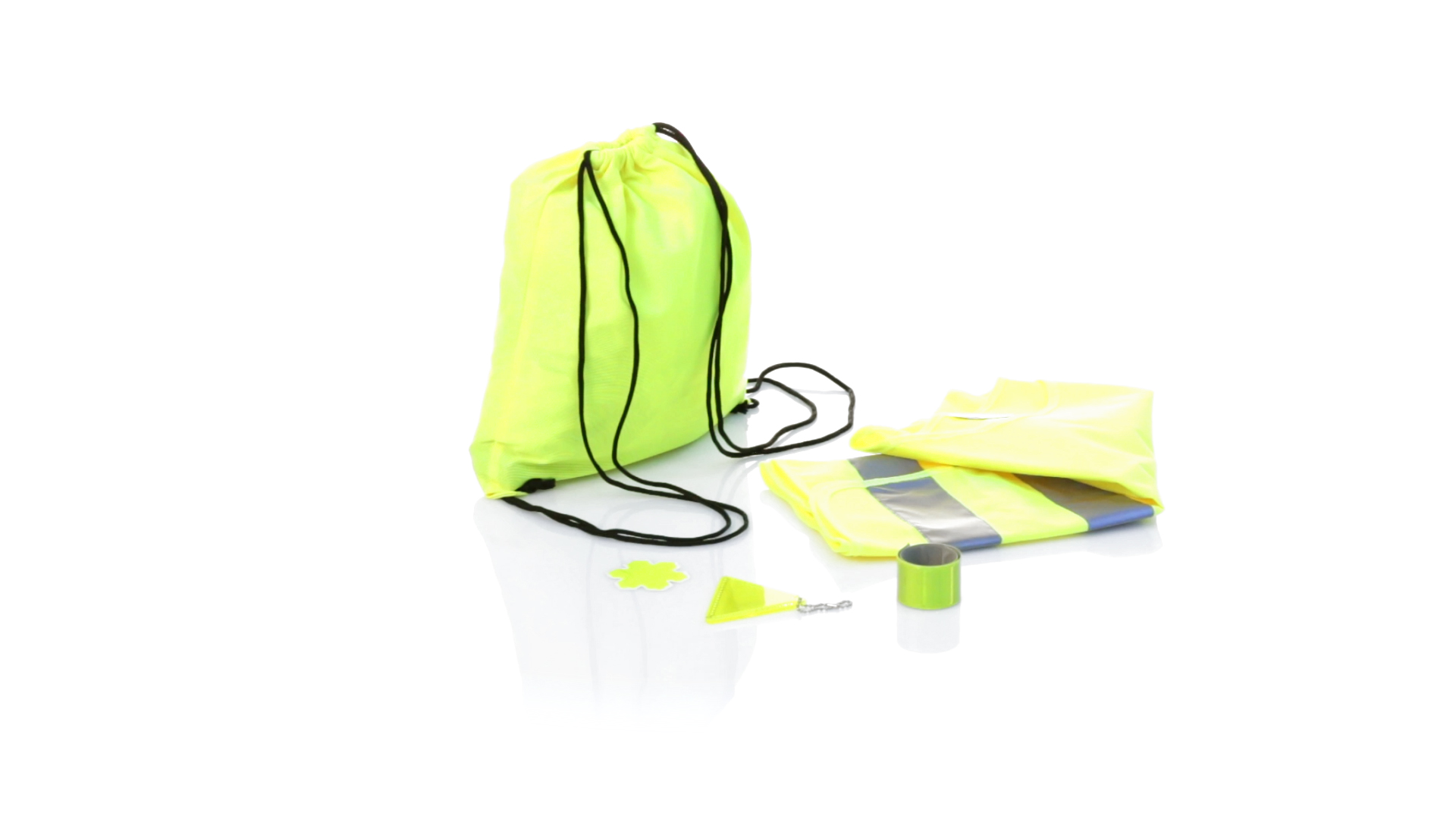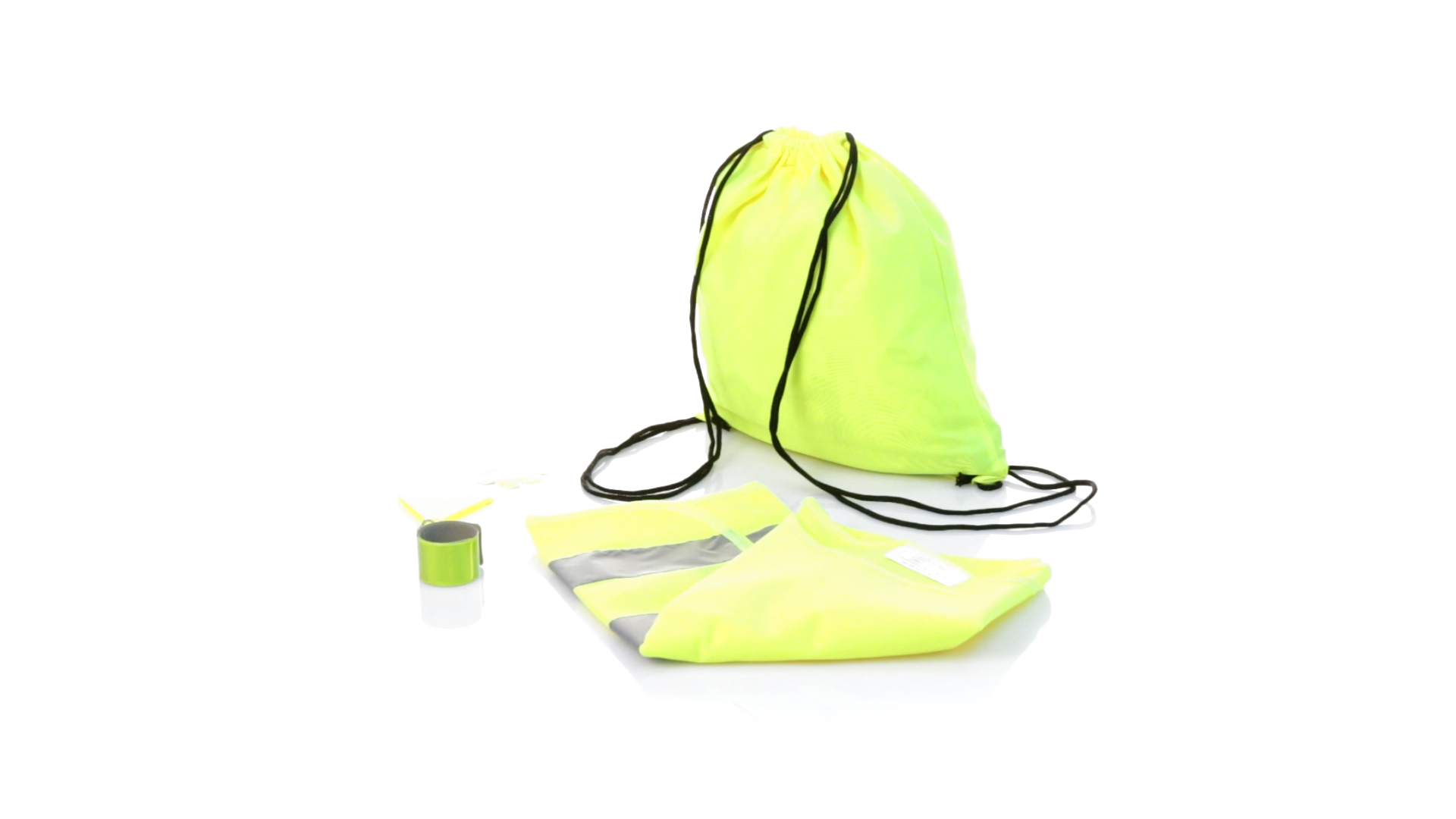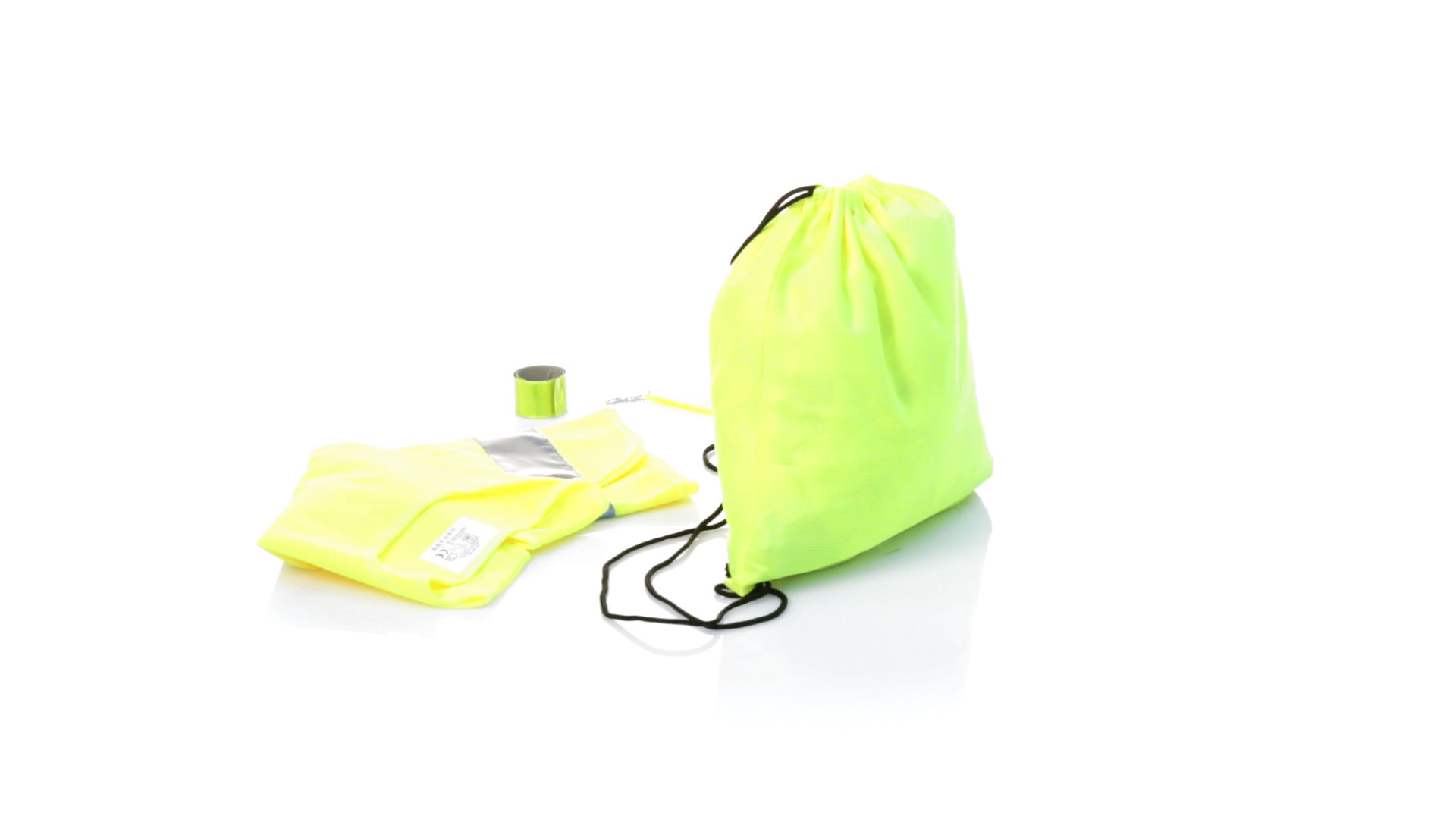 Kinder-Sicherheitsset mit hoher Sichtbarkeit in hellem Gelb. Enthält reflektierende Weste, Rucksack mit Kordelzug mit den Massen 28 x 33 cm, reflektierenden PVC-Schlüsselanhänger, reflektierendes Schnapparmband und reflektierenden Aufkleber.