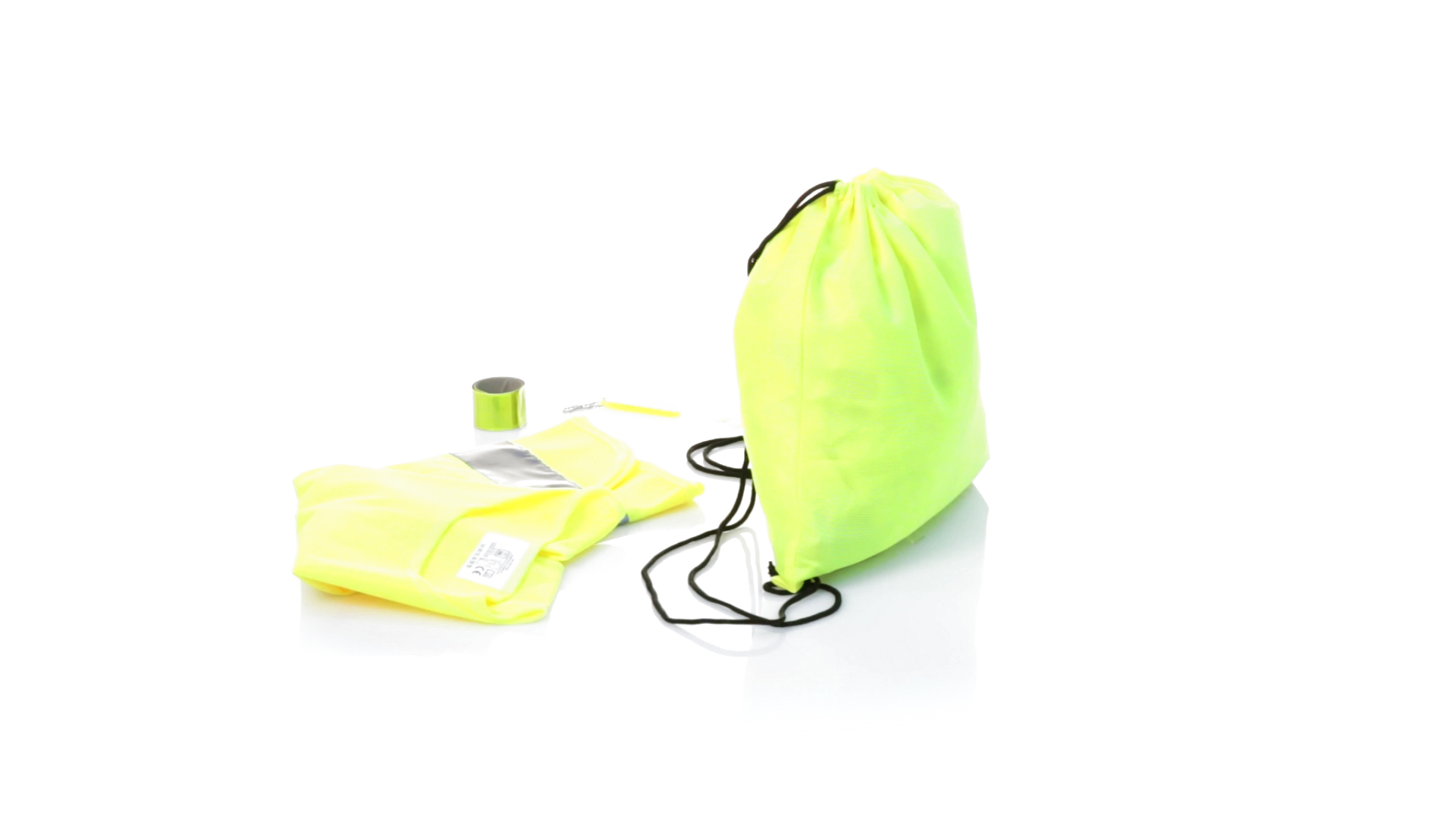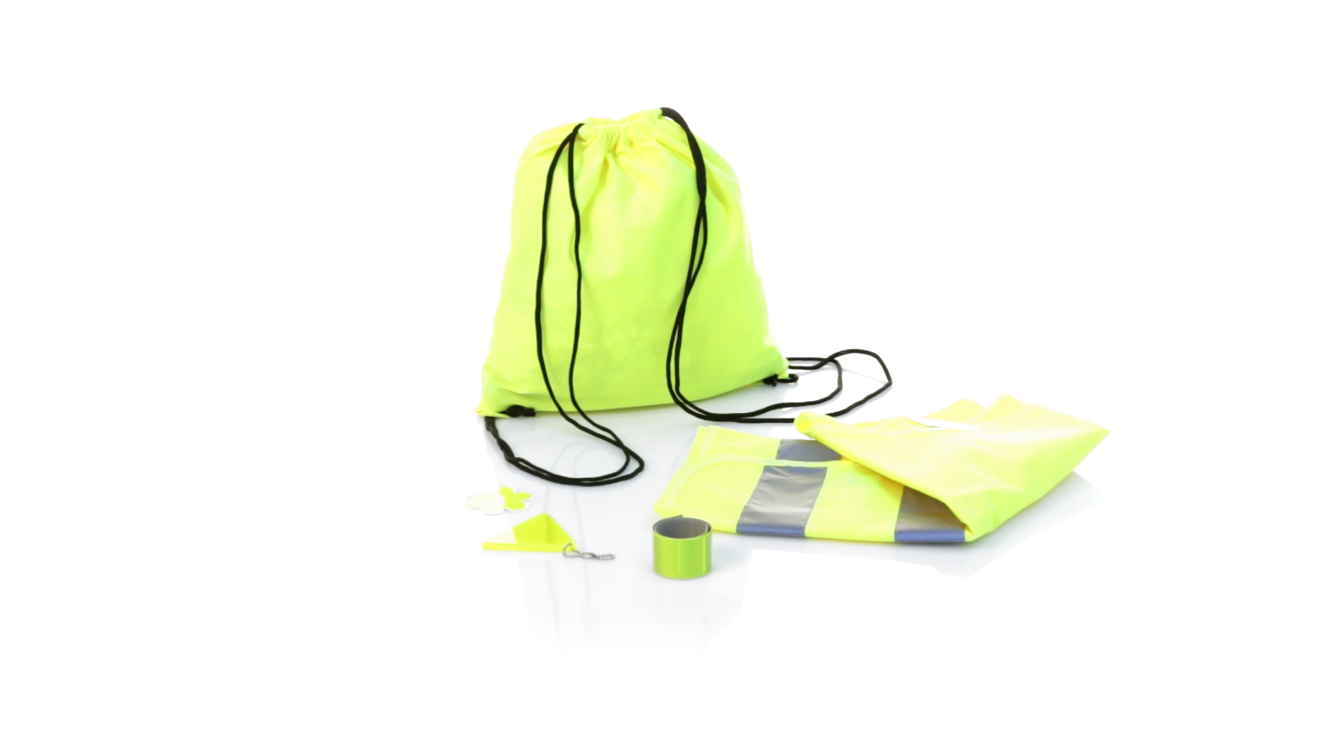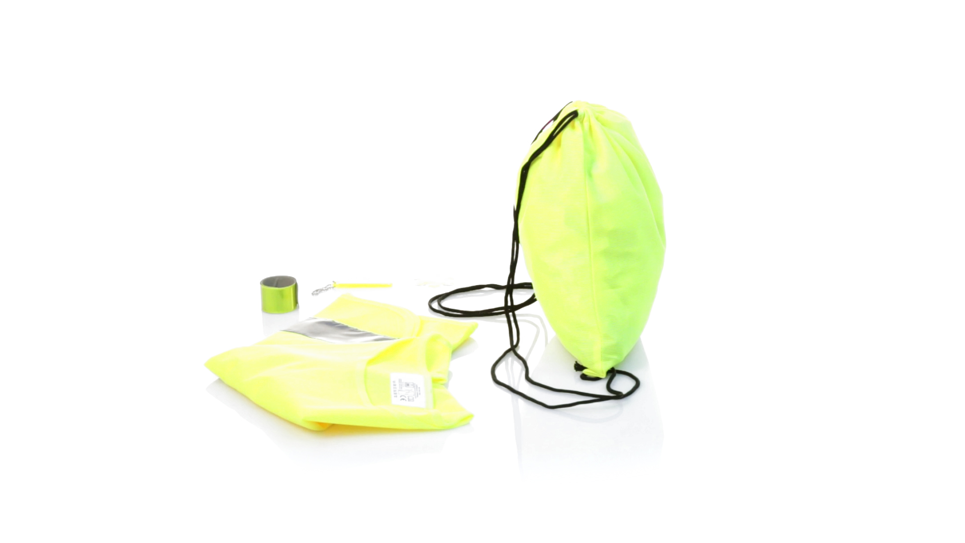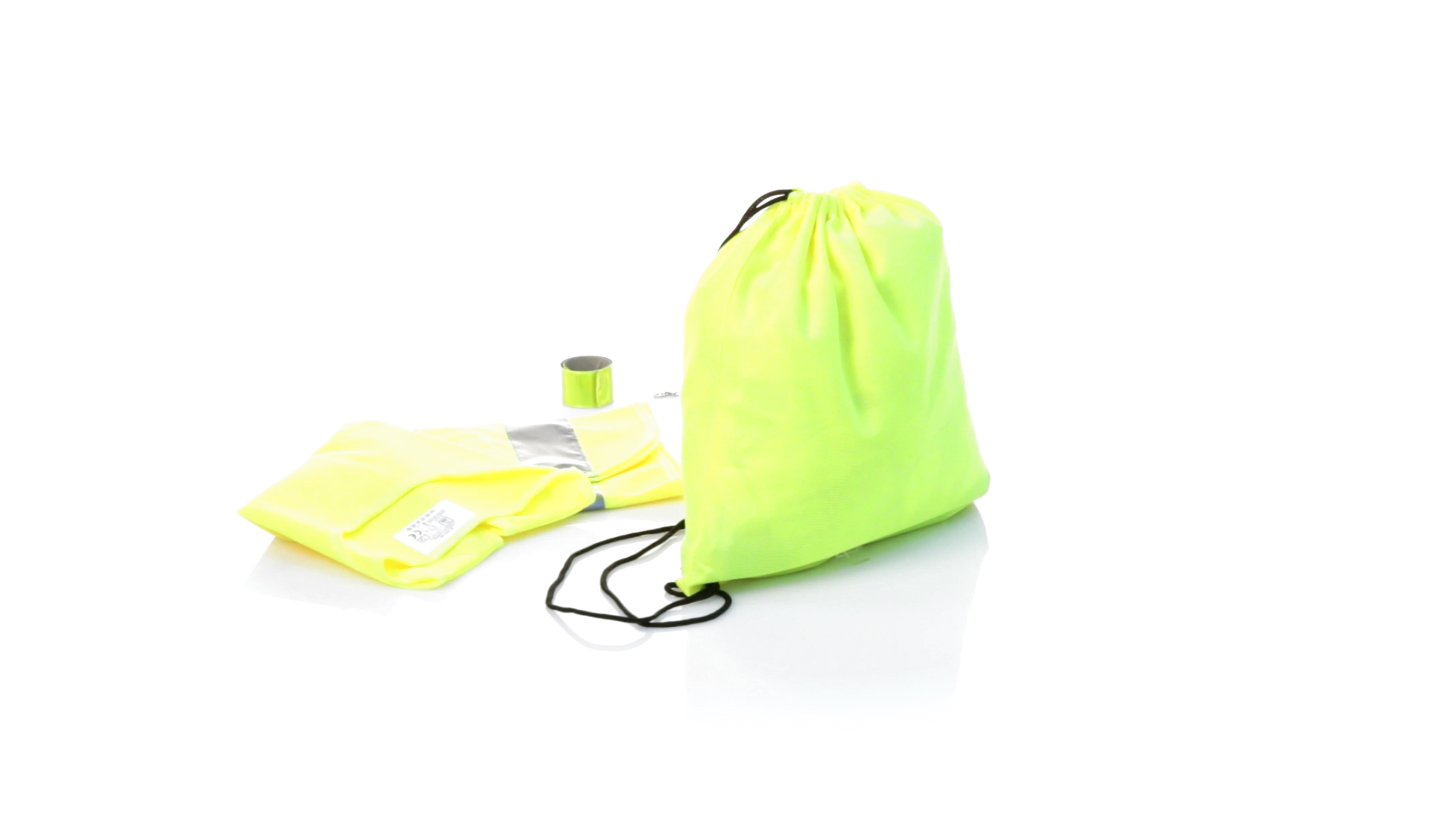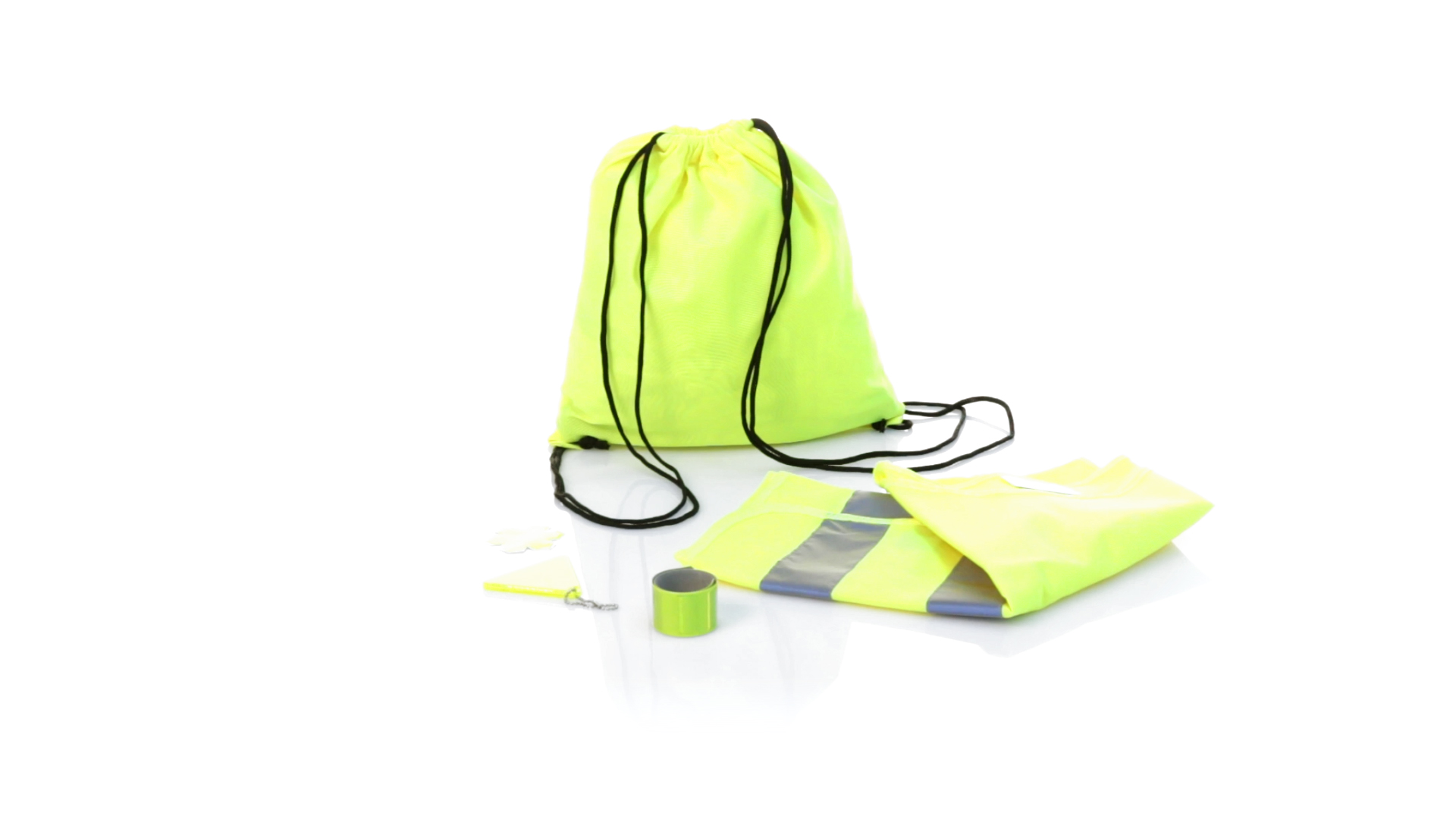 Kinder-Sicherheitsset mit hoher Sichtbarkeit in hellem Gelb. Enthält reflektierende Weste, Rucksack mit Kordelzug mit den Massen 28 x 33 cm, reflektierenden PVC-Schlüsselanhänger, reflektierendes Schnapparmband und reflektierenden Aufkleber.
