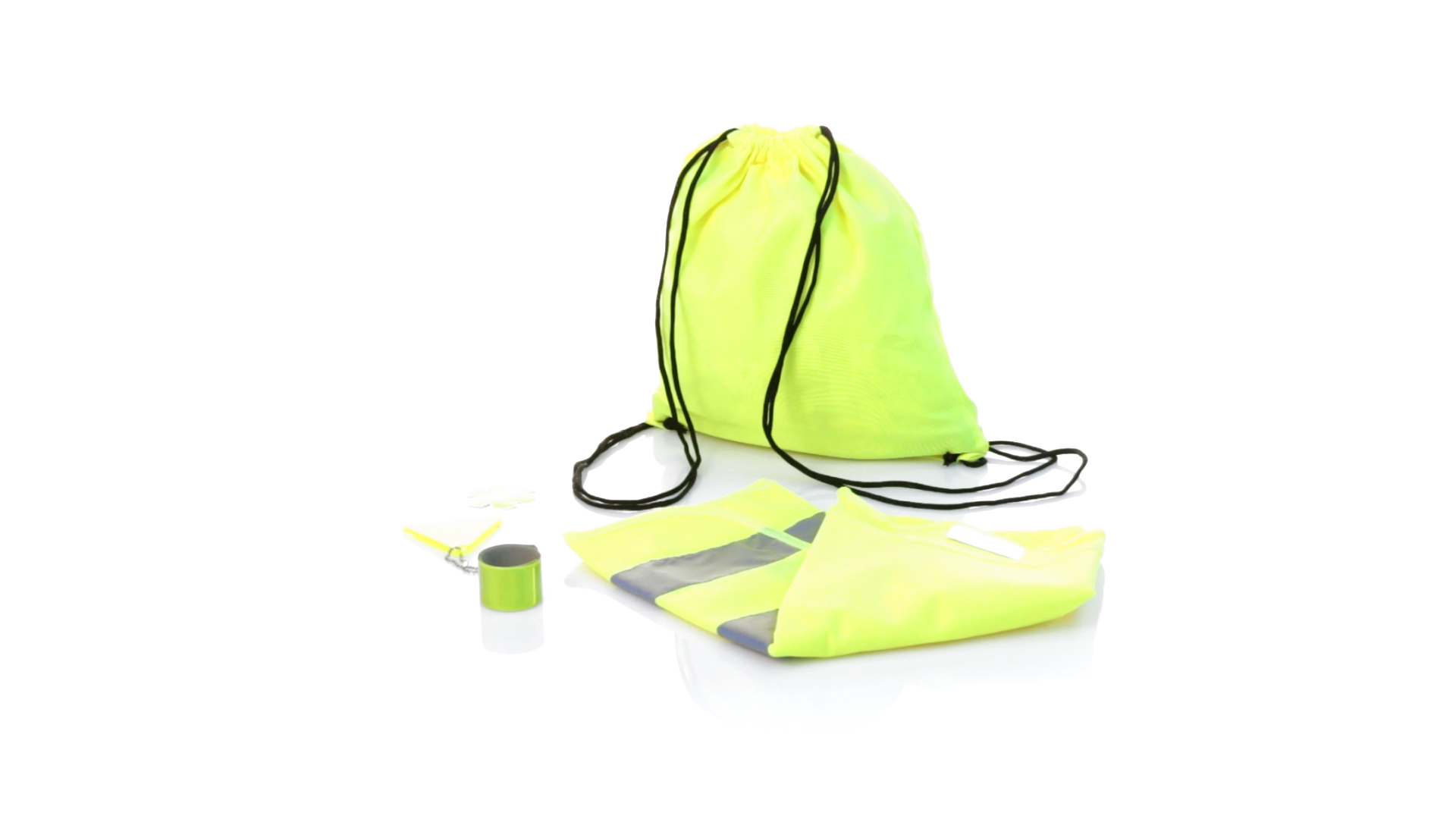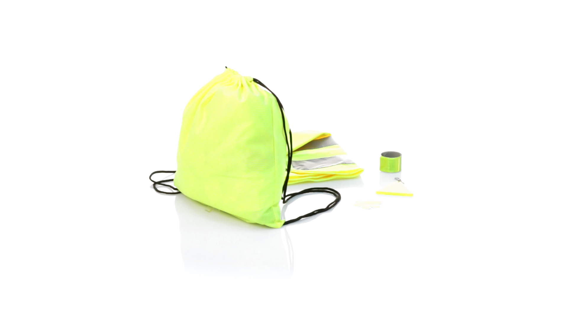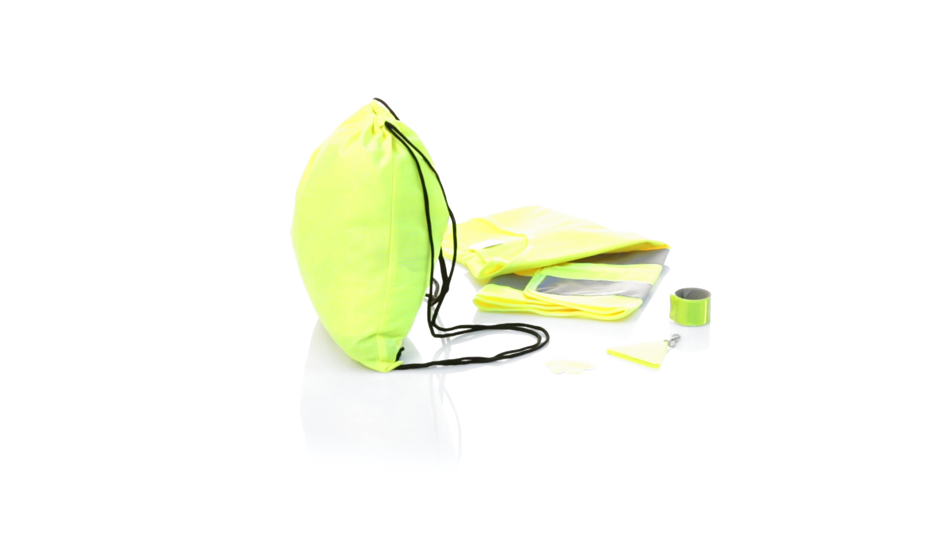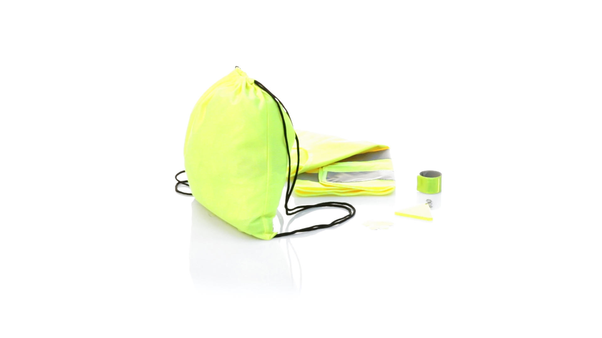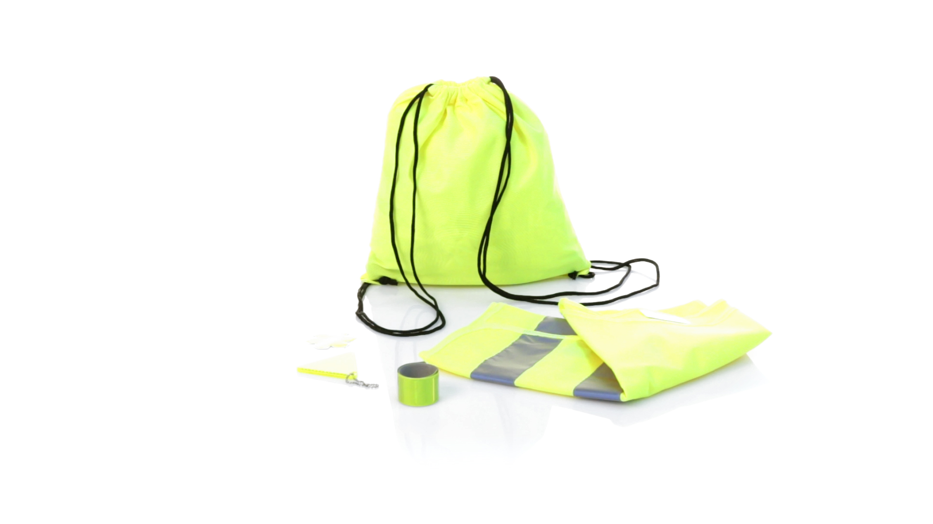 Kinder-Sicherheitsset mit hoher Sichtbarkeit in hellem Gelb. Enthält reflektierende Weste, Rucksack mit Kordelzug mit den Massen 28 x 33 cm, reflektierenden PVC-Schlüsselanhänger, reflektierendes Schnapparmband und reflektierenden Aufkleber.