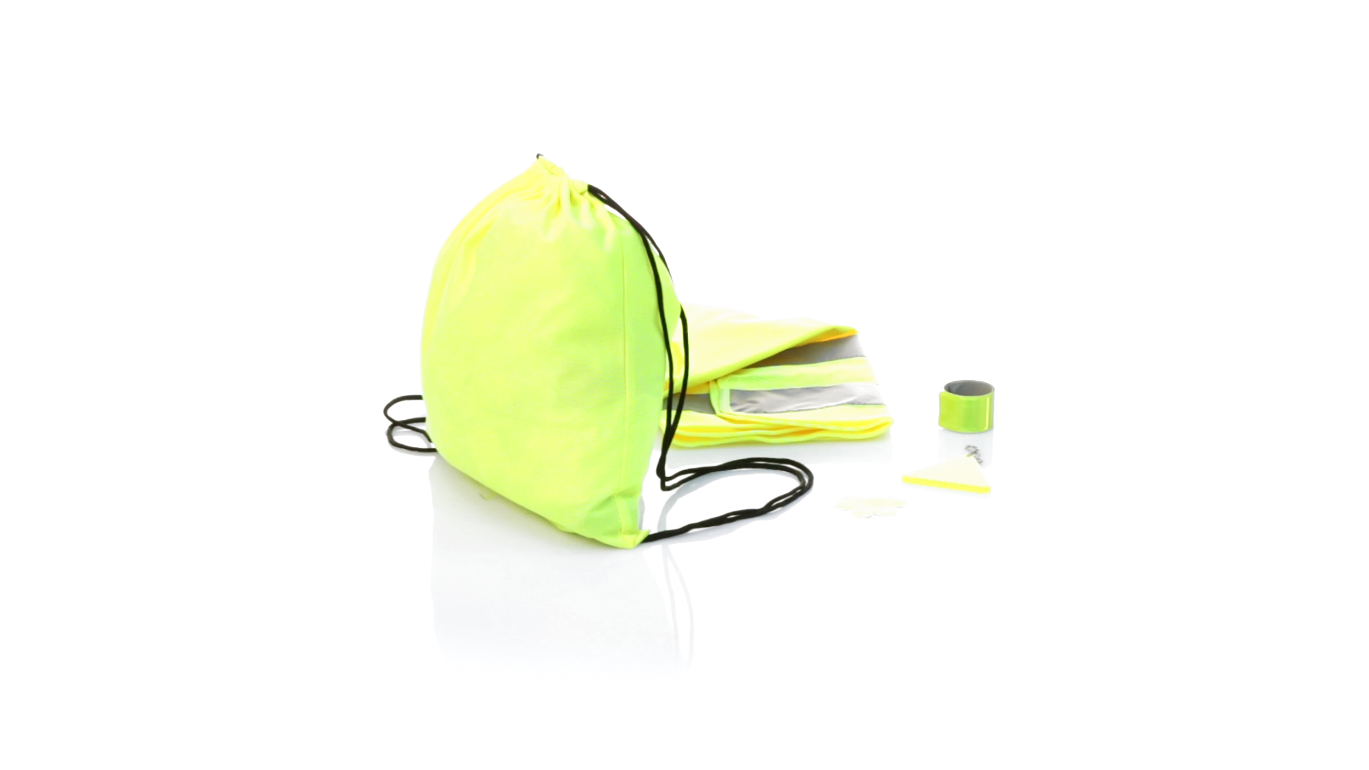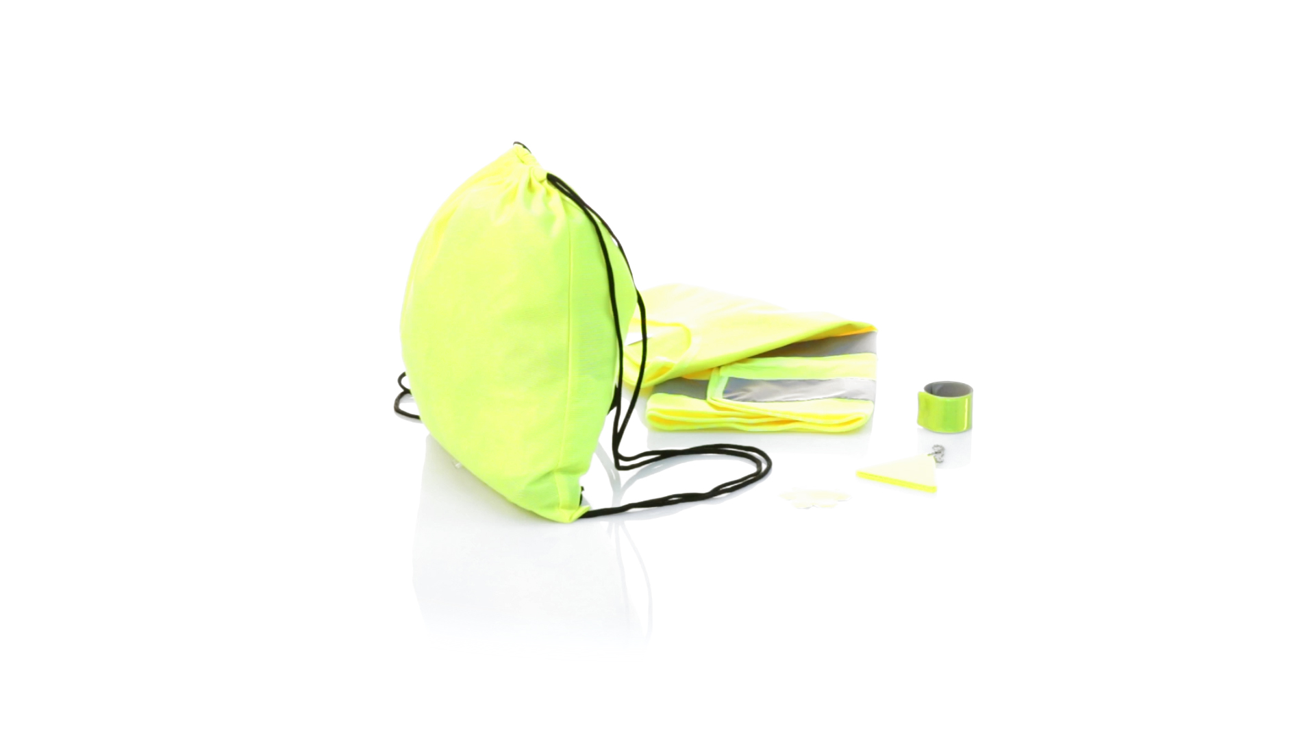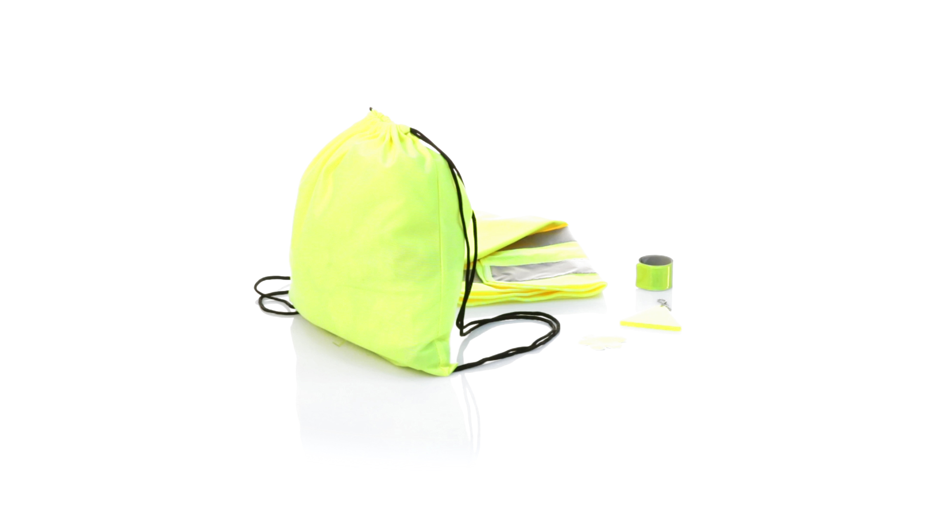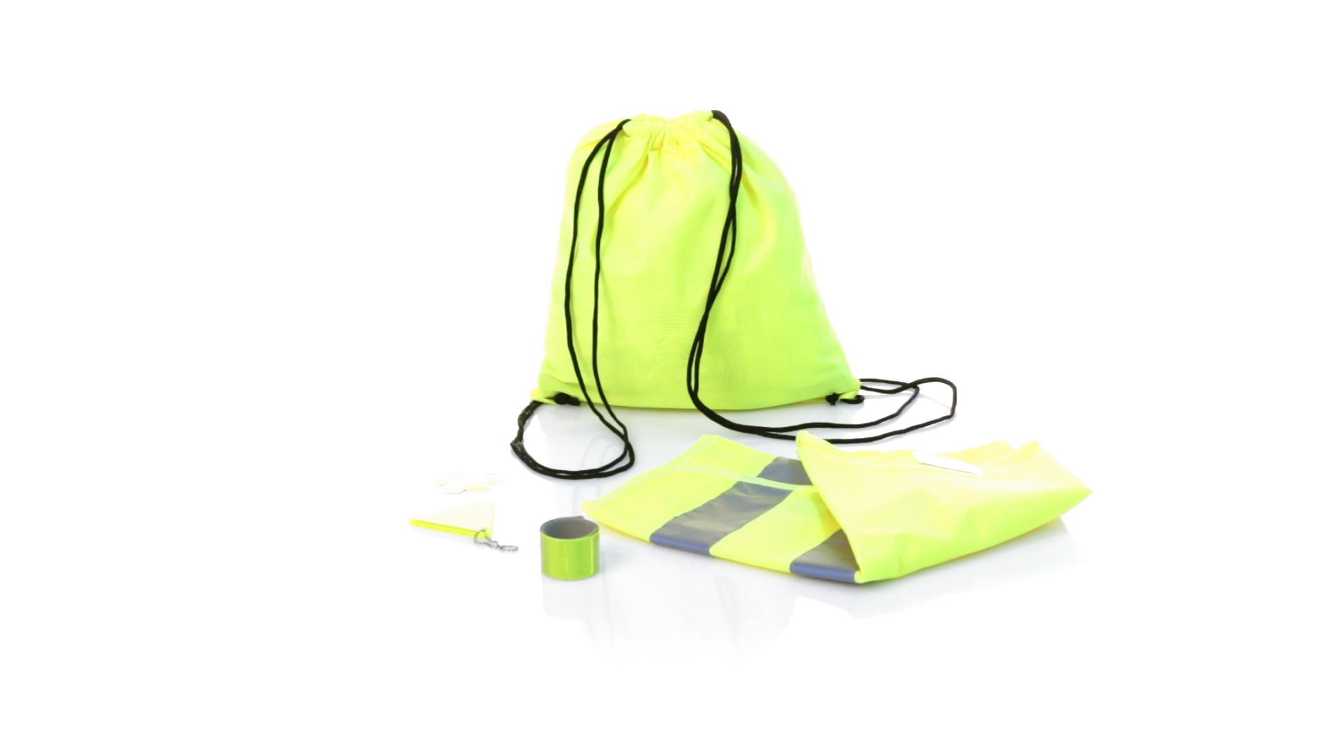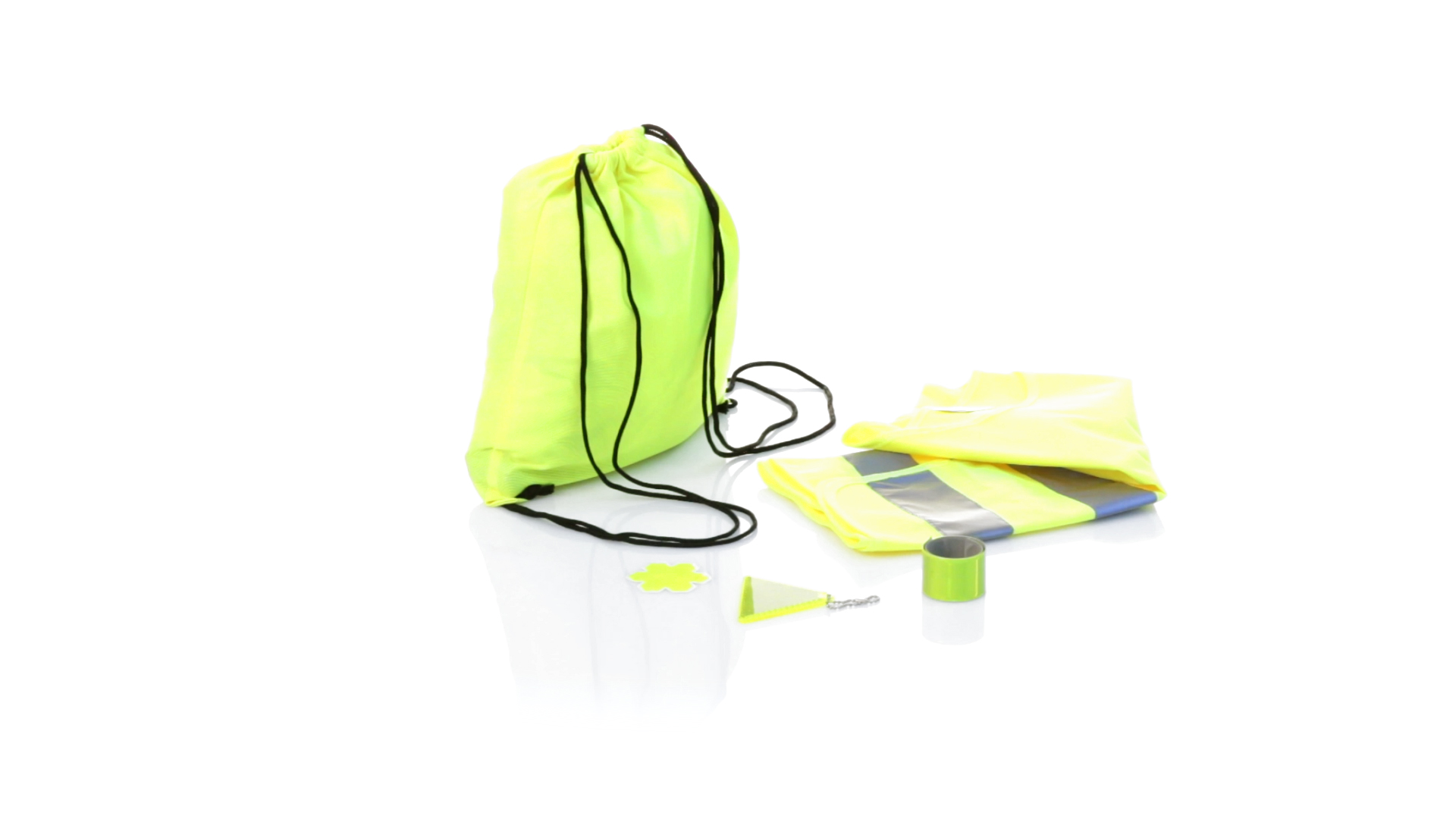 Kinder-Sicherheitsset mit hoher Sichtbarkeit in hellem Gelb. Enthält reflektierende Weste, Rucksack mit Kordelzug mit den Massen 28 x 33 cm, reflektierenden PVC-Schlüsselanhänger, reflektierendes Schnapparmband und reflektierenden Aufkleber.