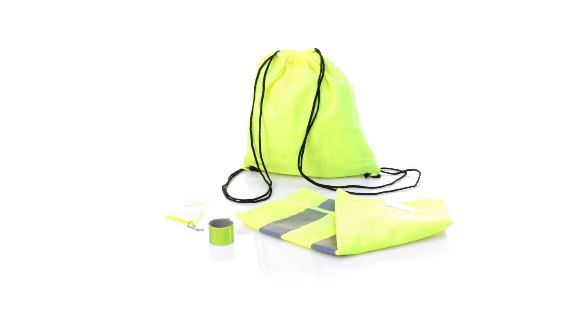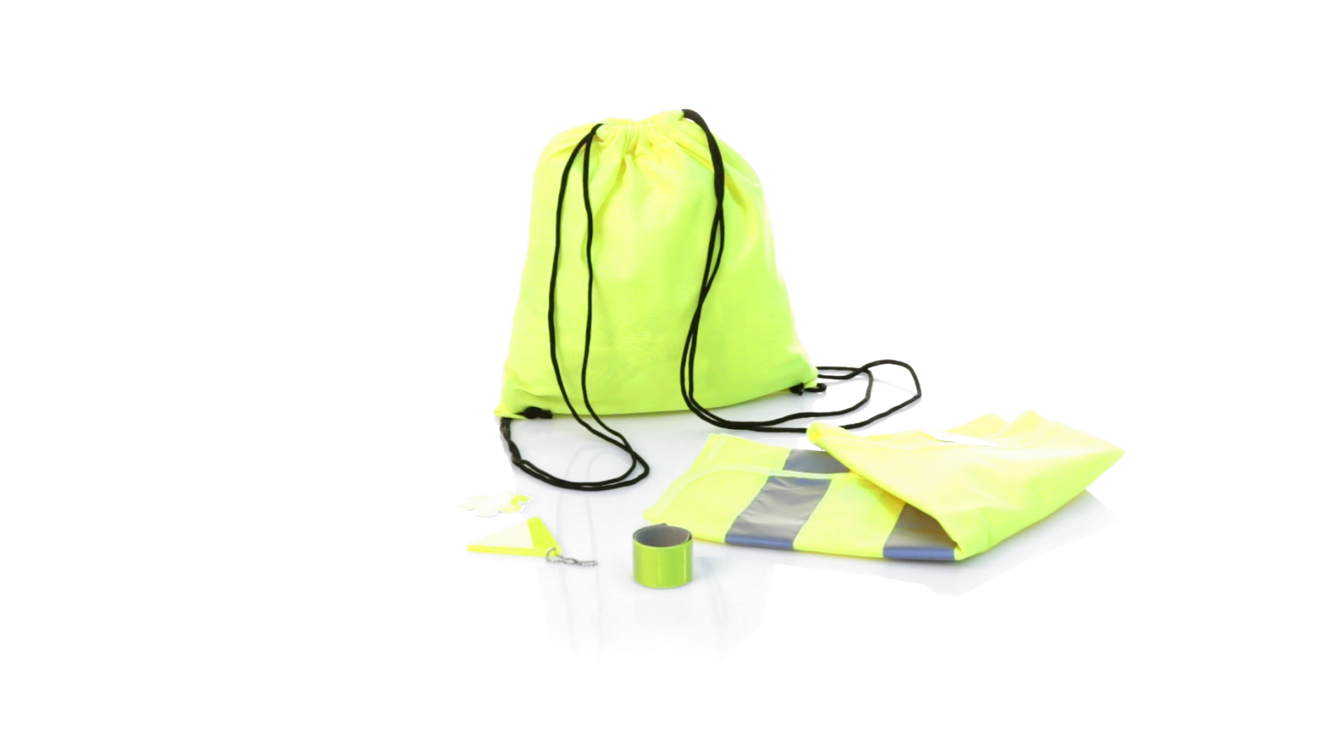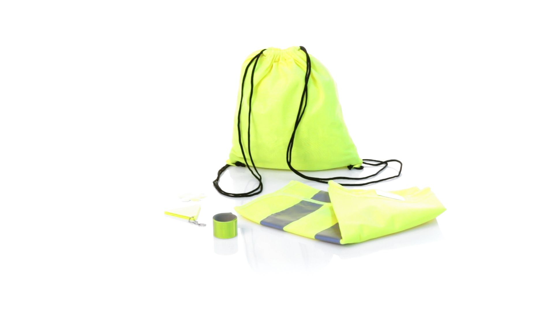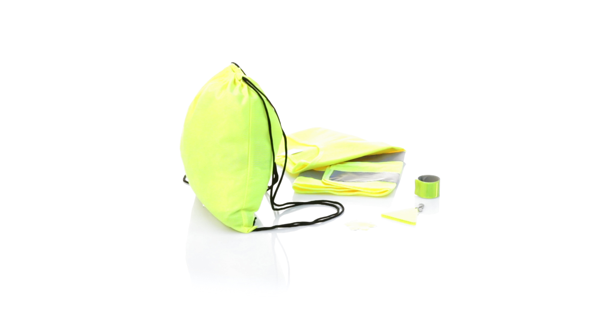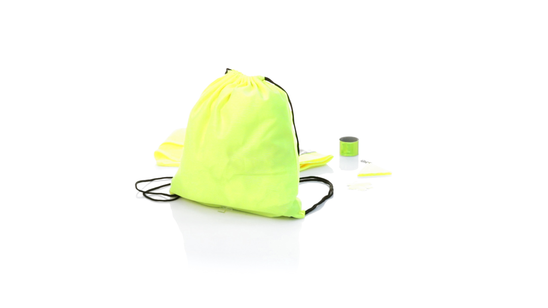 Kinder-Sicherheitsset mit hoher Sichtbarkeit in hellem Gelb. Enthält reflektierende Weste, Rucksack mit Kordelzug mit den Massen 28 x 33 cm, reflektierenden PVC-Schlüsselanhänger, reflektierendes Schnapparmband und reflektierenden Aufkleber.