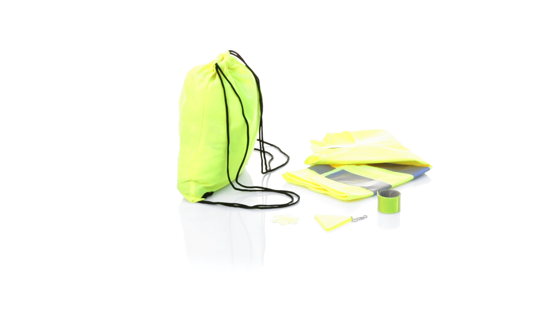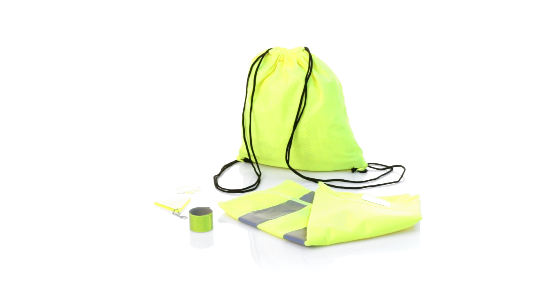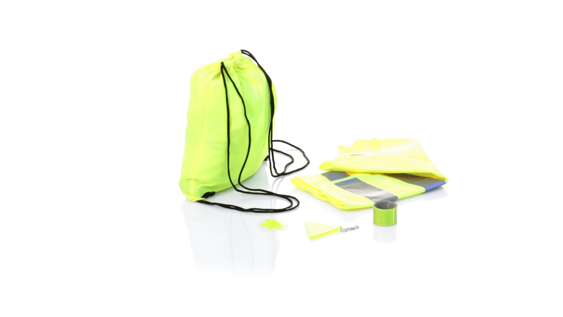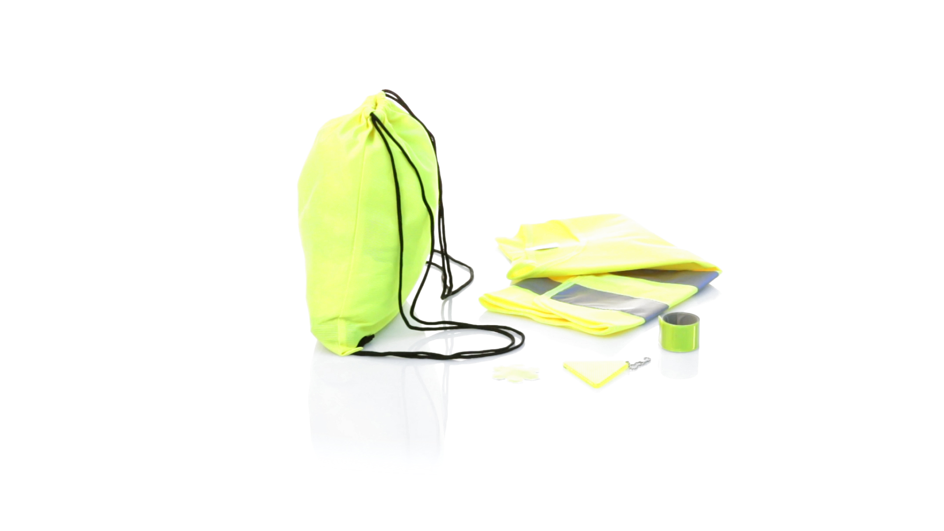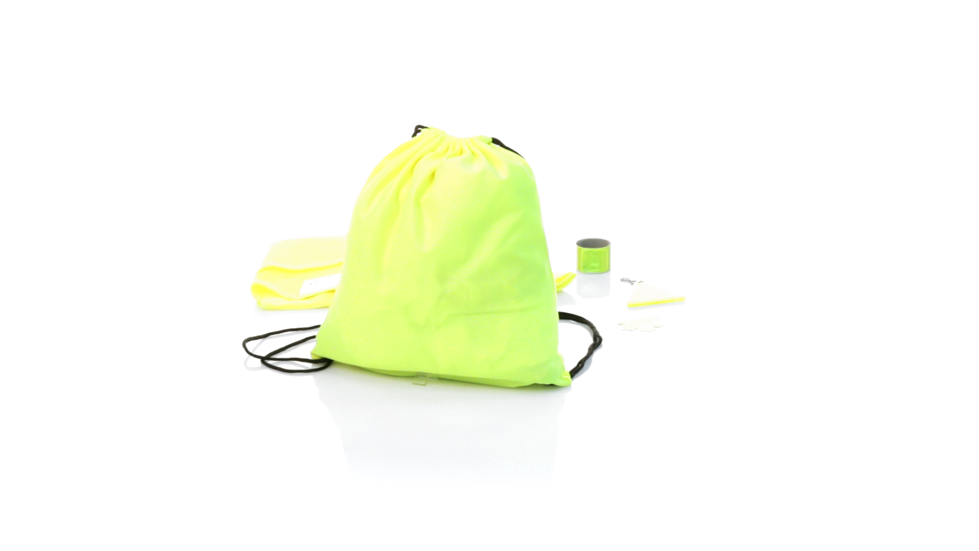 Kinder-Sicherheitsset mit hoher Sichtbarkeit in hellem Gelb. Enthält reflektierende Weste, Rucksack mit Kordelzug mit den Massen 28 x 33 cm, reflektierenden PVC-Schlüsselanhänger, reflektierendes Schnapparmband und reflektierenden Aufkleber.