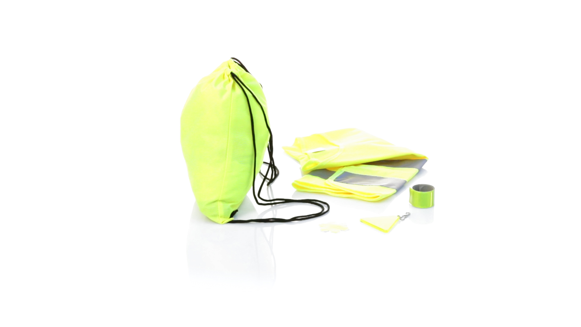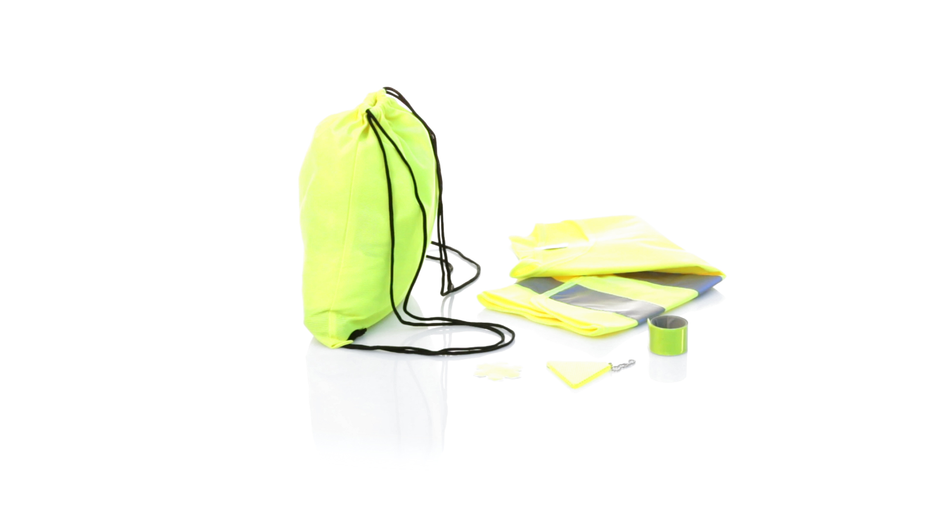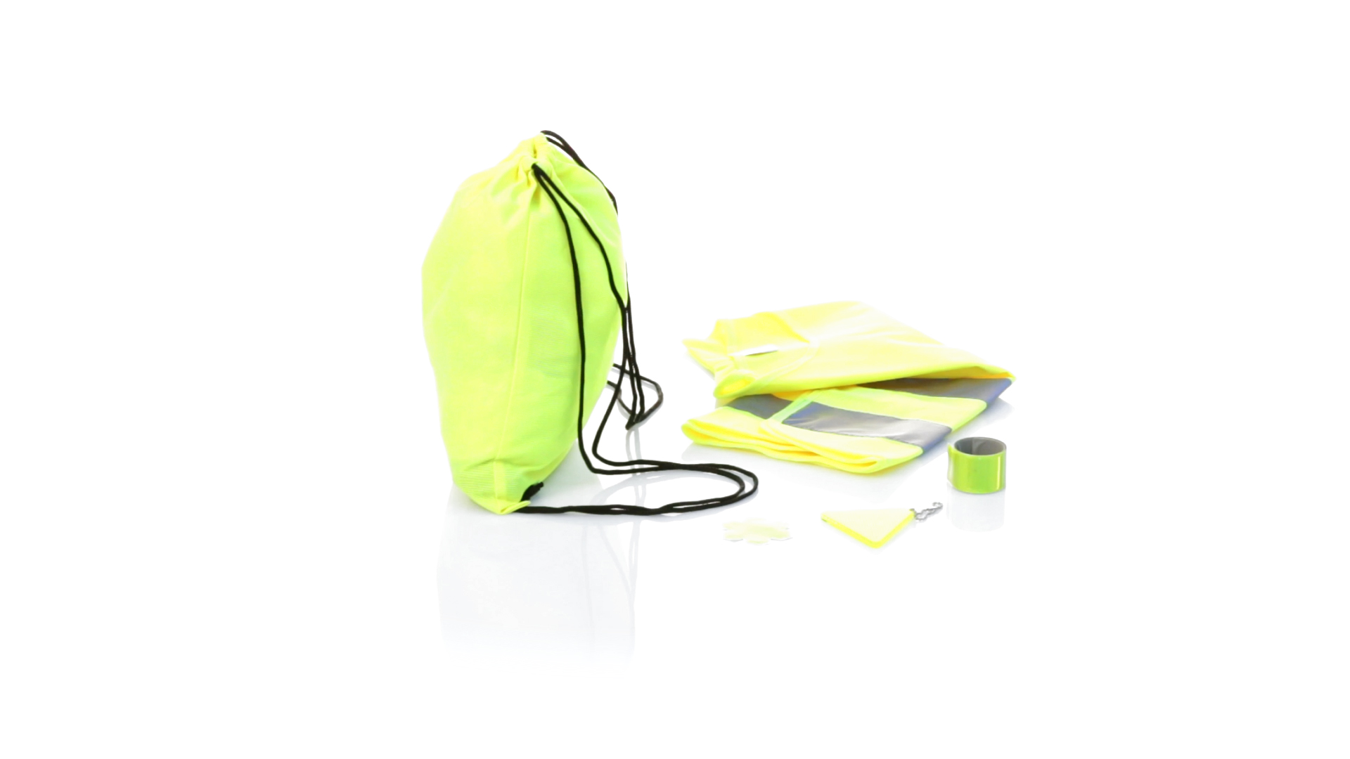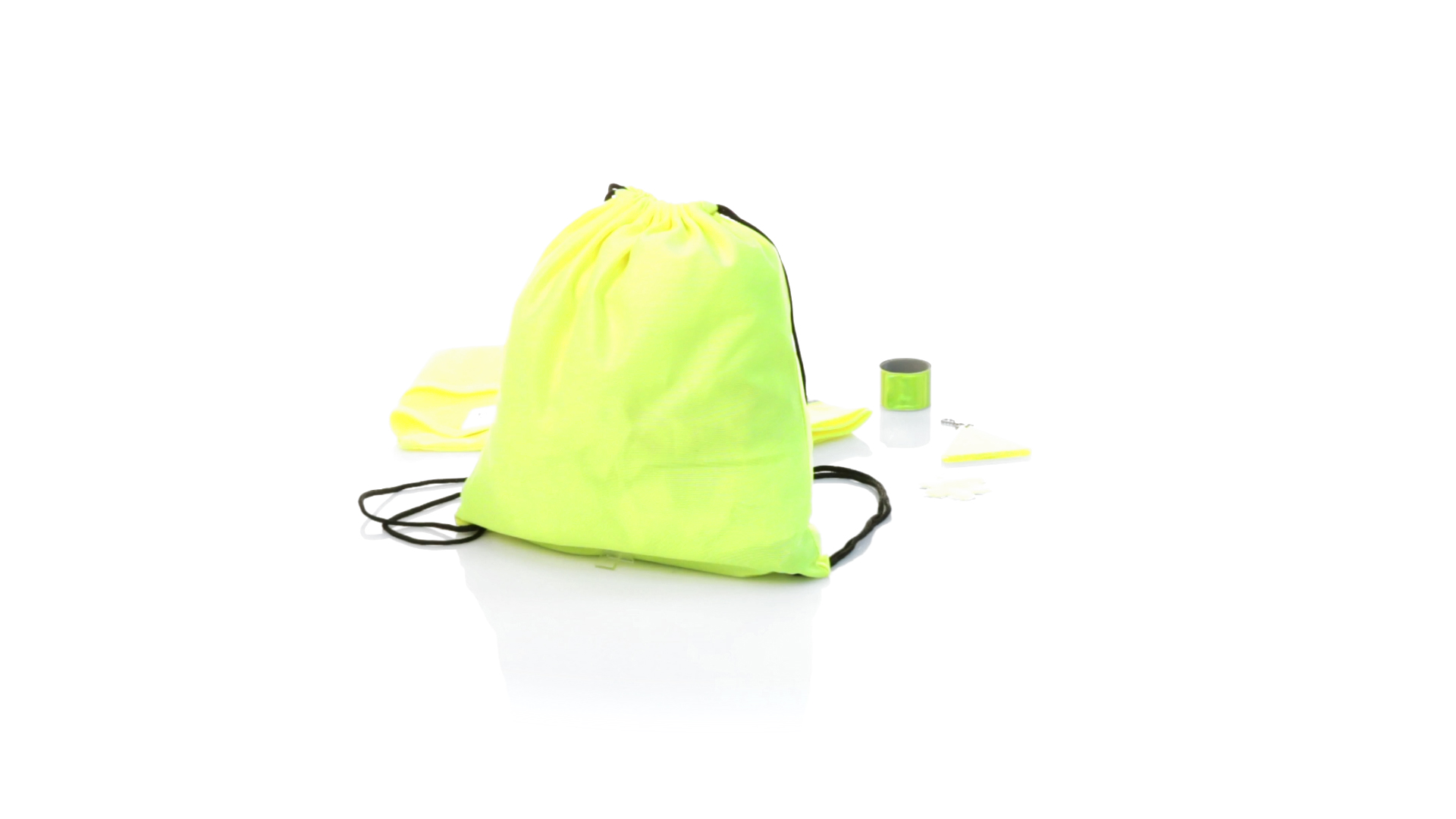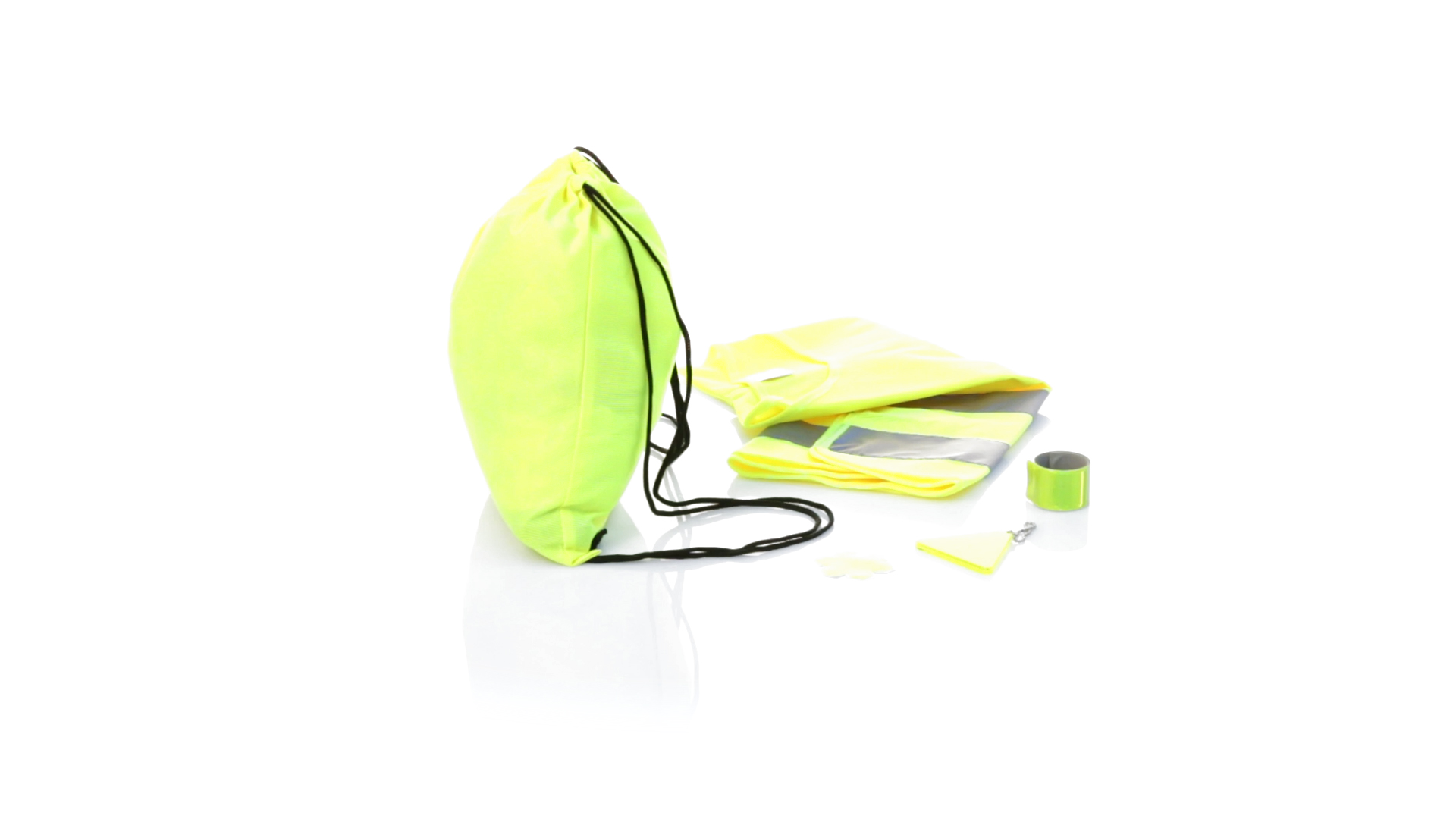 Kinder-Sicherheitsset mit hoher Sichtbarkeit in hellem Gelb. Enthält reflektierende Weste, Rucksack mit Kordelzug mit den Massen 28 x 33 cm, reflektierenden PVC-Schlüsselanhänger, reflektierendes Schnapparmband und reflektierenden Aufkleber.