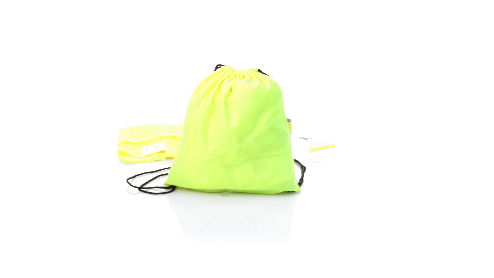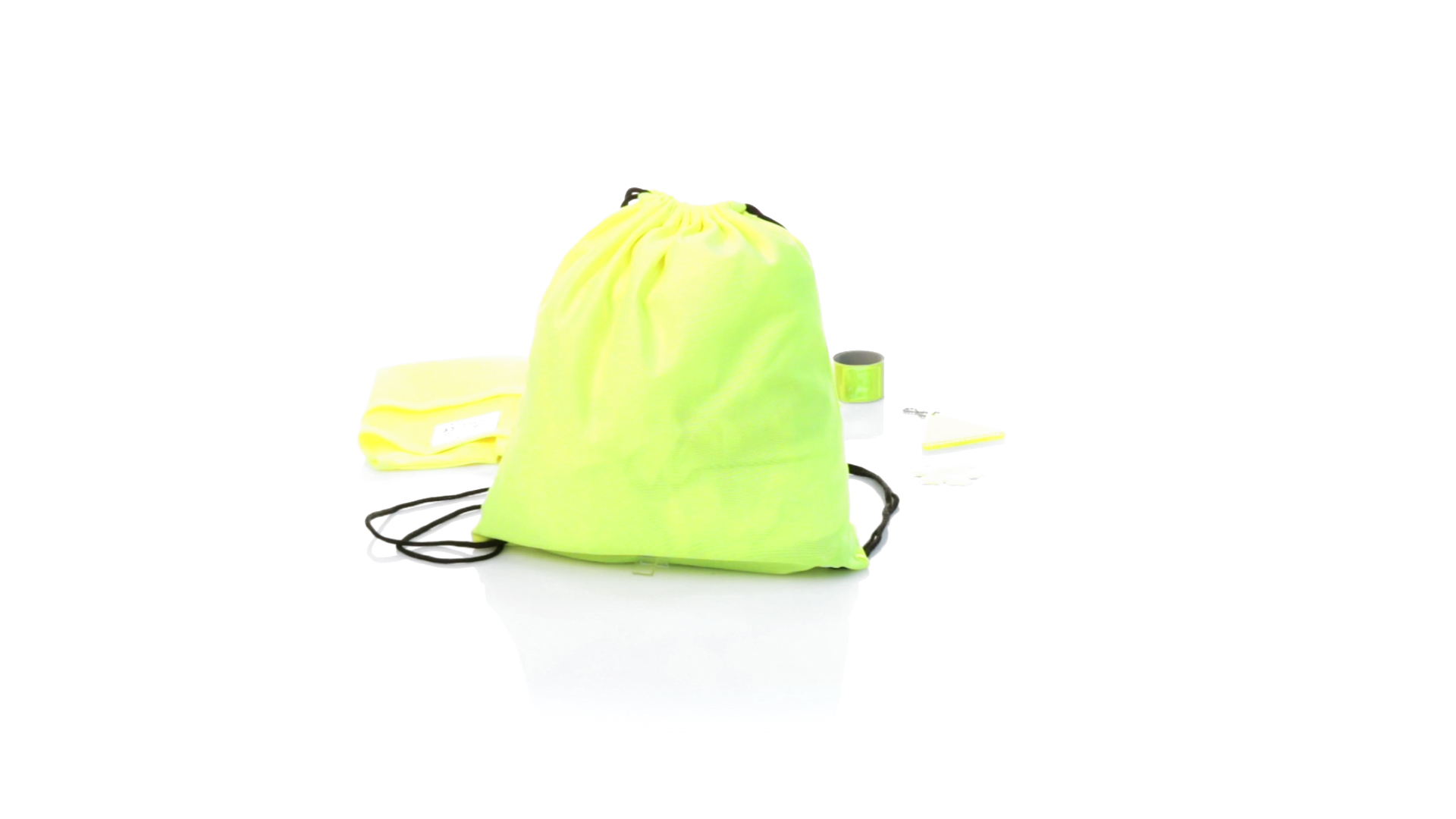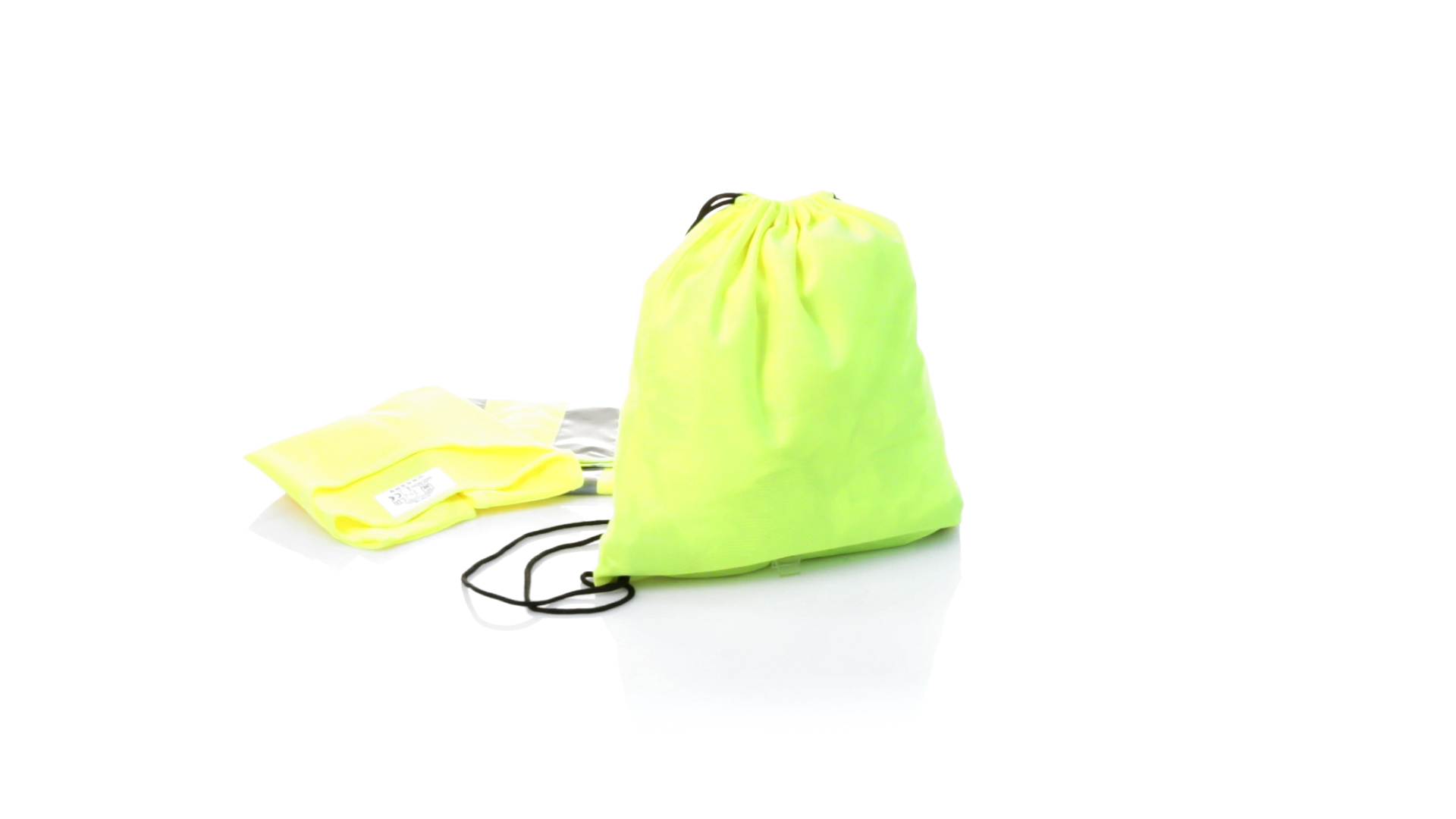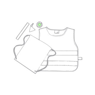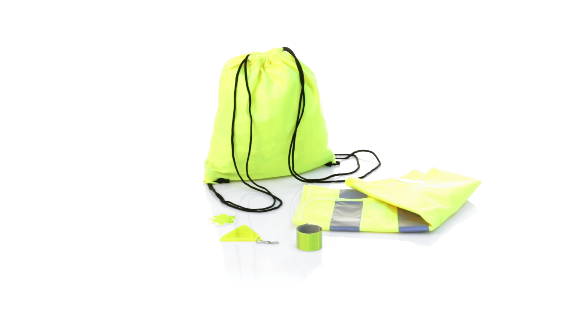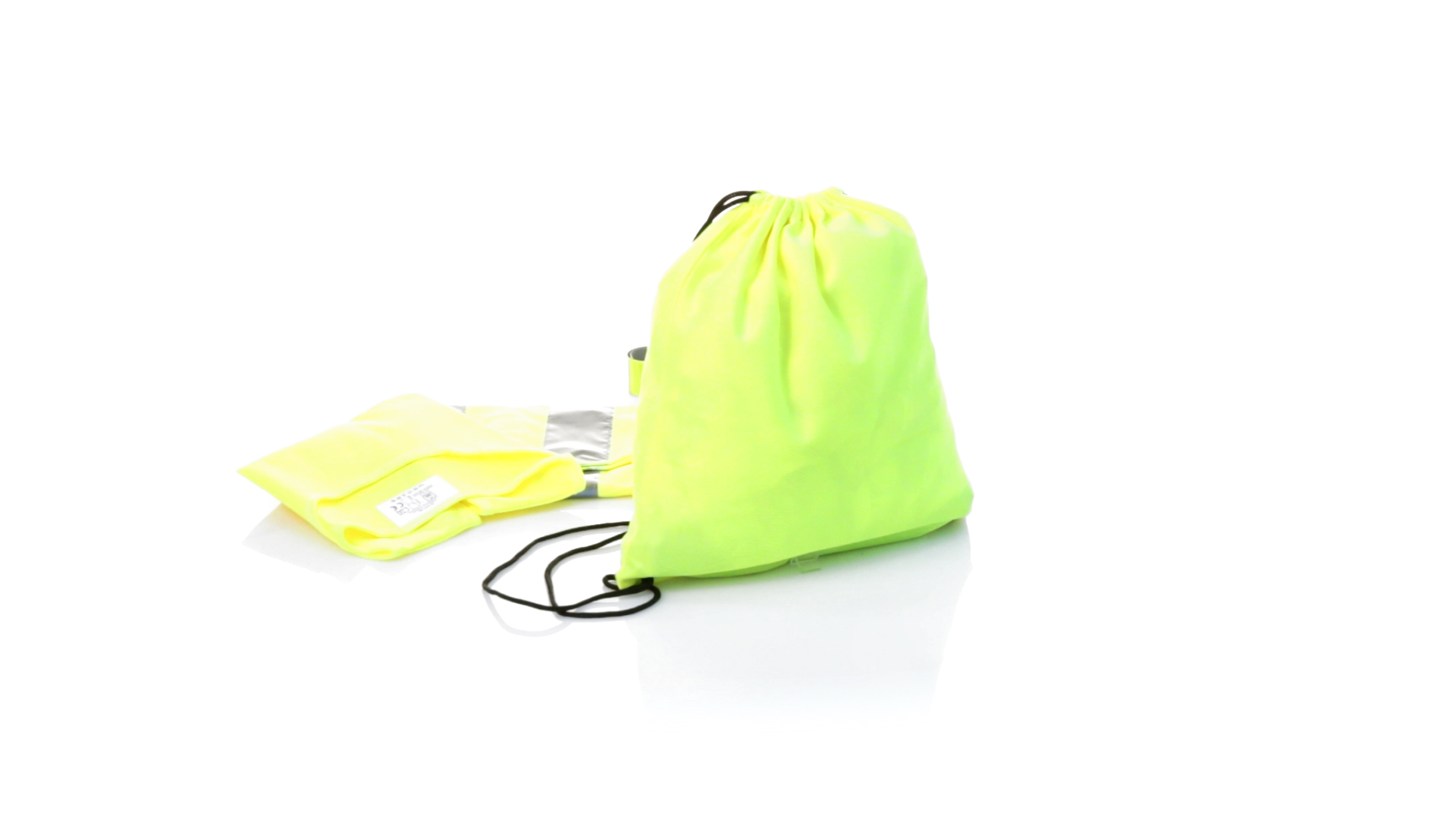 Kinder-Sicherheitsset mit hoher Sichtbarkeit in hellem Gelb. Enthält reflektierende Weste, Rucksack mit Kordelzug mit den Massen 28 x 33 cm, reflektierenden PVC-Schlüsselanhänger, reflektierendes Schnapparmband und reflektierenden Aufkleber.