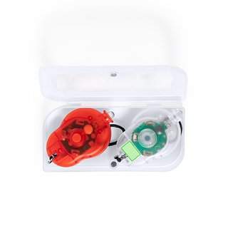 Set aus LED-Sicherheitsleuchten für Fahrräder. Inklusive 2 Stück, mit zwei Lichtpositionen und präsentiert in einem widerstandsfähigen Einzelgehäuse mit Magnetverschluss. Batteriebetrieben (Knopfzellen enthalten).