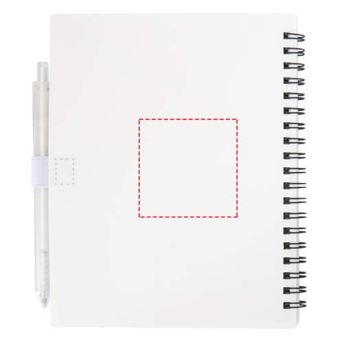 Das Niove Softcover-Notizbuch besteht aus recyceltem Kunststoff und enthält 70 punktkarierte Seiten aus 70 g/m² Papier. Das Notizbuch hat abgerundete Ecken und eine Stiftschlaufe. Notizbuchformat: 140 × 178 mm. Der Kugelschreiber besteht ebenfalls aus recyceltem Kunststoff. Tintenfarbe: Blau. Schreiblänge: 1000 Meter. Schreibspitze: 1,0 mm.