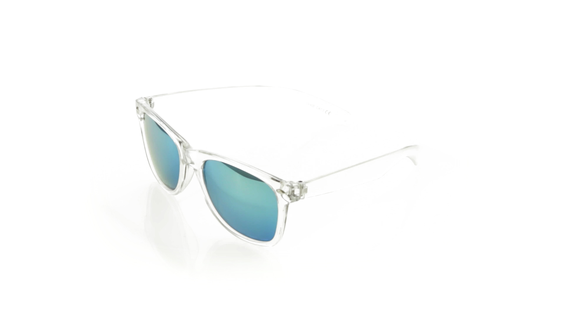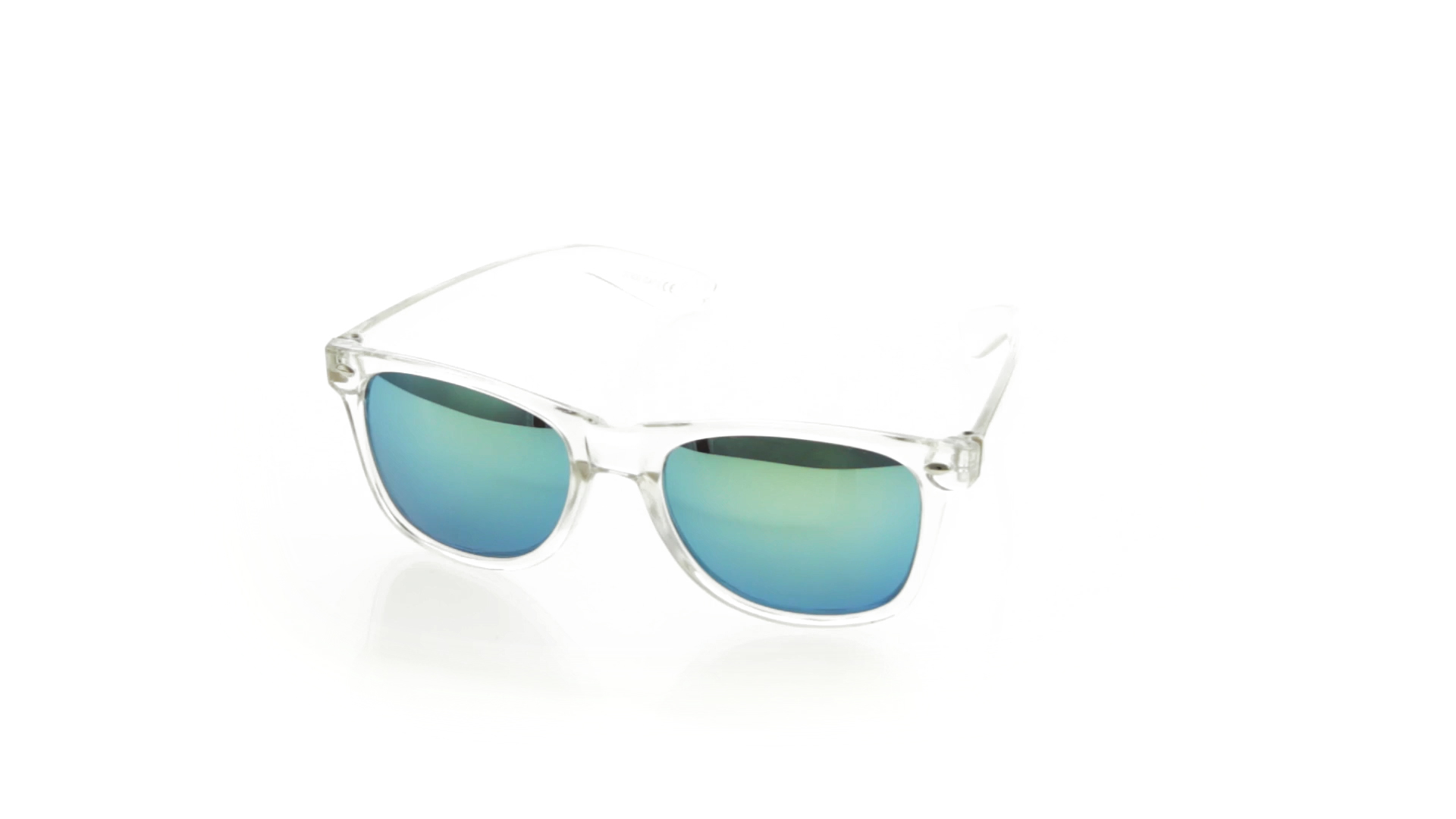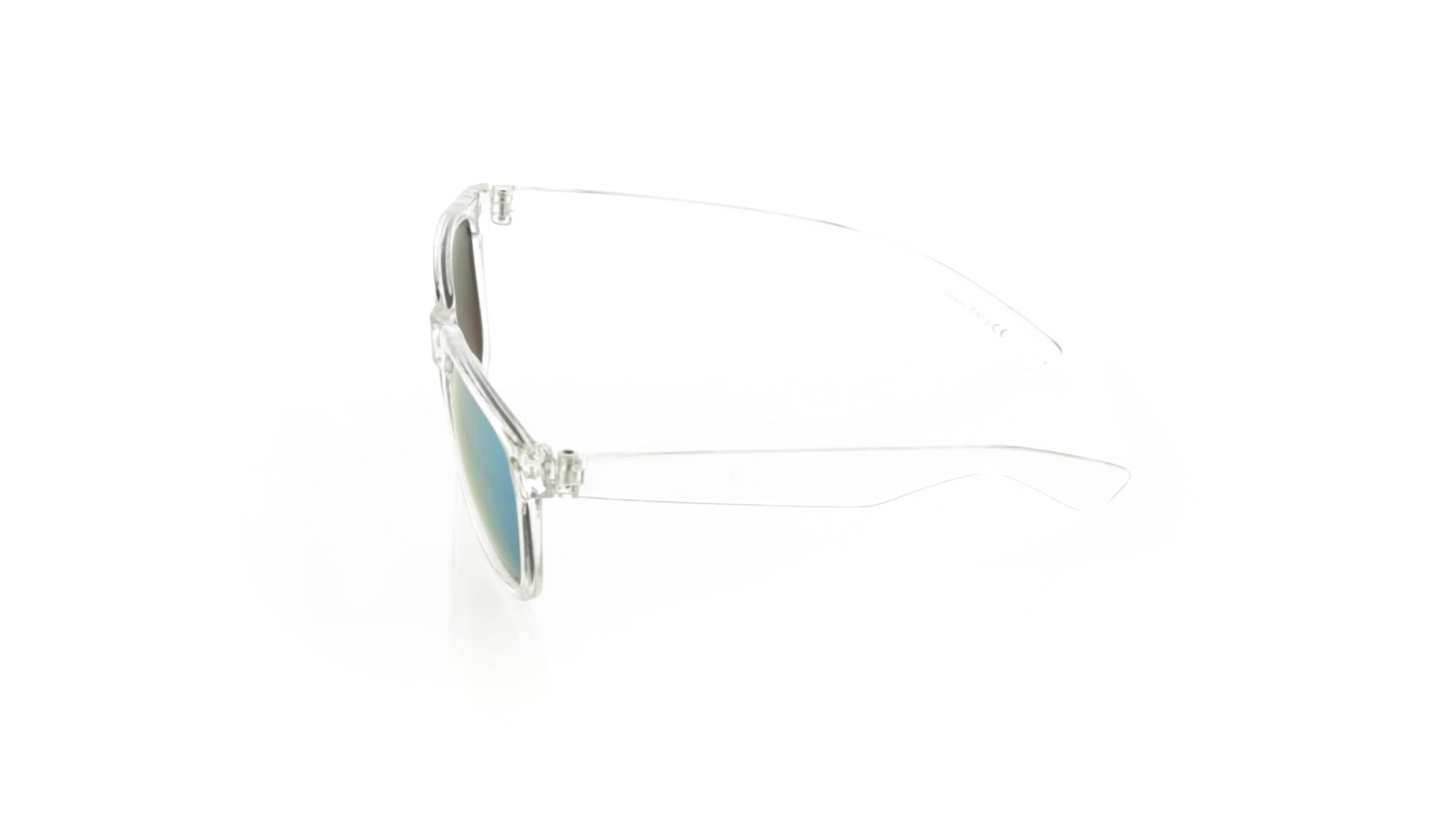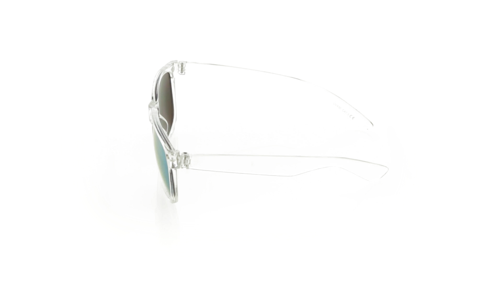 Sonnenbrille mit UV-400-Schutz und klassischem Design. Mit transparentem Rahmen und verspiegelten Gläsern in verschiedenen Farben.