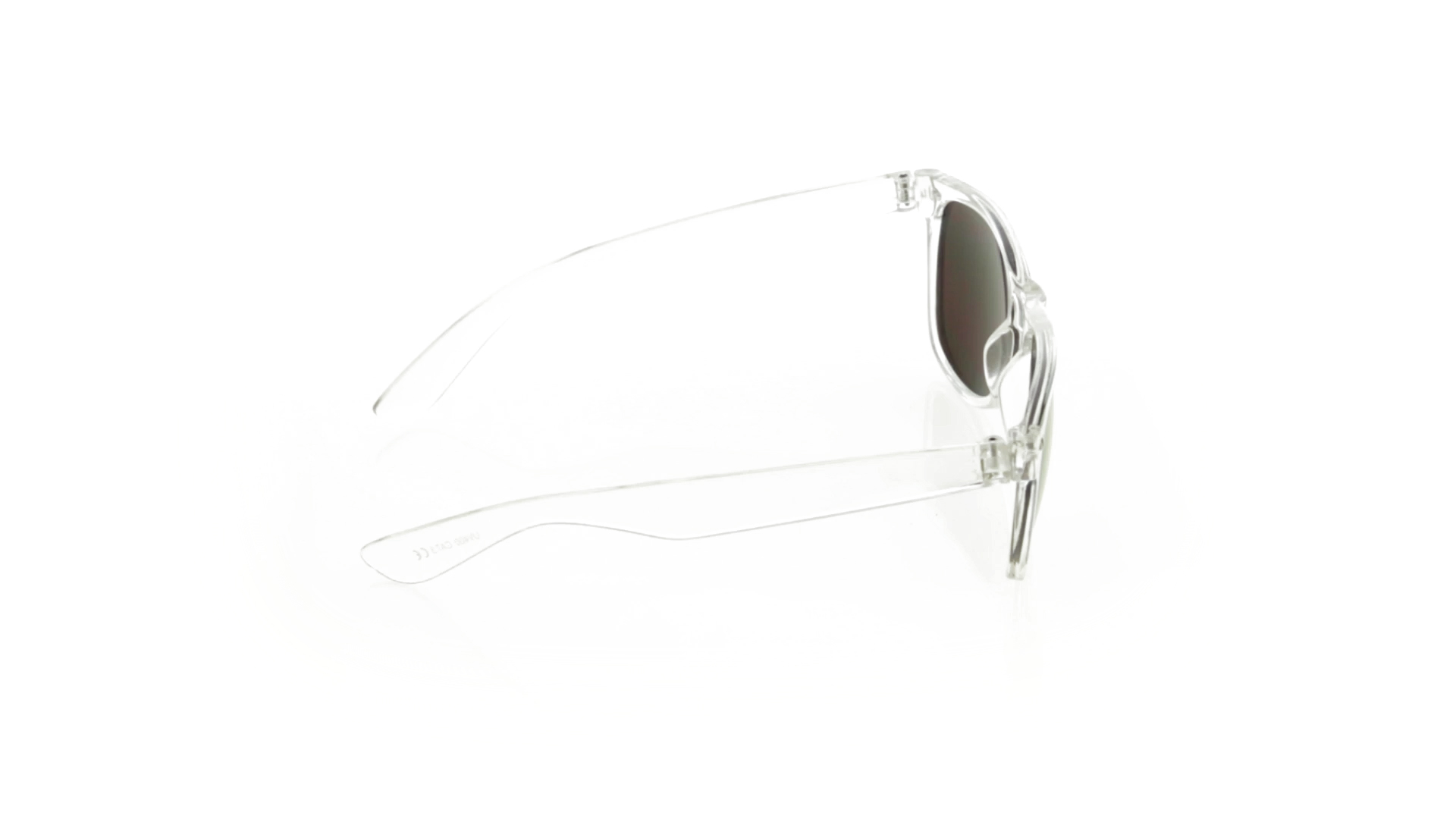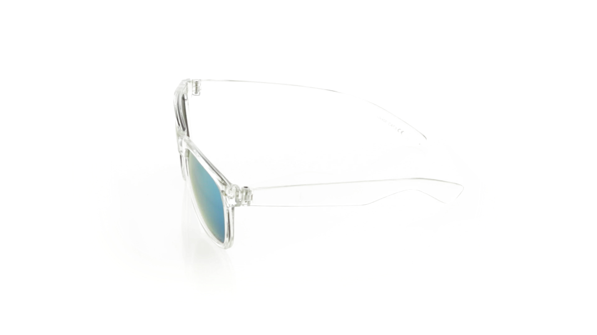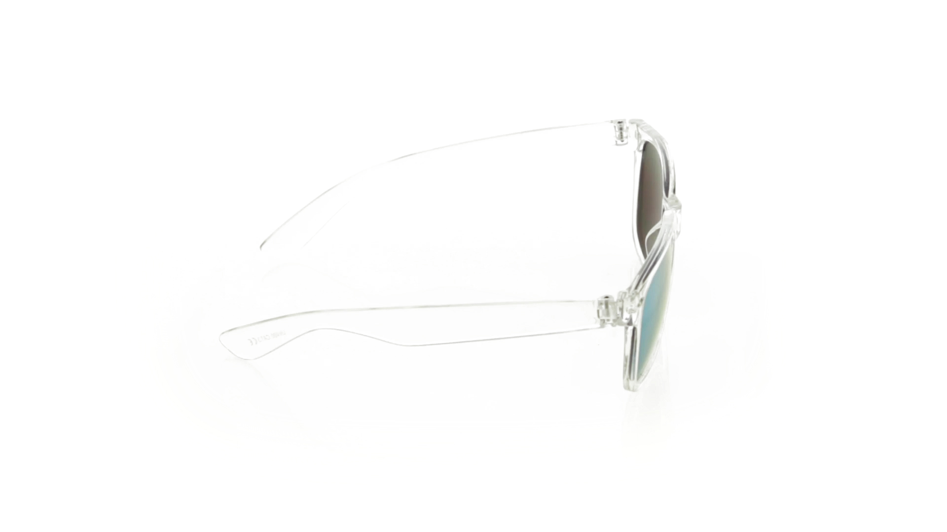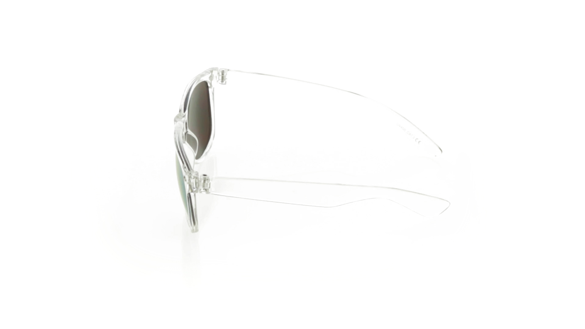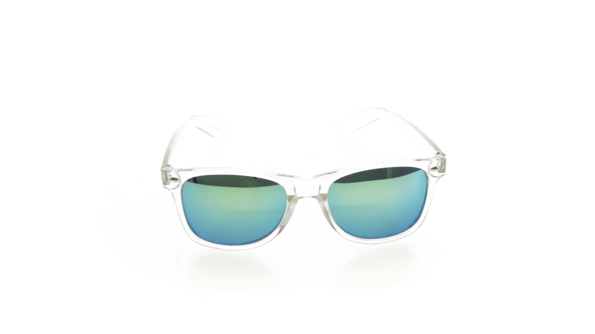 Sonnenbrille mit UV-400-Schutz und klassischem Design. Mit transparentem Rahmen und verspiegelten Gläsern in verschiedenen Farben.