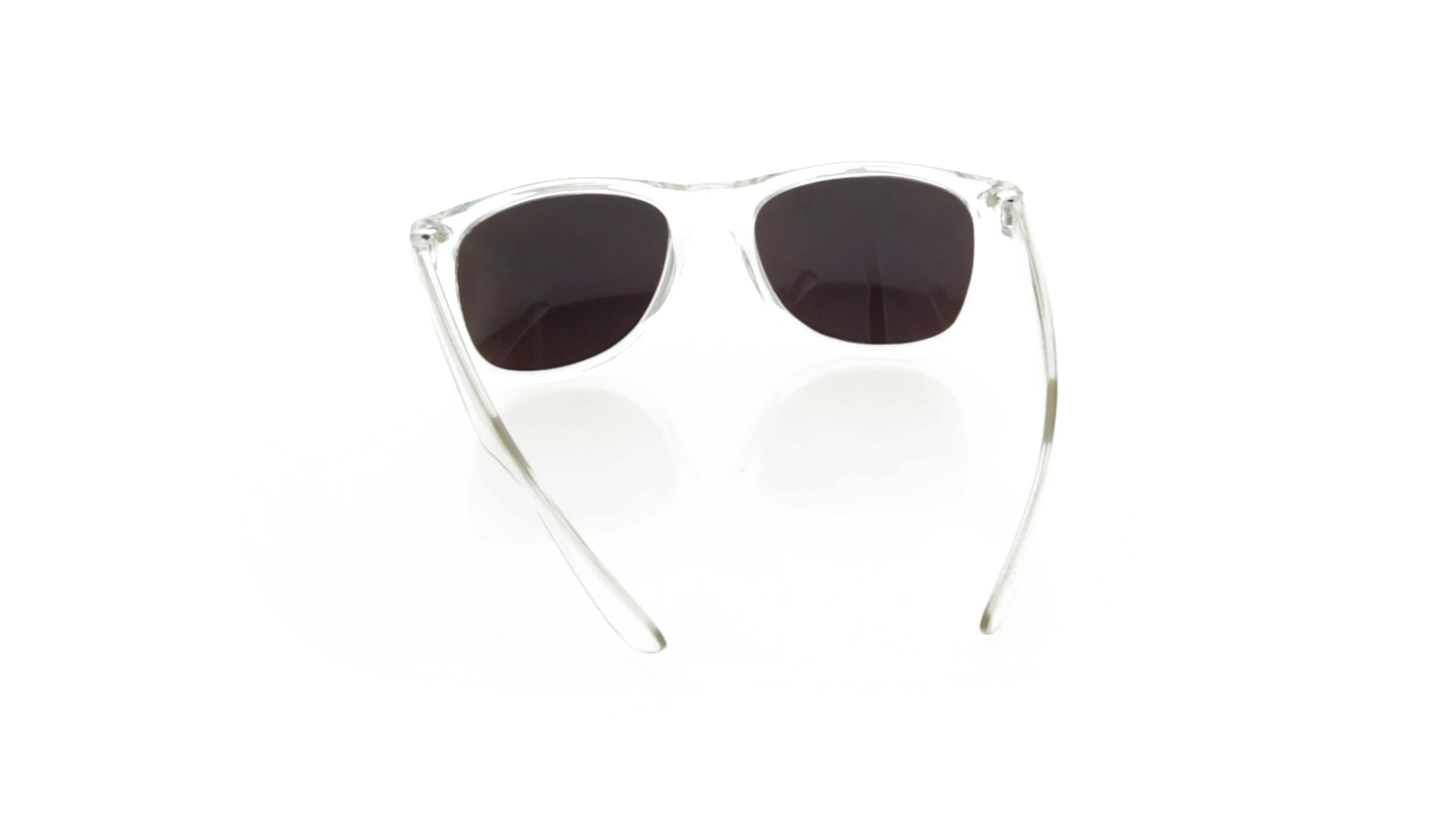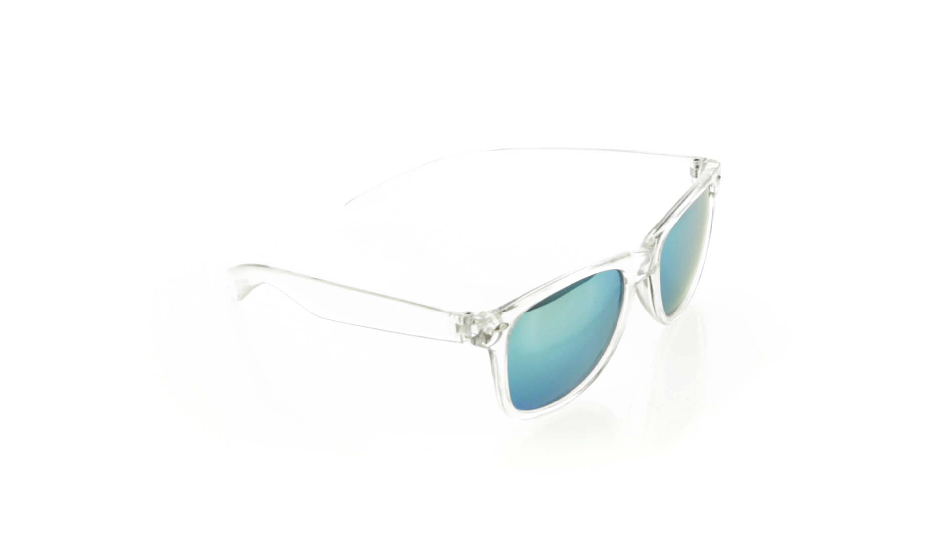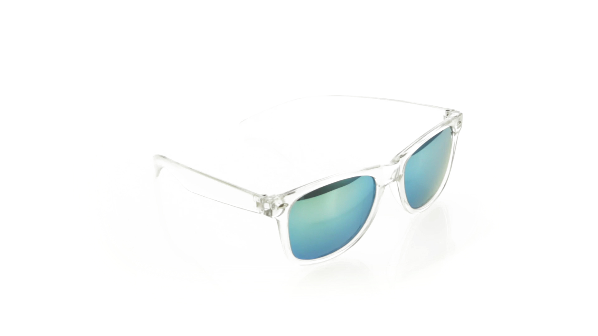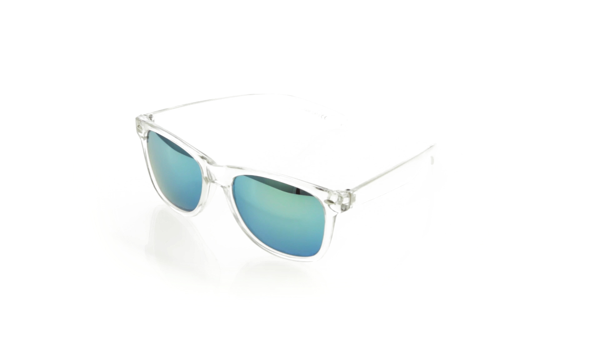 Sonnenbrille mit UV-400-Schutz und klassischem Design. Mit transparentem Rahmen und verspiegelten Gläsern in verschiedenen Farben.