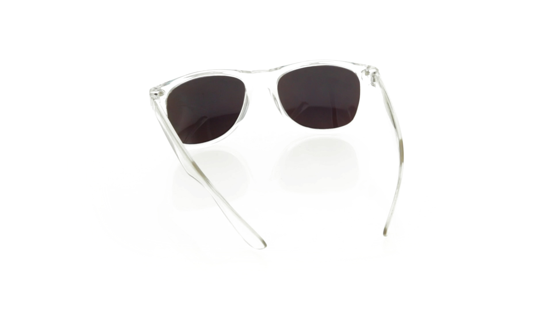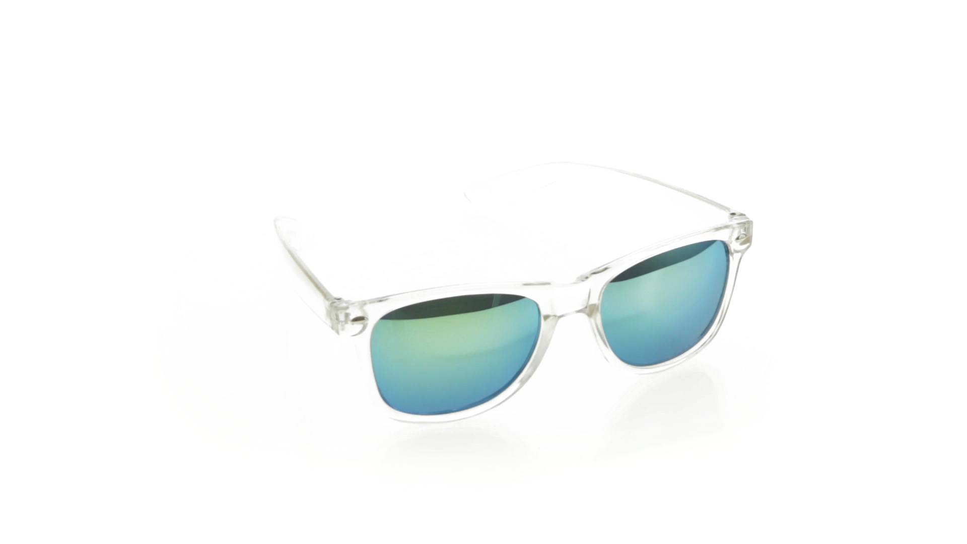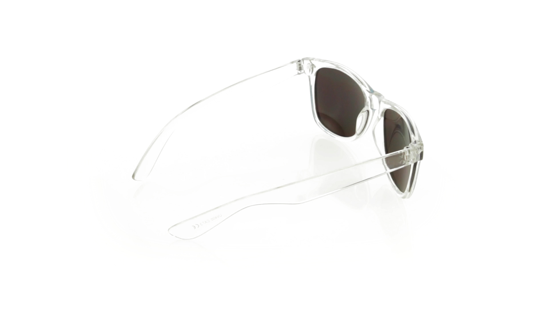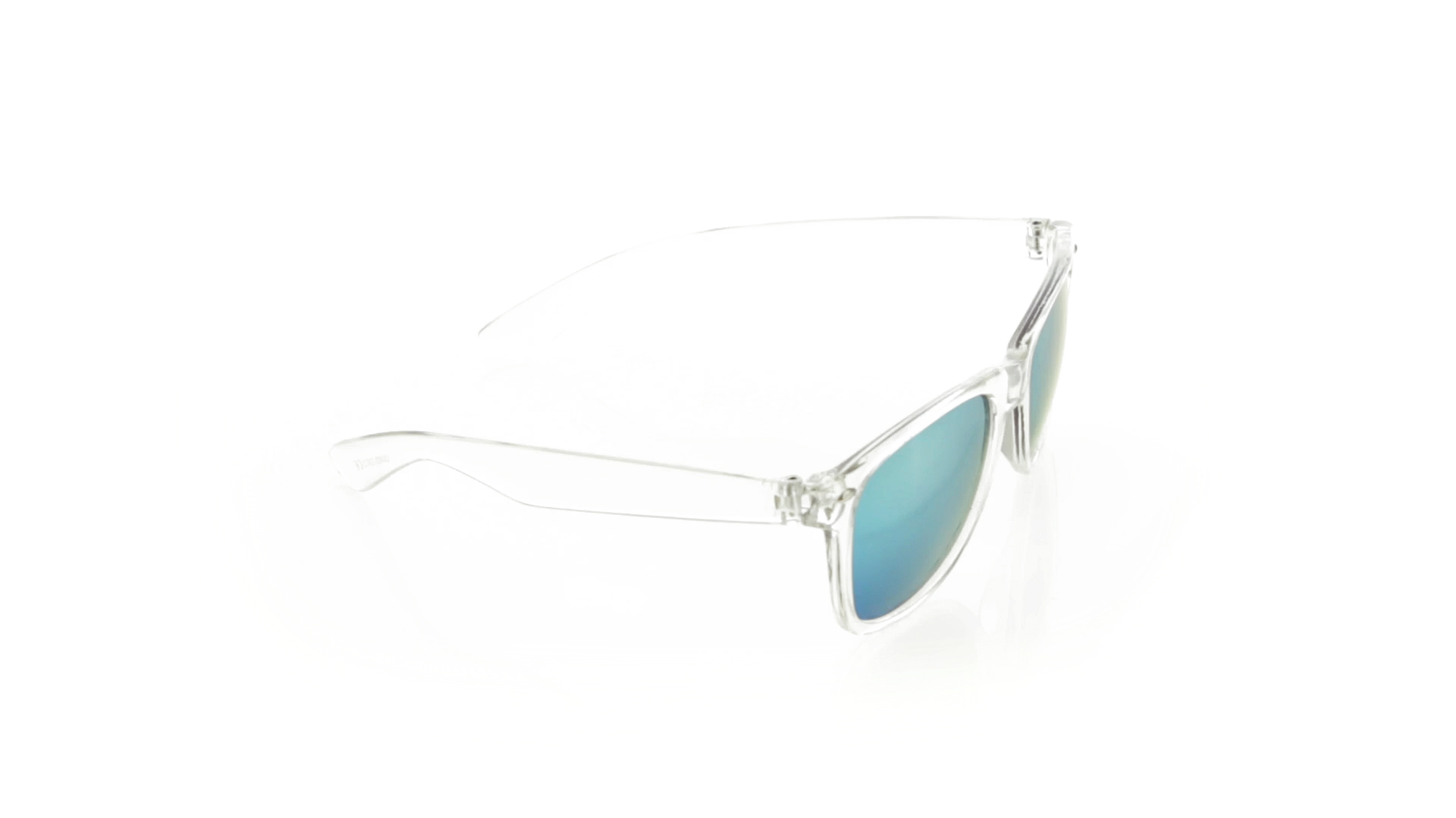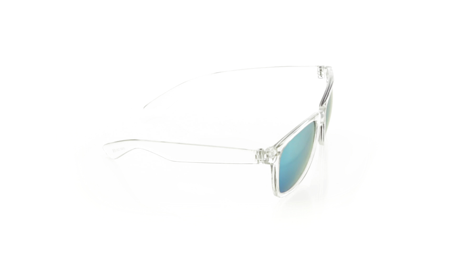 Sonnenbrille mit UV-400-Schutz und klassischem Design. Mit transparentem Rahmen und verspiegelten Gläsern in verschiedenen Farben.