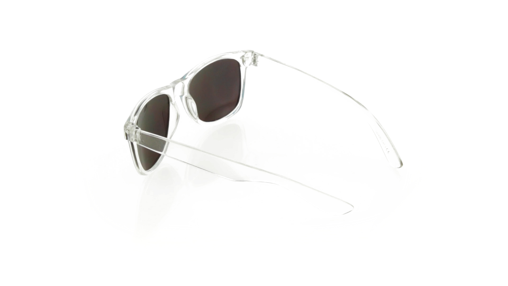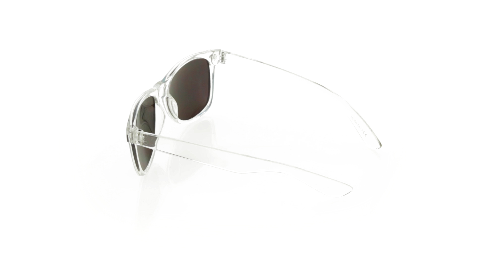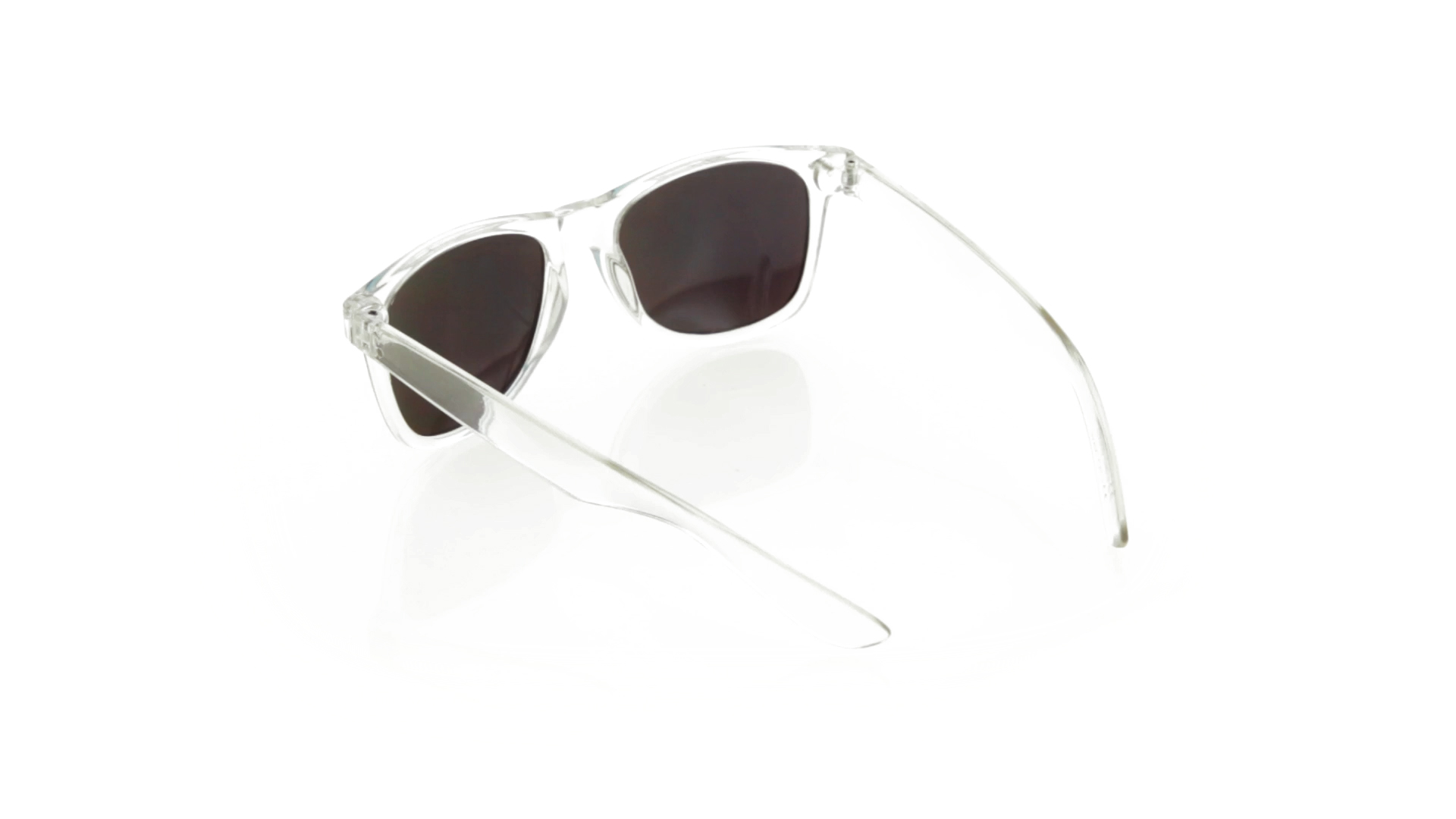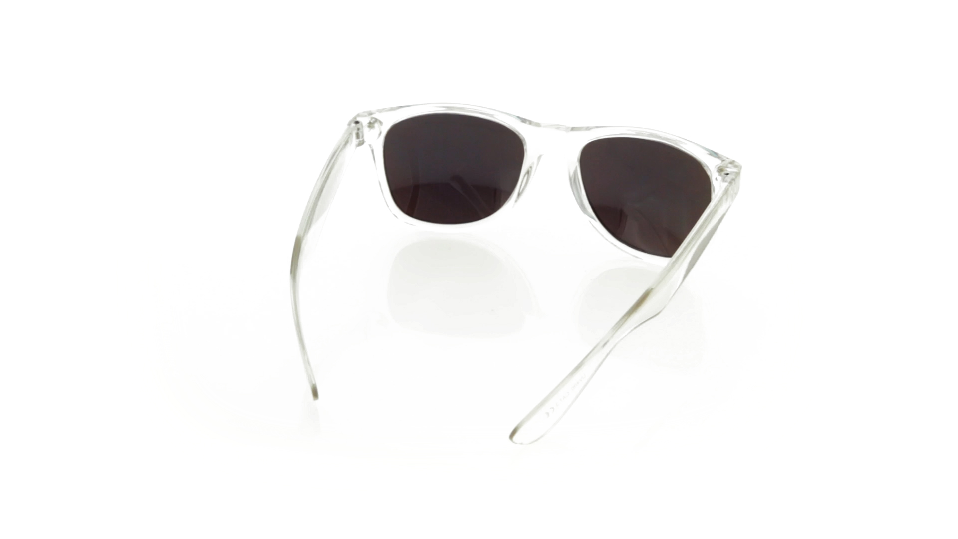 Sonnenbrille mit UV-400-Schutz und klassischem Design. Mit transparentem Rahmen und verspiegelten Gläsern in verschiedenen Farben.