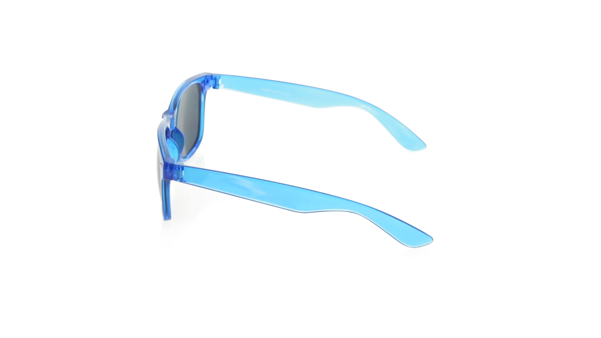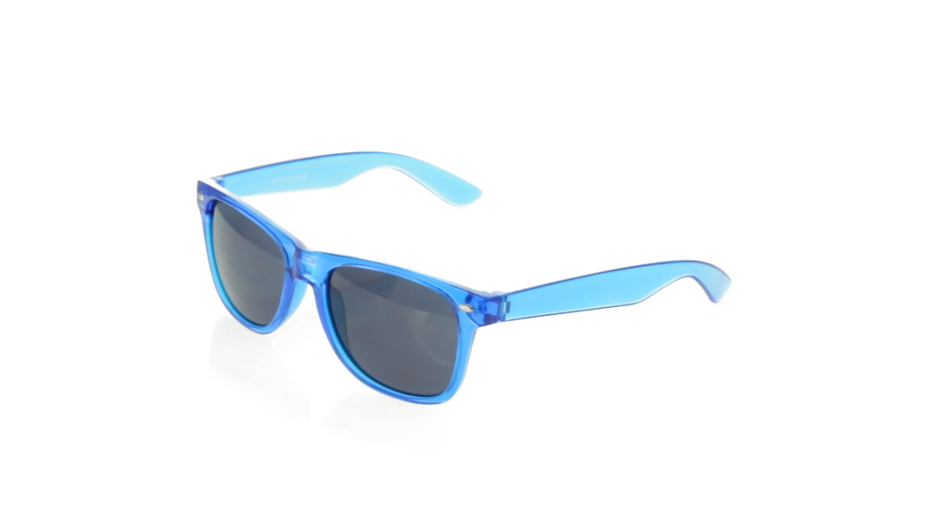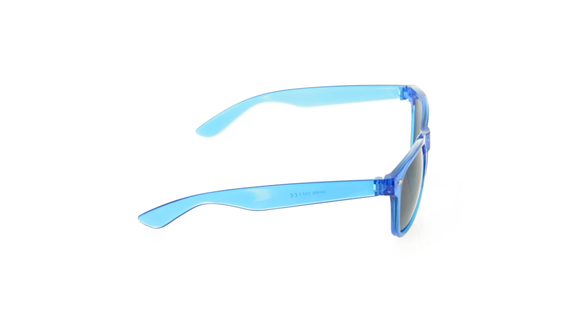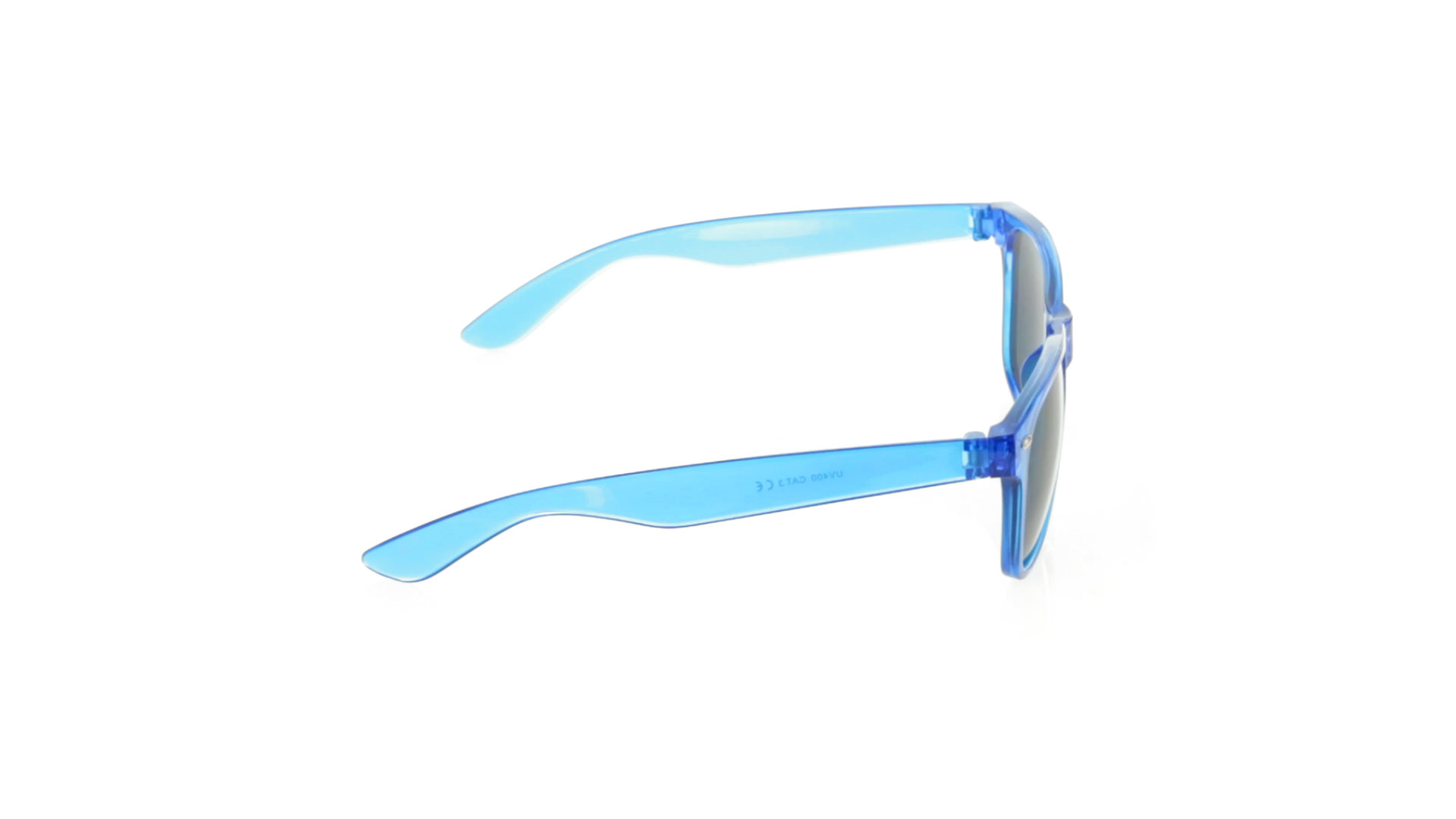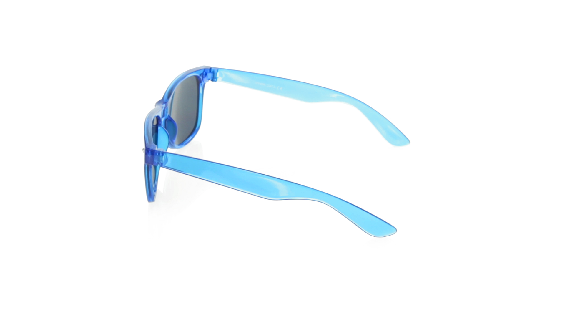 Sonnenbrille mit UV-400-Schutz und klassischem Design. Mit transparentem Rahmen in lebhaften Farben und schwarzen Gläsern.