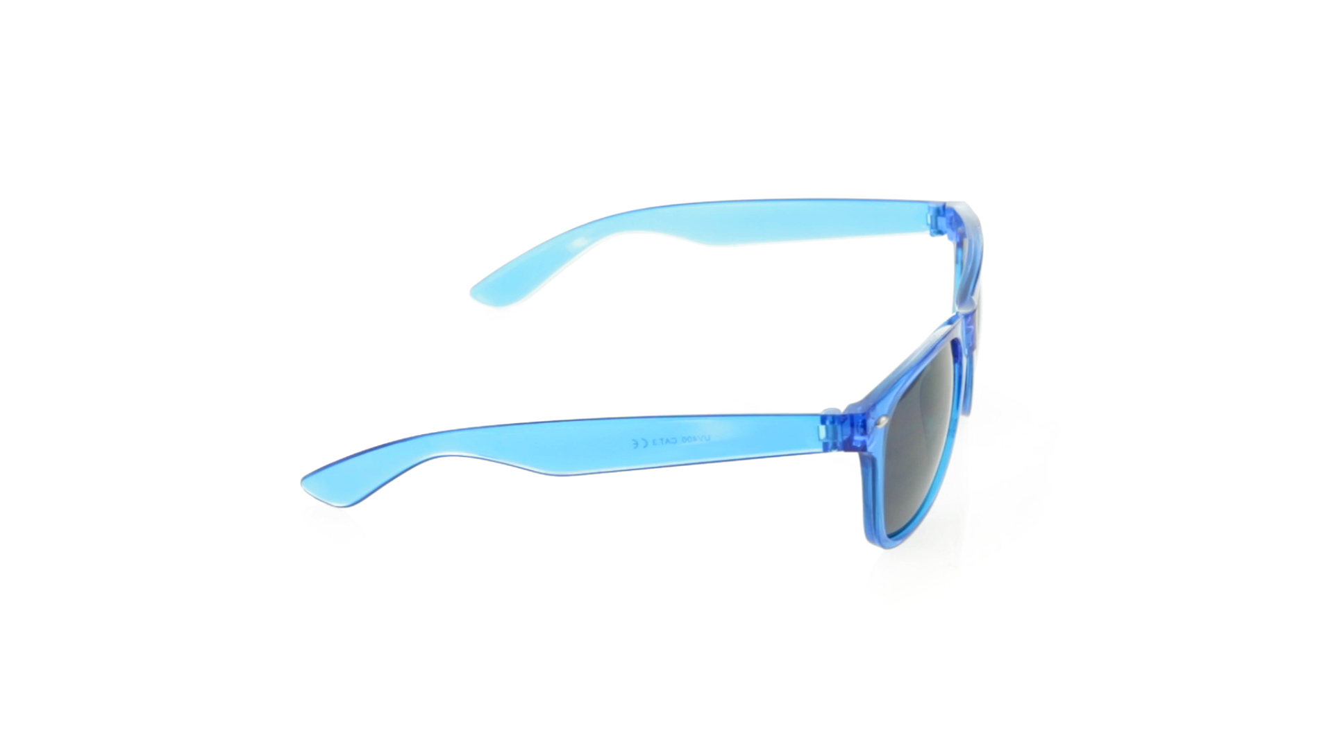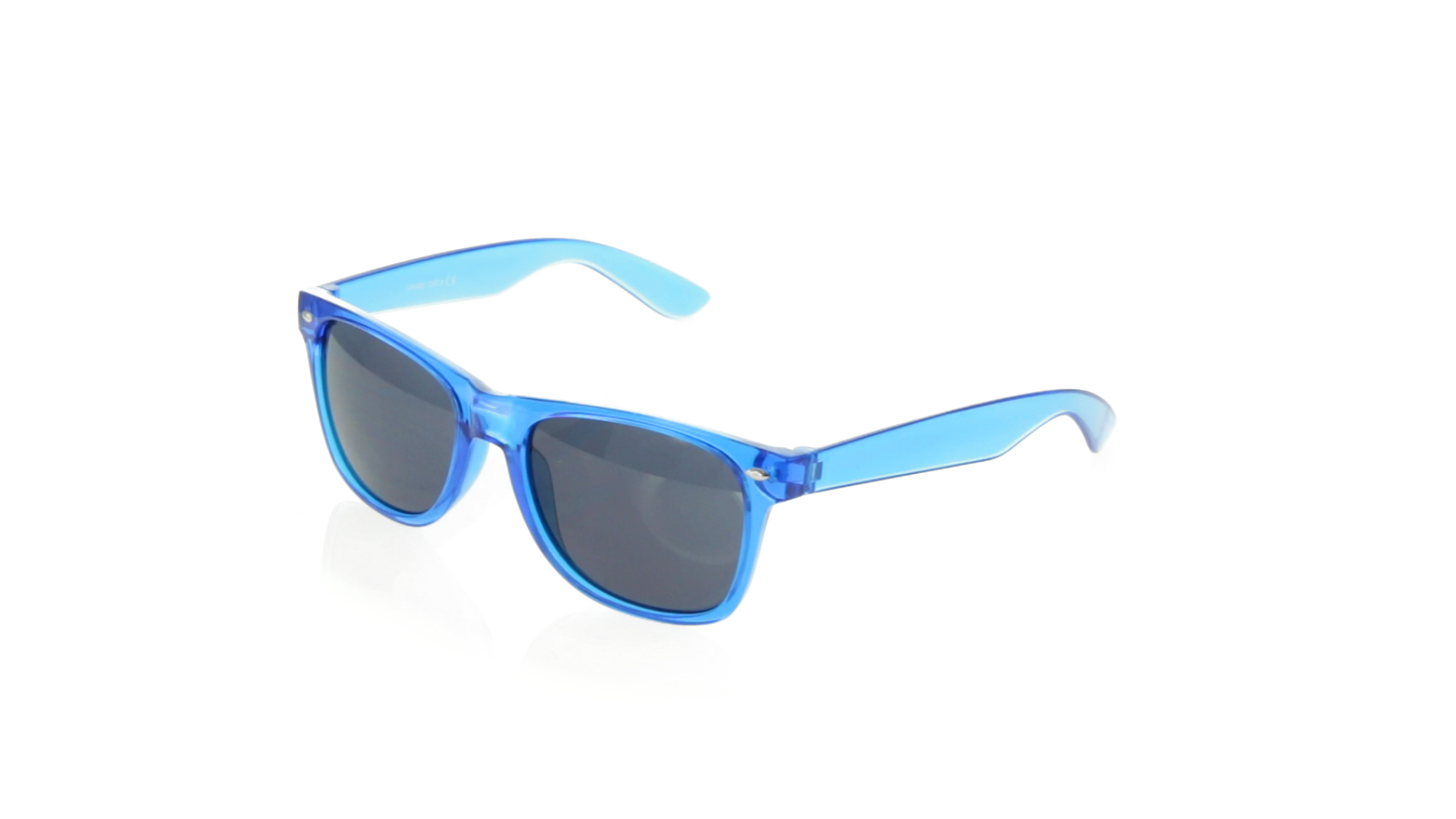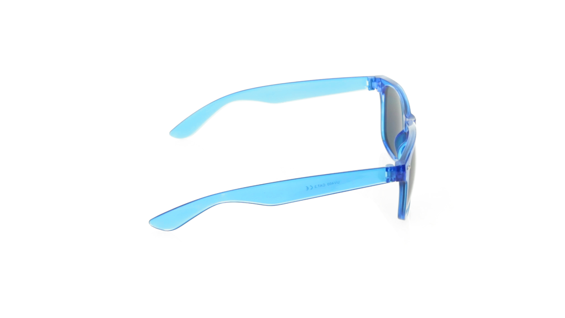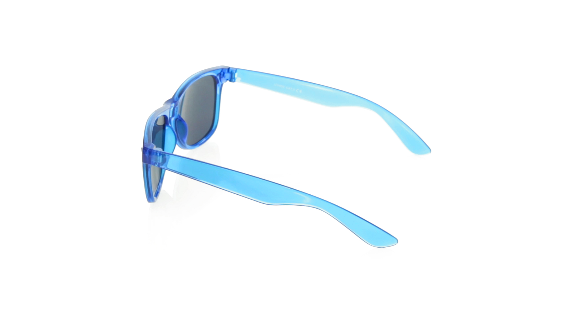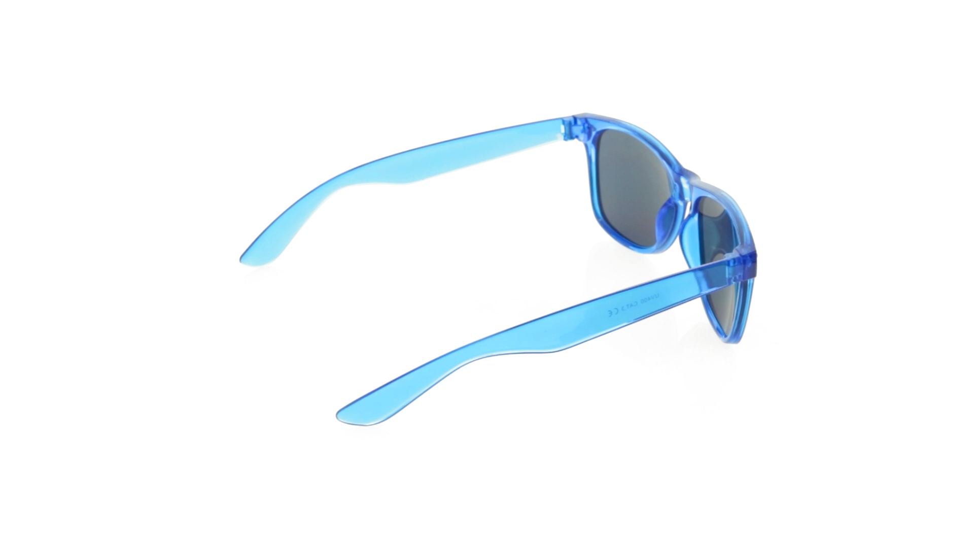 Sonnenbrille mit UV-400-Schutz und klassischem Design. Mit transparentem Rahmen in lebhaften Farben und schwarzen Gläsern.