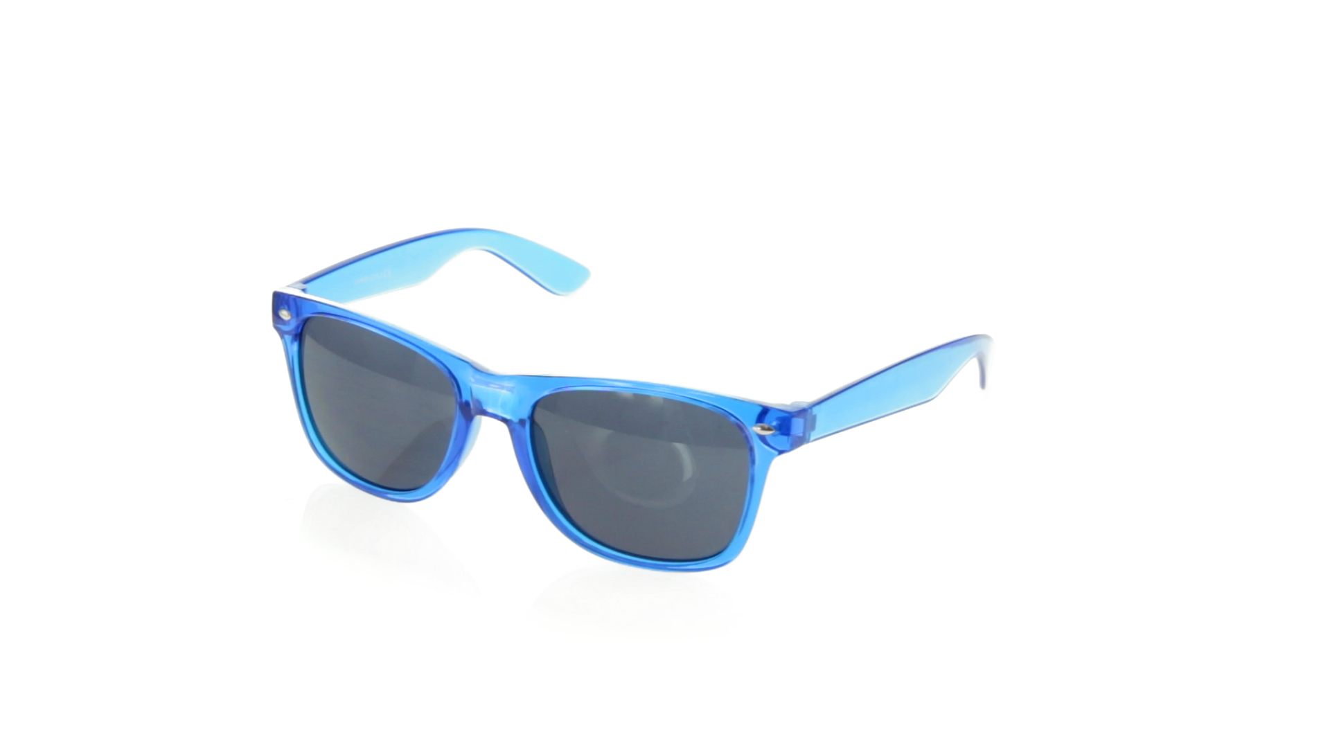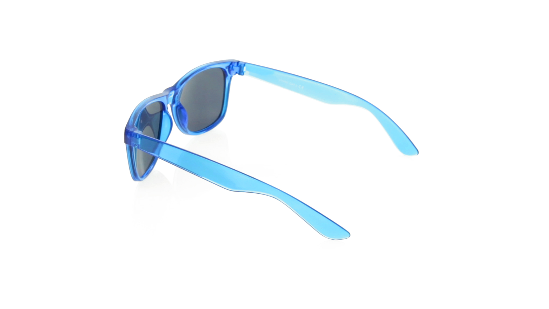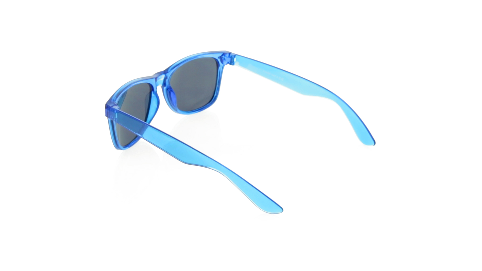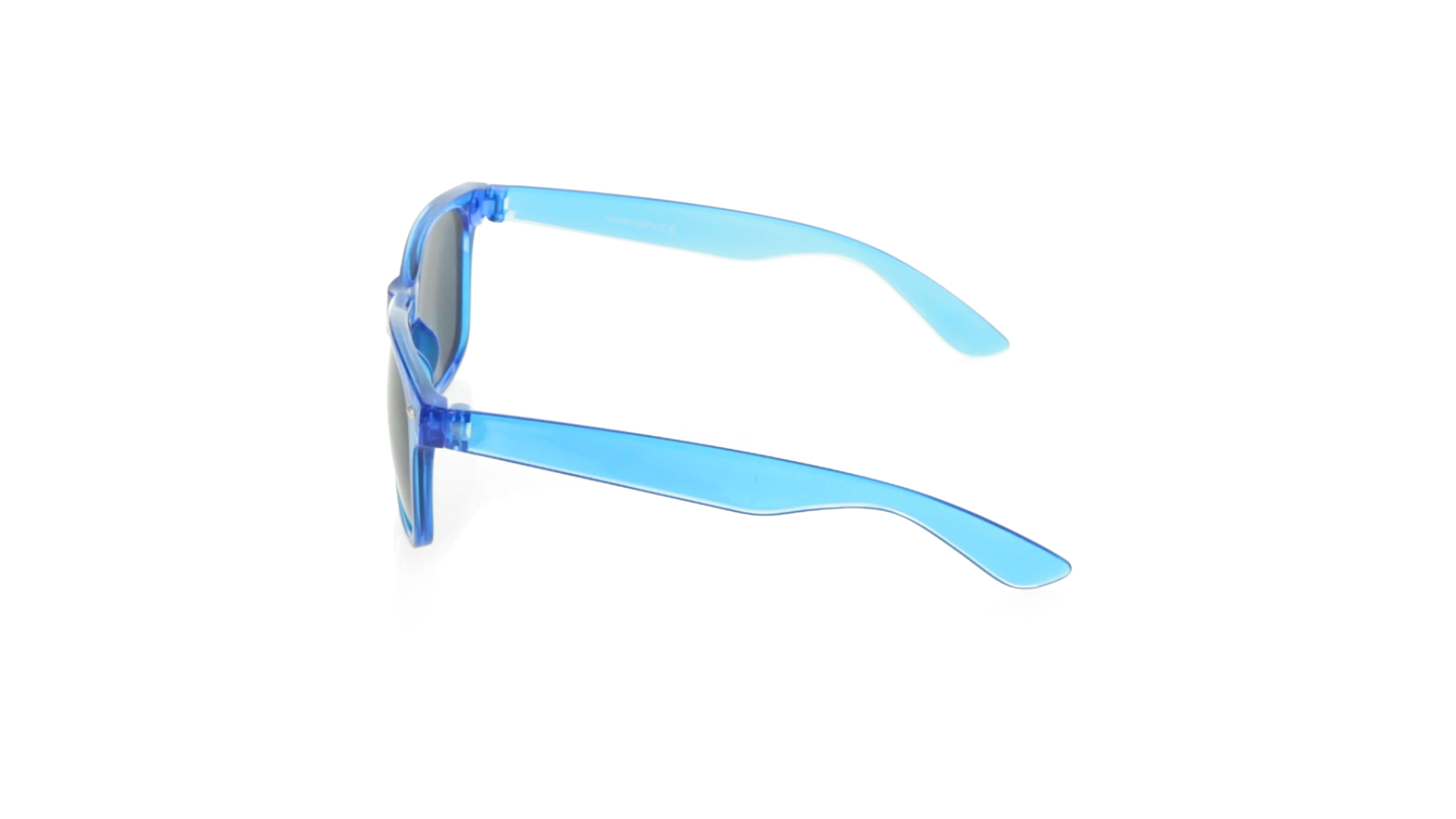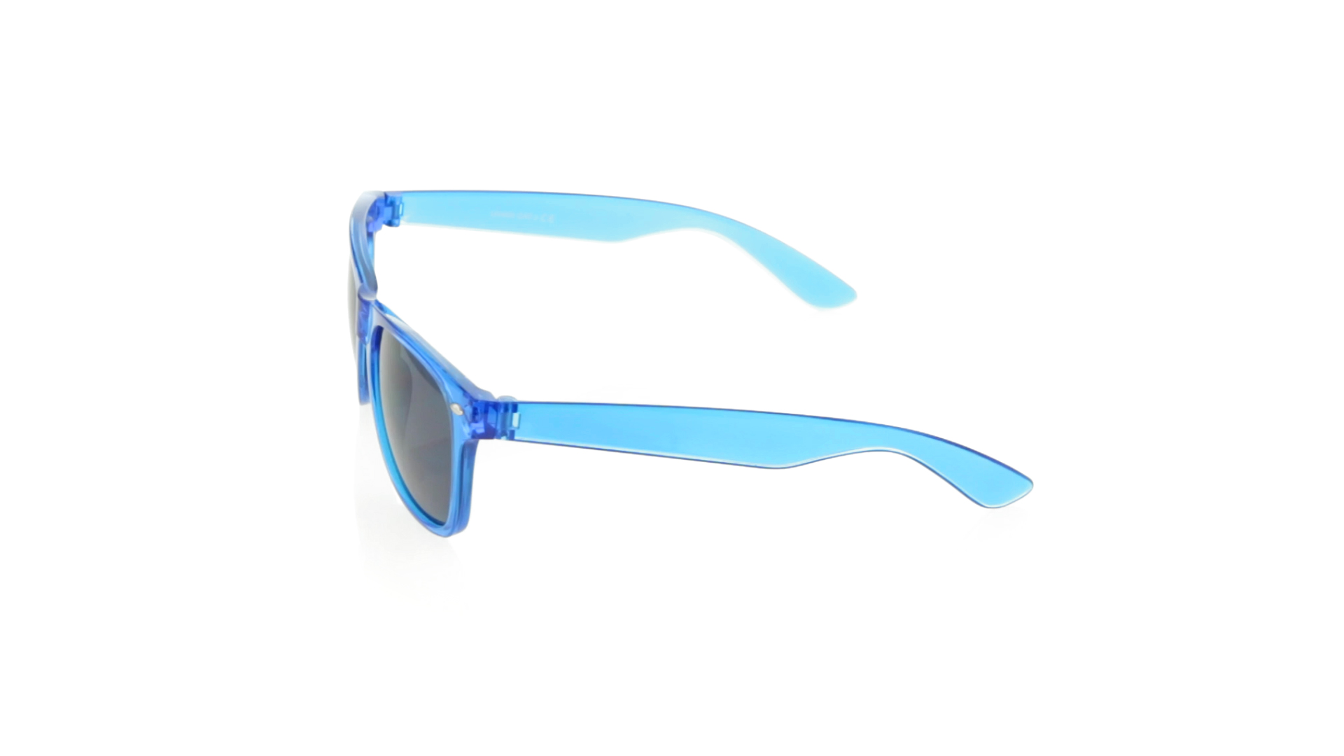 Sonnenbrille mit UV-400-Schutz und klassischem Design. Mit transparentem Rahmen in lebhaften Farben und schwarzen Gläsern.