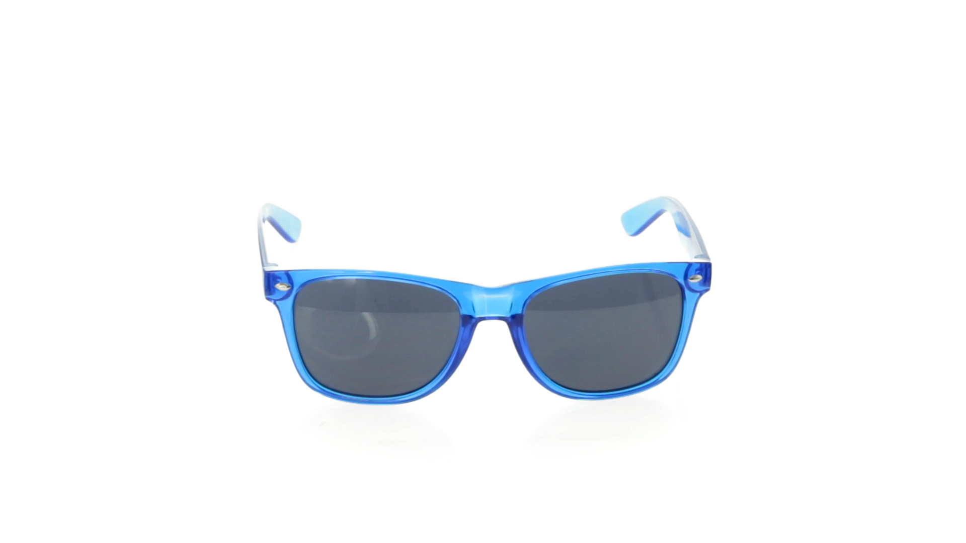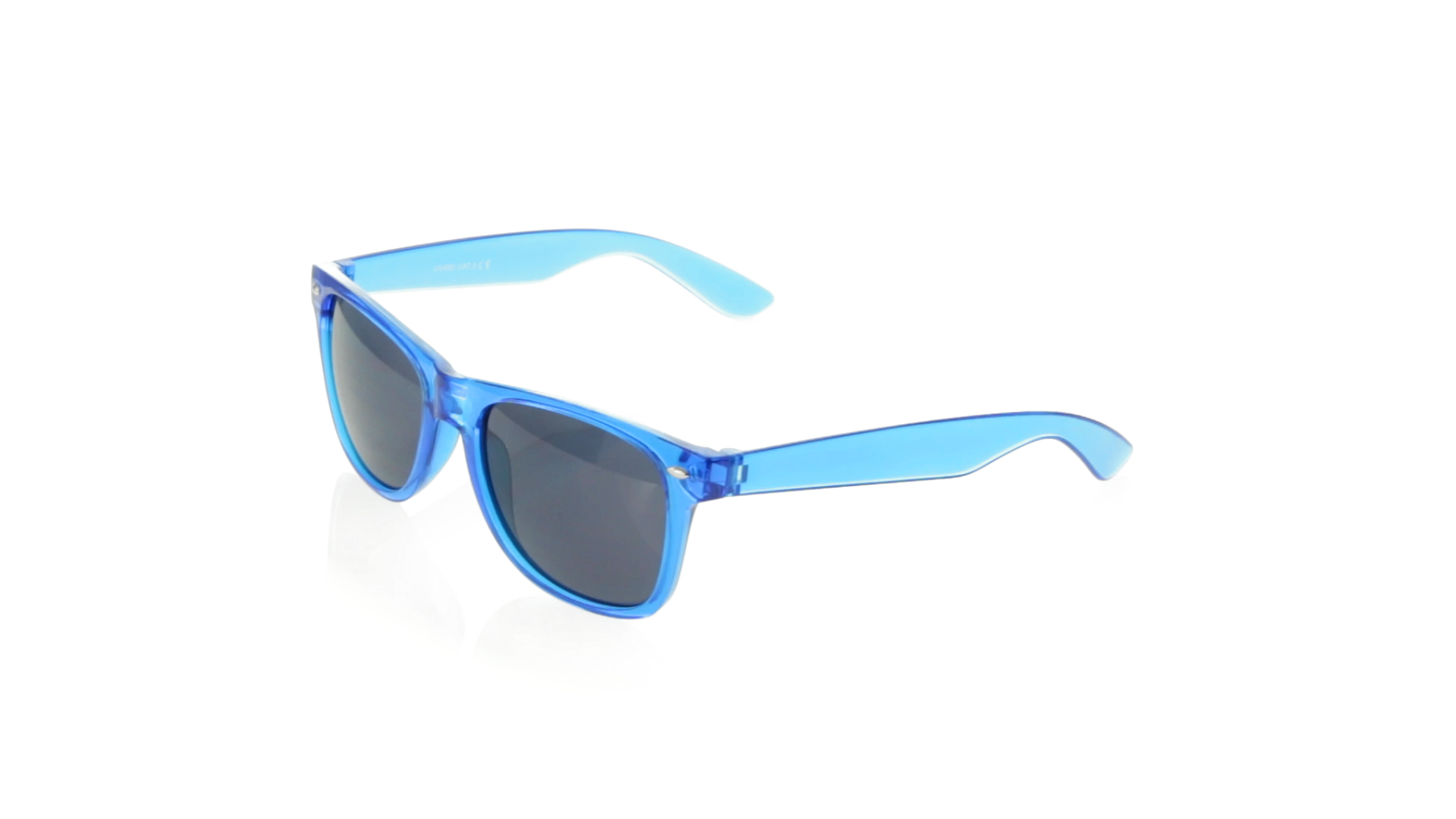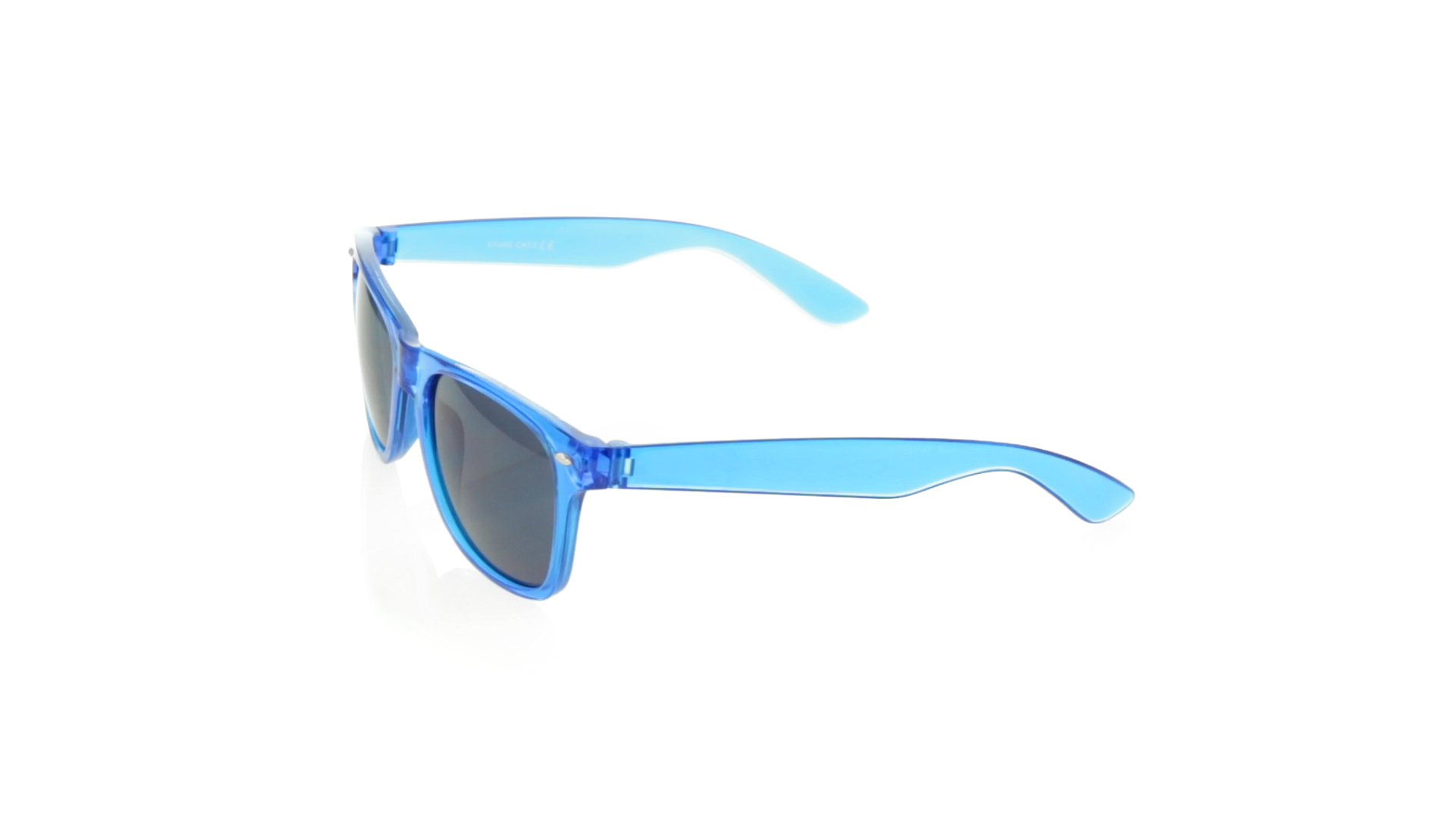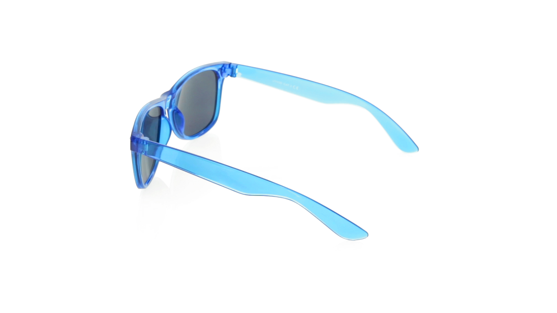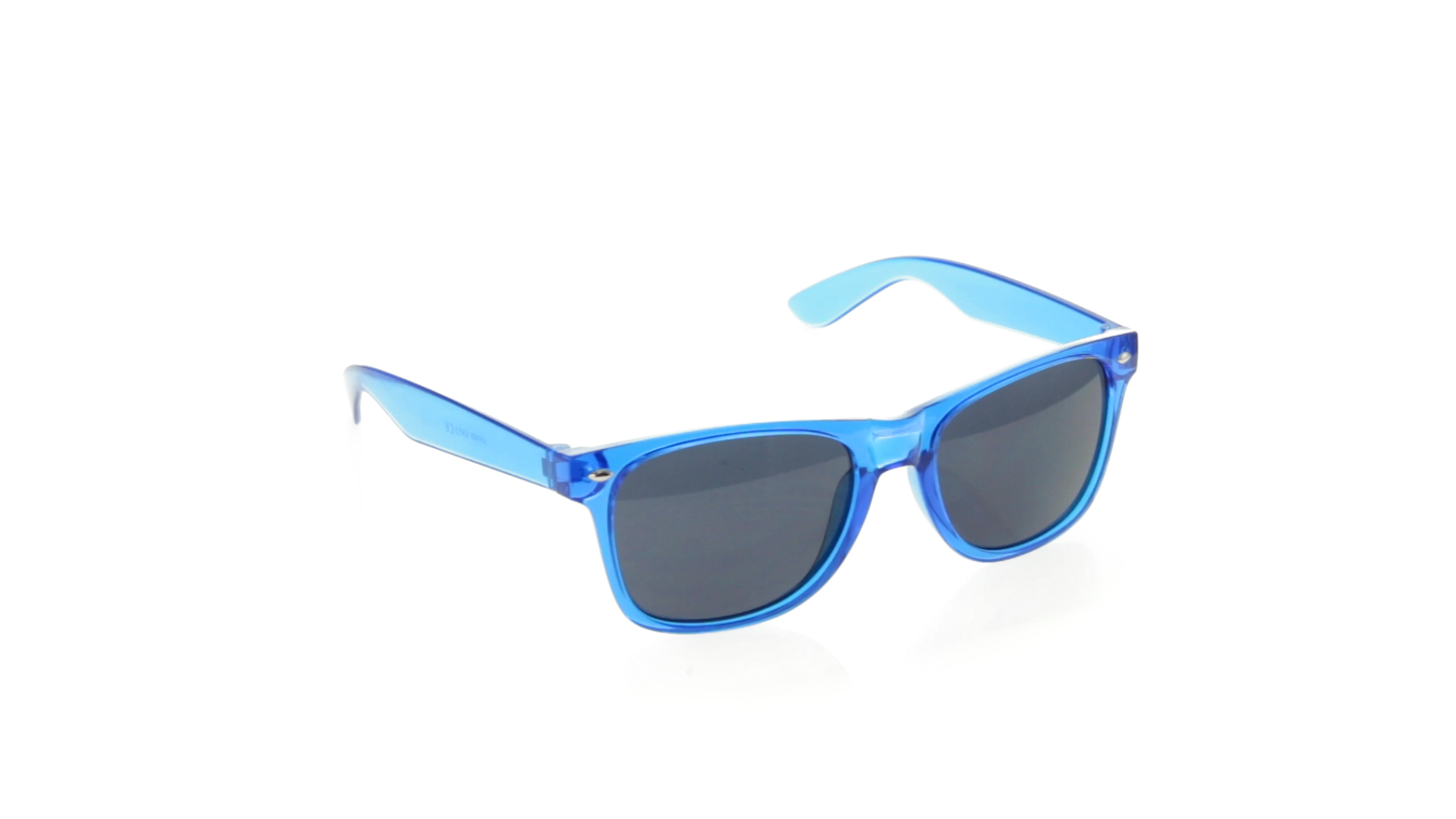 Sonnenbrille mit UV-400-Schutz und klassischem Design. Mit transparentem Rahmen in lebhaften Farben und schwarzen Gläsern.