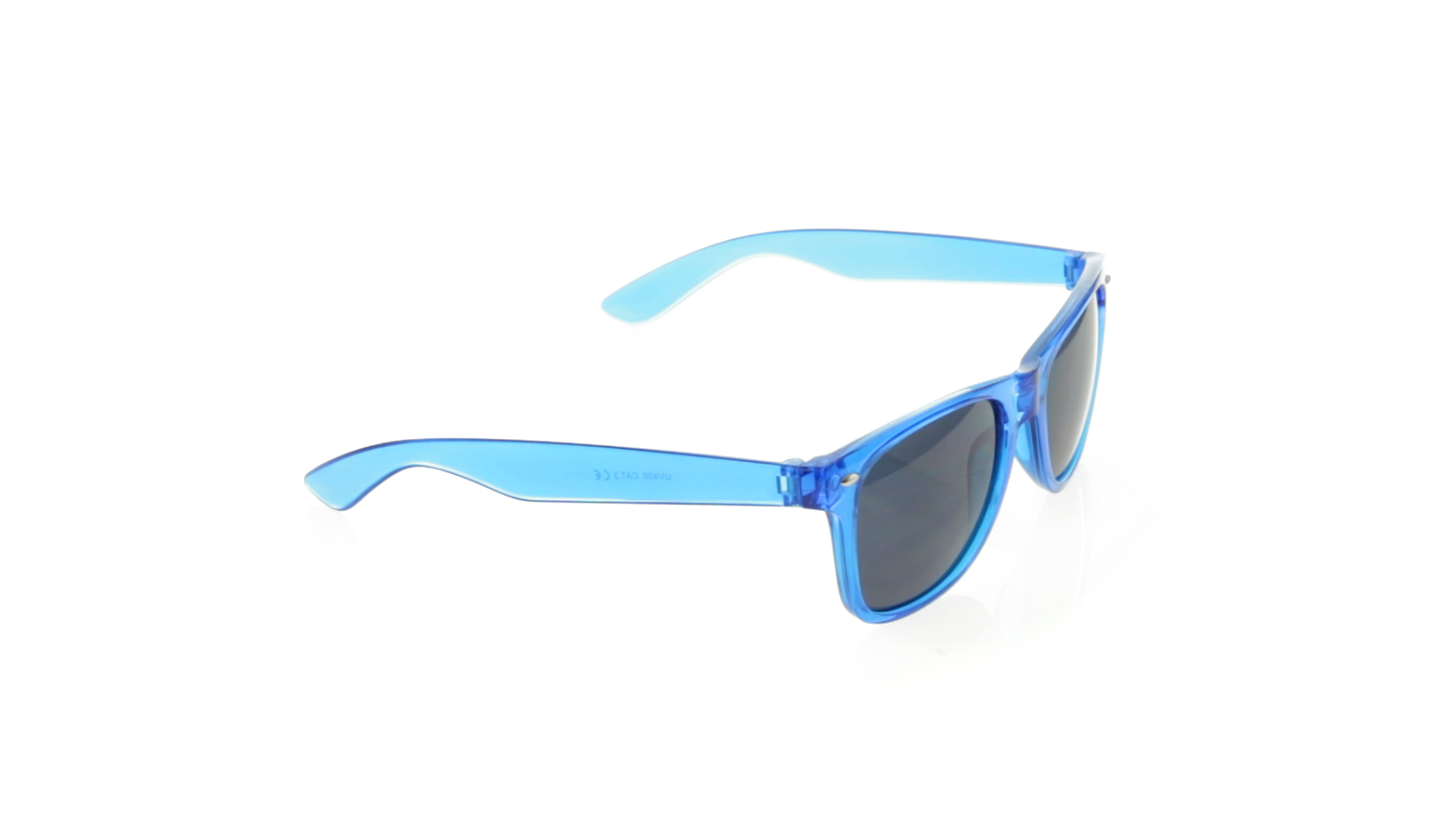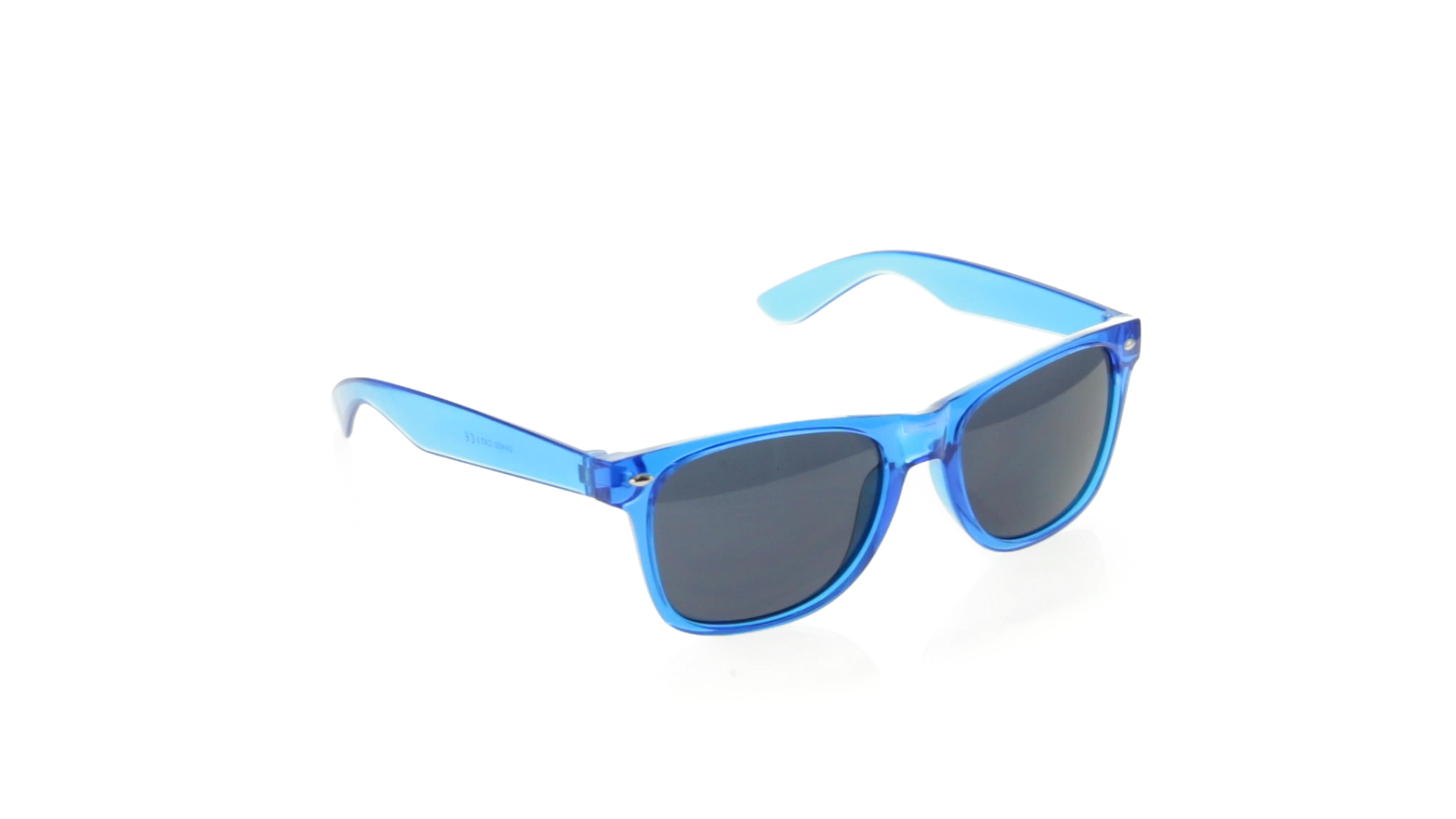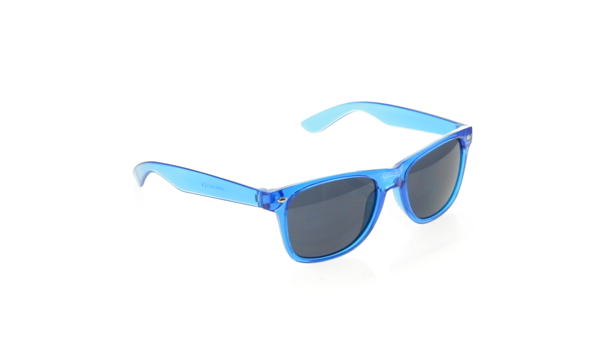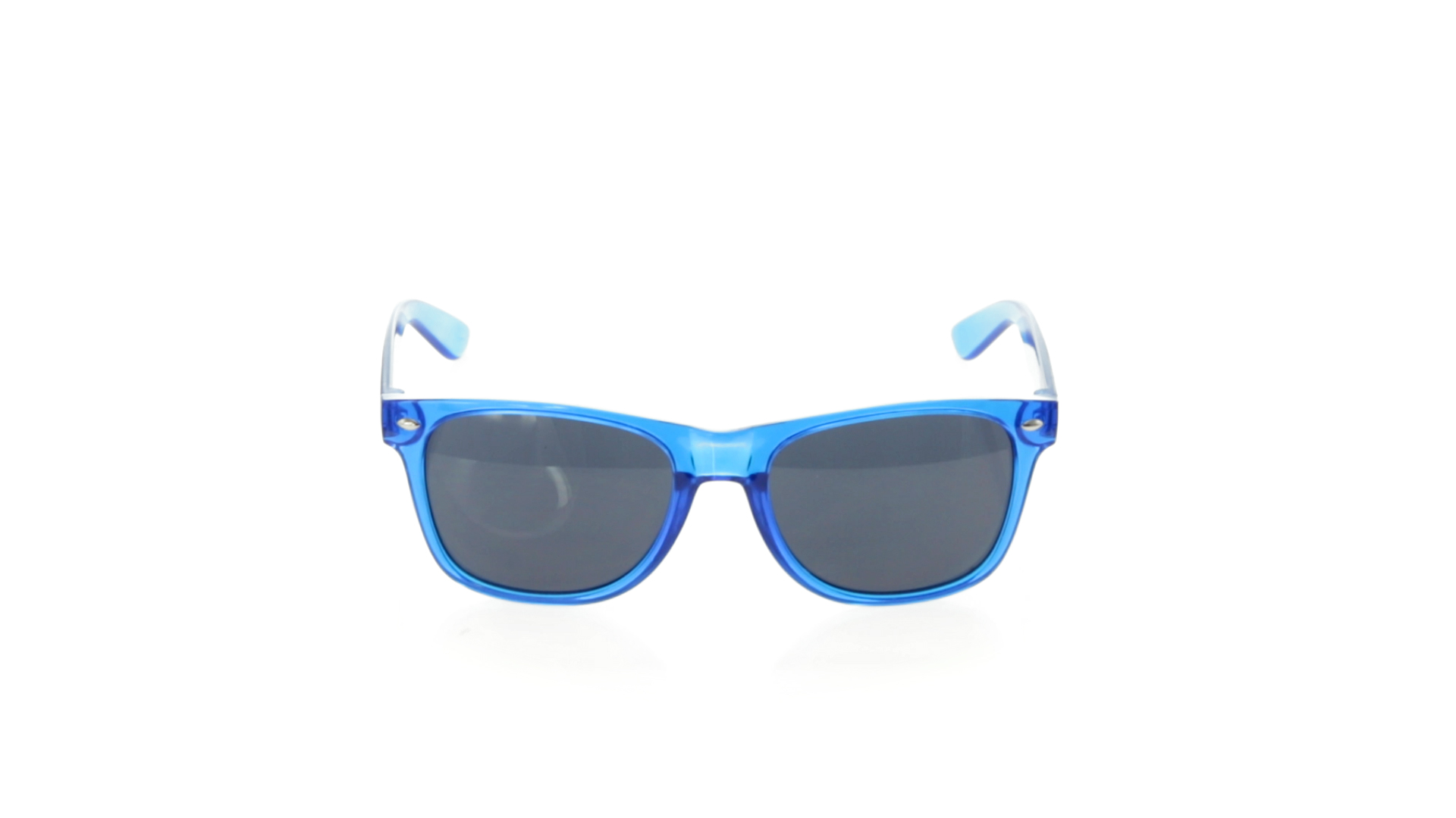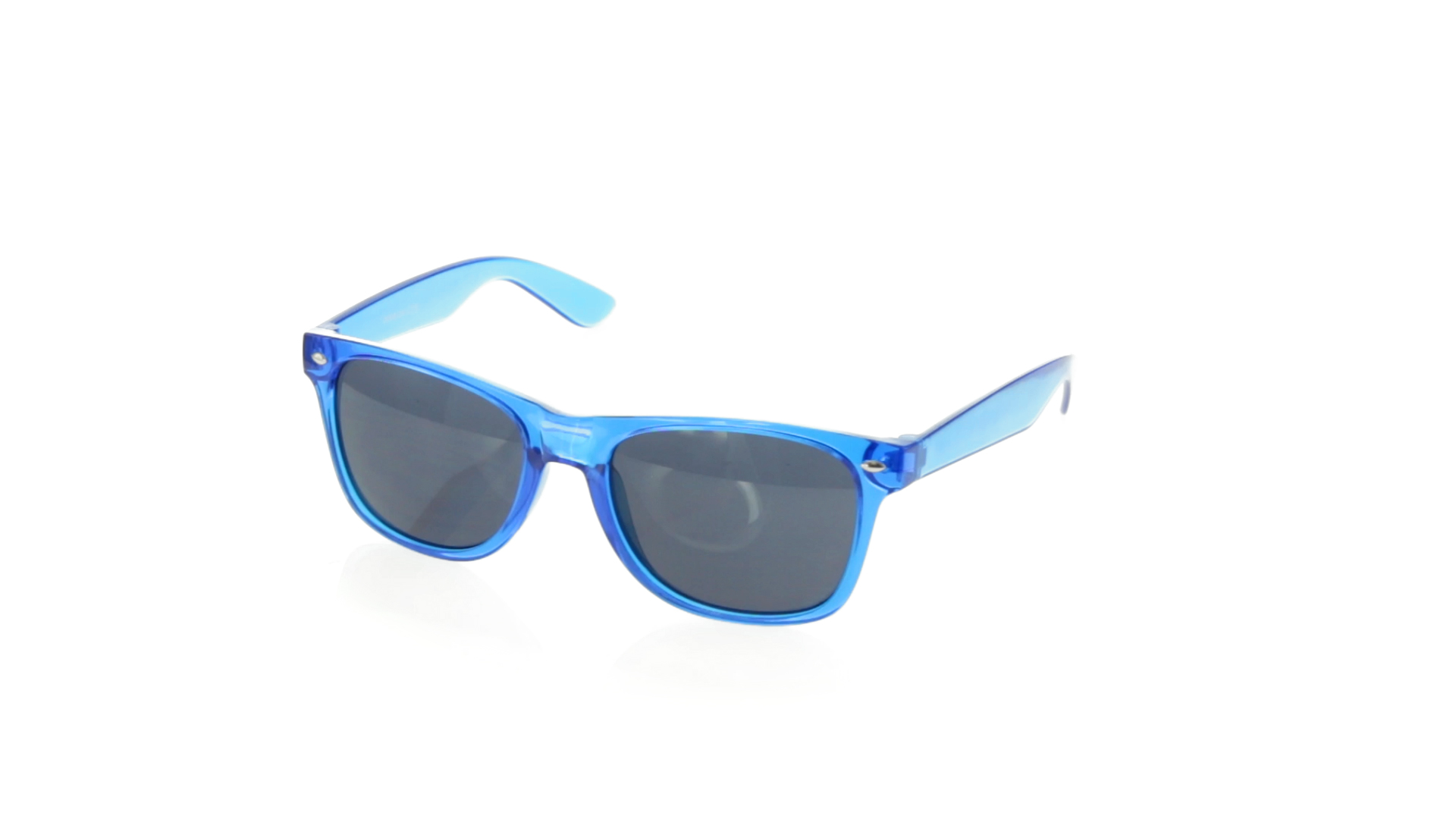 Sonnenbrille mit UV-400-Schutz und klassischem Design. Mit transparentem Rahmen in lebhaften Farben und schwarzen Gläsern.
