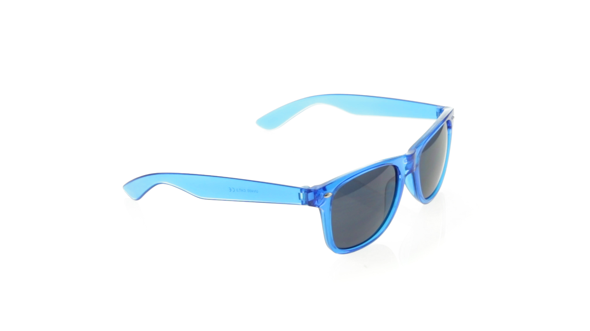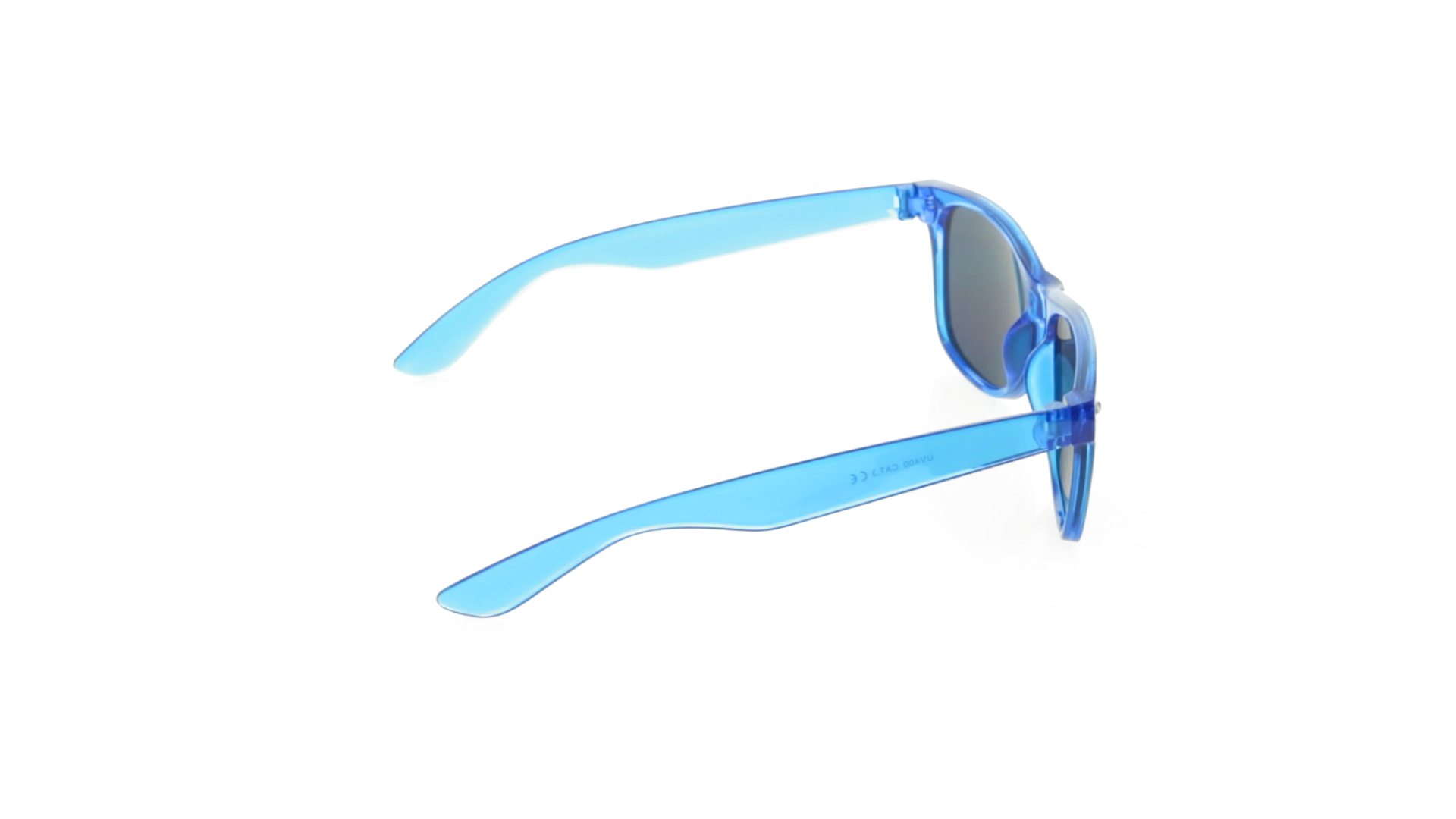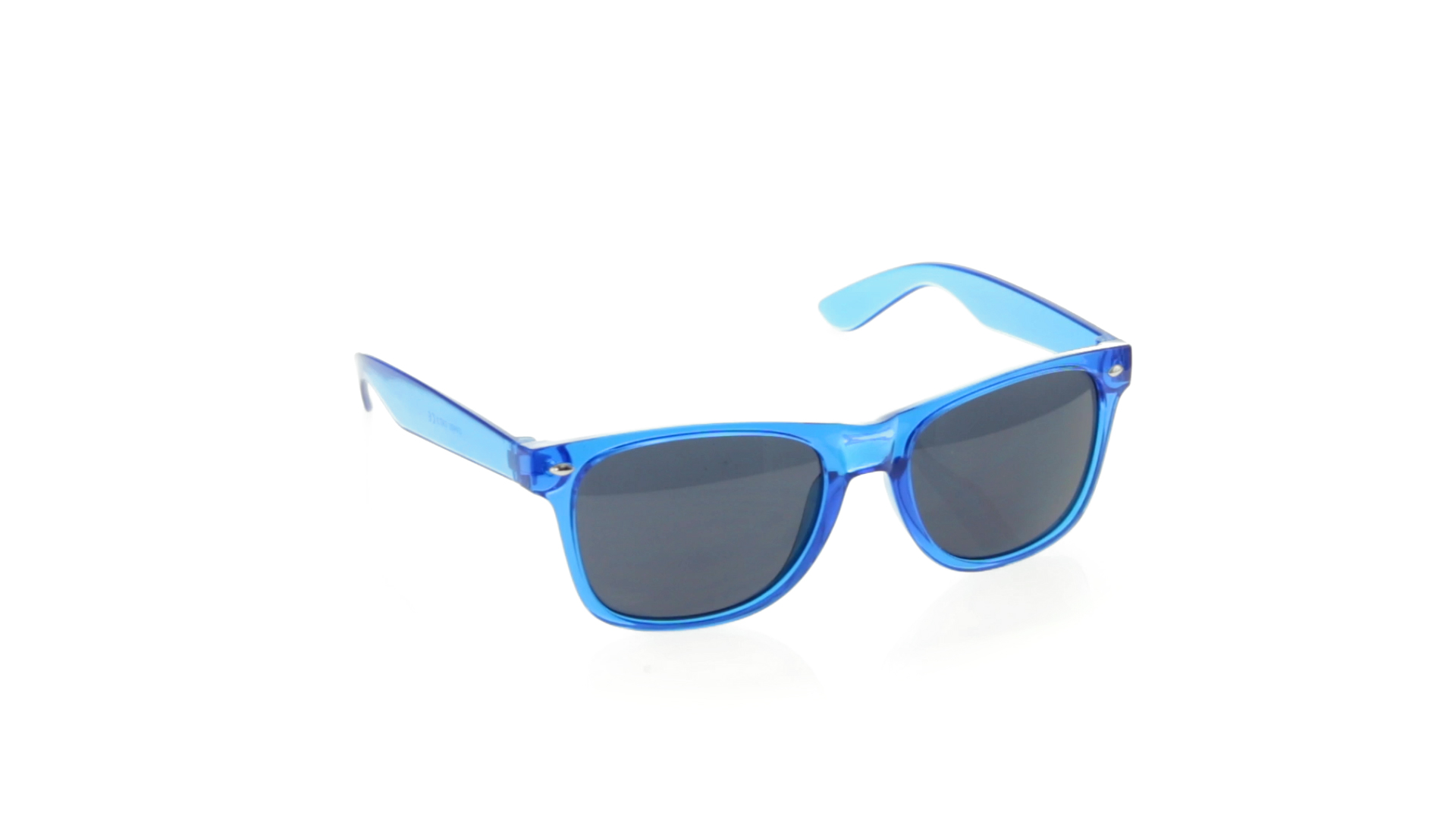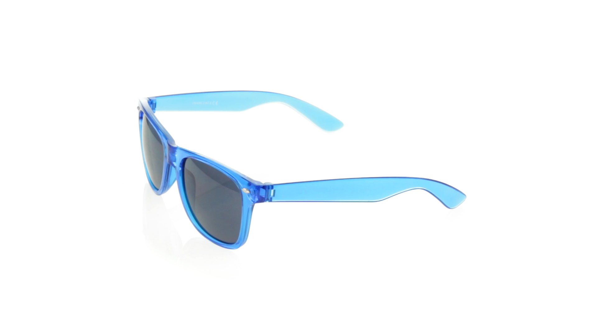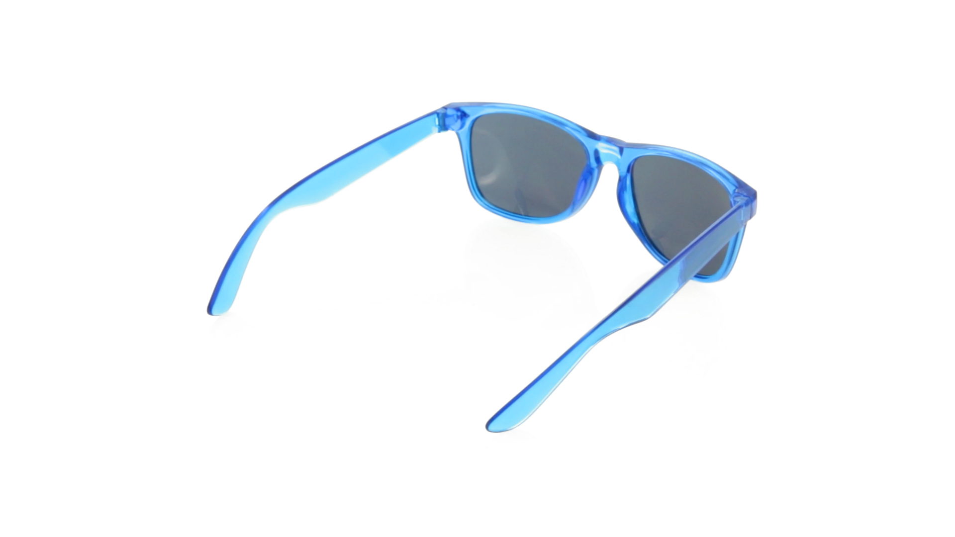 Sonnenbrille mit UV-400-Schutz und klassischem Design. Mit transparentem Rahmen in lebhaften Farben und schwarzen Gläsern.