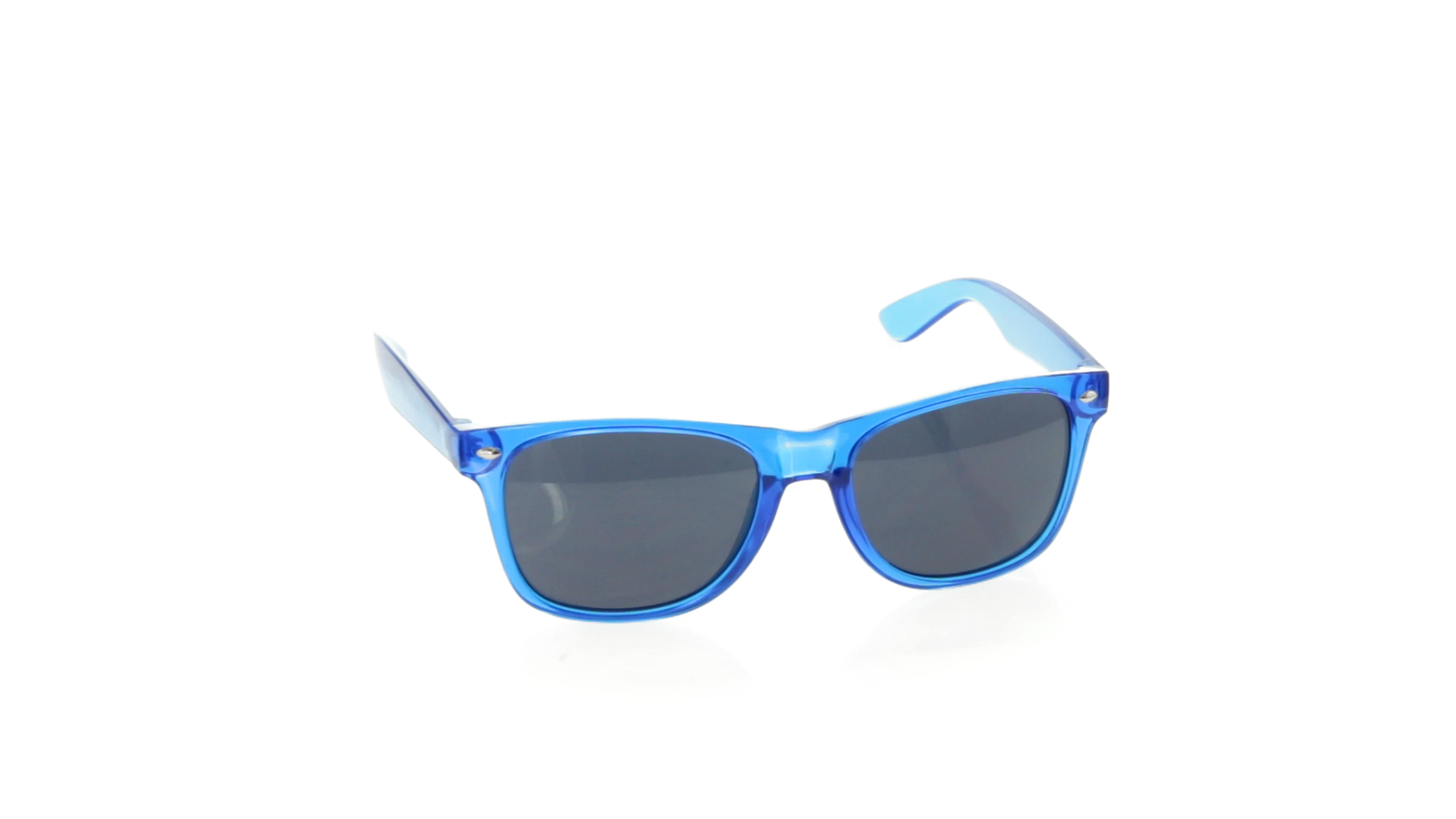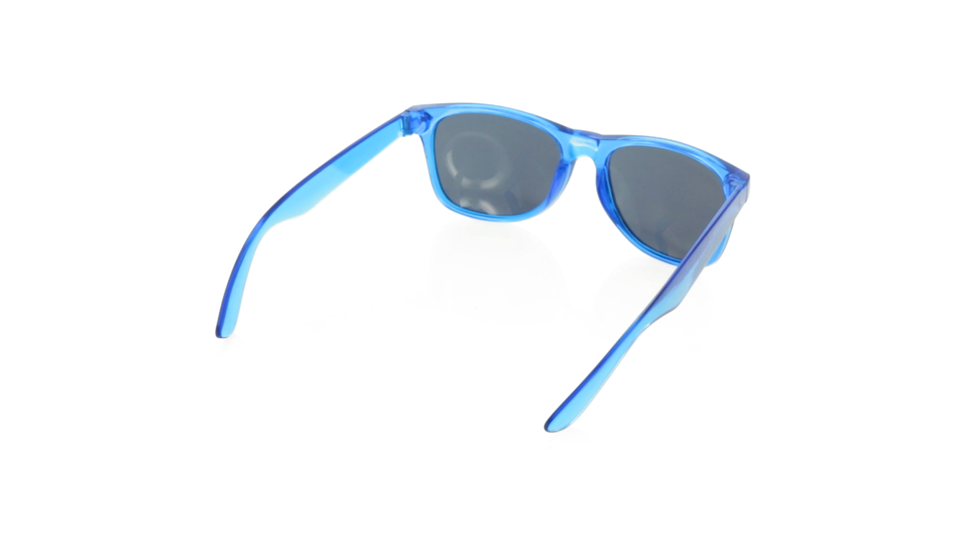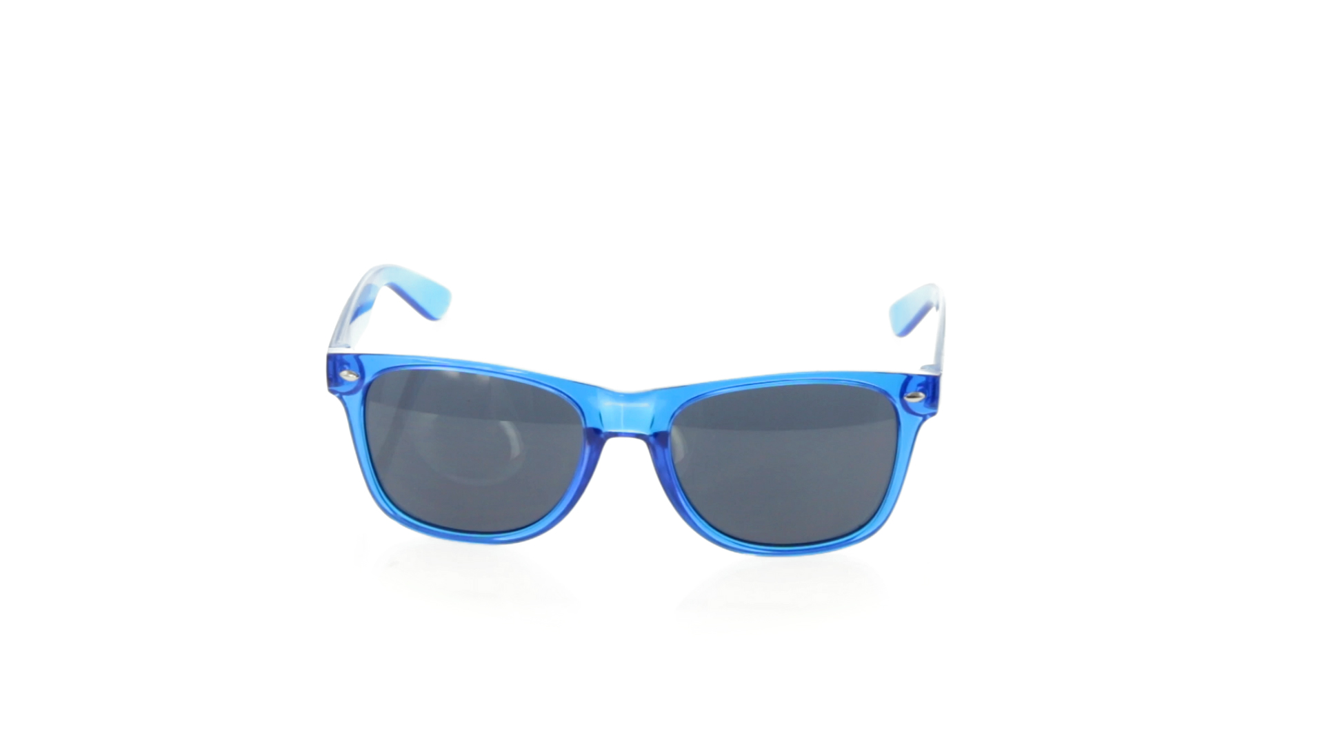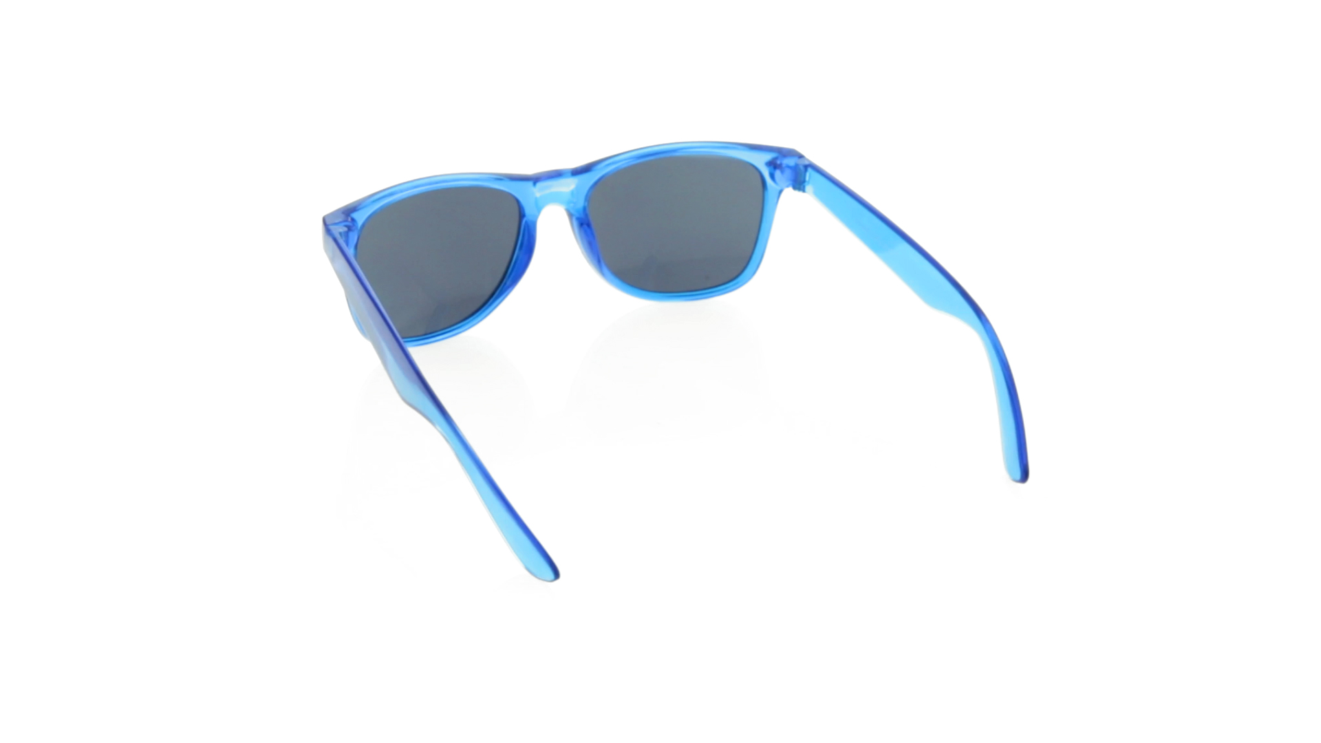 Sonnenbrille mit UV-400-Schutz und klassischem Design. Mit transparentem Rahmen in lebhaften Farben und schwarzen Gläsern.