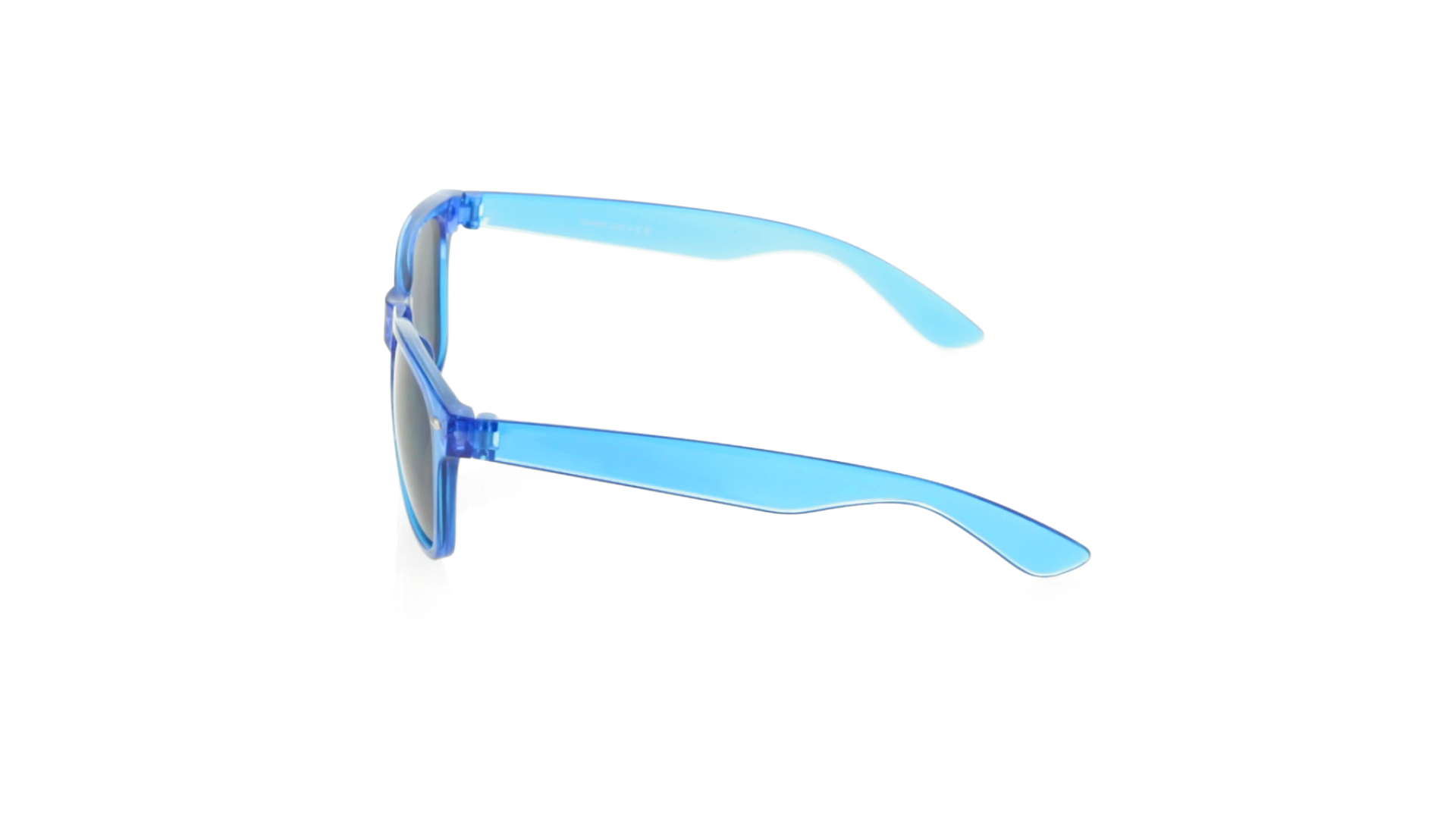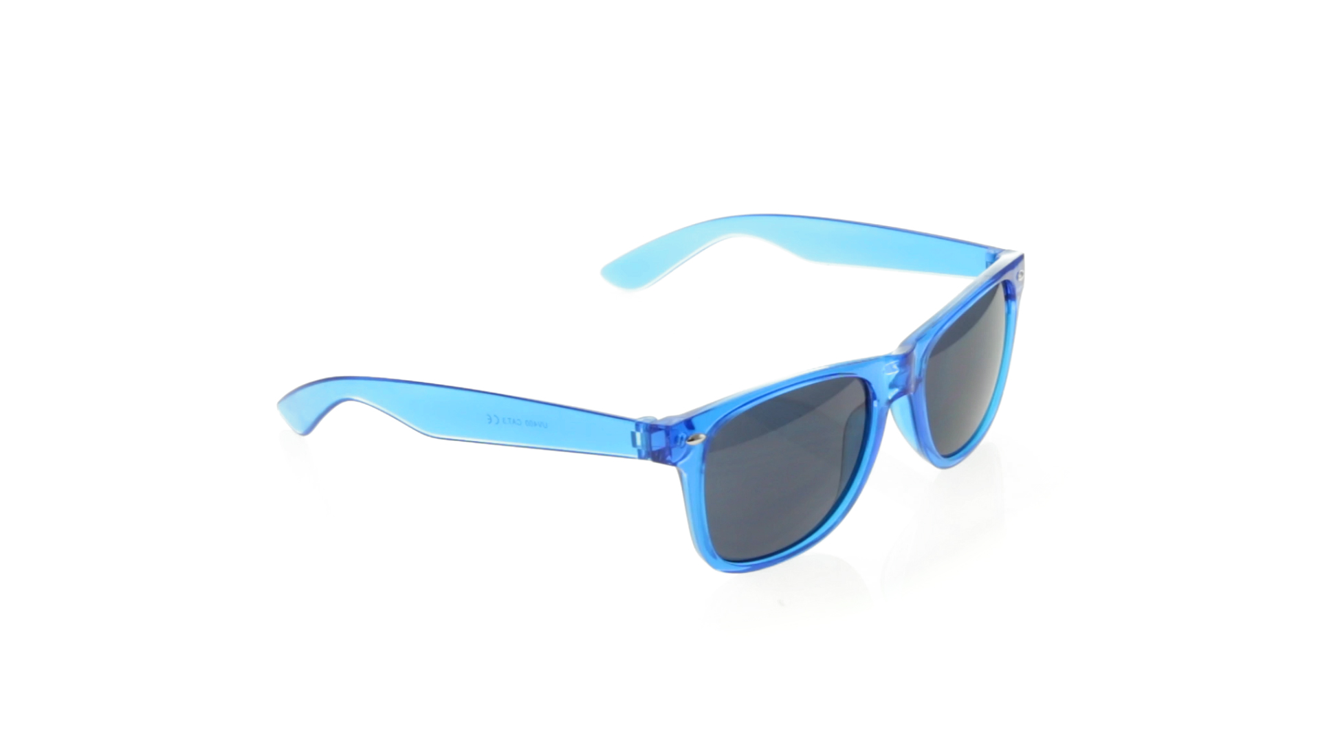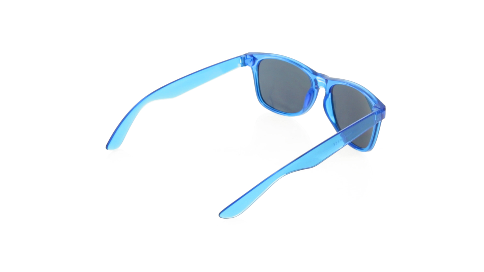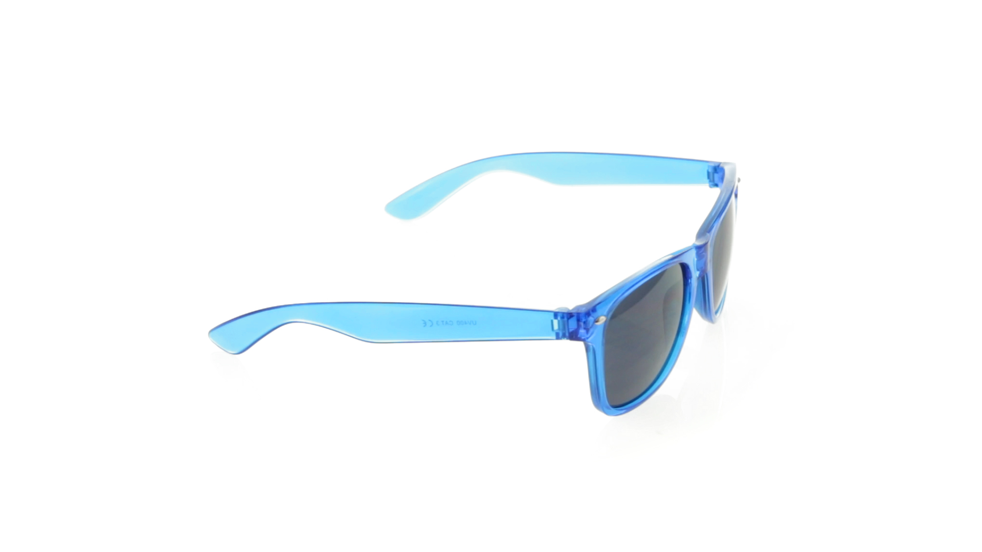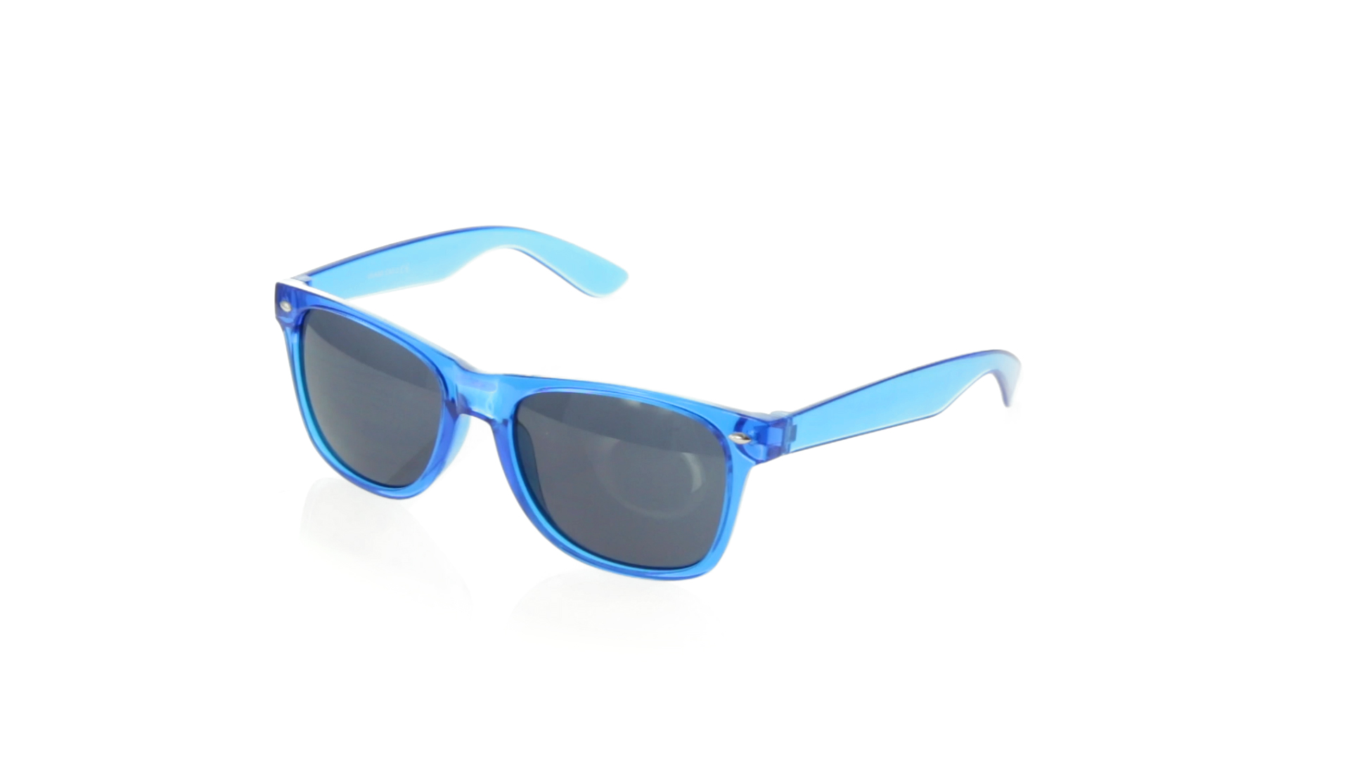Sonnenbrille mit UV-400-Schutz und klassischem Design. Mit transparentem Rahmen in lebhaften Farben und schwarzen Gläsern.