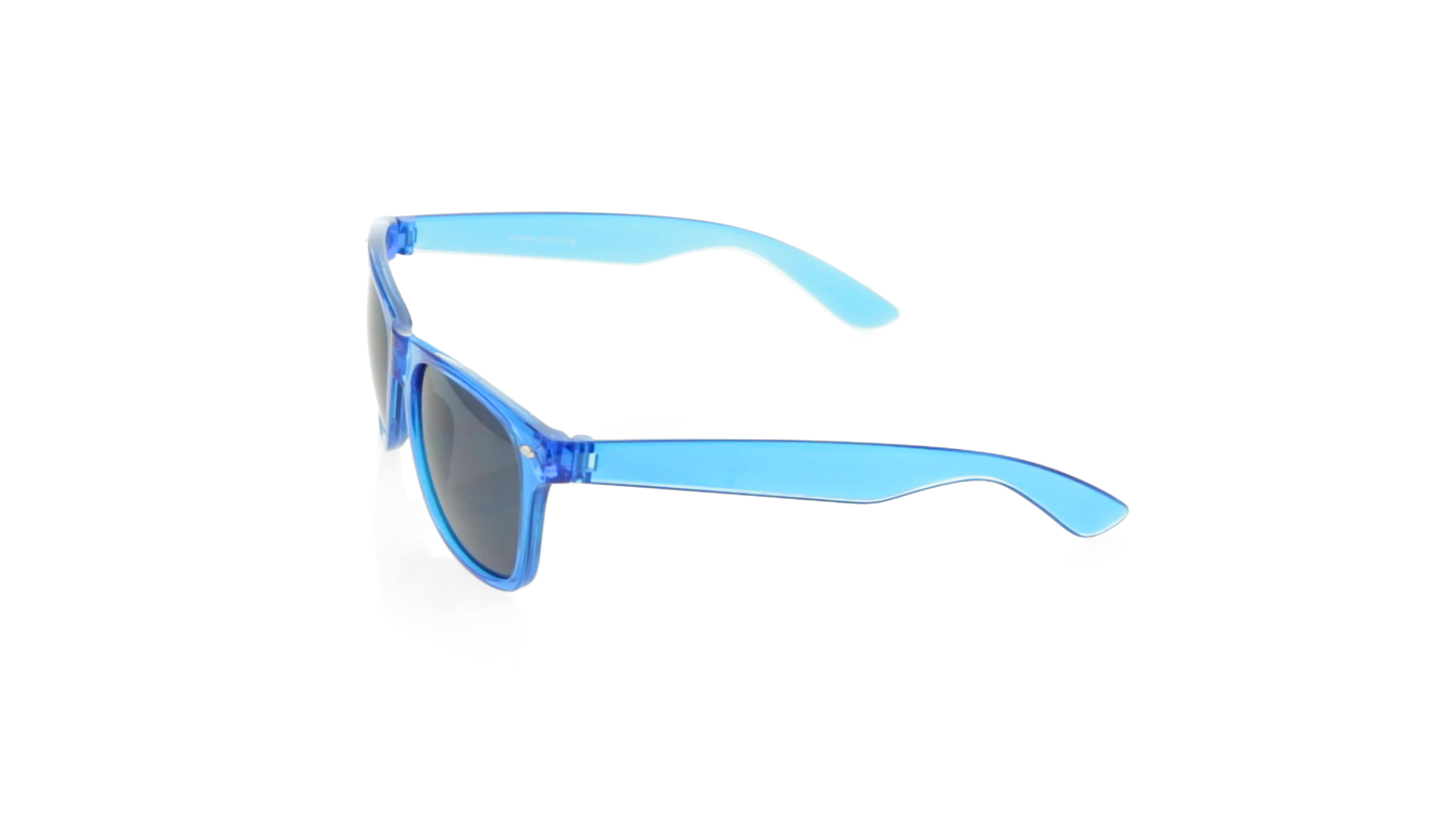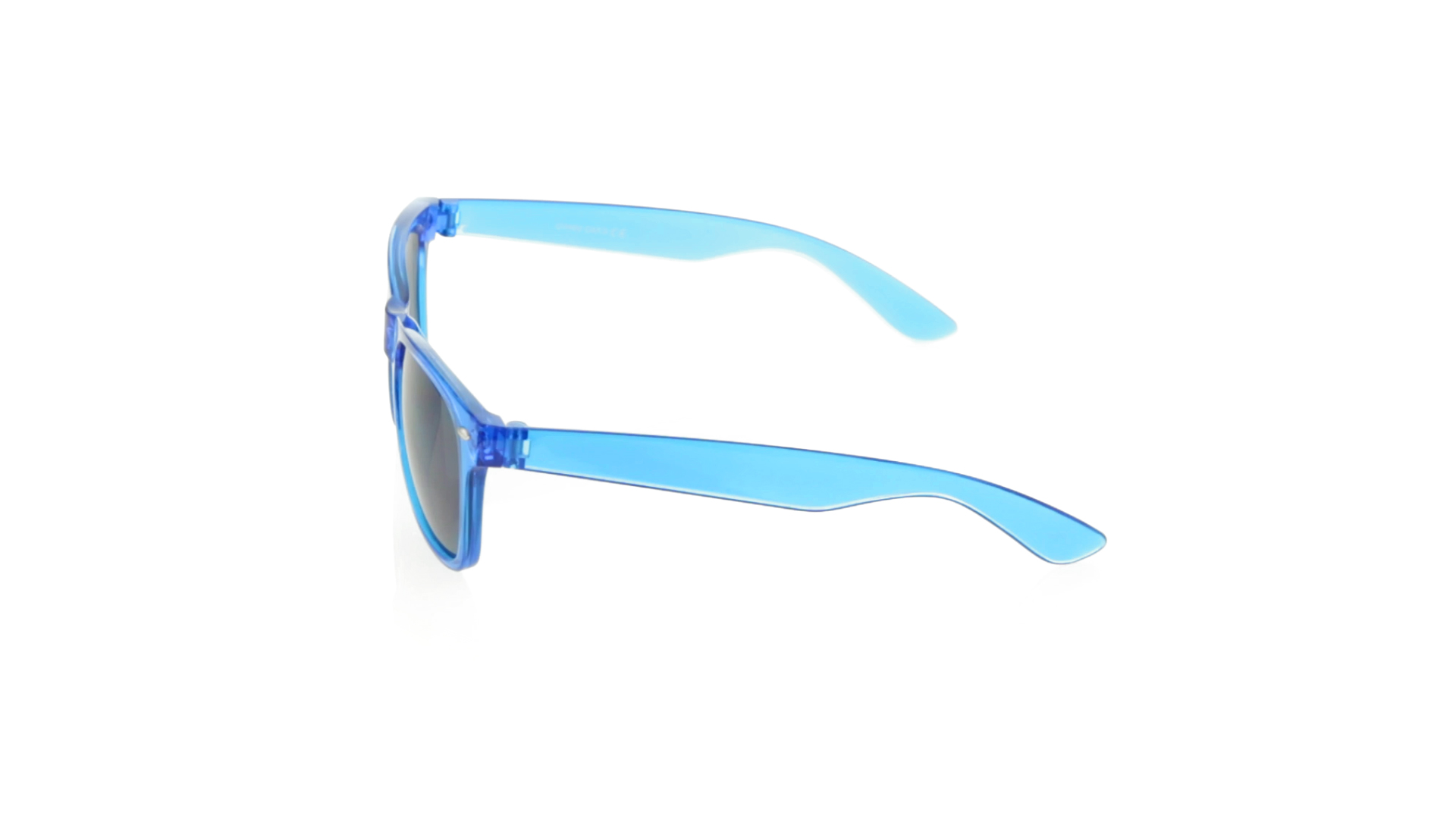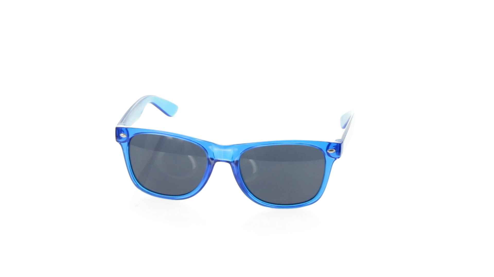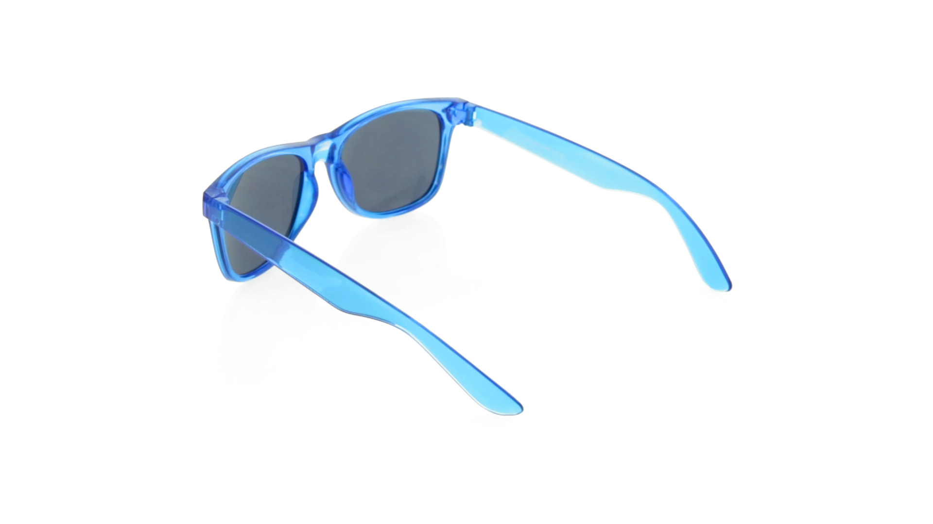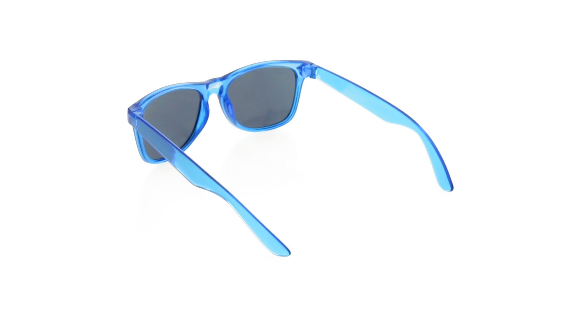 Sonnenbrille mit UV-400-Schutz und klassischem Design. Mit transparentem Rahmen in lebhaften Farben und schwarzen Gläsern.