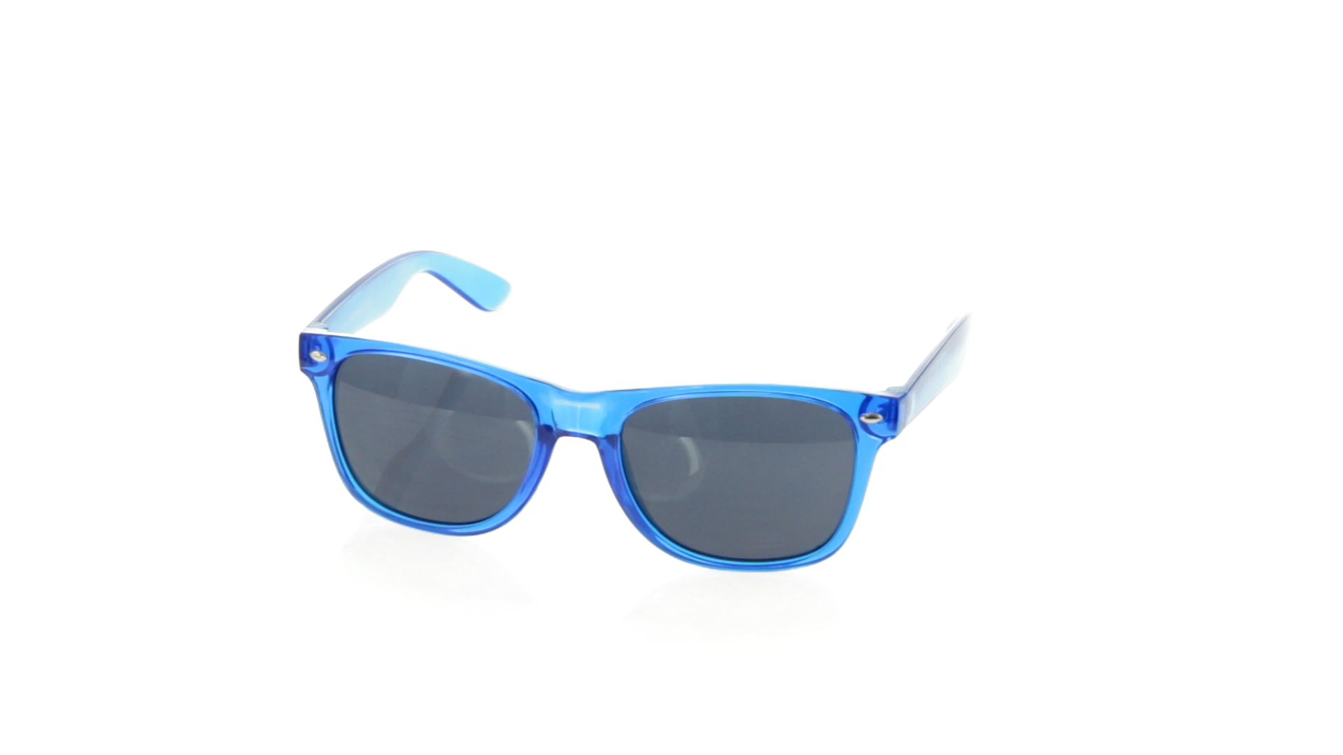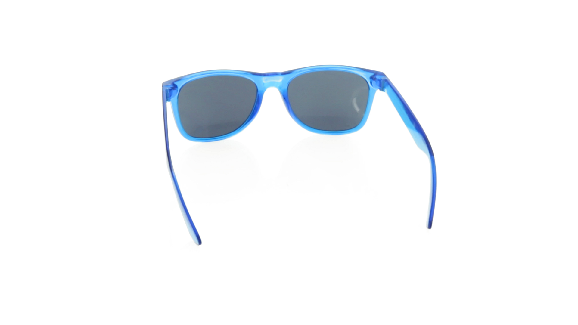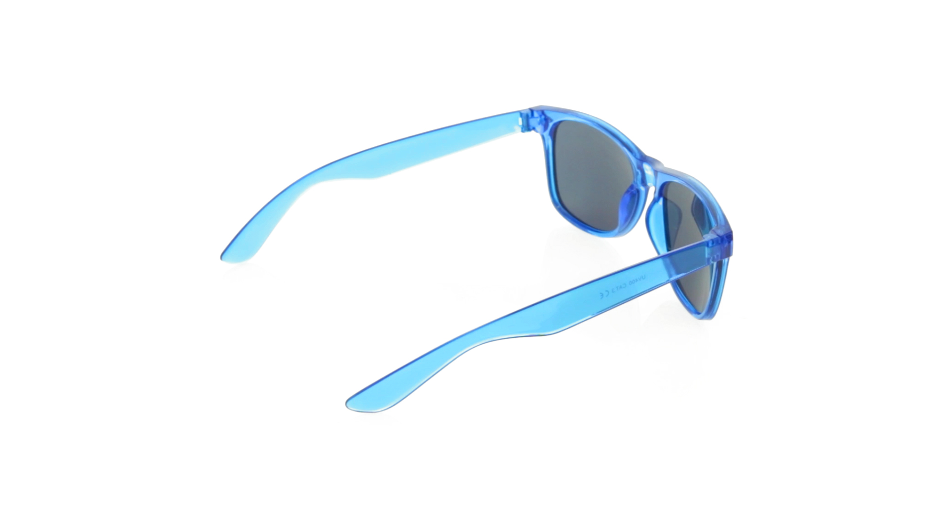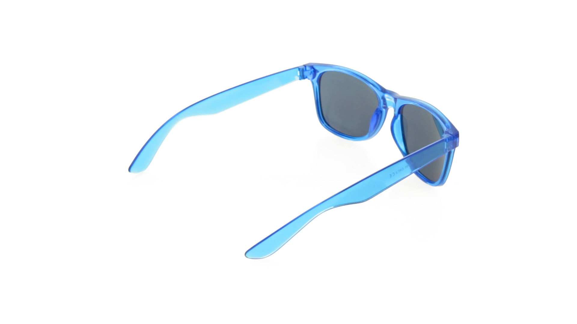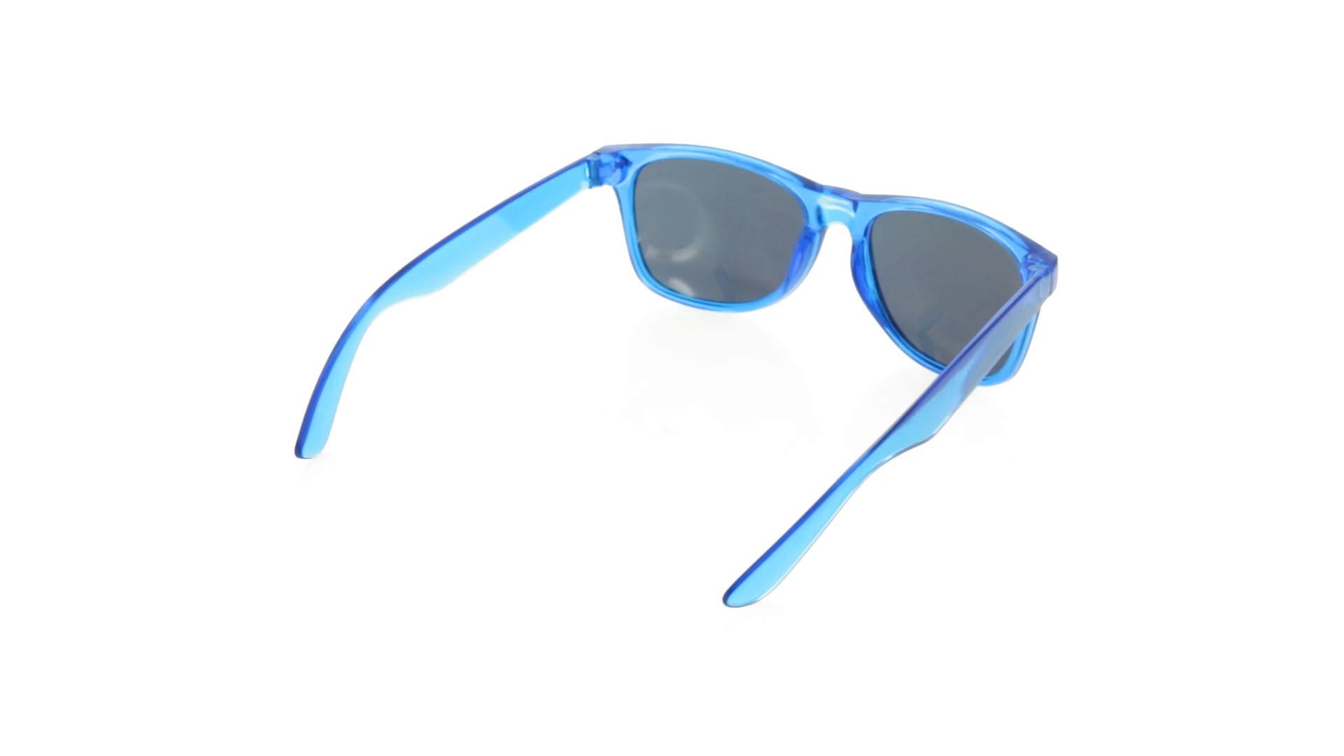 Sonnenbrille mit UV-400-Schutz und klassischem Design. Mit transparentem Rahmen in lebhaften Farben und schwarzen Gläsern.