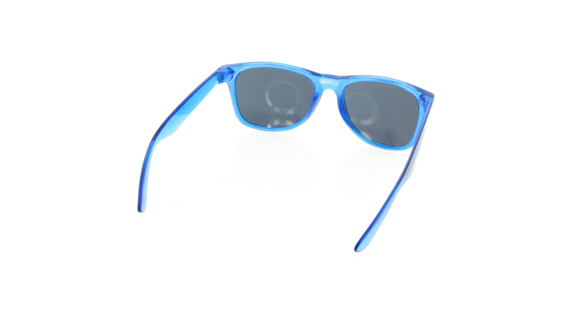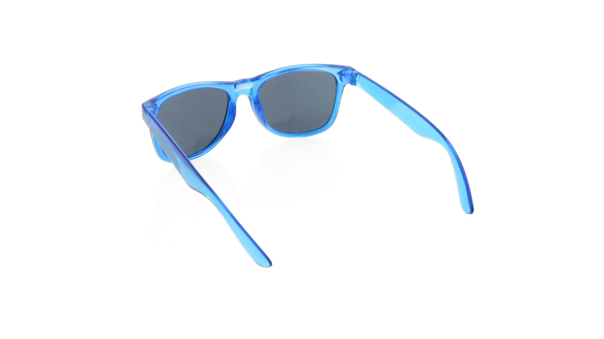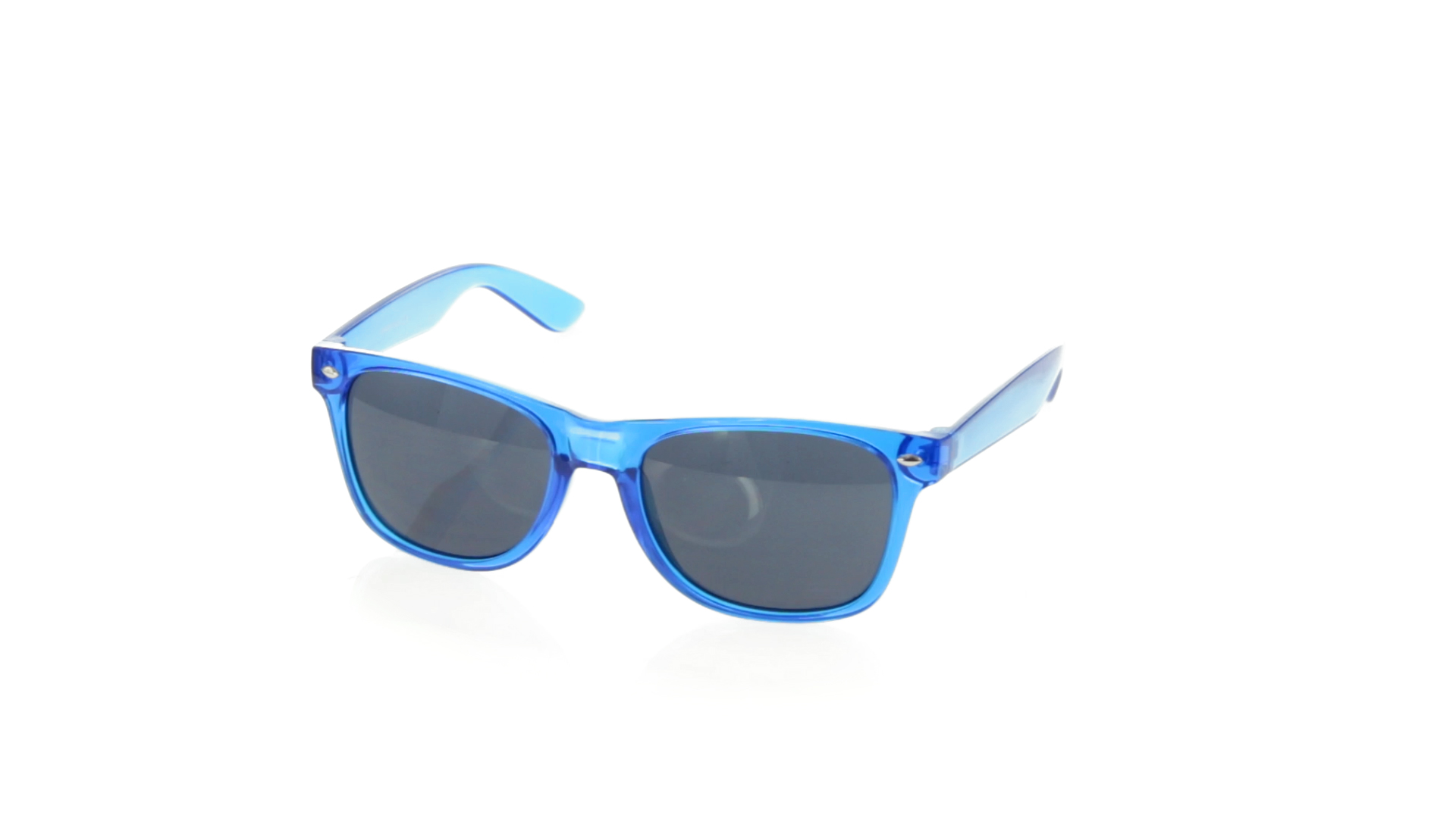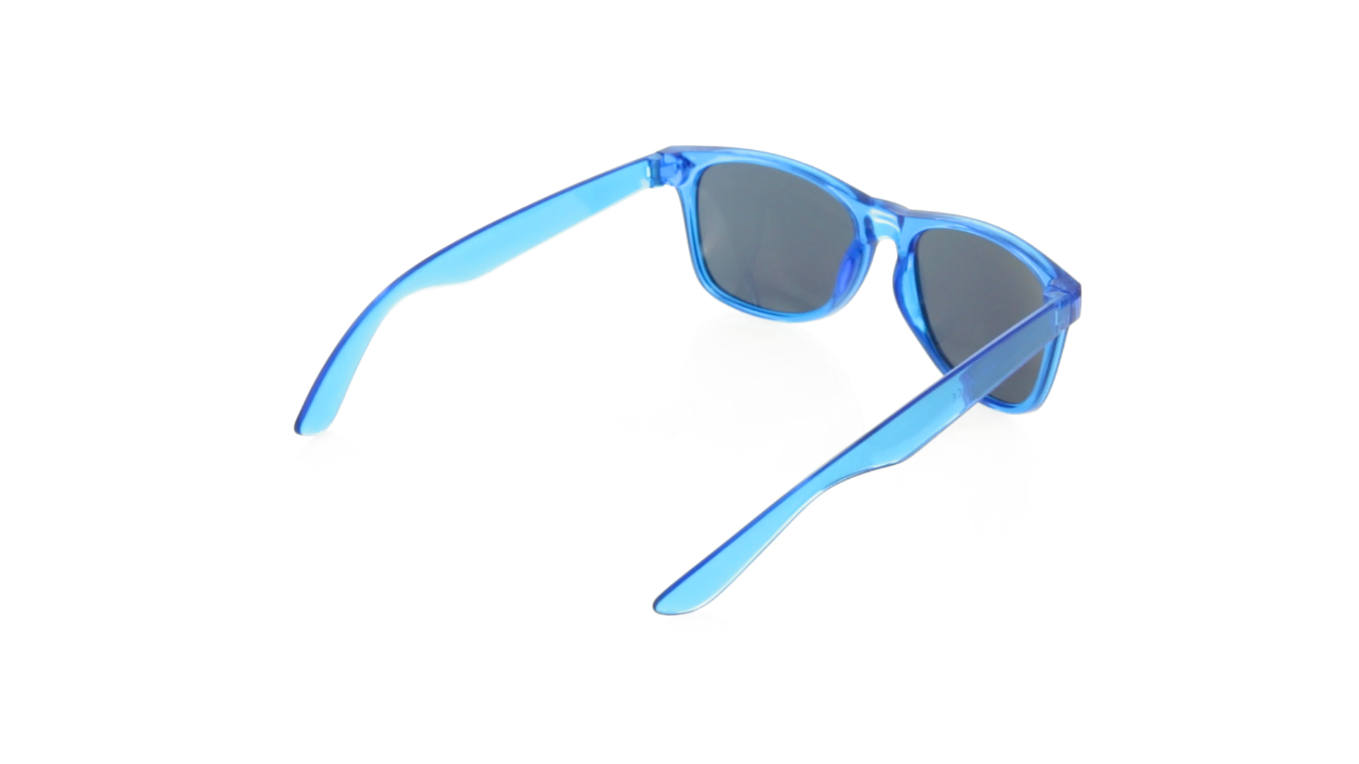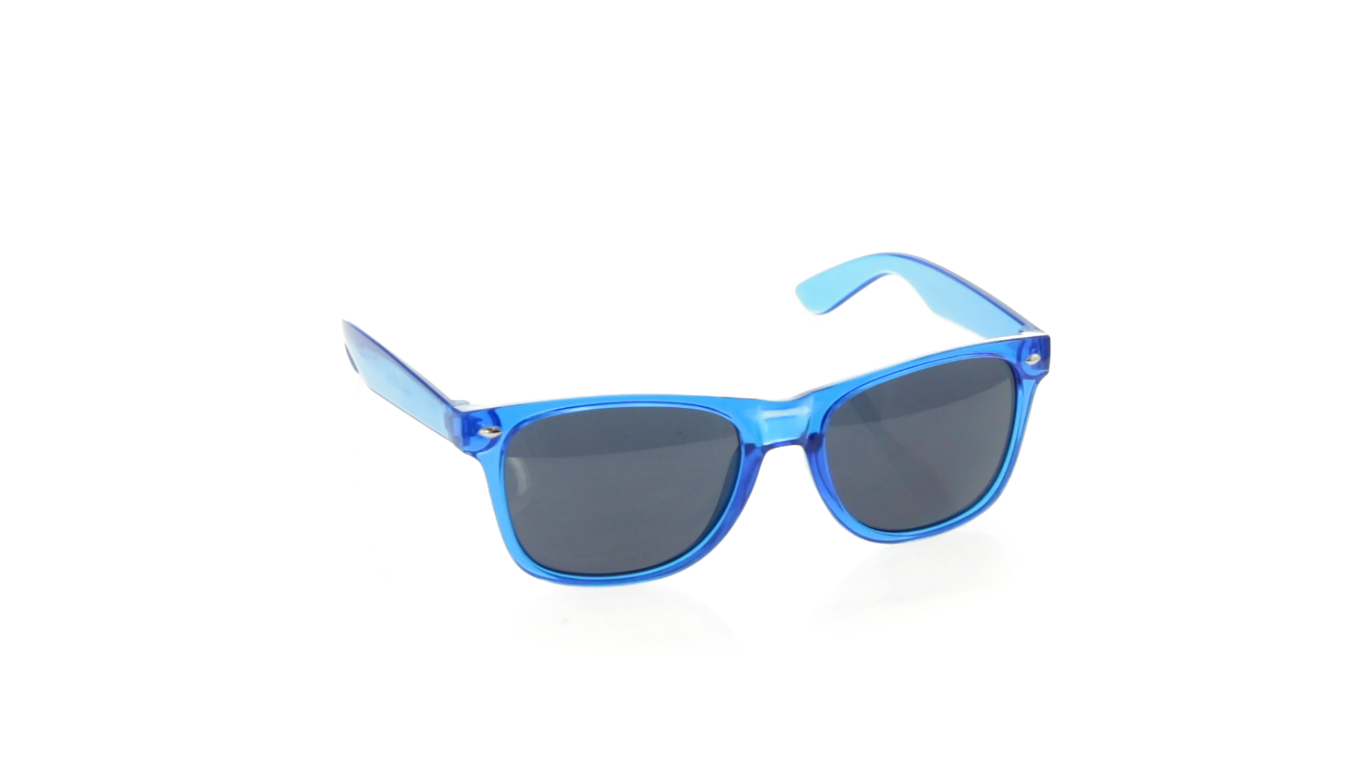 Sonnenbrille mit UV-400-Schutz und klassischem Design. Mit transparentem Rahmen in lebhaften Farben und schwarzen Gläsern.