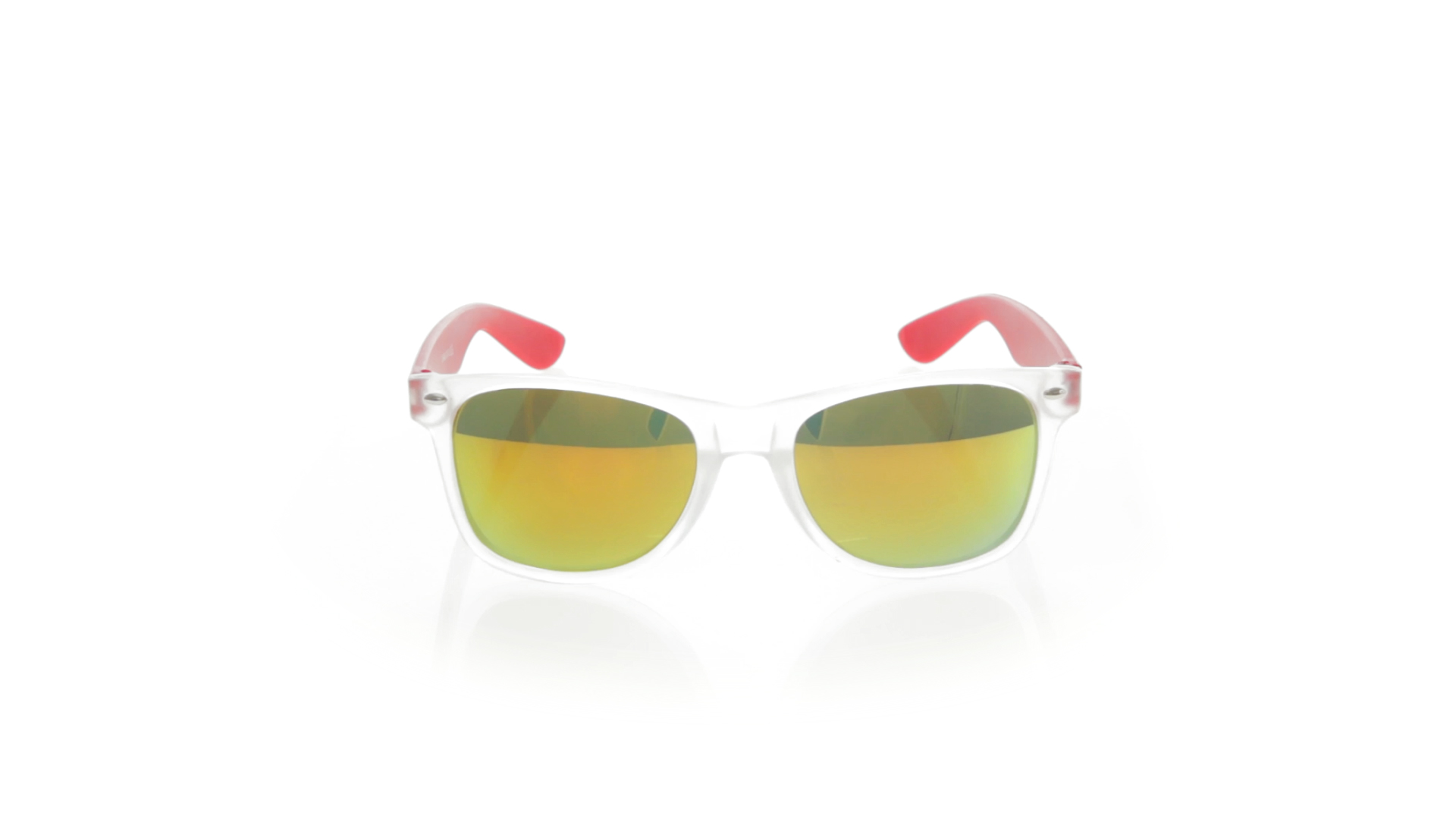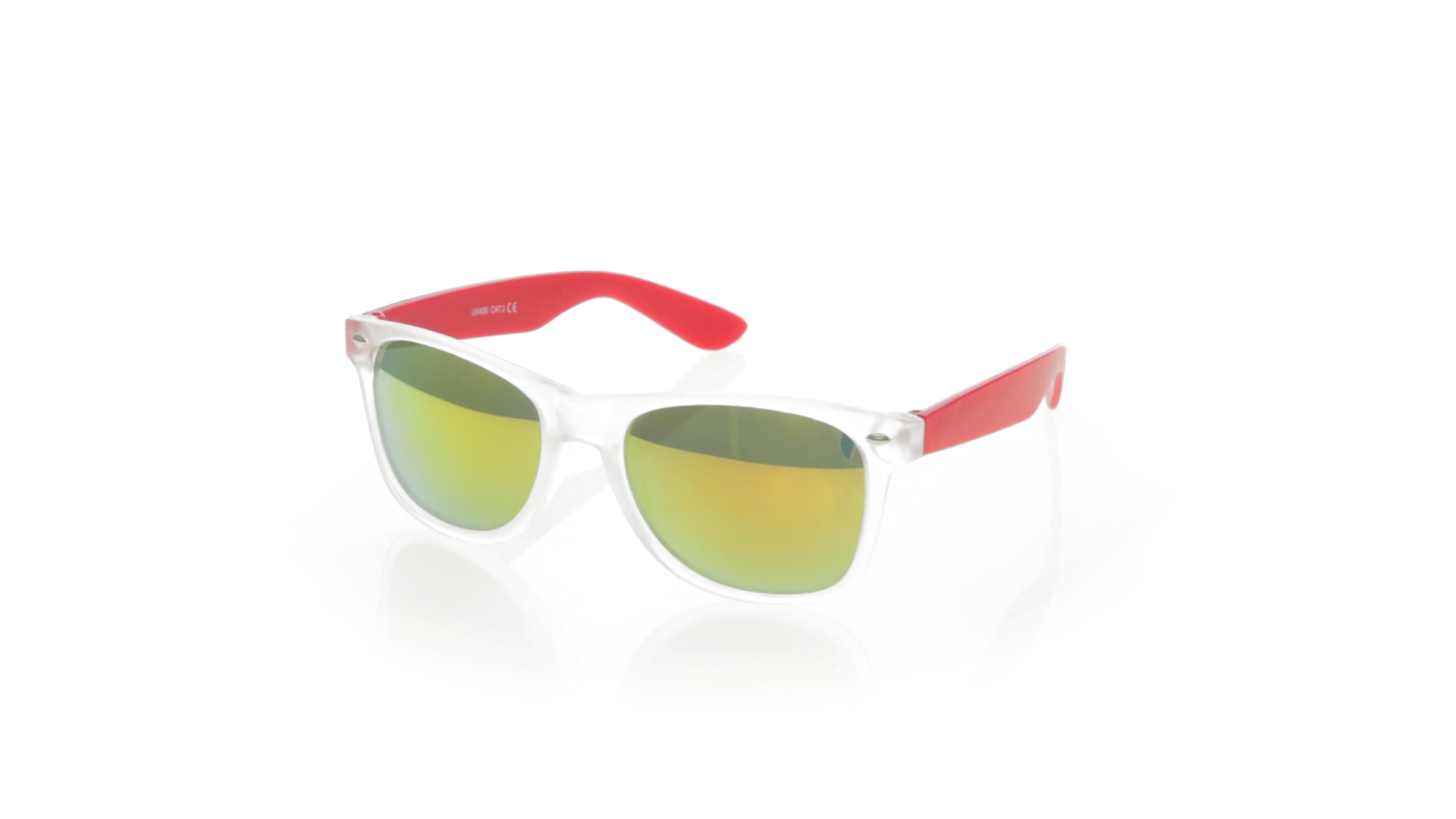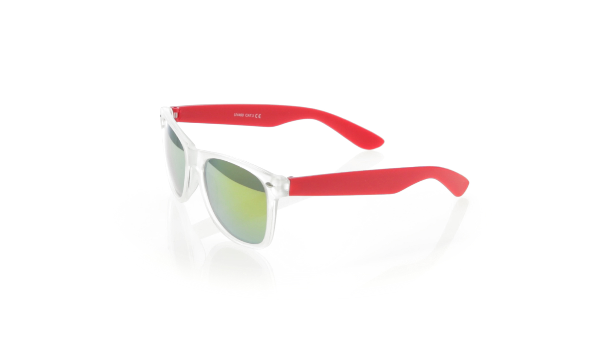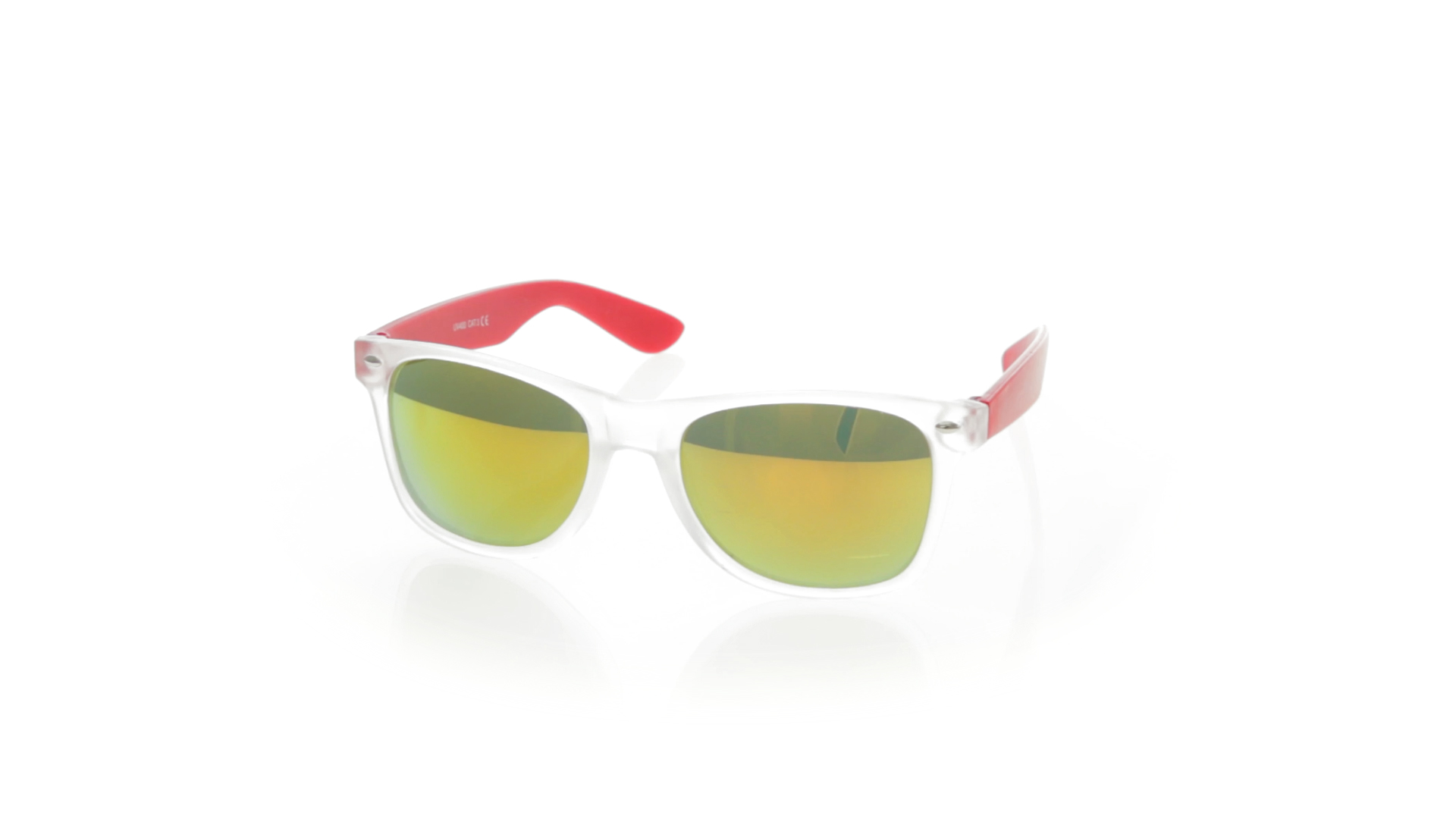 Sonnenbrille mit UV-400-Schutz mit klassischem Design. Mit halbtransparentem Rahmen, Bügeln in fröhlichen Farben und farblich passenden, verspiegelten Gläsern.