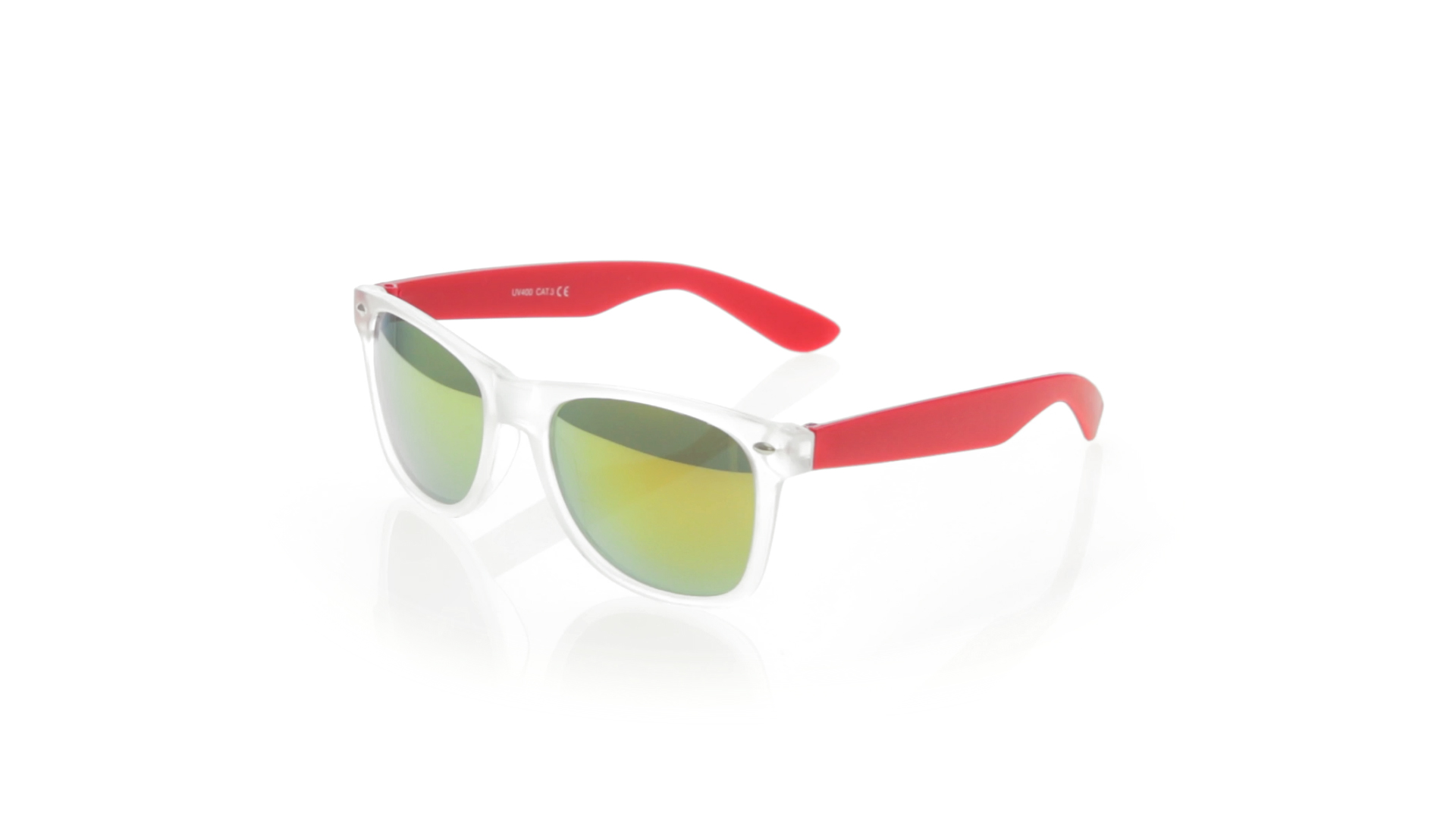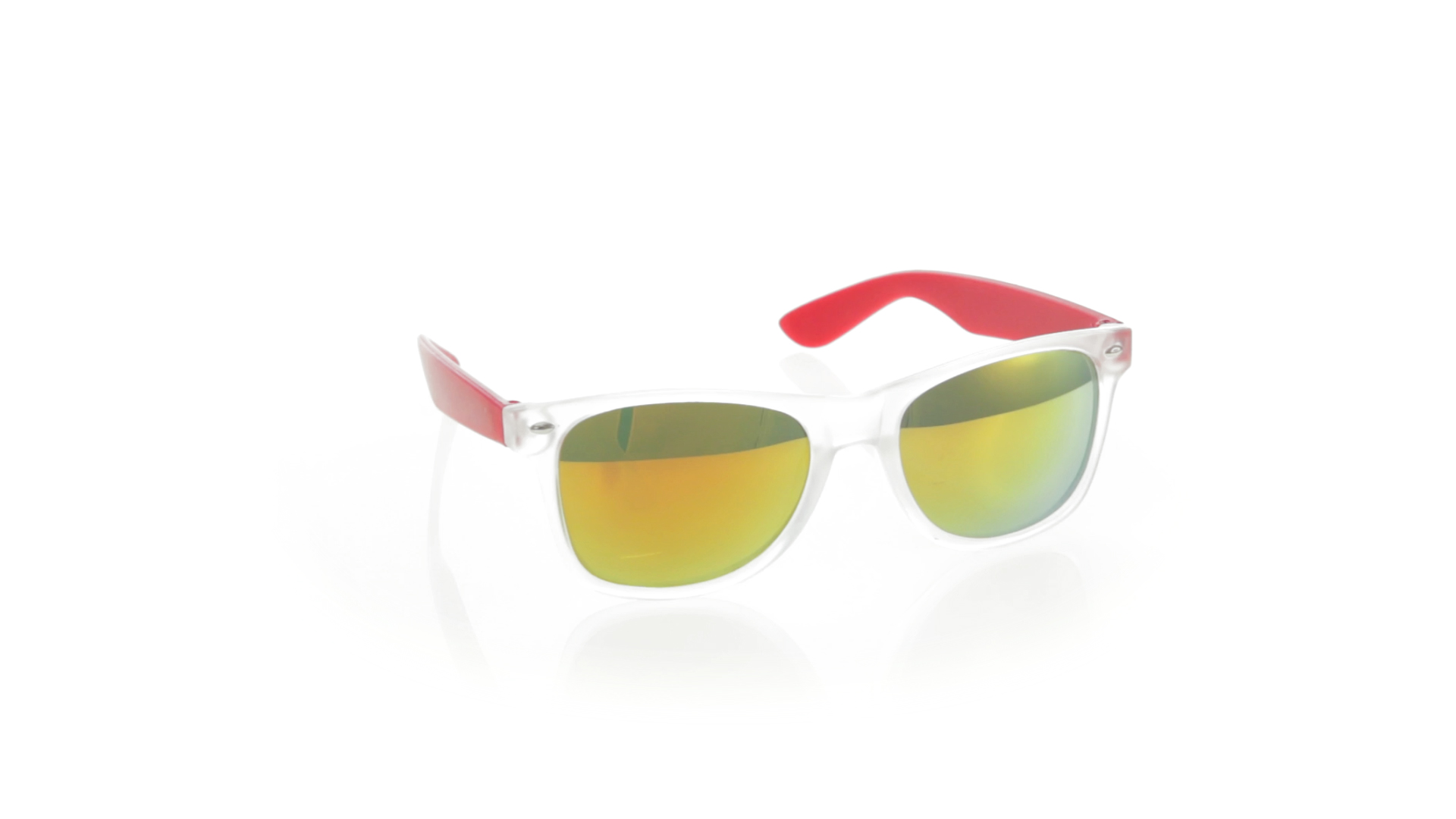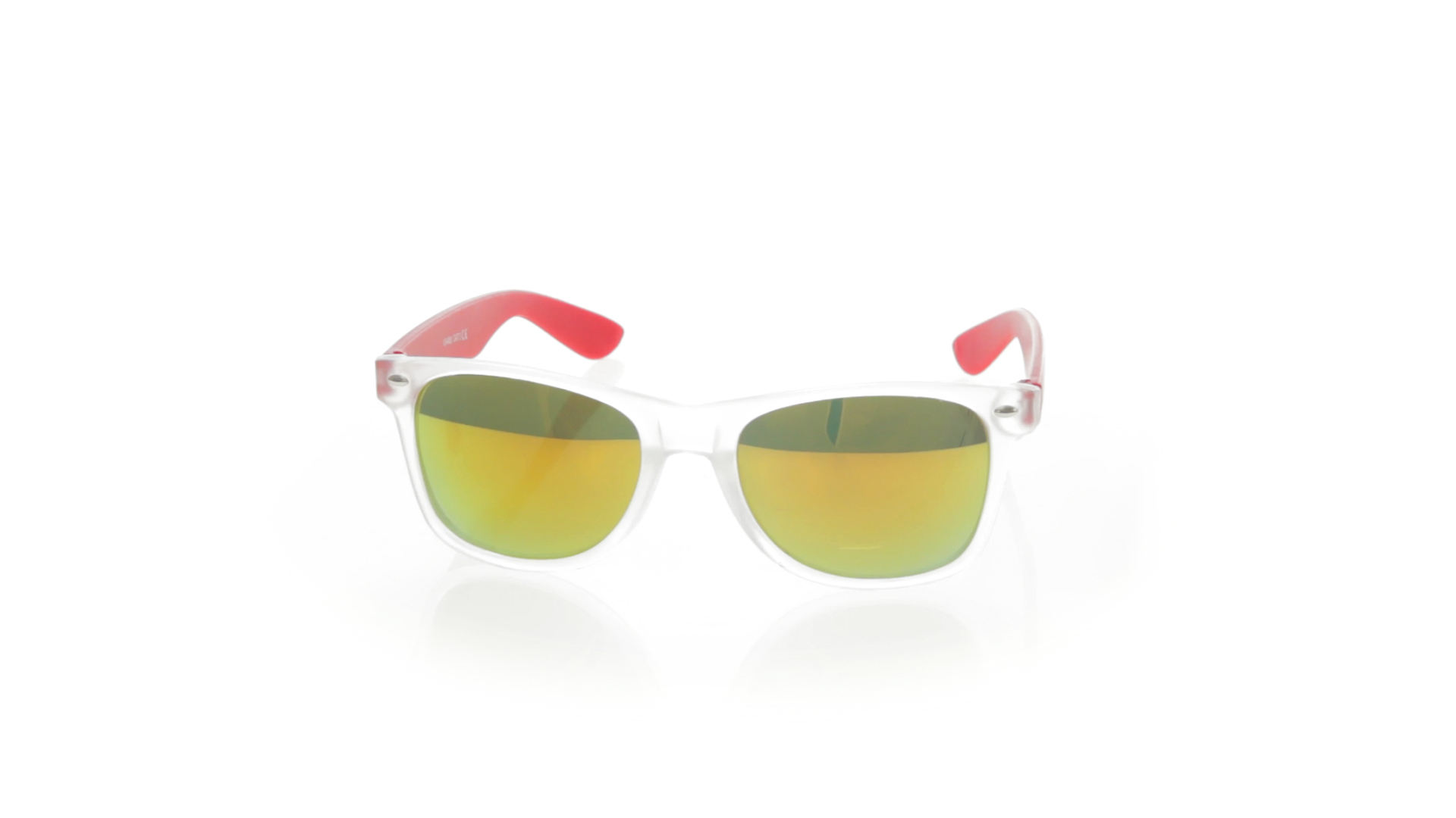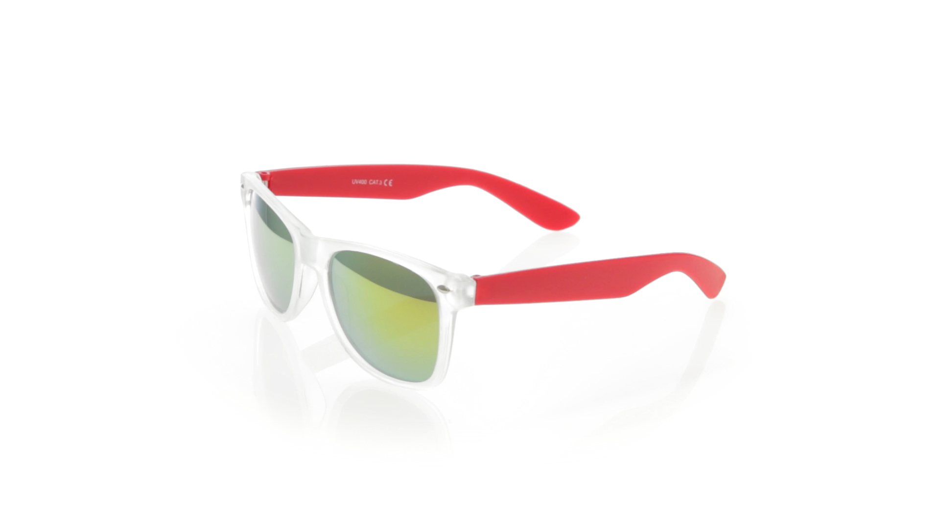 Sonnenbrille mit UV-400-Schutz mit klassischem Design. Mit halbtransparentem Rahmen, Bügeln in fröhlichen Farben und farblich passenden, verspiegelten Gläsern.