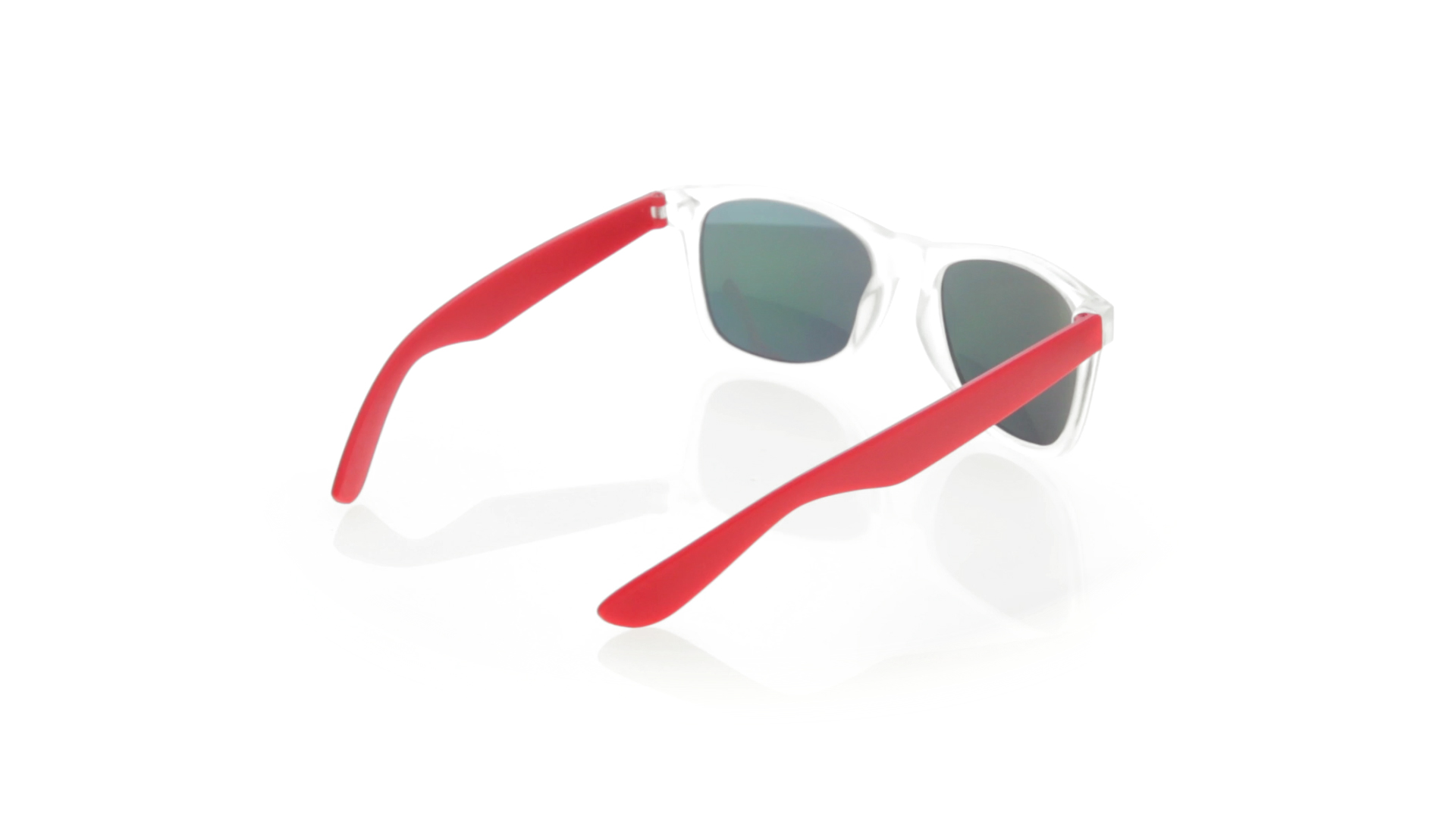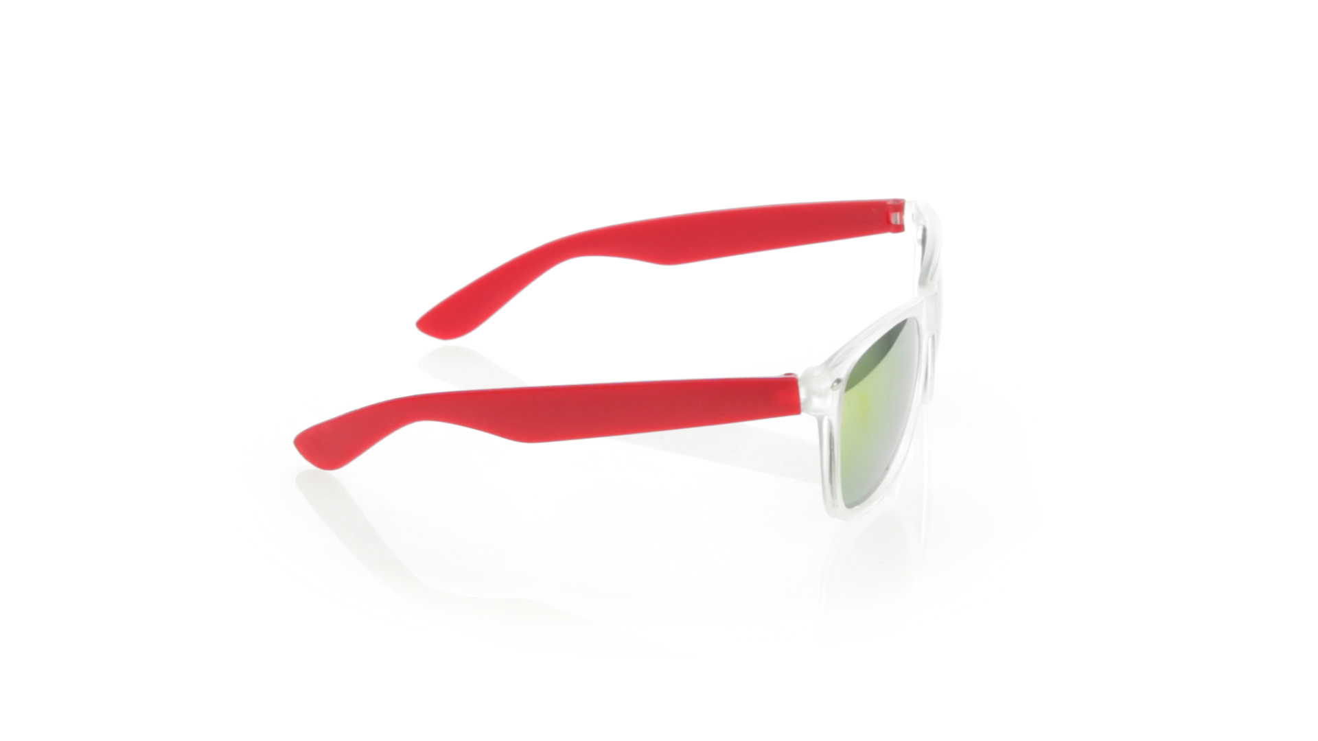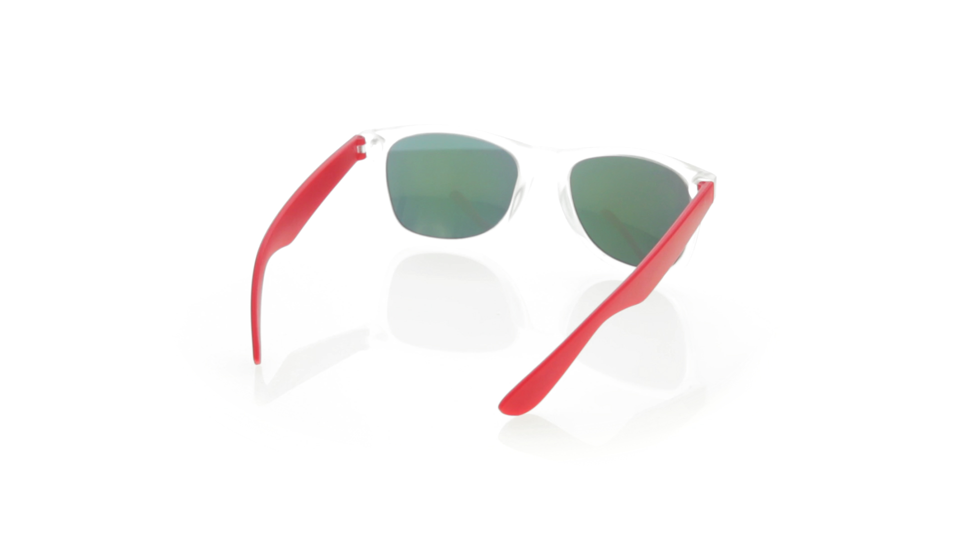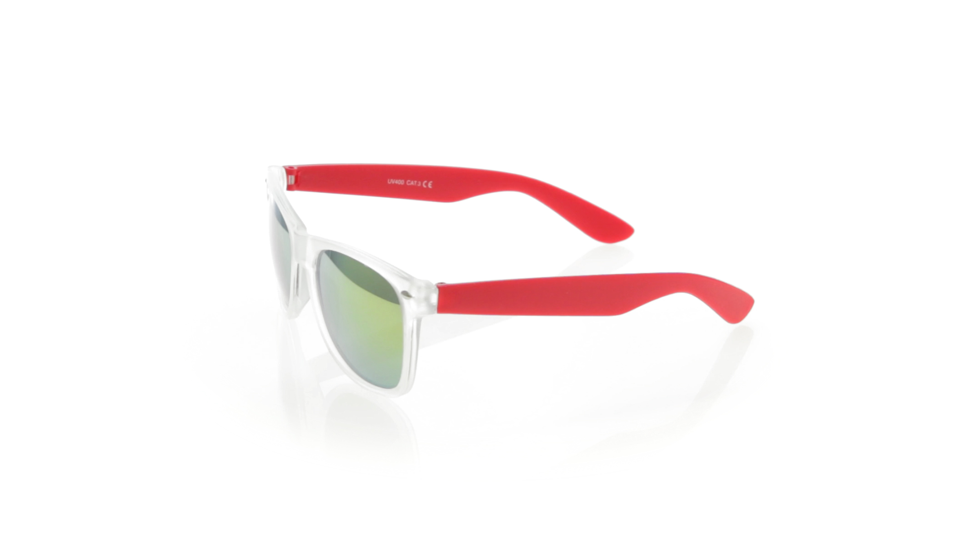 Sonnenbrille mit UV-400-Schutz mit klassischem Design. Mit halbtransparentem Rahmen, Bügeln in fröhlichen Farben und farblich passenden, verspiegelten Gläsern.