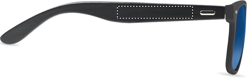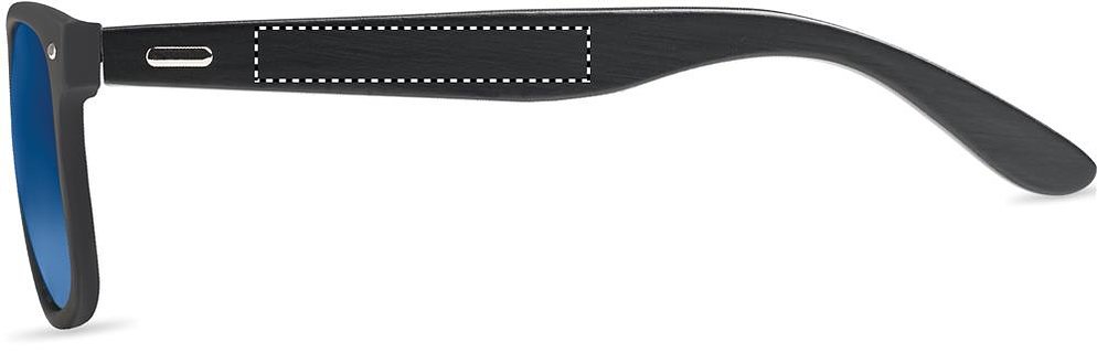 Sonnenbrille mit schwarz beschichteten Bügeln aus Bambus. Rundum verspiegelte Gläser. UV400-Schutz. Bambus ist ein natürliches Produkt, es kann daher zu leichten Abweichungen in Farbe, Dekor und Massen kommen.