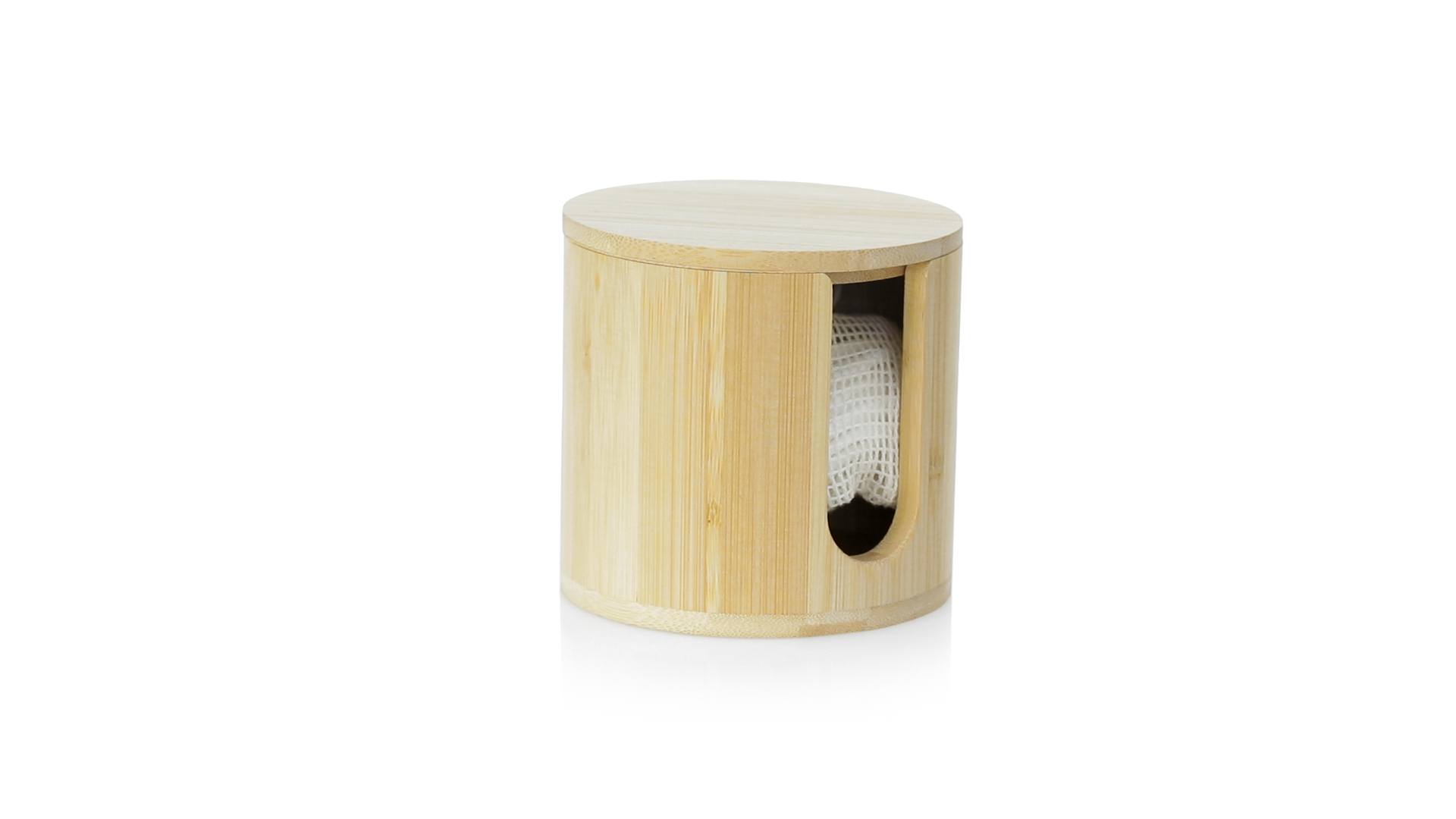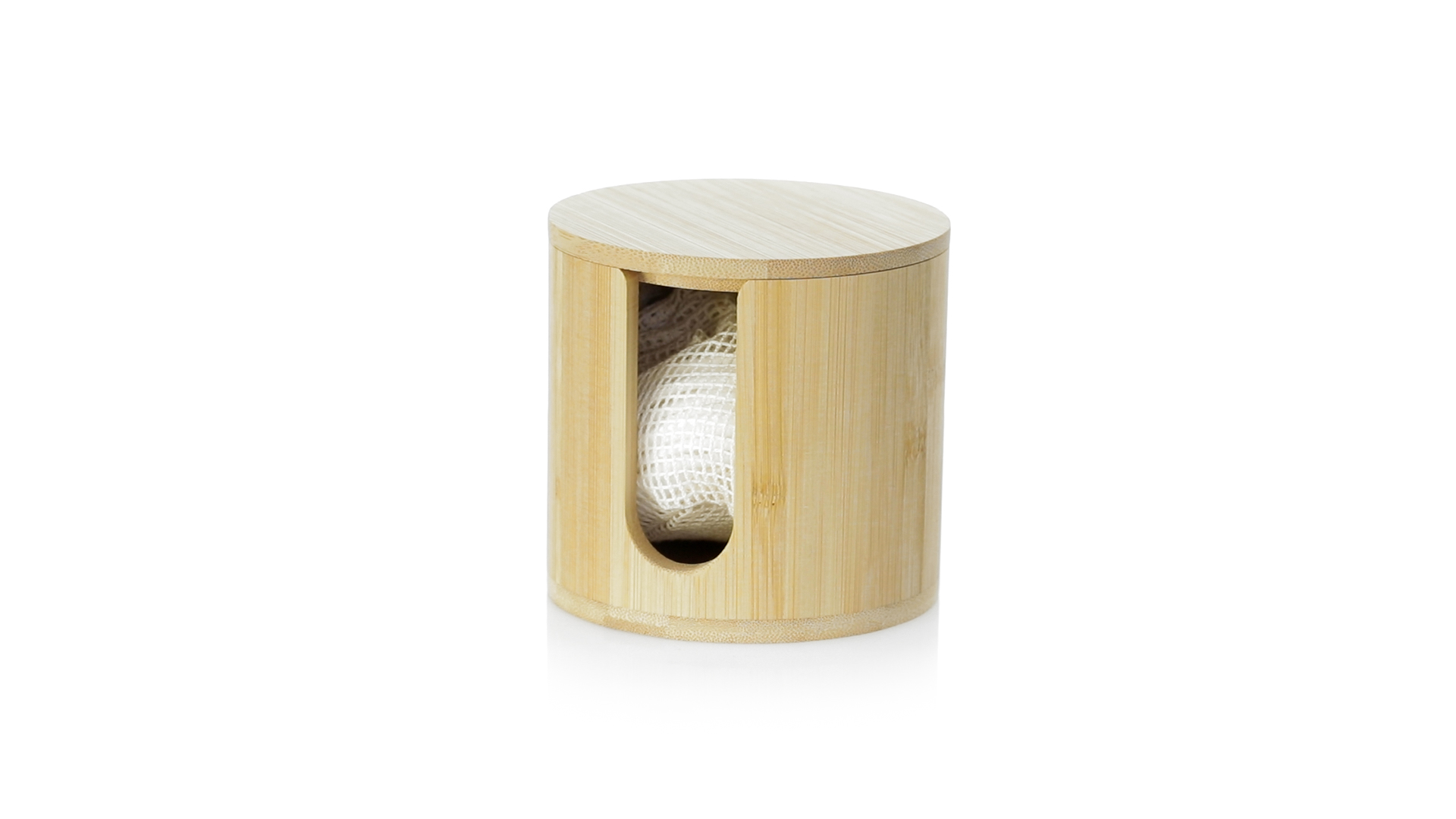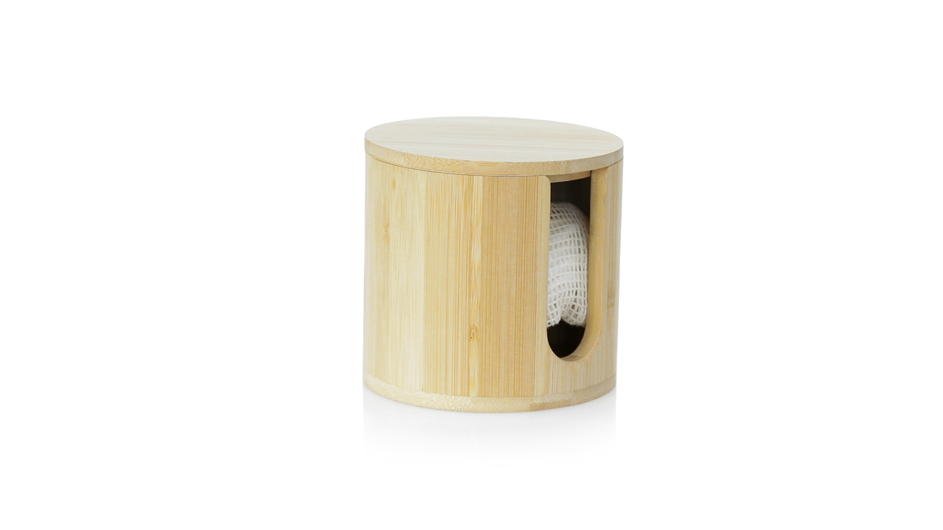 Linie "Natur" Make-up-Entferner-Tuchspender. Hergestellt aus Bambus, um die Verwendung von natürlichen Rohstoffen zu fördern. Mit 10 wiederverwendbaren Baumwollpads und einem Waschbeutel. Präsentiert in einer individuellen, ökologisch gestalteten Schachtel.
