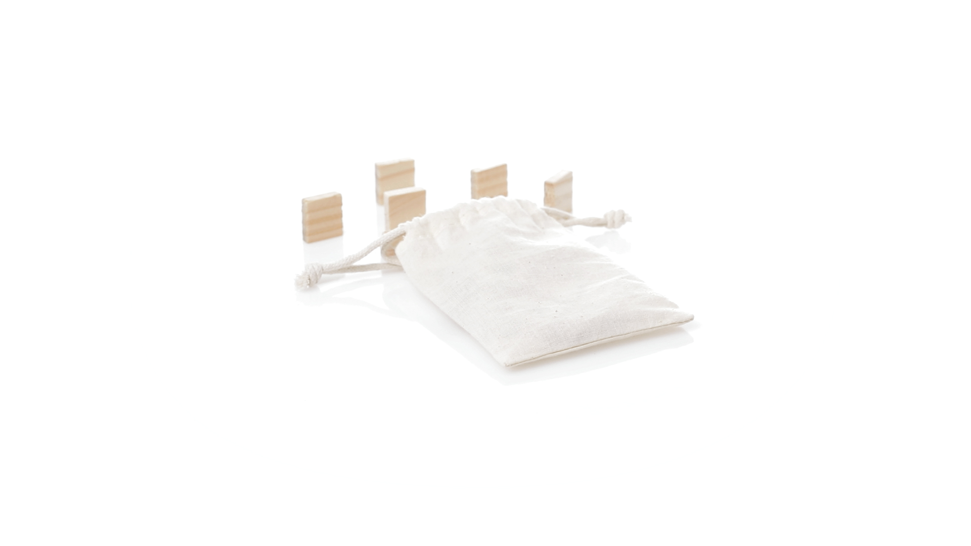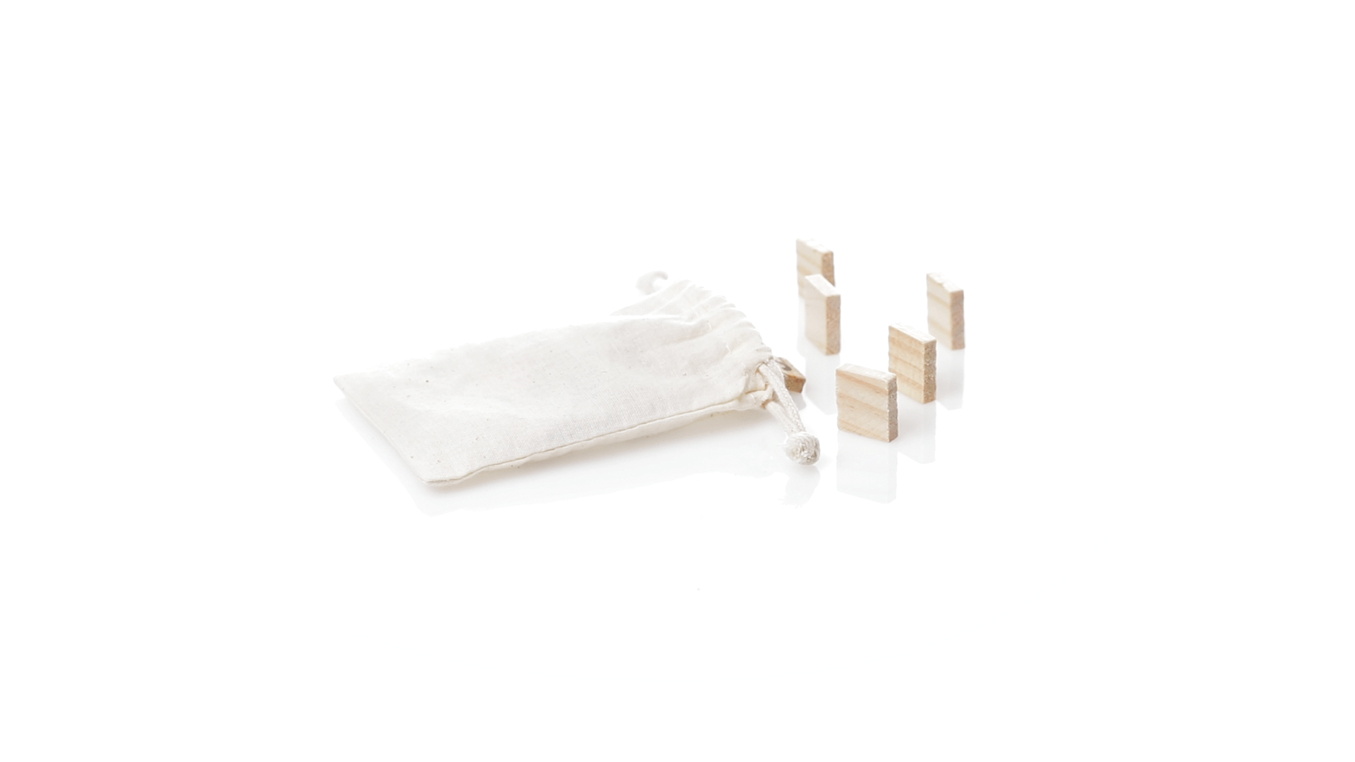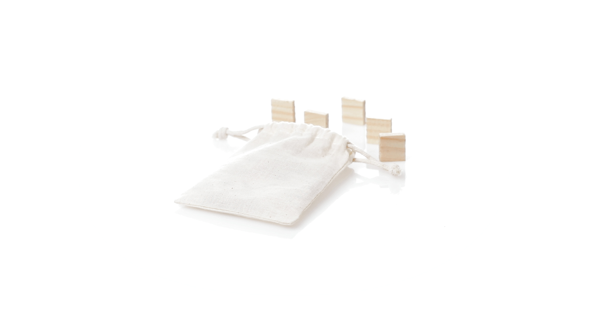 Rechenset aus widerstandsfähigem, natürlichem Kiefernholz. Set mit 32 Teilen in einer Tragetasche aus Baumwolle mit passenden Kordeln.