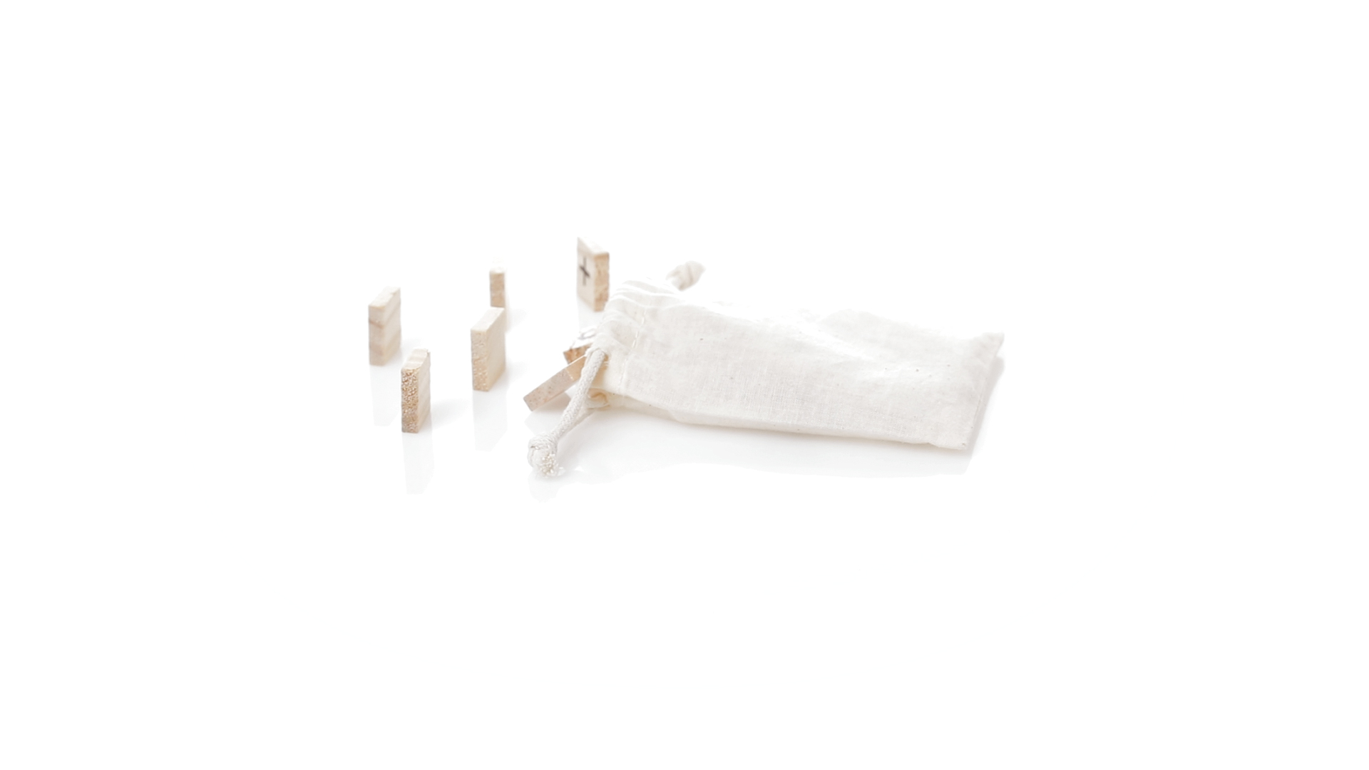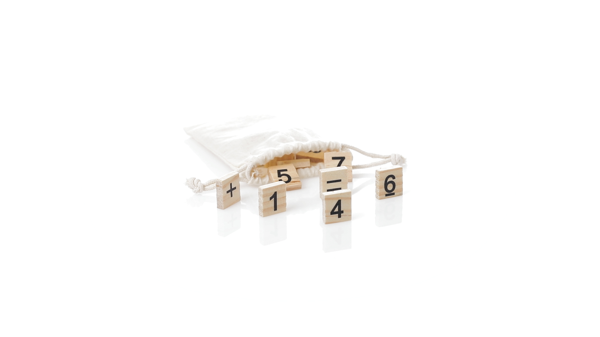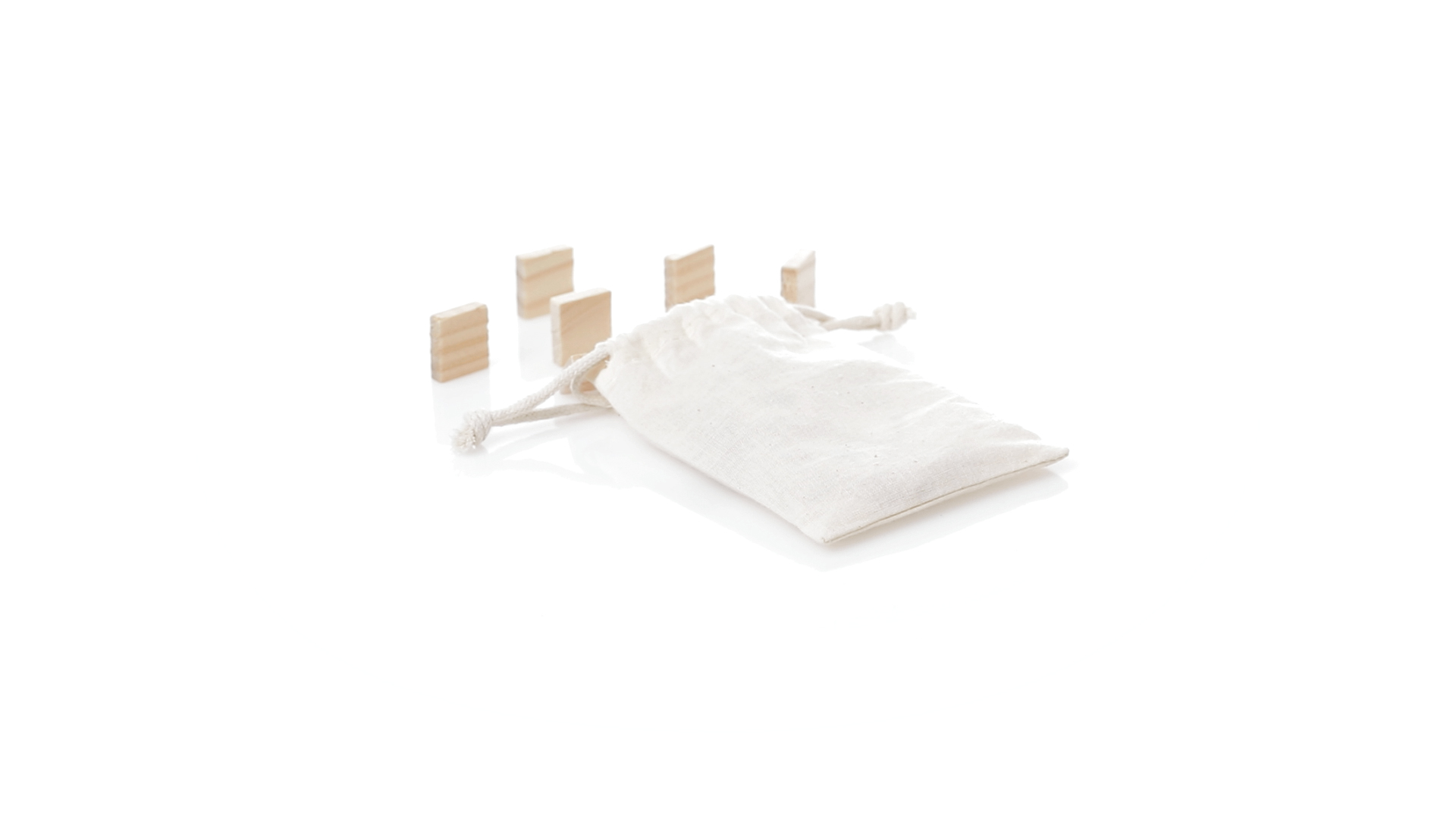 Rechenset aus widerstandsfähigem, natürlichem Kiefernholz. Set mit 32 Teilen in einer Tragetasche aus Baumwolle mit passenden Kordeln.