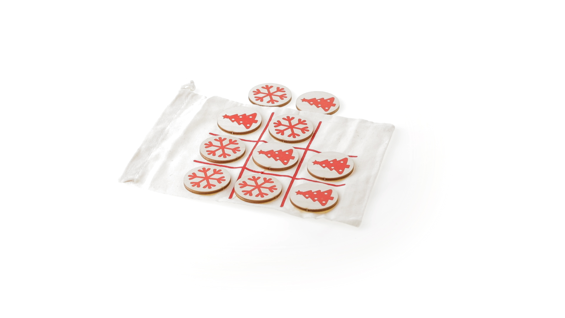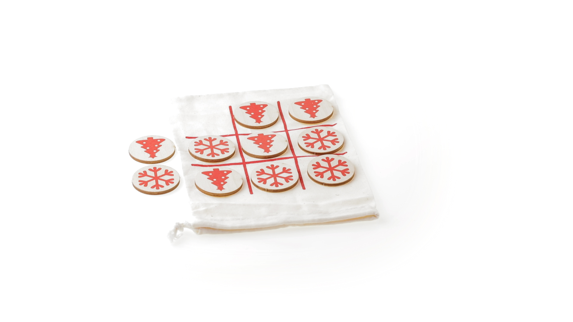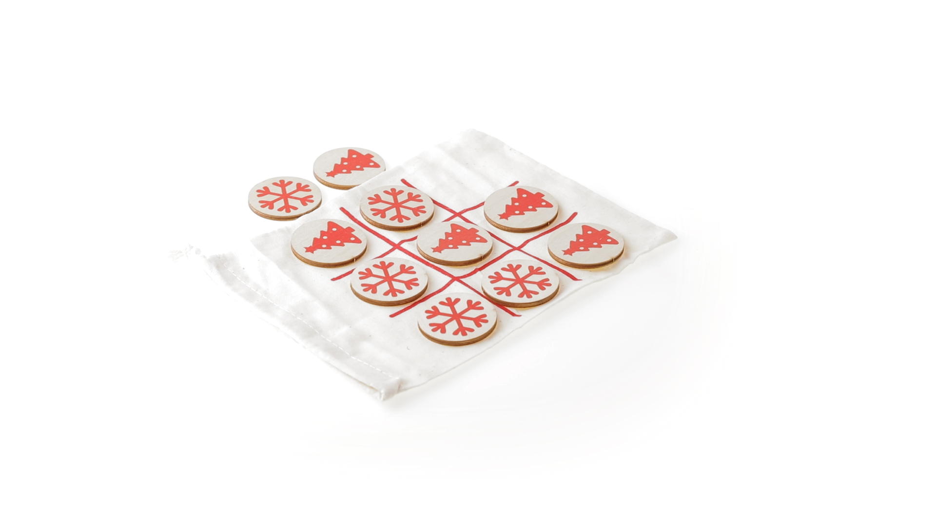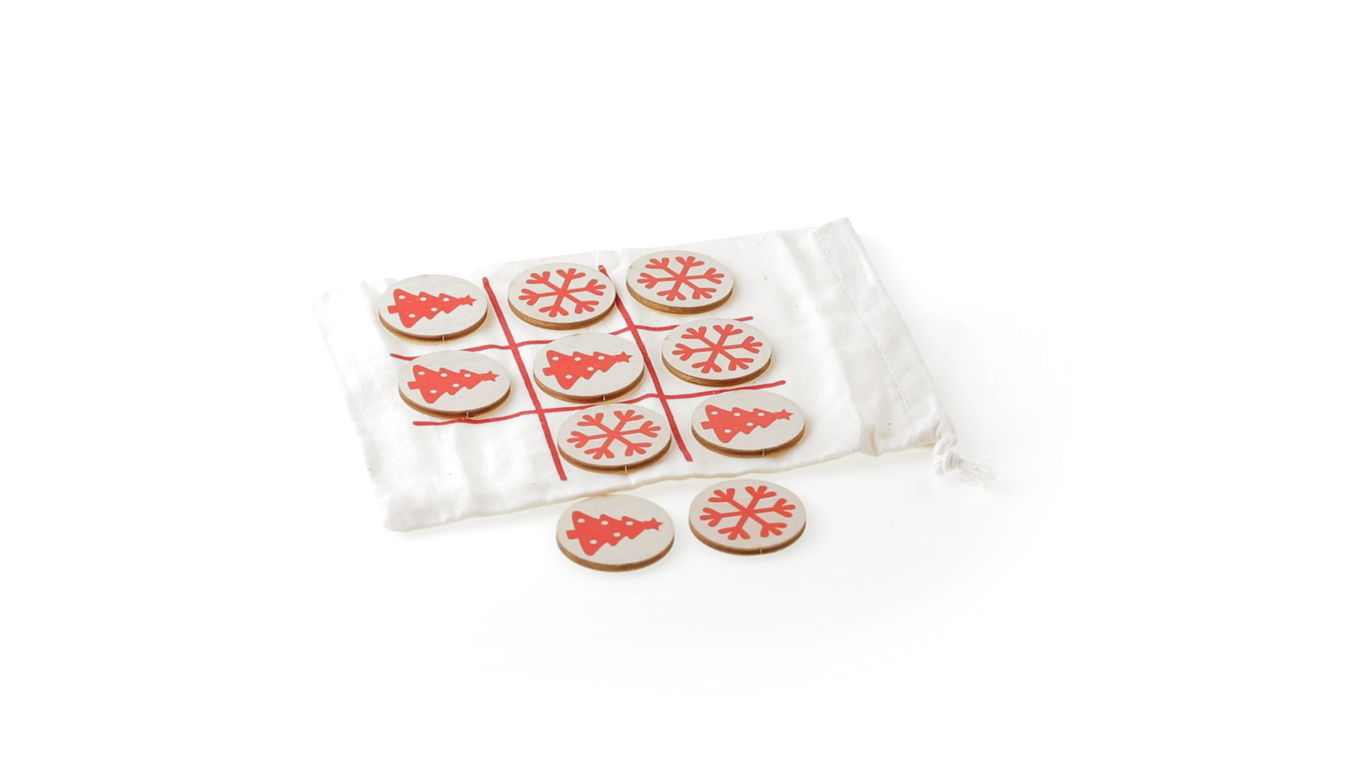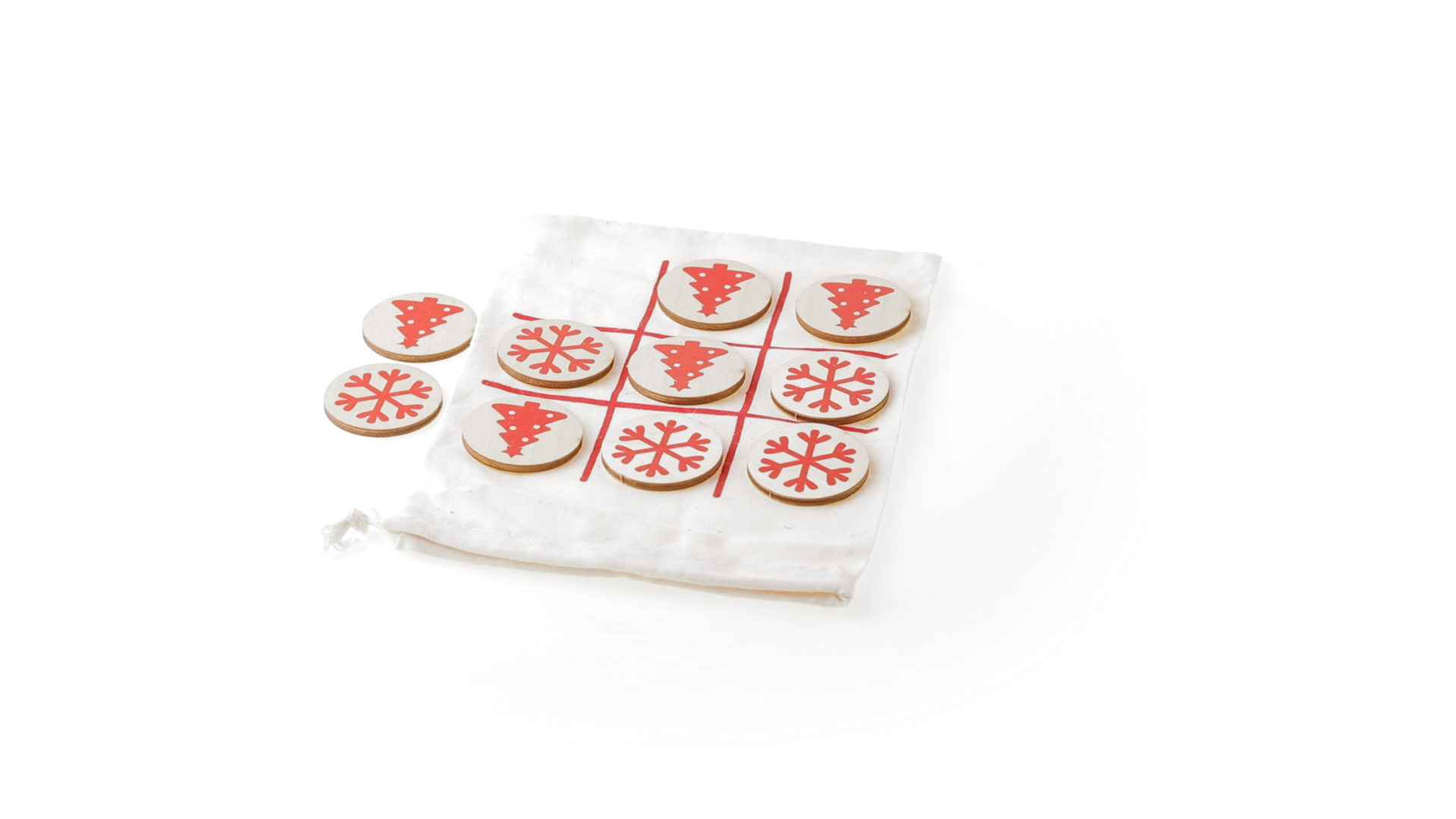 Tic-Tac-Toe-Spiel im originellen Weihnachtsdesign und aus Naturholz. Präsentiert in einem Beutel mit Kordelzug, einschliesslich 5 Schneeflocken-Spielsteine und 5 Weihnachtsbaum-Spielsteine.