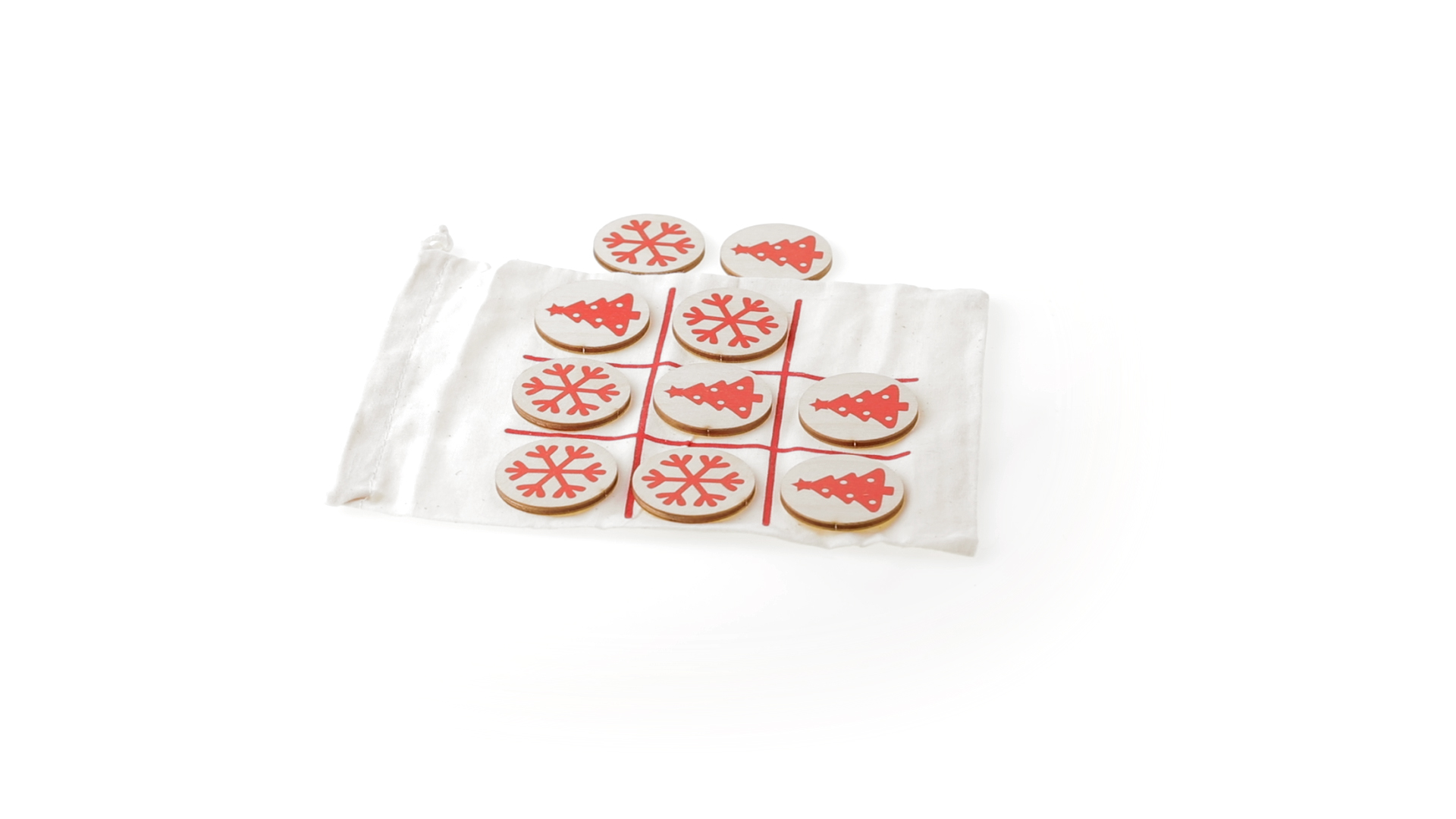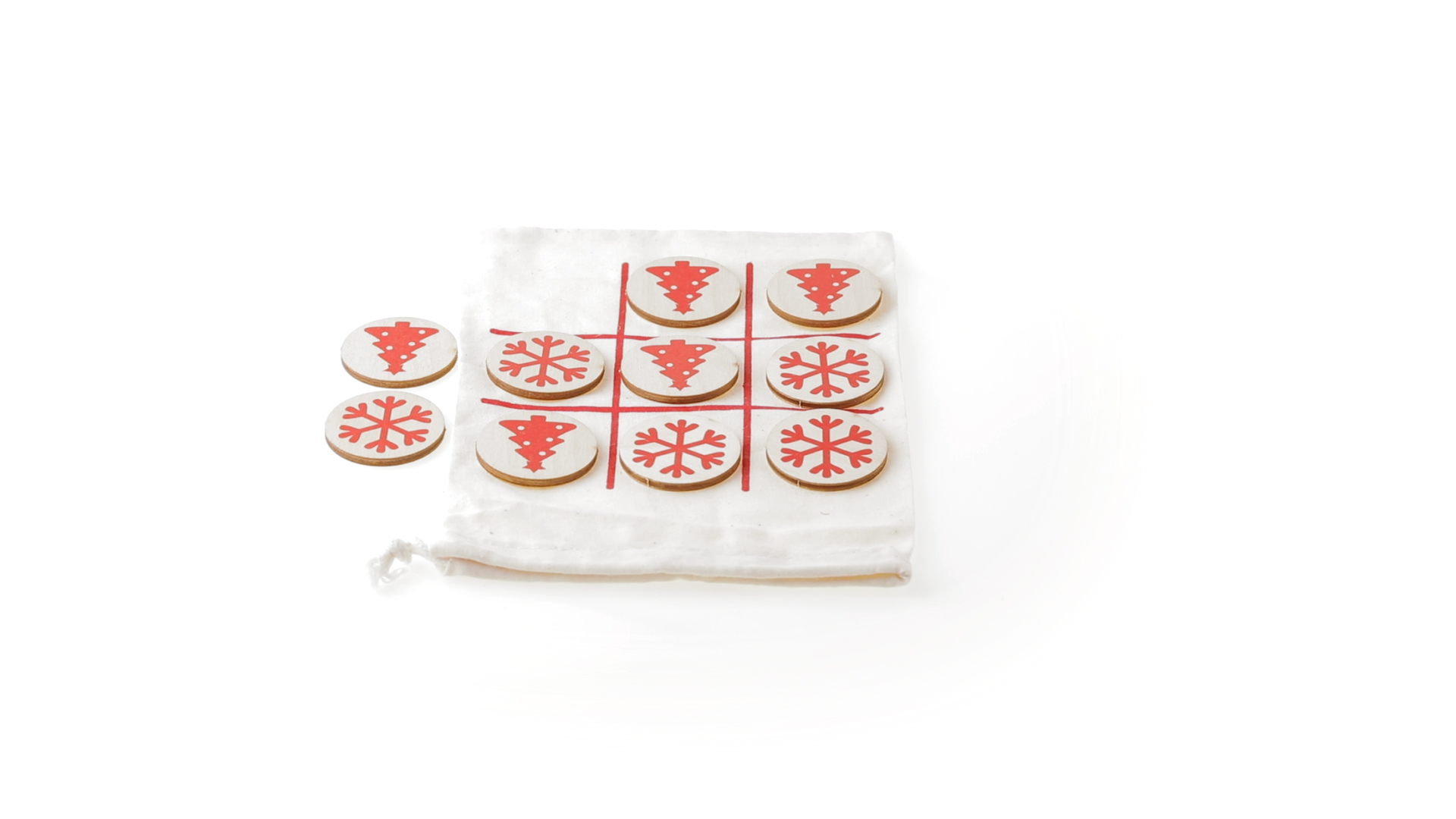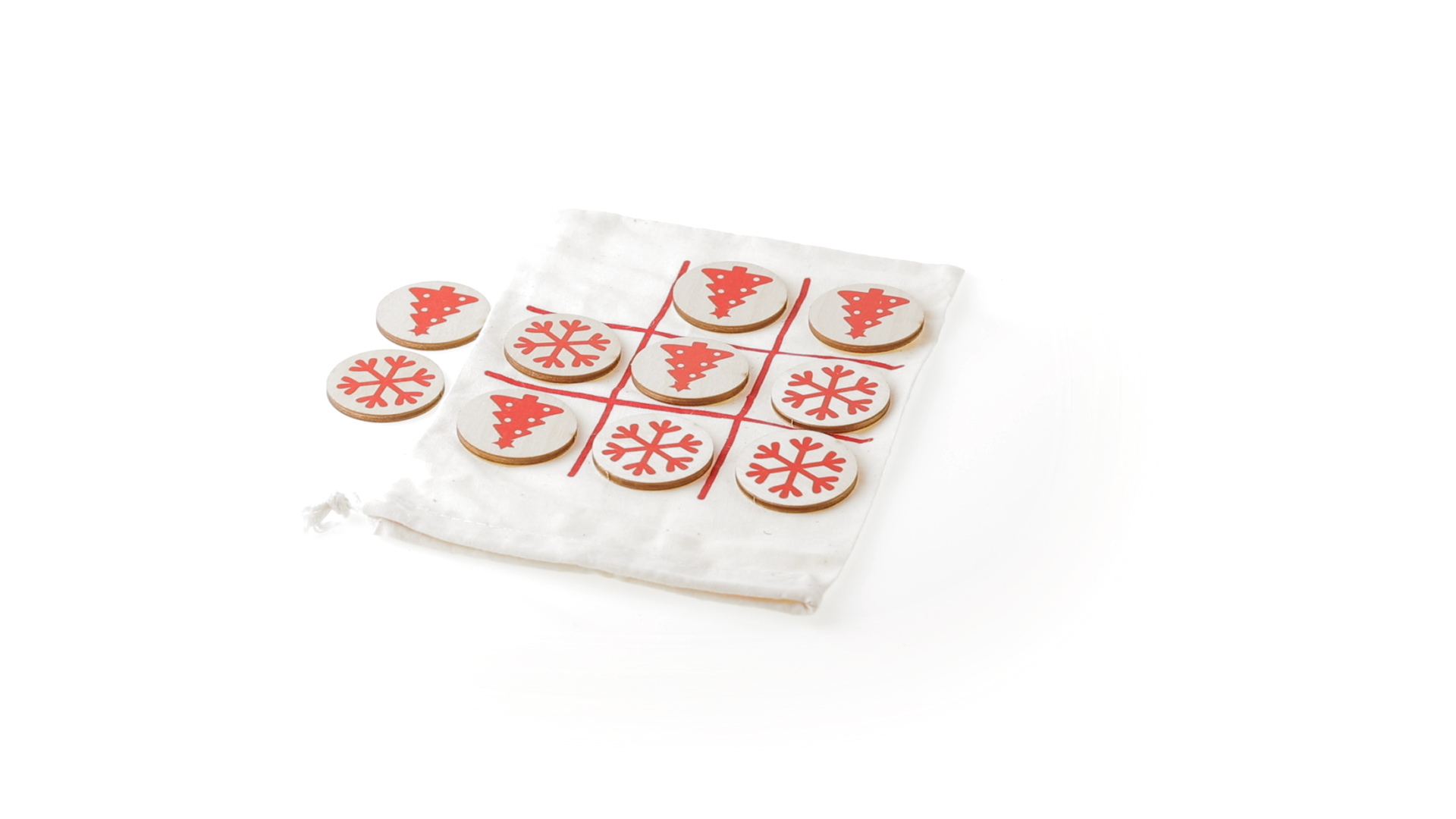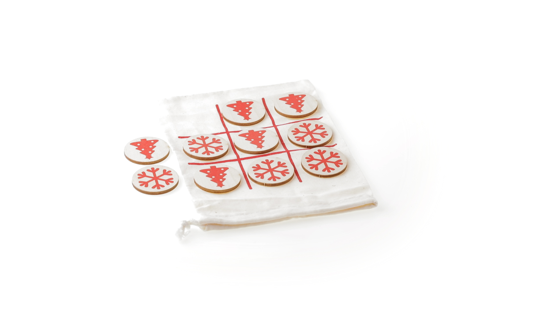 Tic-Tac-Toe-Spiel im originellen Weihnachtsdesign und aus Naturholz. Präsentiert in einem Beutel mit Kordelzug, einschliesslich 5 Schneeflocken-Spielsteine und 5 Weihnachtsbaum-Spielsteine.